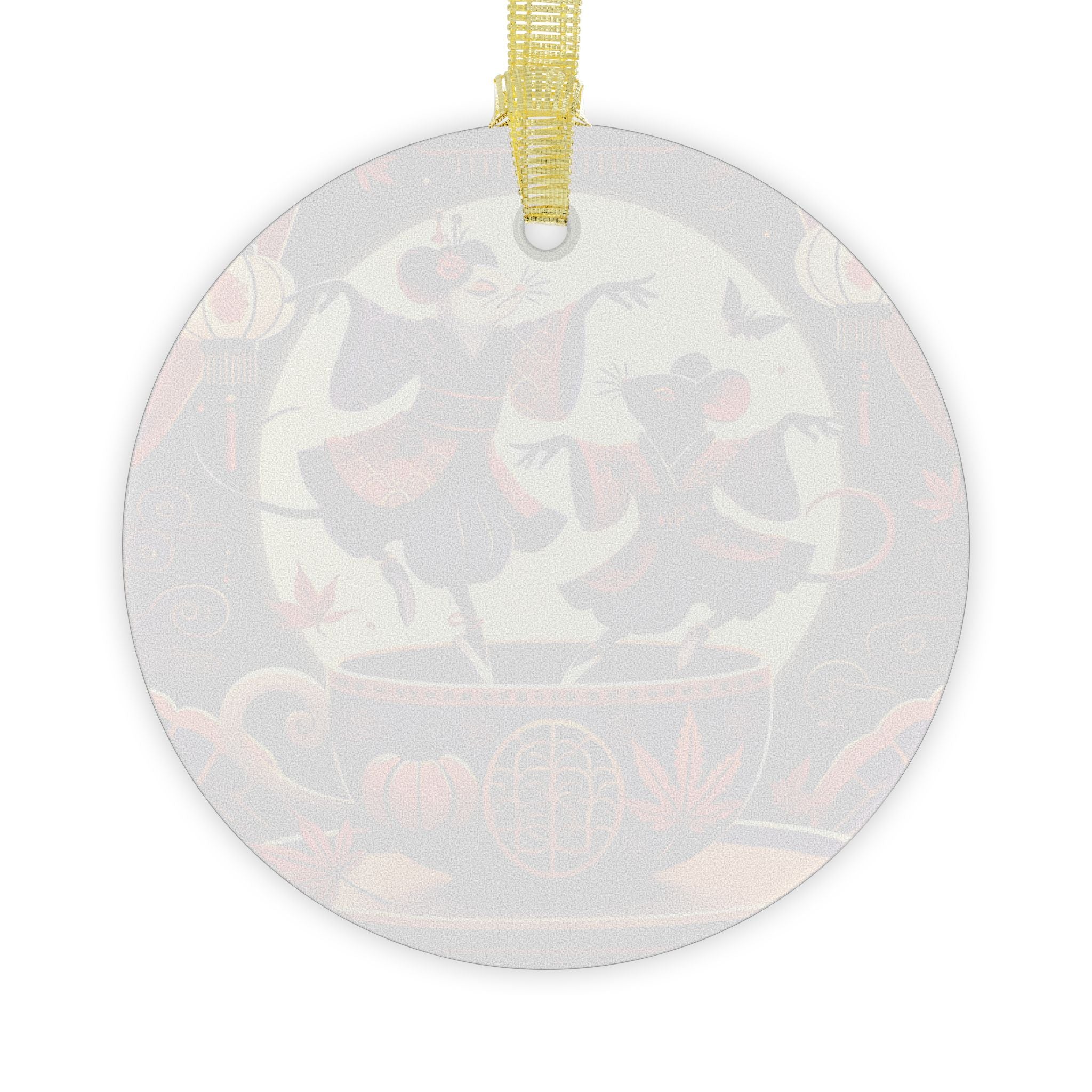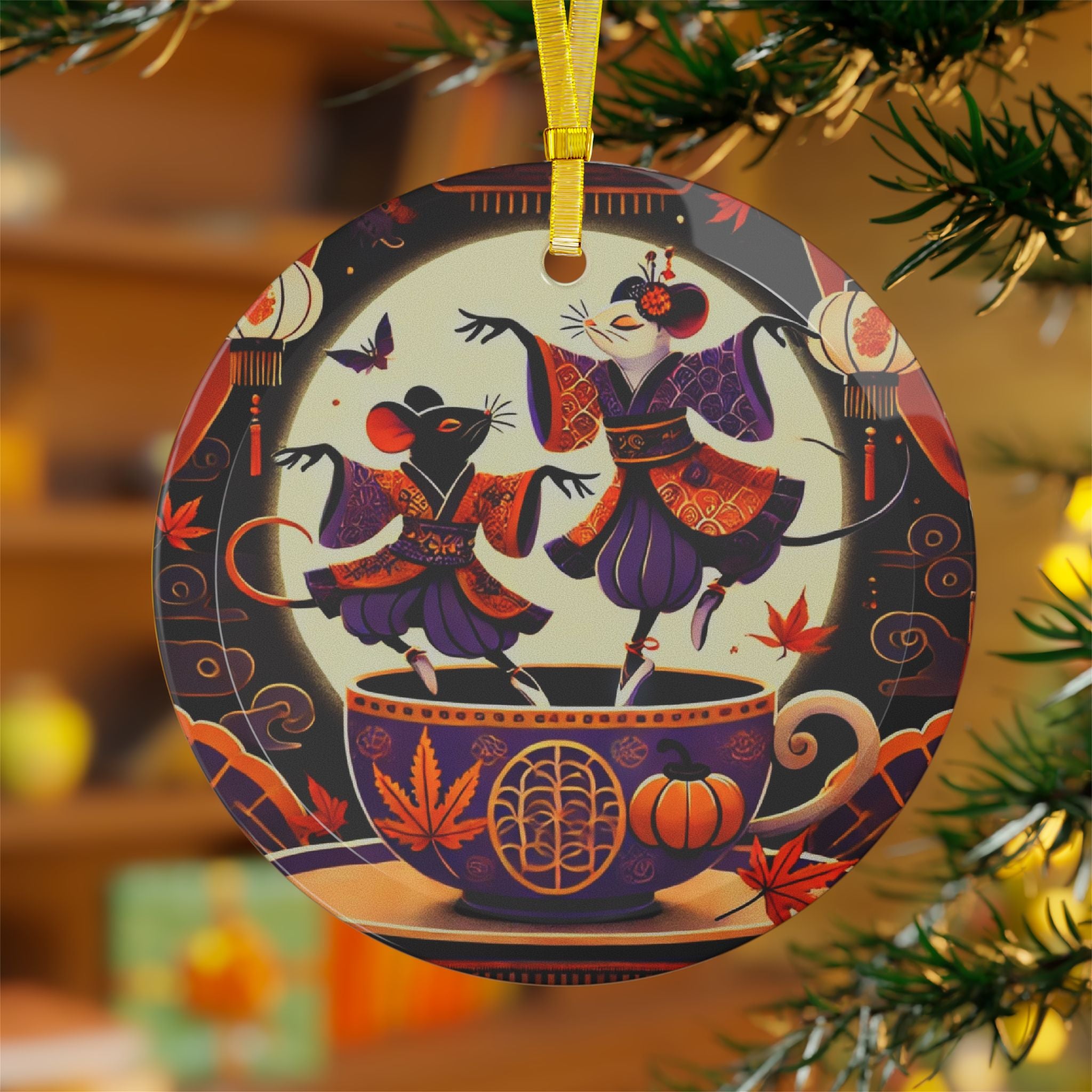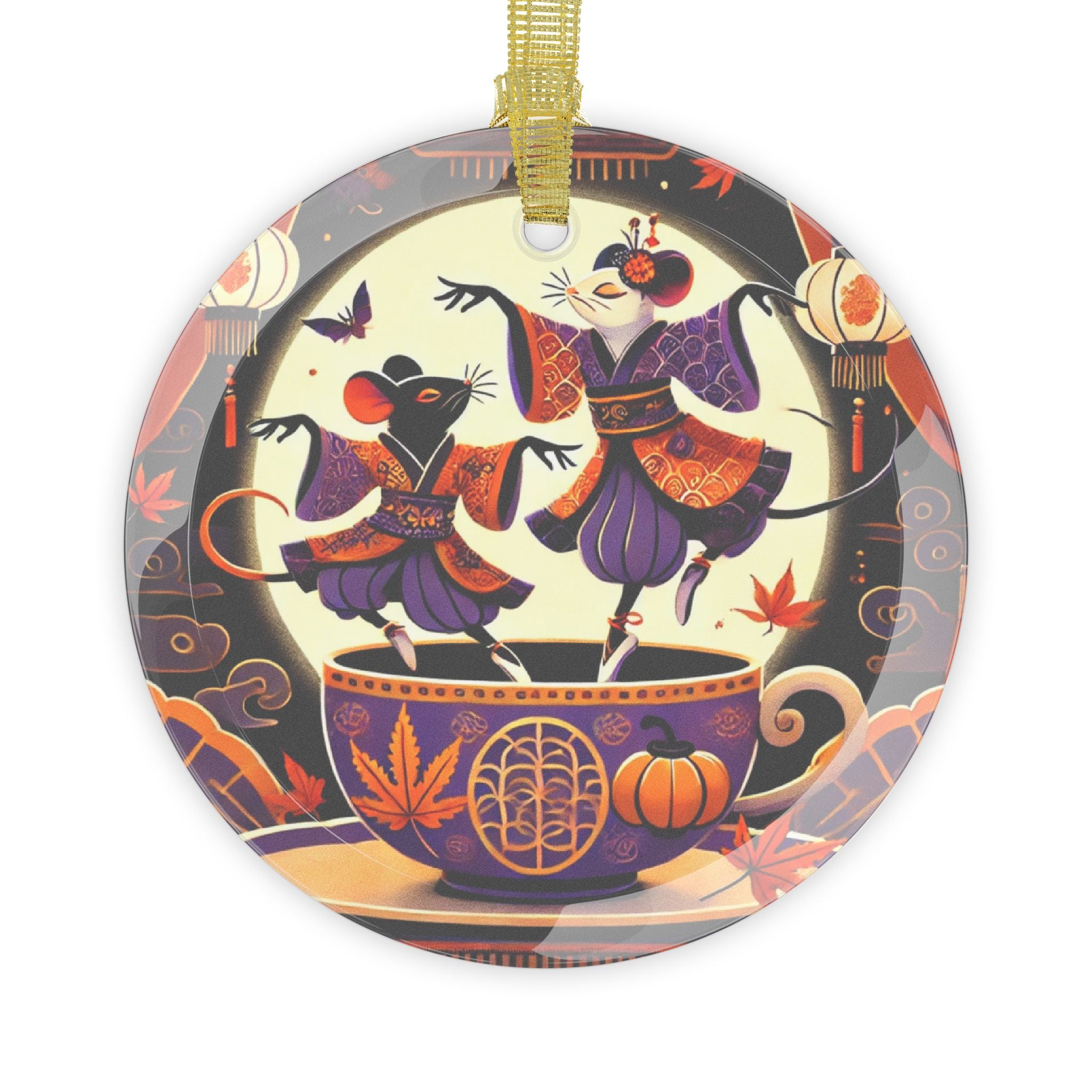Bring festive artistry to your décor with the Theatrical Halloween Kabuki Mice on Teacup glass ornament. Crafted from 100% glass and sized at 3.5" (88.9mm), this ornament features beveled edges and comes ready to hang with a gold ribbon for added flair. The high-quality print showcases two kabuki-inspired mice dancing playfully on the rim of a decorated teacup, blending theatrical elegance with whimsical Halloween charm. Both functional and artistic, this ornament transforms traditional seasonal décor into a unique celebration of culture, fantasy, and style.