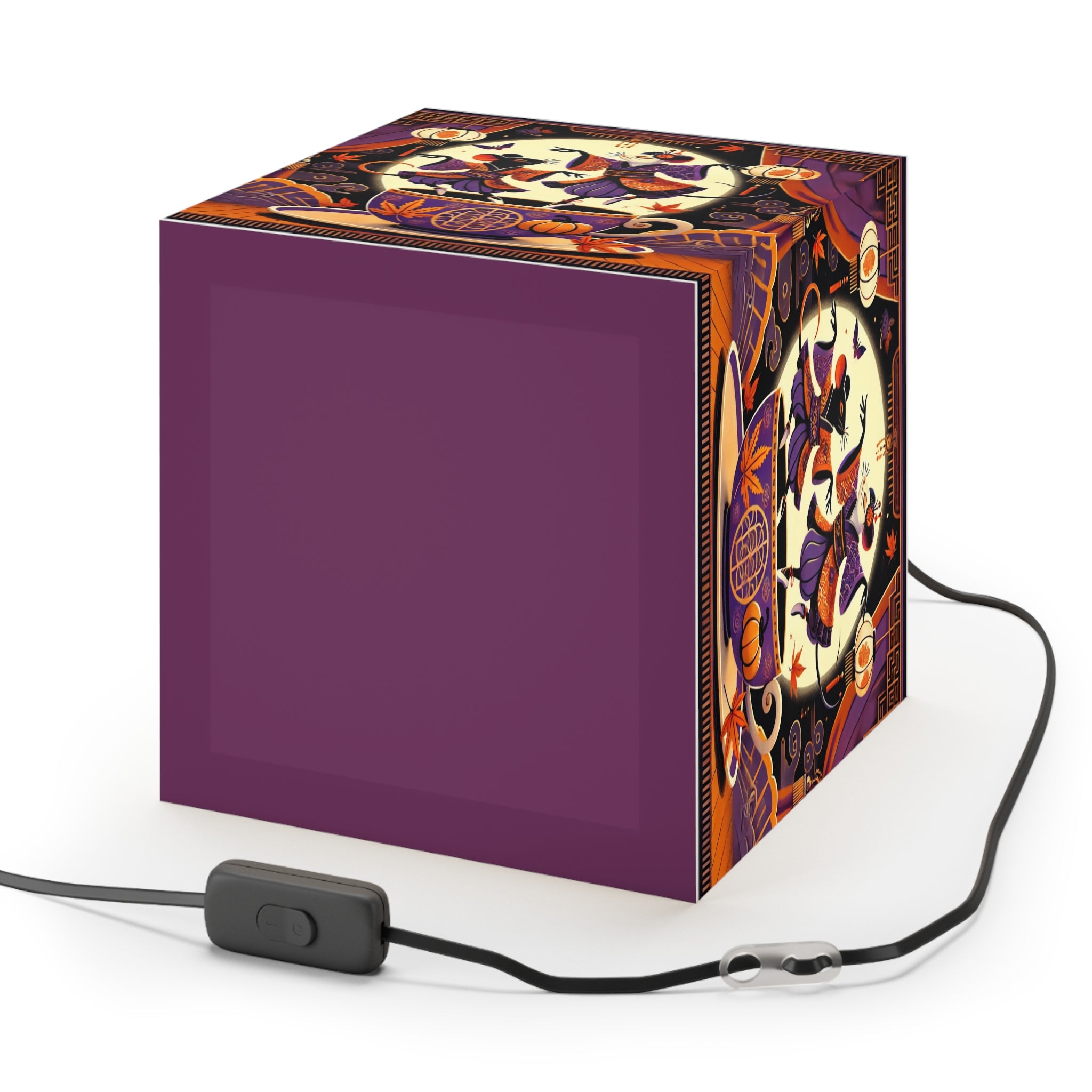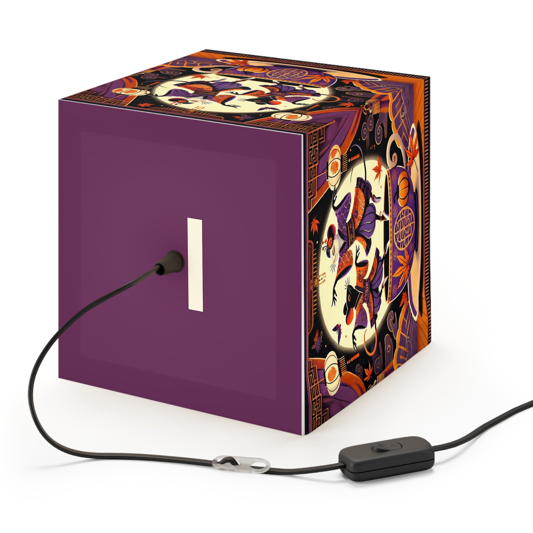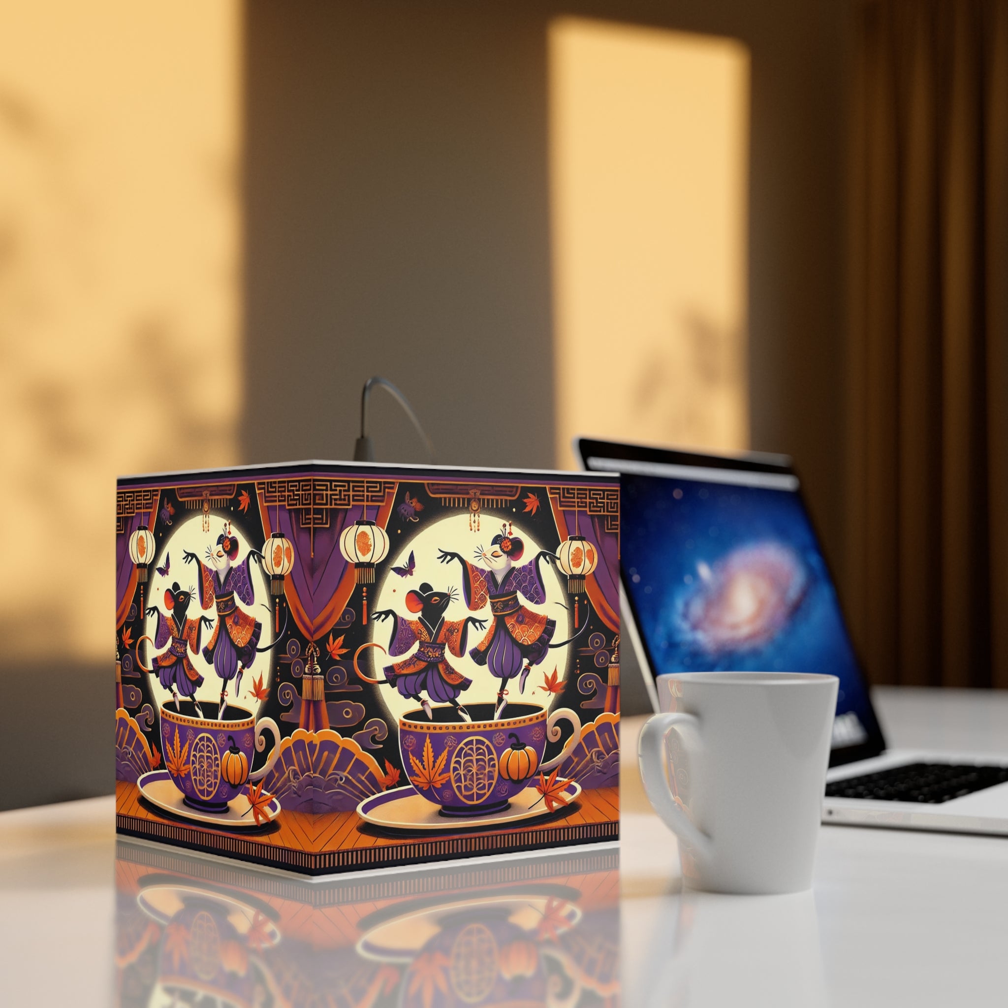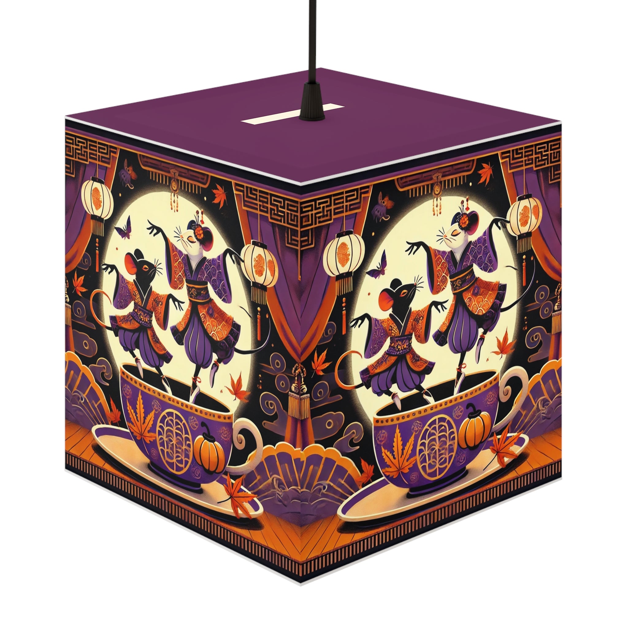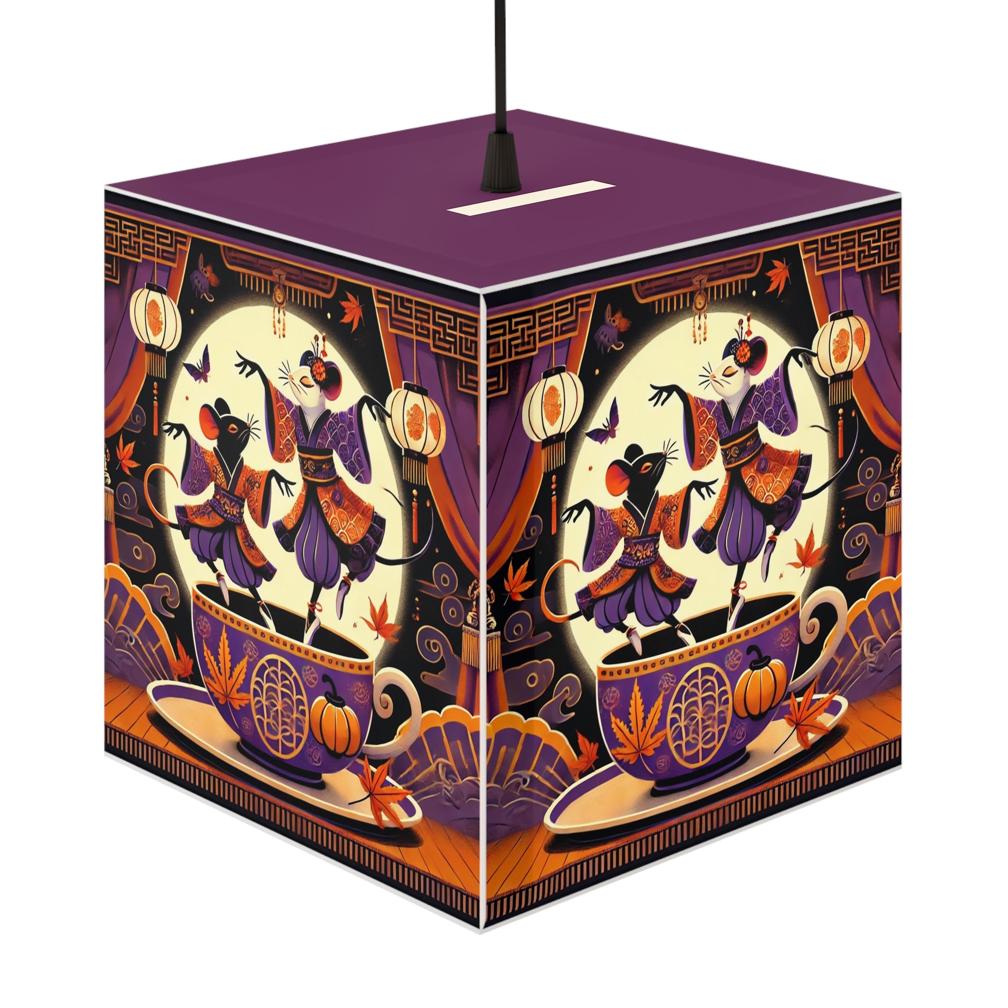 Illuminated across its surface, two kabuki-inspired mice dance playfully along the rim of a beautifully decorated teacup. Their theatrical gestures and stylized expressions capture the bold spirit of Japanese performance art, while the teacup grounds the scene with whimsical Halloween charm. As the lamp casts its warm glow, the mice seem to come alive, blending enchantment, artistry, and seasonal magic into an unforgettable piece of décor.