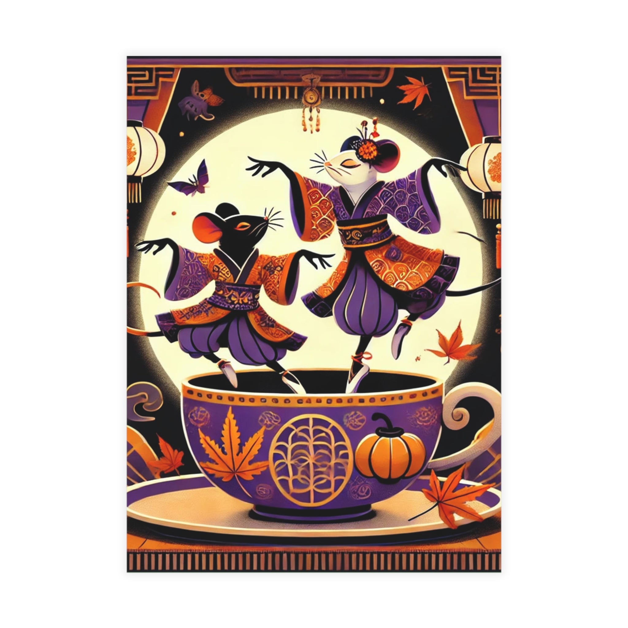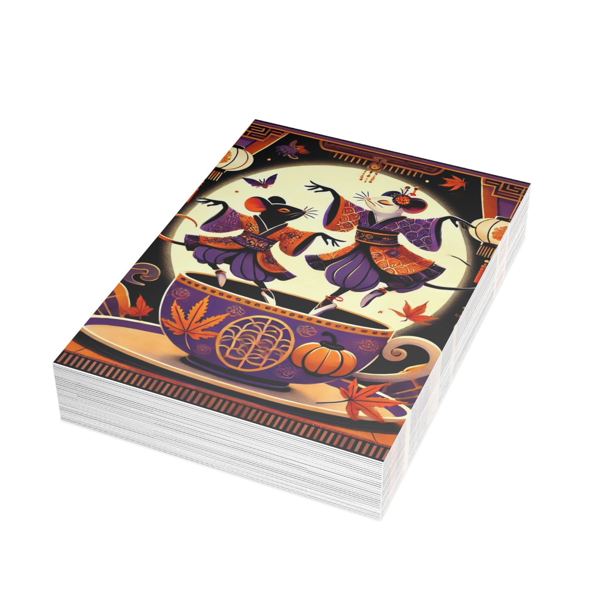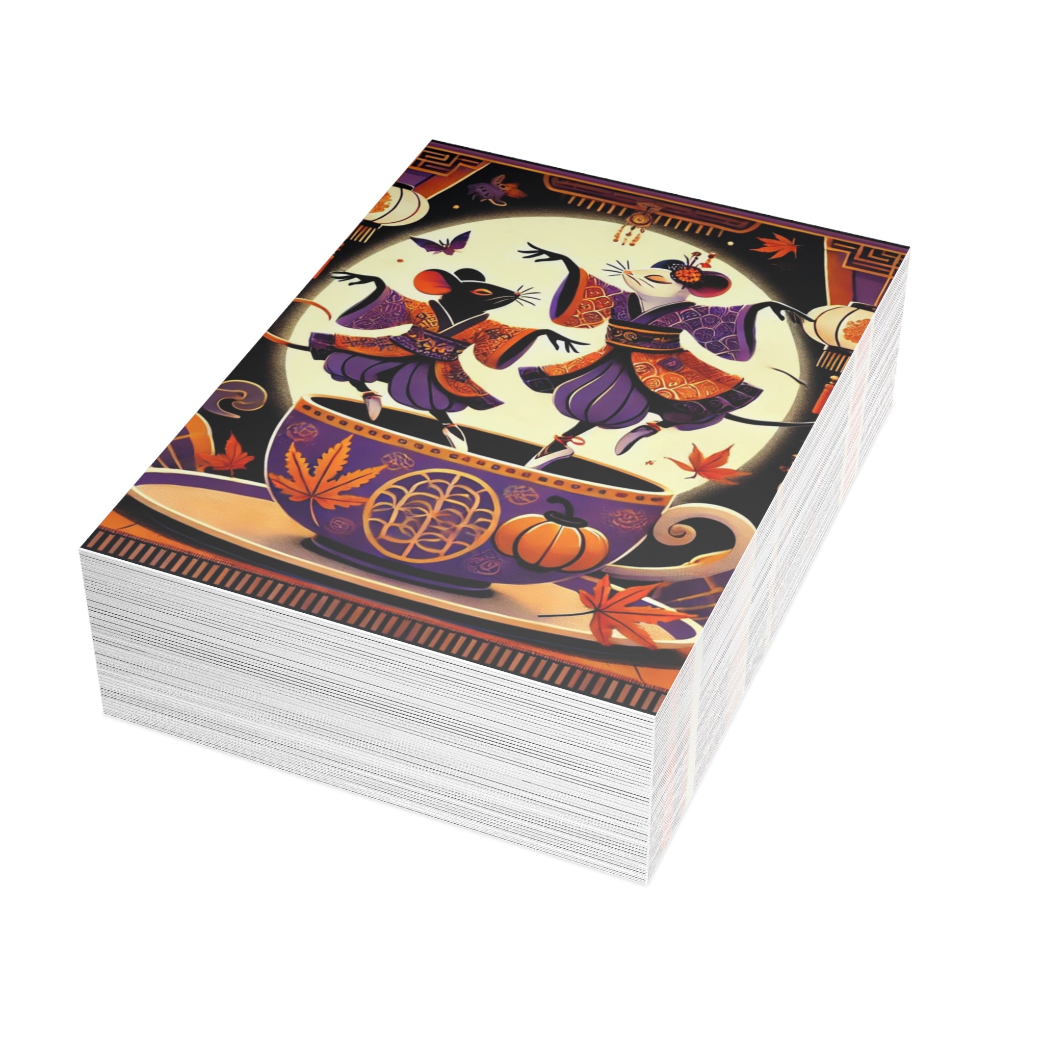 Send a touch of theatrical Halloween magic with these whimsical postcards. Each bundle (10, 30, or 50) features premium-quality cards available in four finishes—matte, uncoated, one-side coat, or two-side coat—complete with envelopes. The design showcases two Kabuki-inspired mice dancing playfully on the rim of a decorated teacup, blending Japanese theater flair with Halloween charm. Perfect for invitations, greetings, or seasonal notes, these postcards combine function with bold artistry, making every message feel like part of a festive performance.