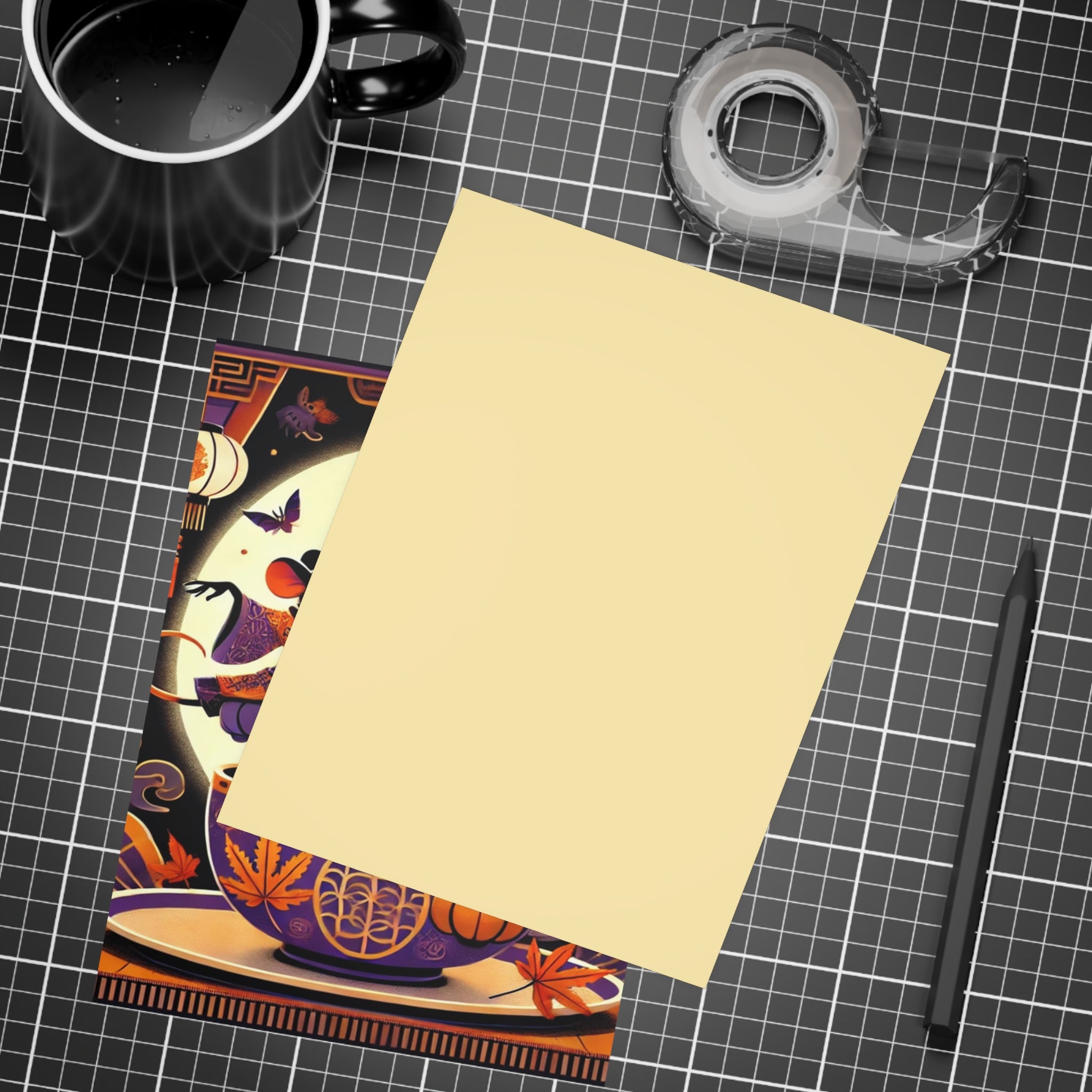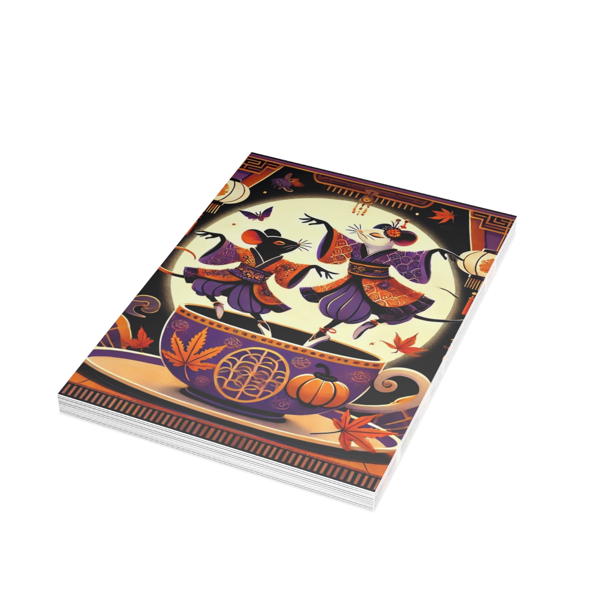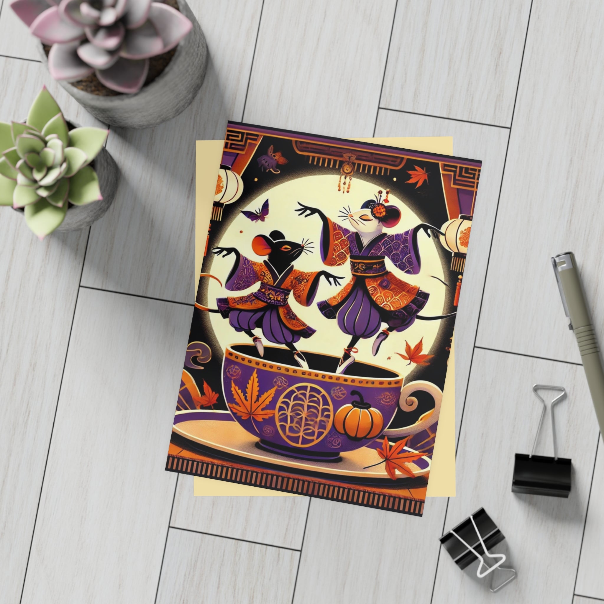 Send a touch of theatrical Halloween magic with these whimsical postcards. Each bundle (10, 30, or 50) features premium-quality cards available in four finishes—matte, uncoated, one-side coat, or two-side coat—complete with envelopes. The design showcases two Kabuki-inspired mice dancing playfully on the rim of a decorated teacup, blending Japanese theater flair with Halloween charm. Perfect for invitations, greetings, or seasonal notes, these postcards combine function with bold artistry, making every message feel like part of a festive performance.