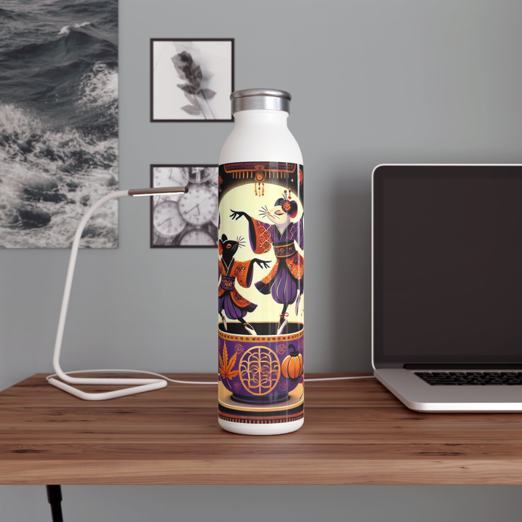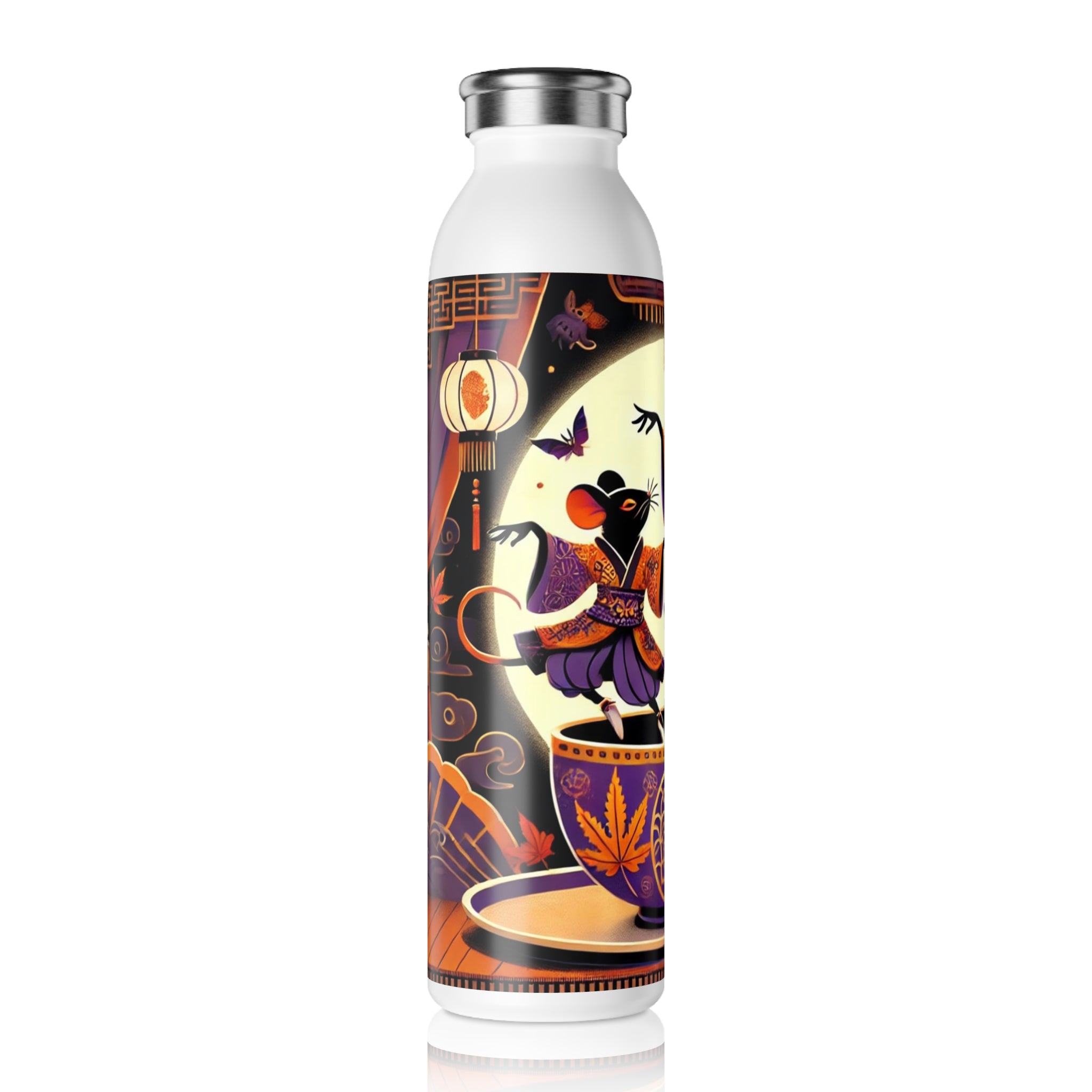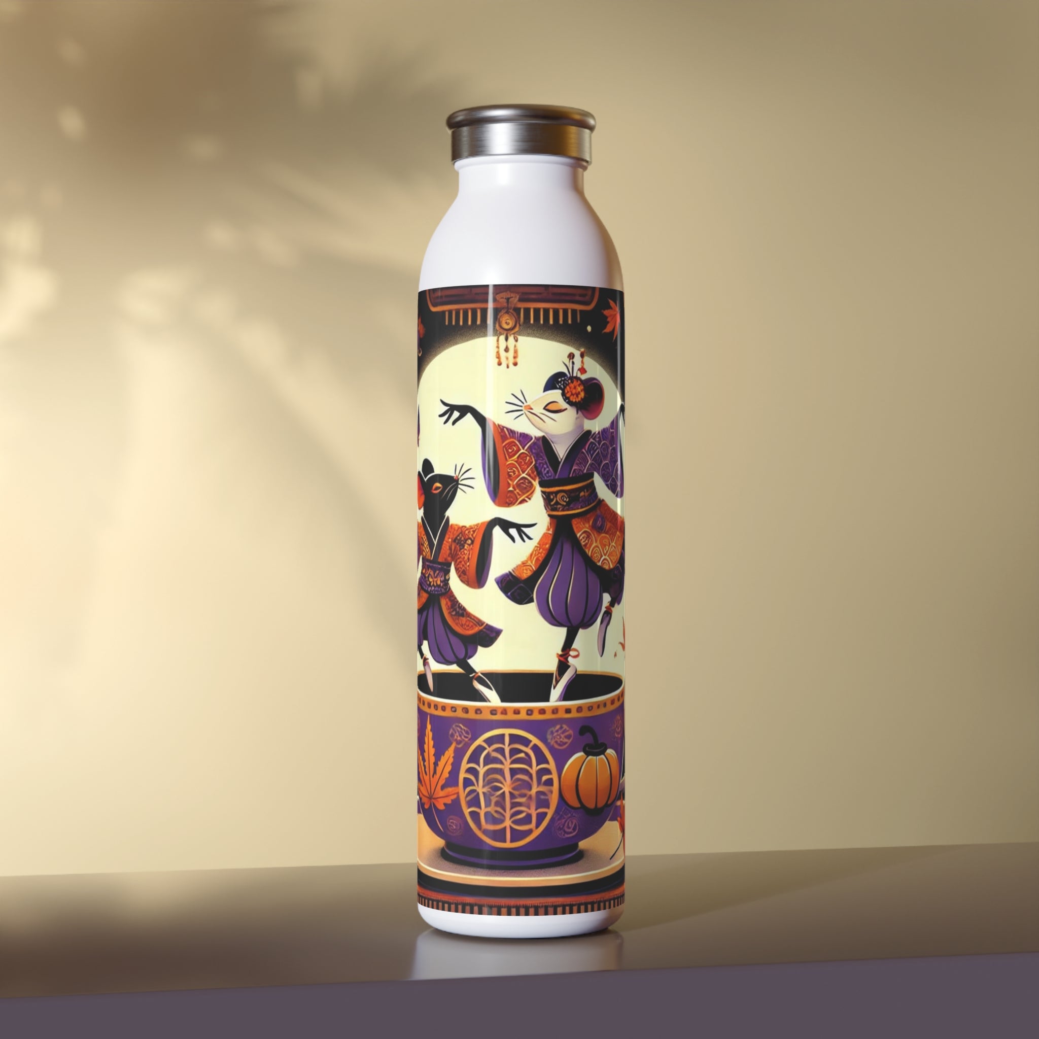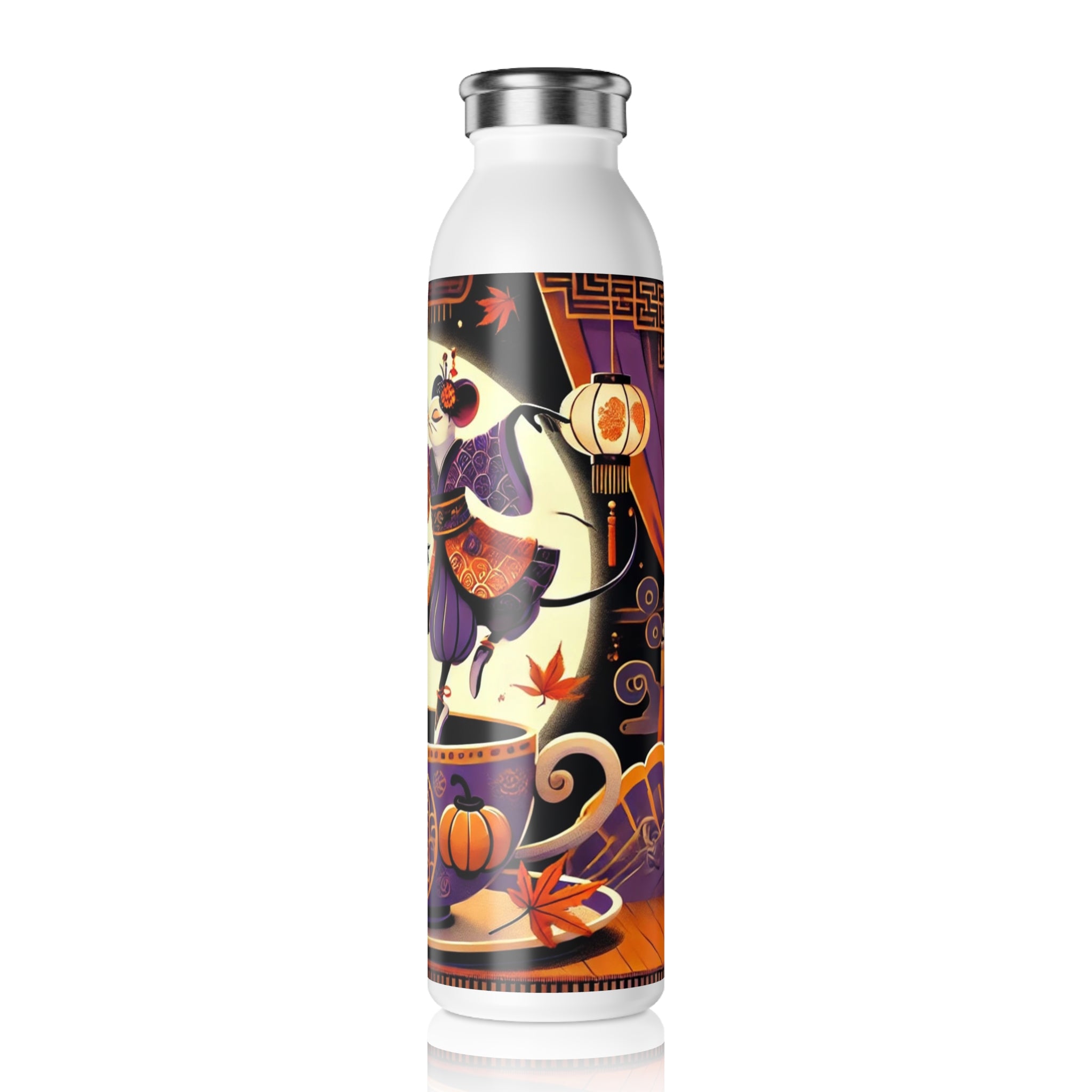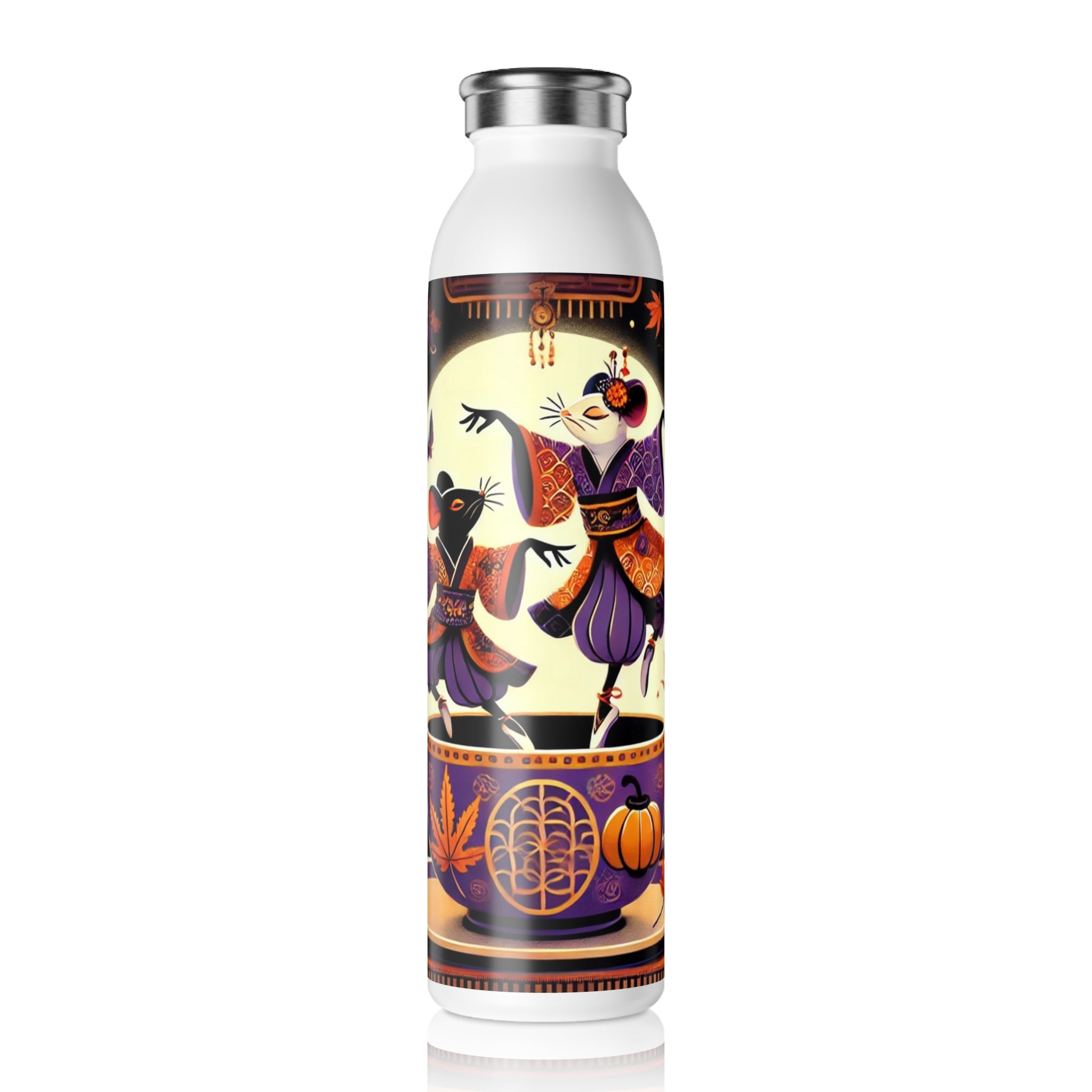 Adding a touch of whimsy, the bottle features a vibrant Halloween scene of two kabuki-inspired mice dancing playfully on the rim of a decorated teacup. The bold, theatrical design transforms a simple water bottle into a captivating piece of cultural artistry, blending Japanese performance tradition with seasonal charm. Durable, practical, and imaginative, it’s a statement piece you’ll enjoy using every day.