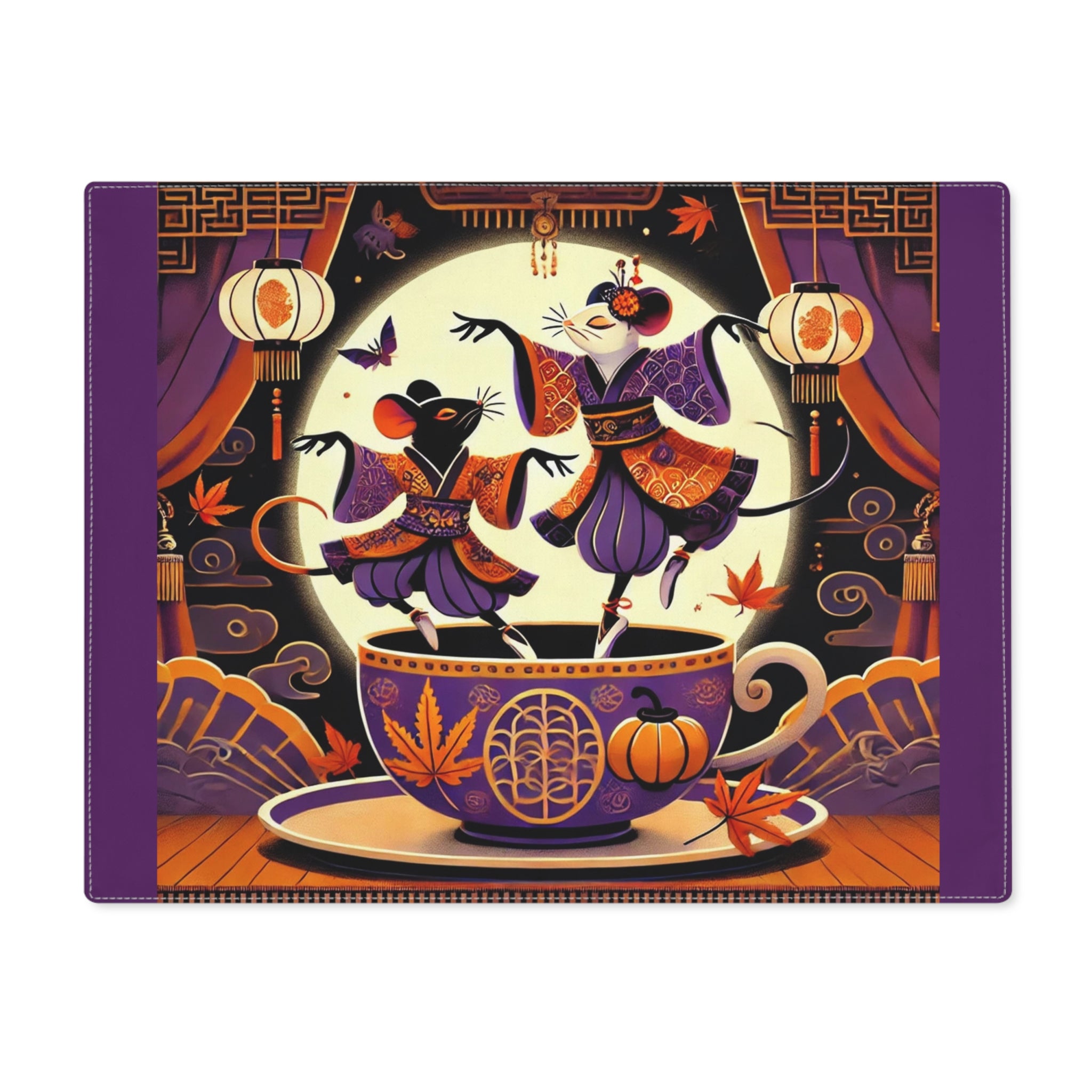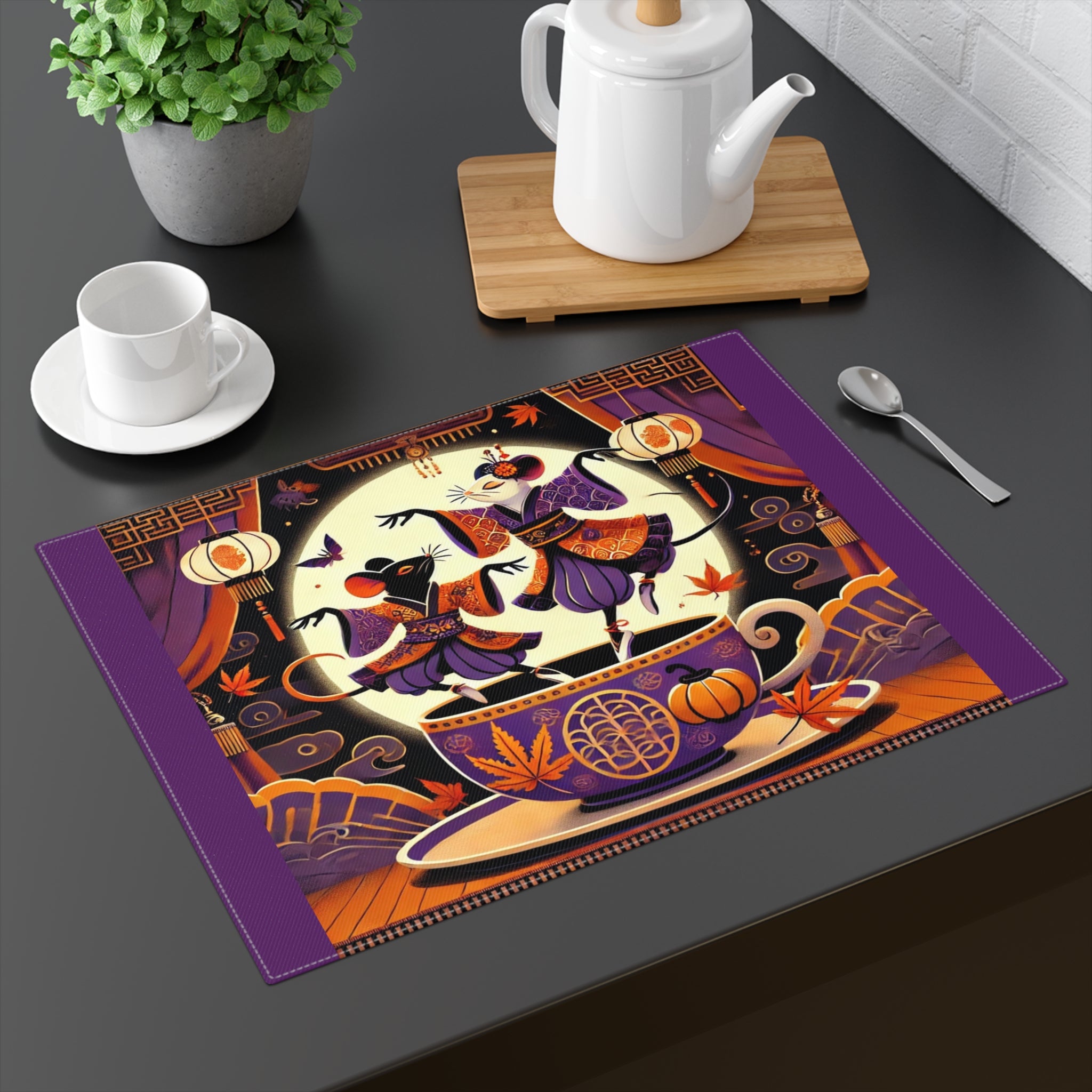 Bring a touch of theatrical magic to your dining table with this enchanting cotton placemat. Crafted for both elegance and durability, the double-sided design features a smooth, vibrant print on top and a natural cotton back for stability. Fade-resistant, easy to clean, and resilient enough for everyday meals or formal gatherings, it combines practicality with artistry. Across its surface, two kabuki-inspired mice dance upon the rim of a decorated teacup, their playful movements infusing the table with Halloween charm and bold creative flair. This whimsical design turns any meal into a scene of cultural celebration, blending tradition with seasonal fantasy.