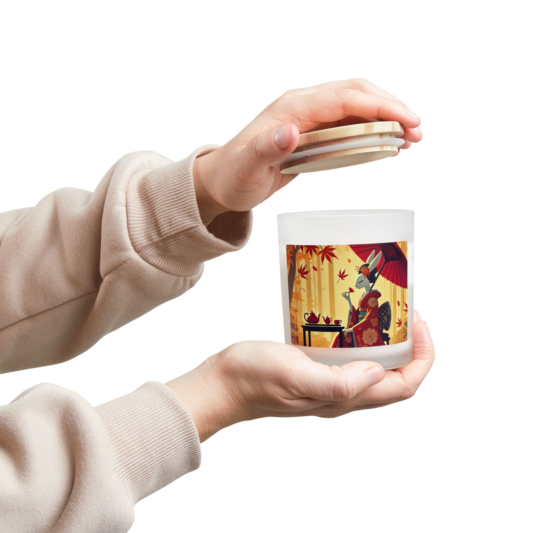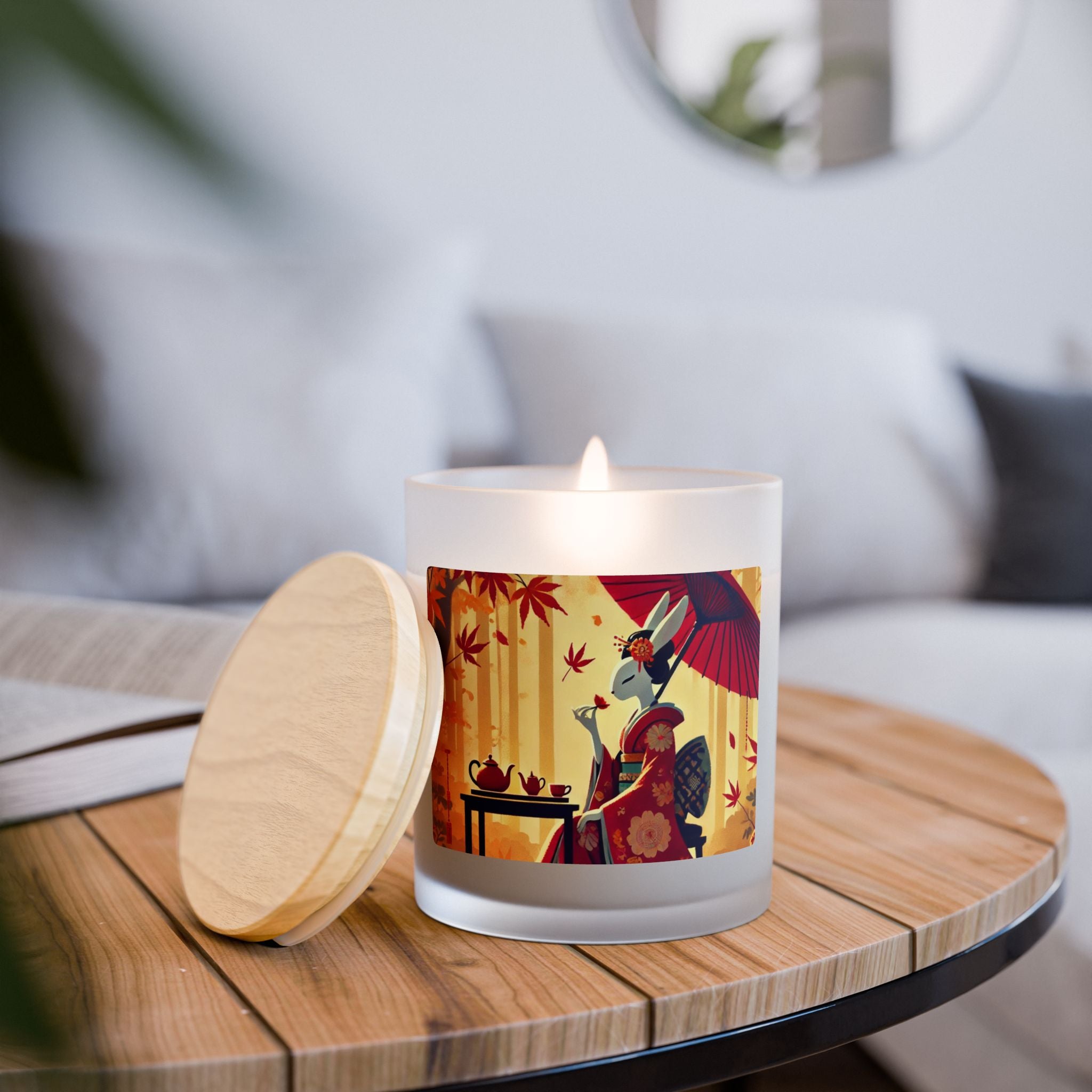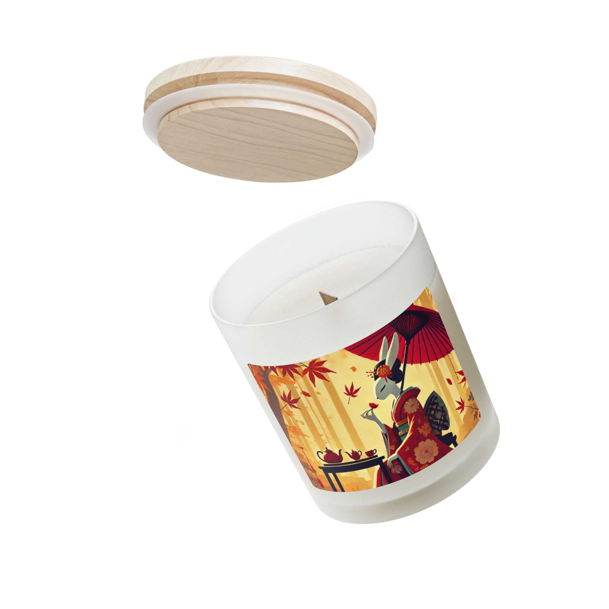 Add warmth, fragrance, and artistry to your home with this 11oz frosted glass candle. Designed with a wooden wick that crackles softly as it burns, it creates a soothing ambiance while filling the room with lush scent. The frosted glass vessel is wrapped in the Theatrical Harvest Rabbit design, a kabuki-inspired artwork in bold flat style. A graceful rabbit in elegant harvest robes sits serenely beneath a crimson umbrella, the scene alive with theatrical color and whimsical flair. More than a light source, this candle doubles as an elegant décor piece—blending serenity, tradition, and fantasy into an everyday essential. Perfect for relaxation, home styling, or gifting, it transforms any space into a showcase of cultural artistry.