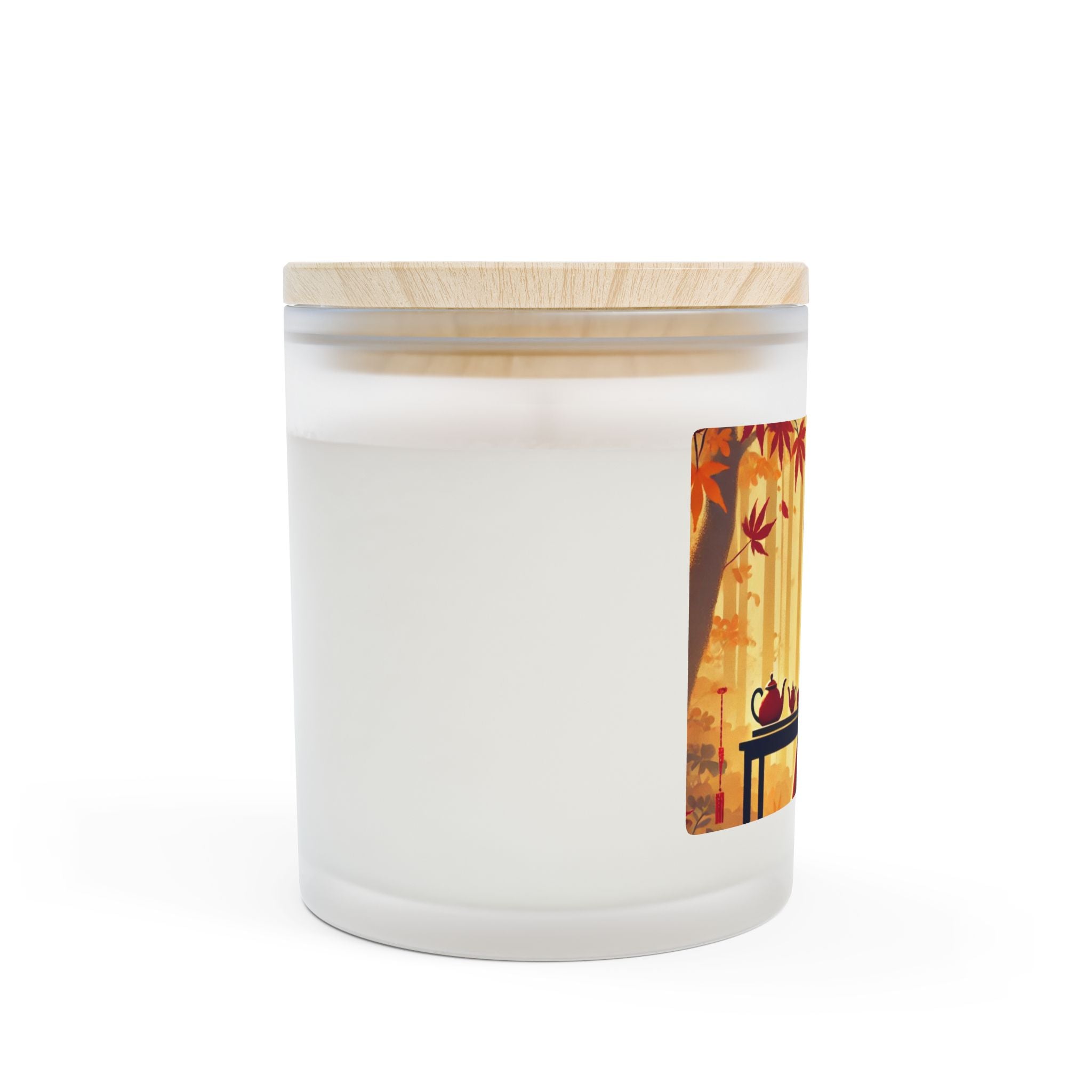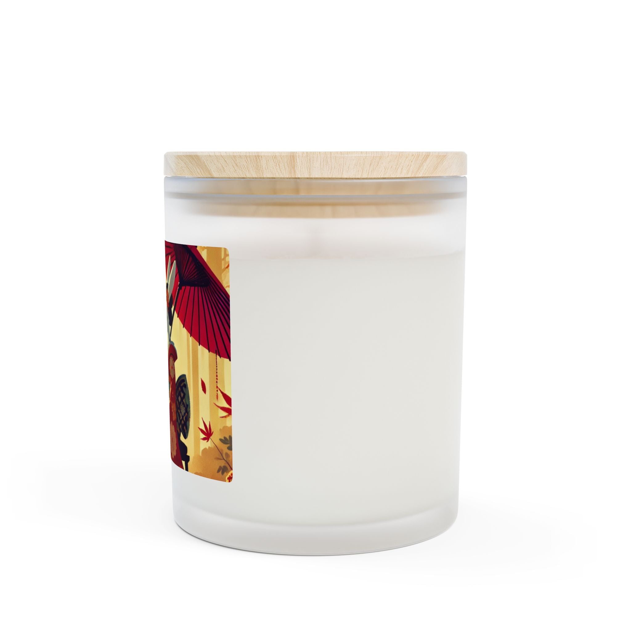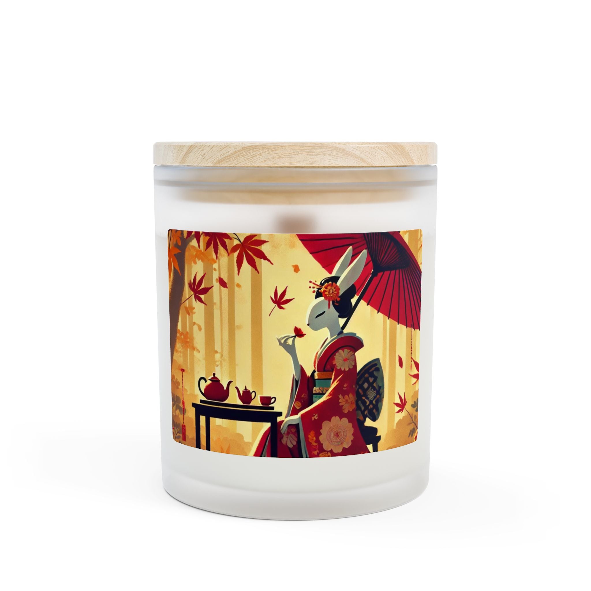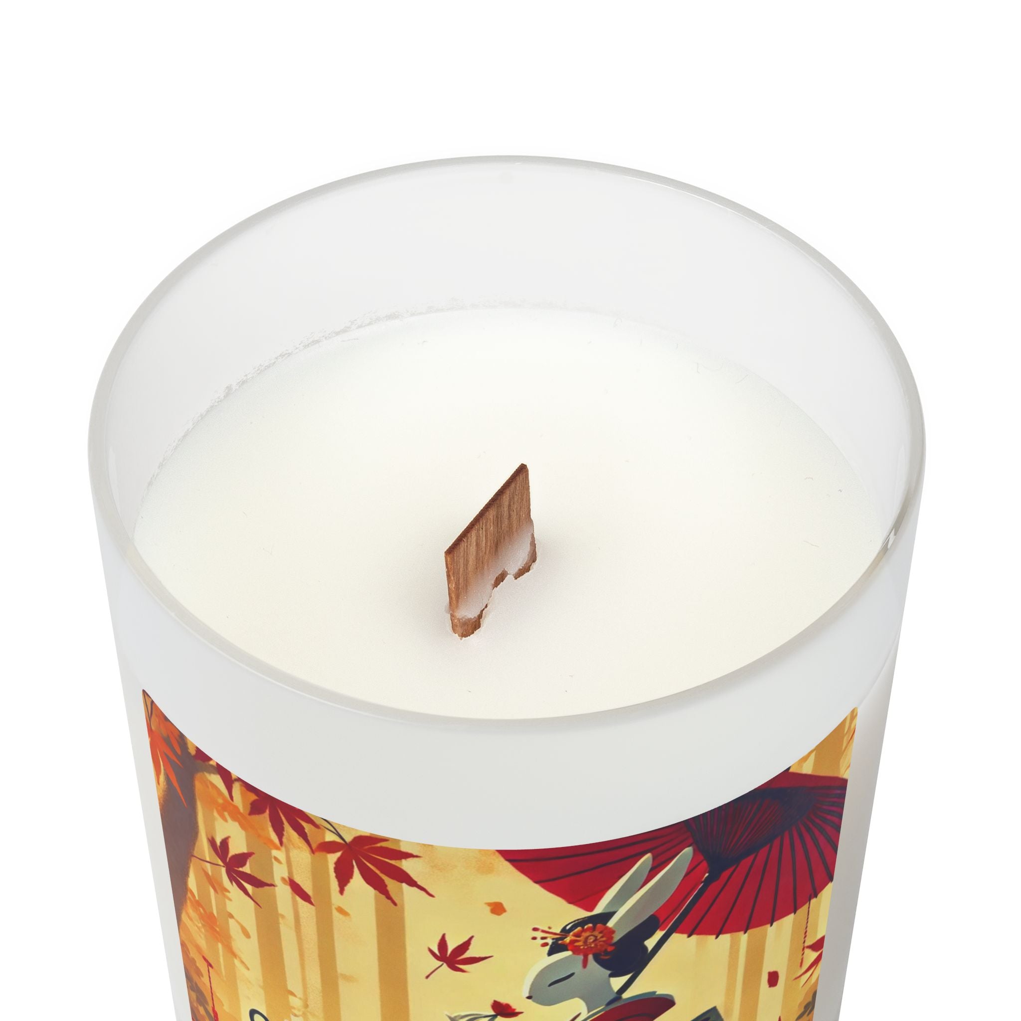 Add warmth, fragrance, and artistry to your home with this 11oz frosted glass candle. Designed with a wooden wick that crackles softly as it burns, it creates a soothing ambiance while filling the room with lush scent. The frosted glass vessel is wrapped in the Theatrical Harvest Rabbit design, a kabuki-inspired artwork in bold flat style. A graceful rabbit in elegant harvest robes sits serenely beneath a crimson umbrella, the scene alive with theatrical color and whimsical flair. More than a light source, this candle doubles as an elegant décor piece—blending serenity, tradition, and fantasy into an everyday essential. Perfect for relaxation, home styling, or gifting, it transforms any space into a showcase of cultural artistry.