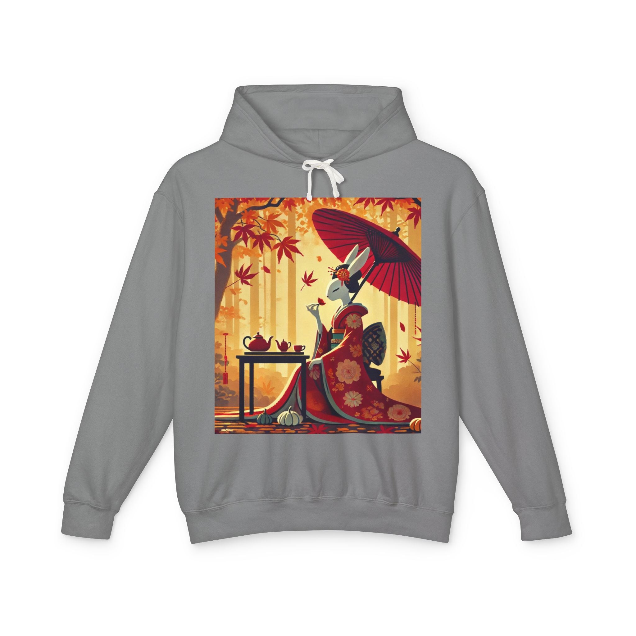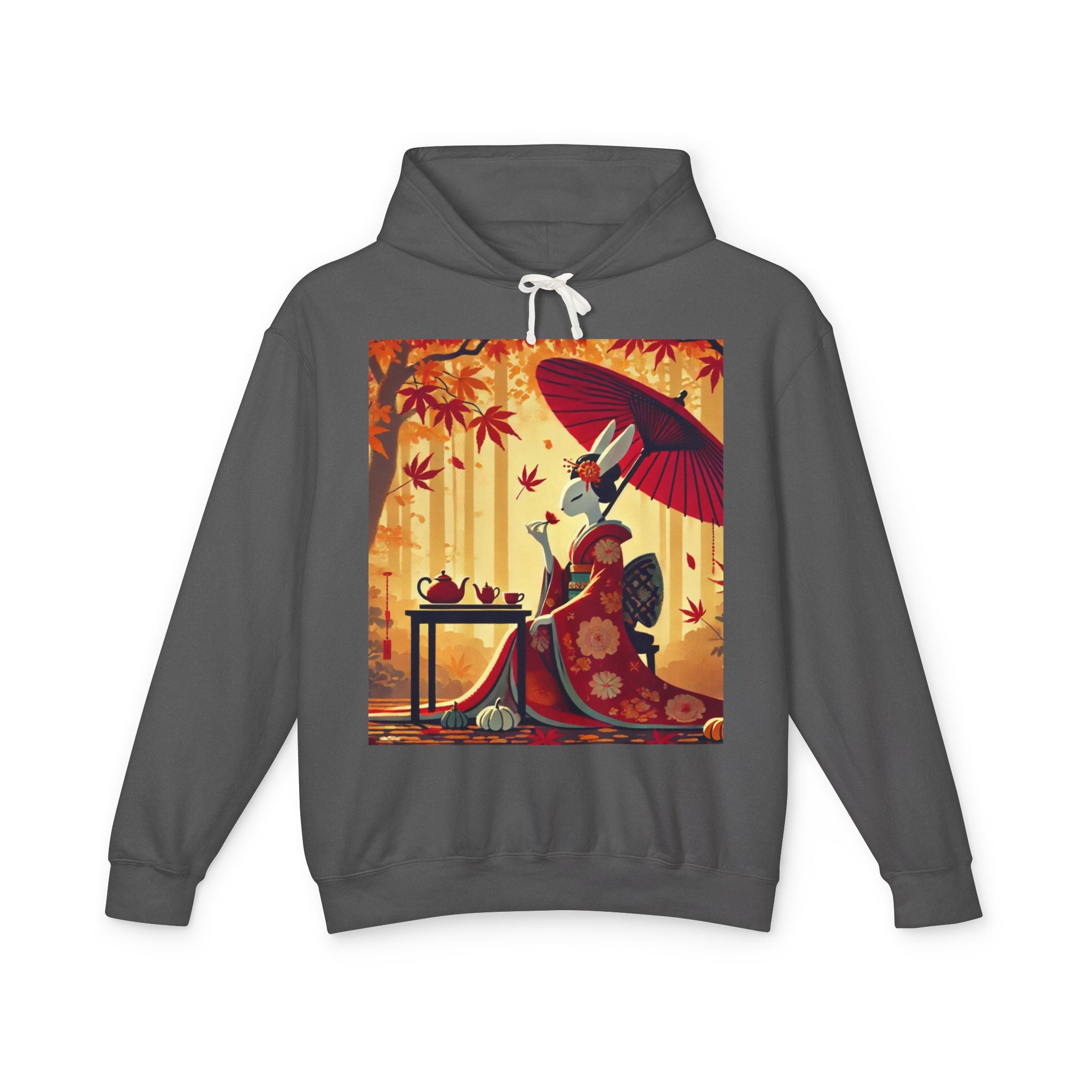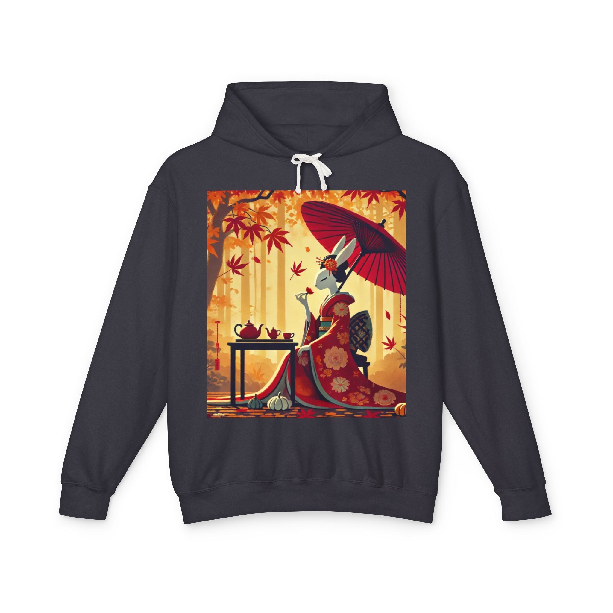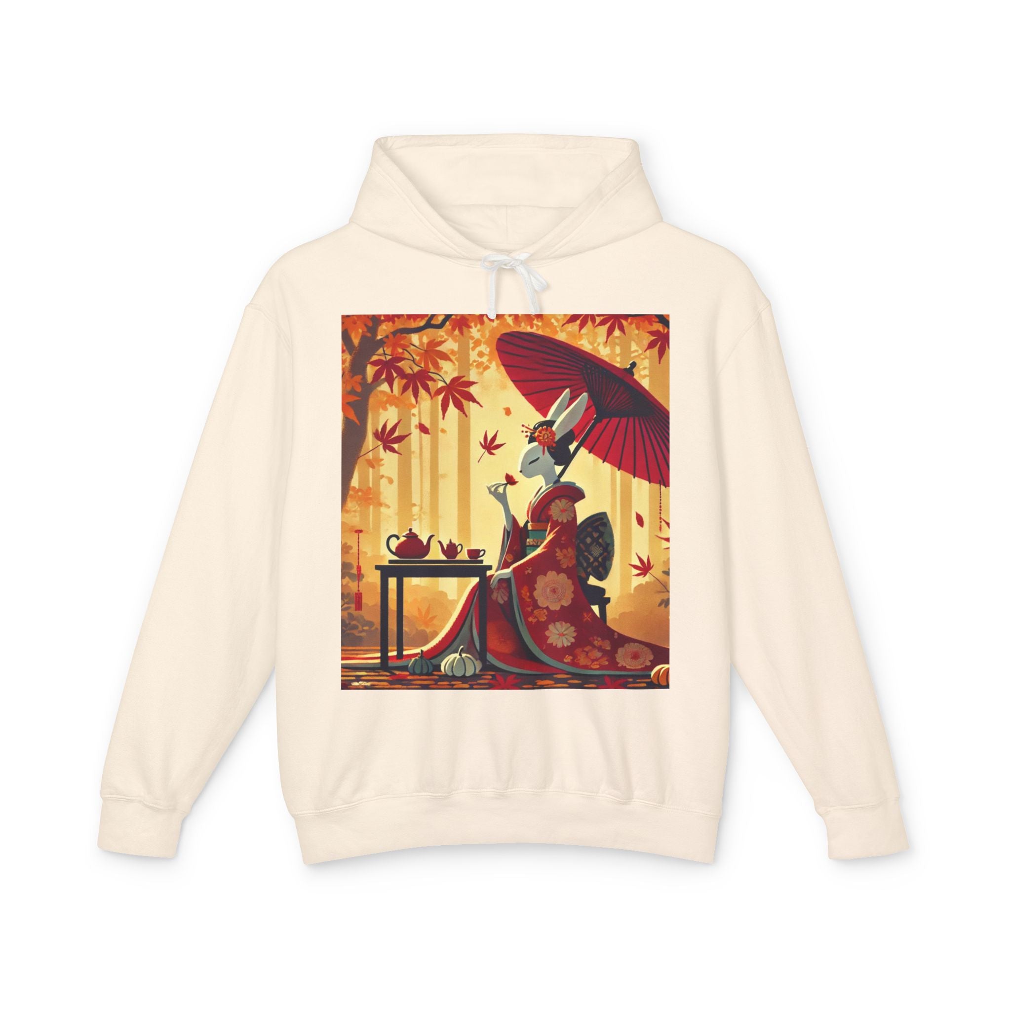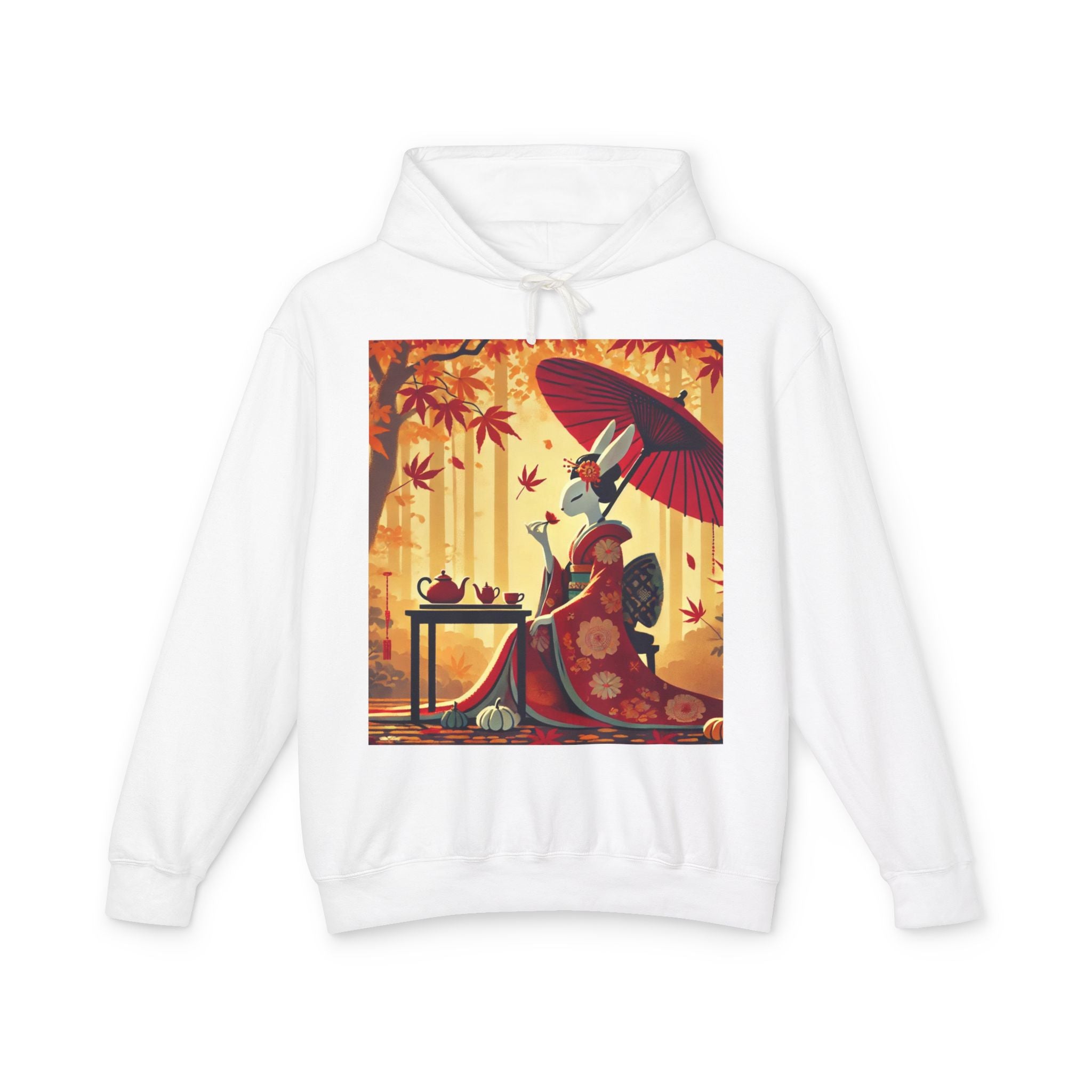 Theatrical Harvest Rabbit Hoodie brings a touch of whimsy and tradition to relaxed everyday style. The artwork unfolds in a kabuki-inspired harvest scene where a graceful rabbit, dressed in elegant seasonal robes, sits calmly beneath a vivid crimson umbrella. Rendered in bold flat style with vibrant color and theatrical flair, the composition blends serenity and performance—capturing the quiet magic of a moment that feels both ceremonial and fantastical.
