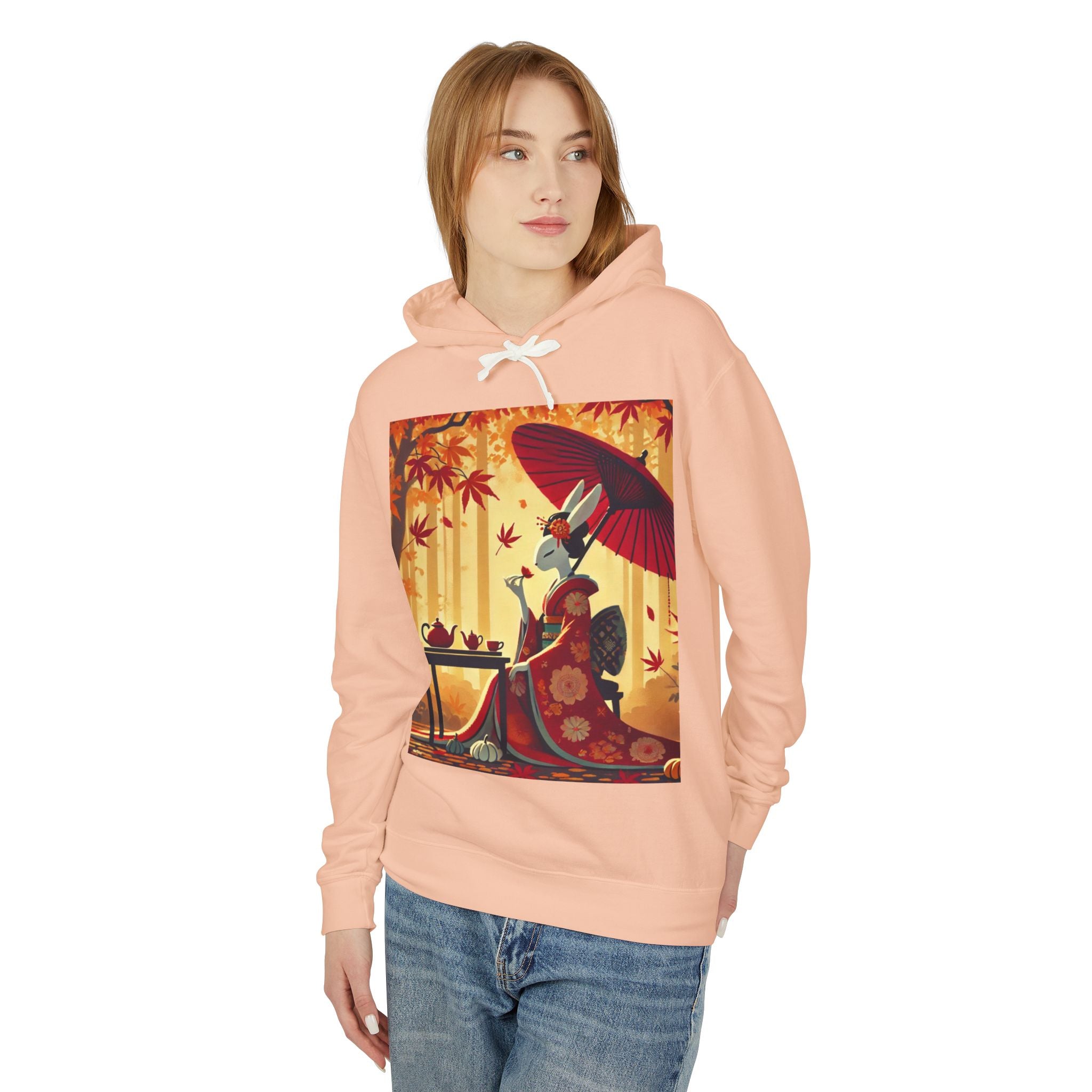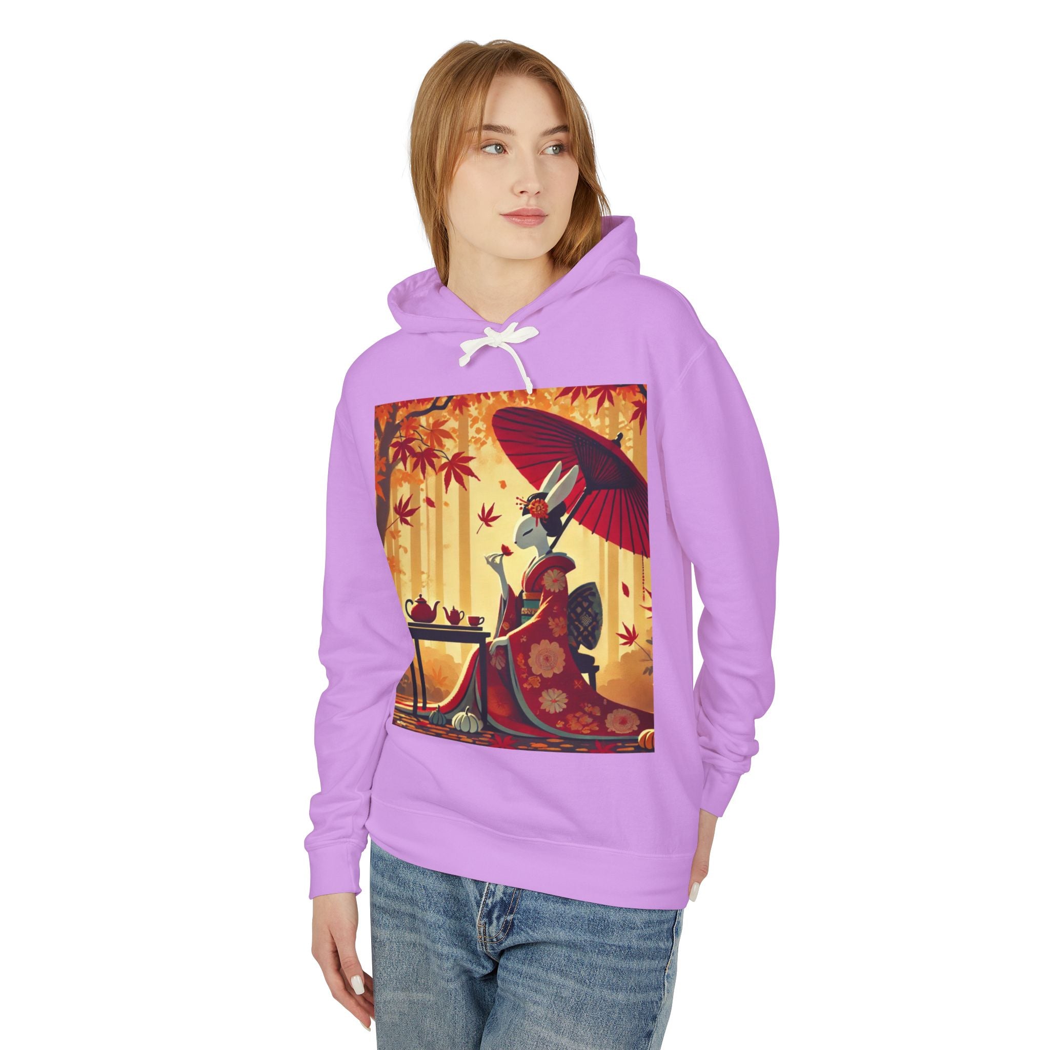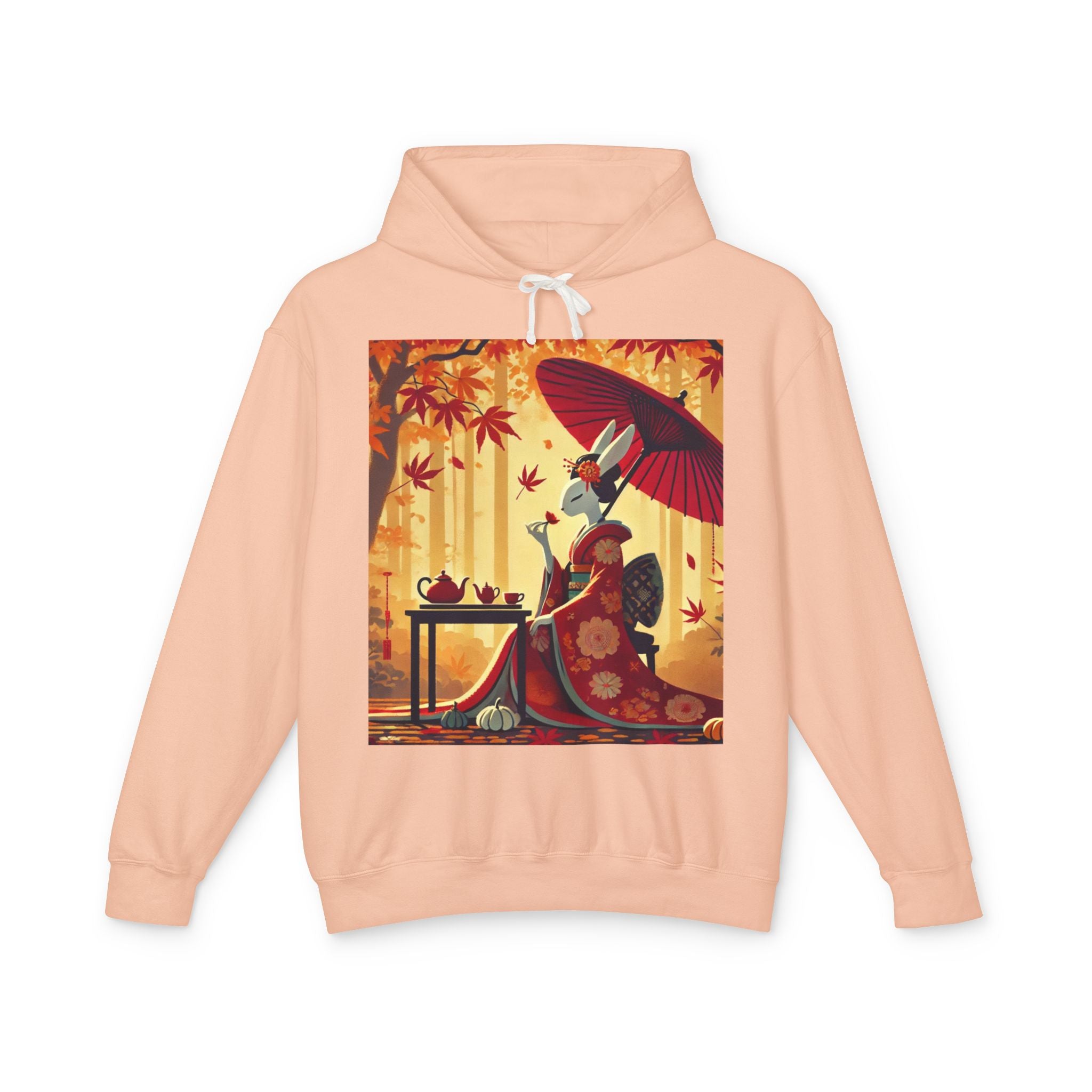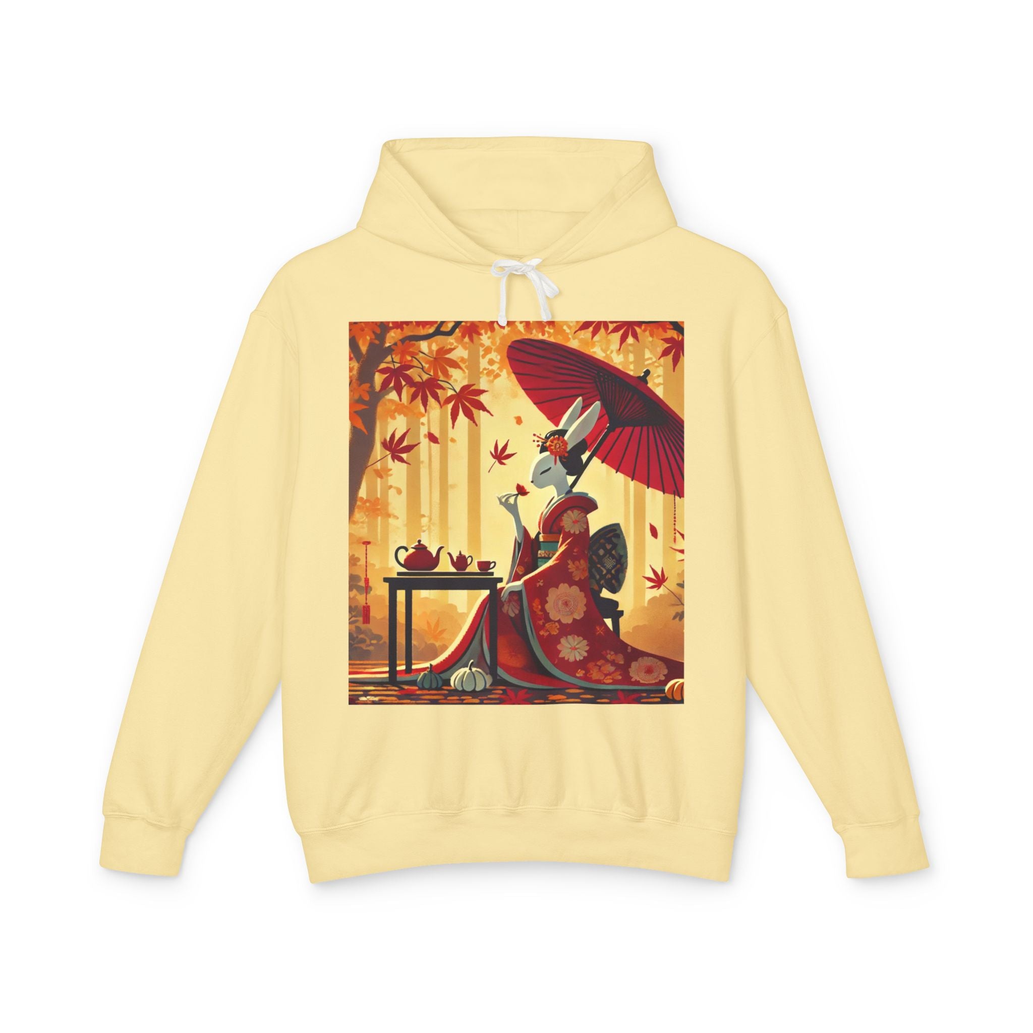 Theatrical Harvest Rabbit Hoodie brings a touch of whimsy and tradition to relaxed everyday style. The artwork unfolds in a kabuki-inspired harvest scene where a graceful rabbit, dressed in elegant seasonal robes, sits calmly beneath a vivid crimson umbrella. Rendered in bold flat style with vibrant color and theatrical flair, the composition blends serenity and performance—capturing the quiet magic of a moment that feels both ceremonial and fantastical.