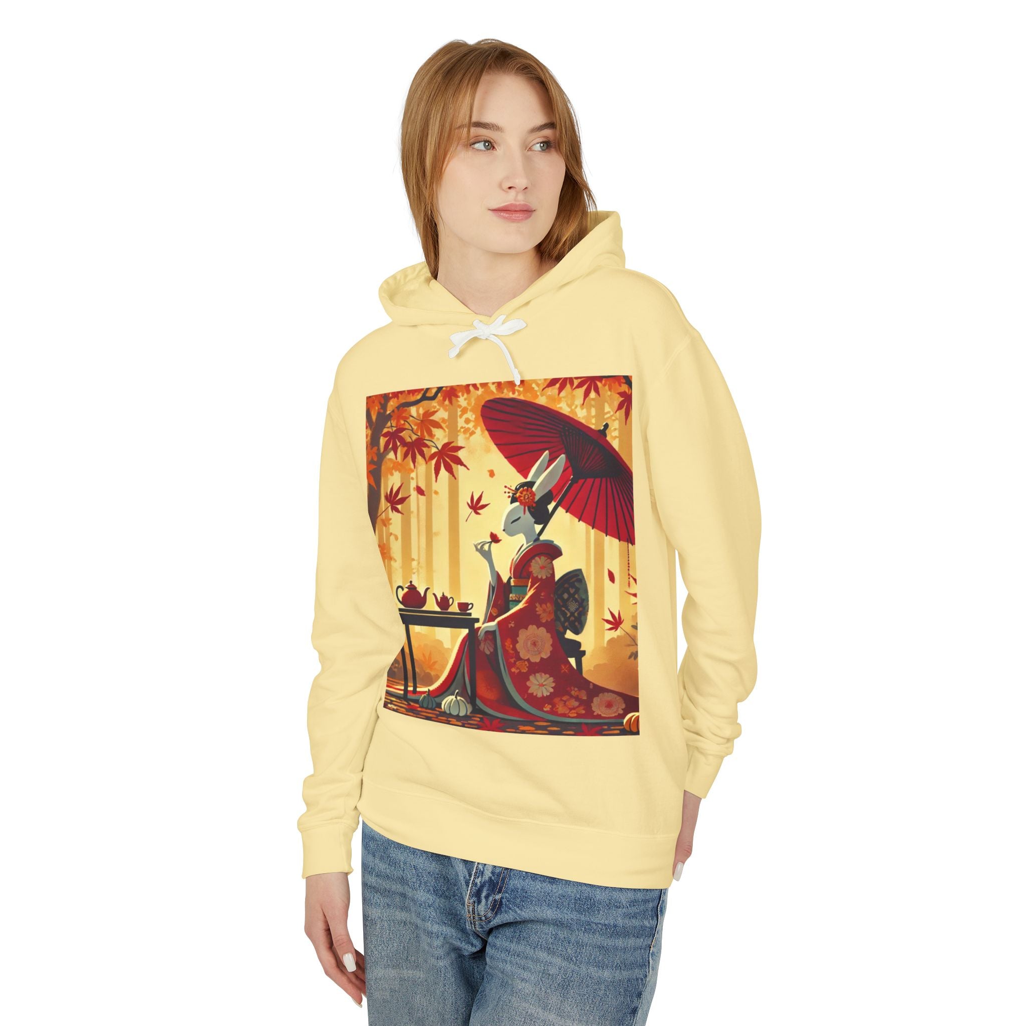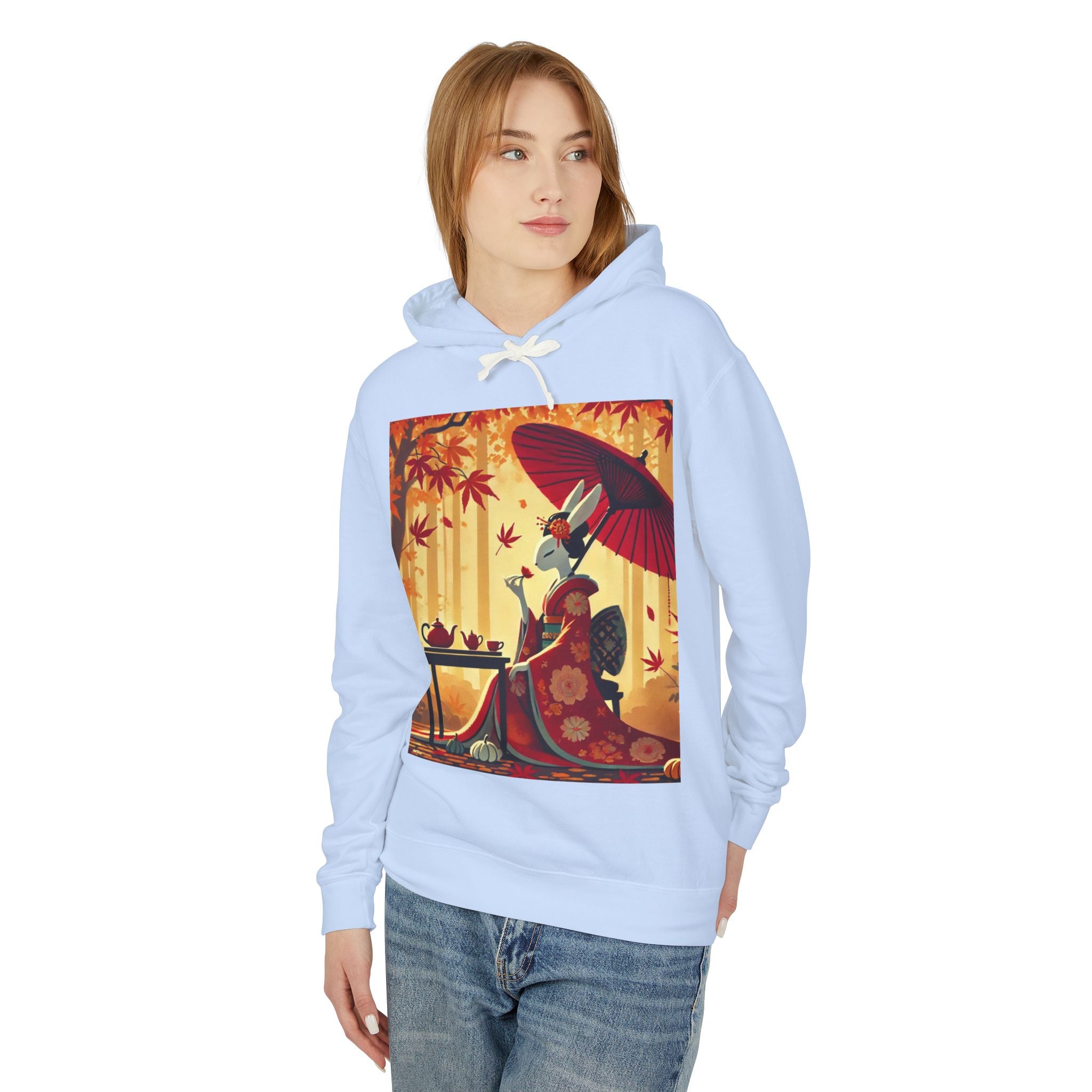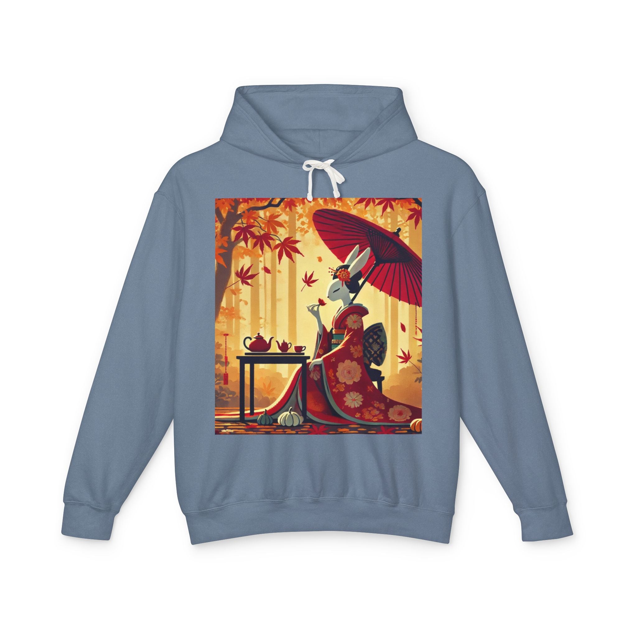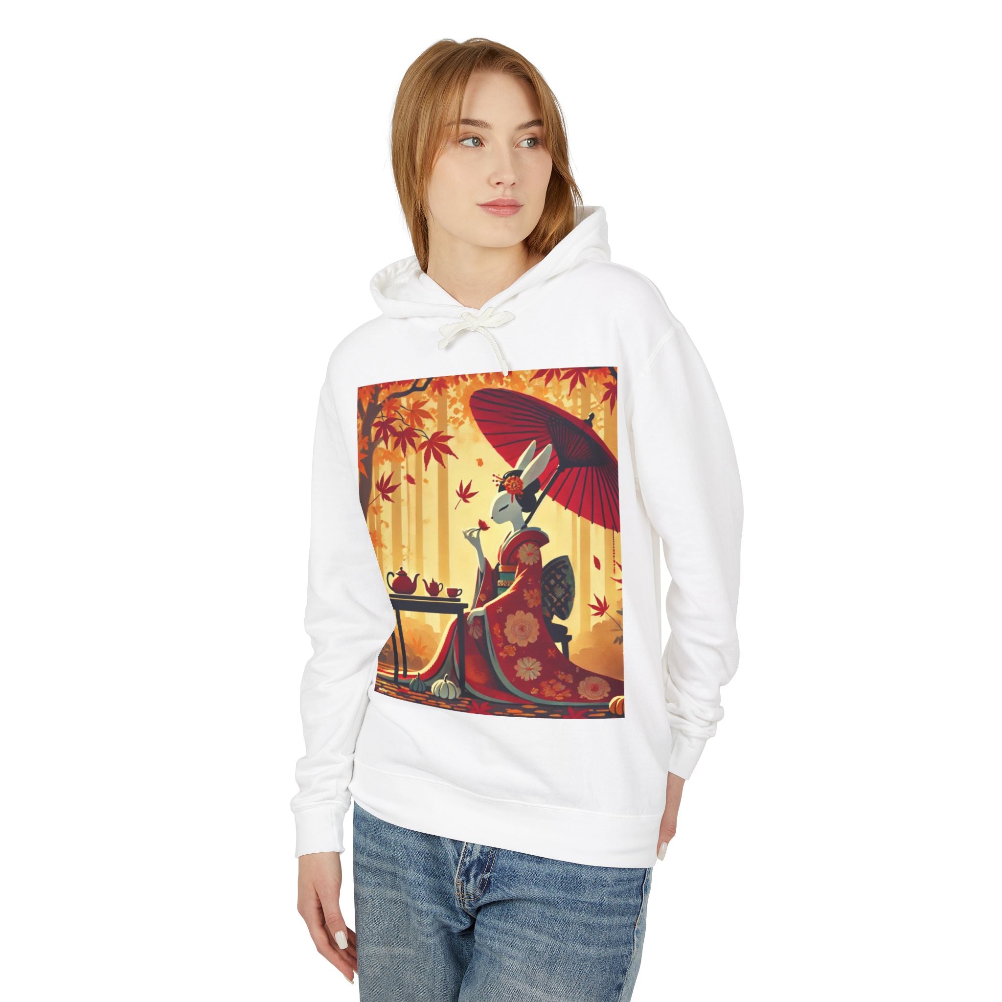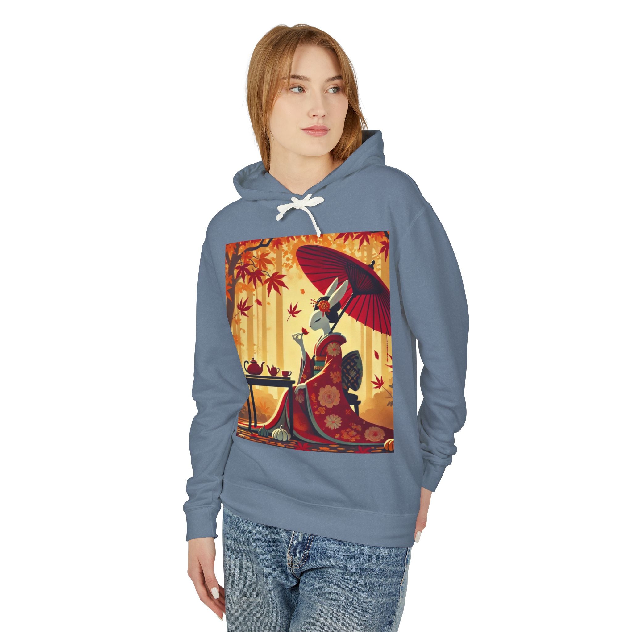 Theatrical Harvest Rabbit Hoodie brings a touch of whimsy and tradition to relaxed everyday style. The artwork unfolds in a kabuki-inspired harvest scene where a graceful rabbit, dressed in elegant seasonal robes, sits calmly beneath a vivid crimson umbrella. Rendered in bold flat style with vibrant color and theatrical flair, the composition blends serenity and performance—capturing the quiet magic of a moment that feels both ceremonial and fantastical.