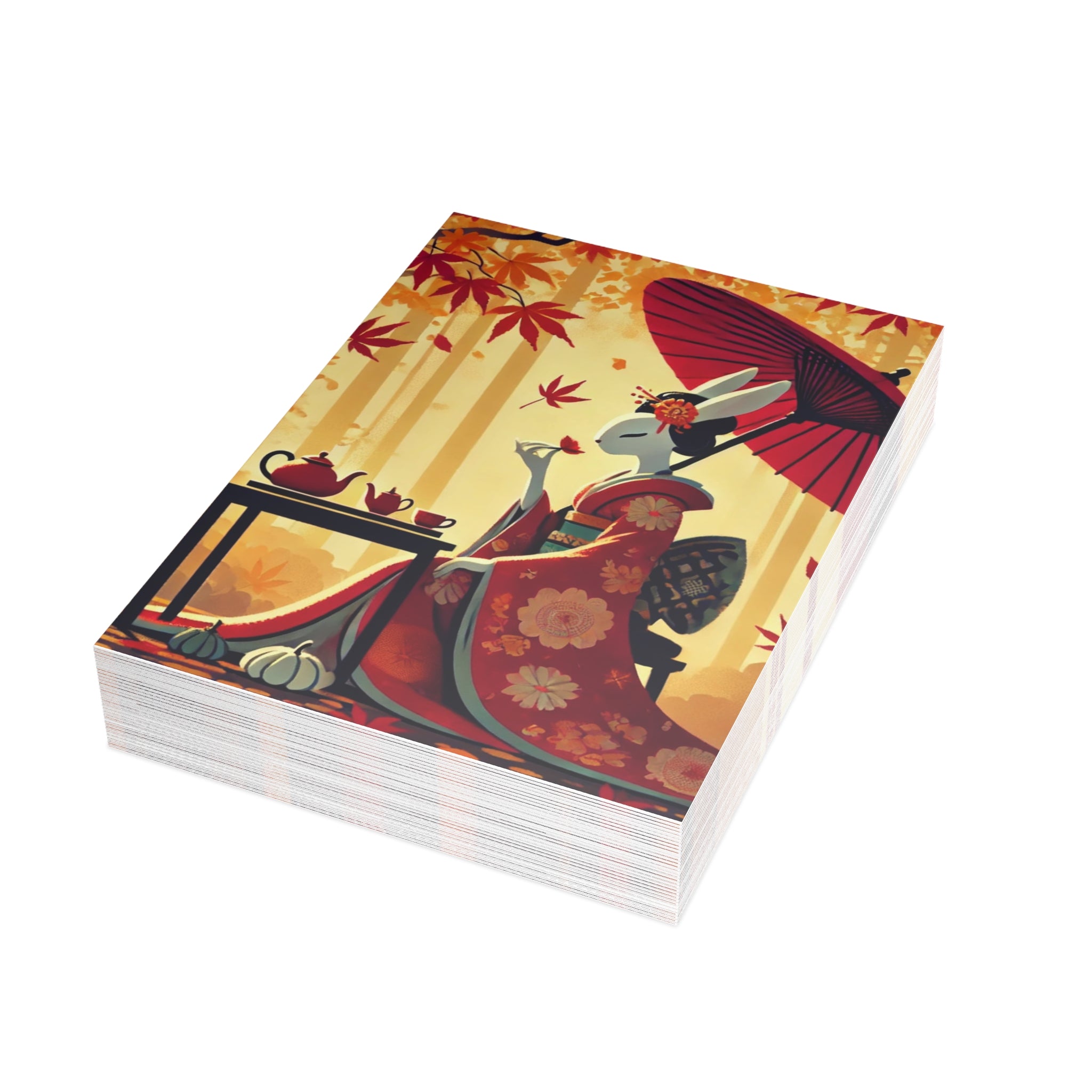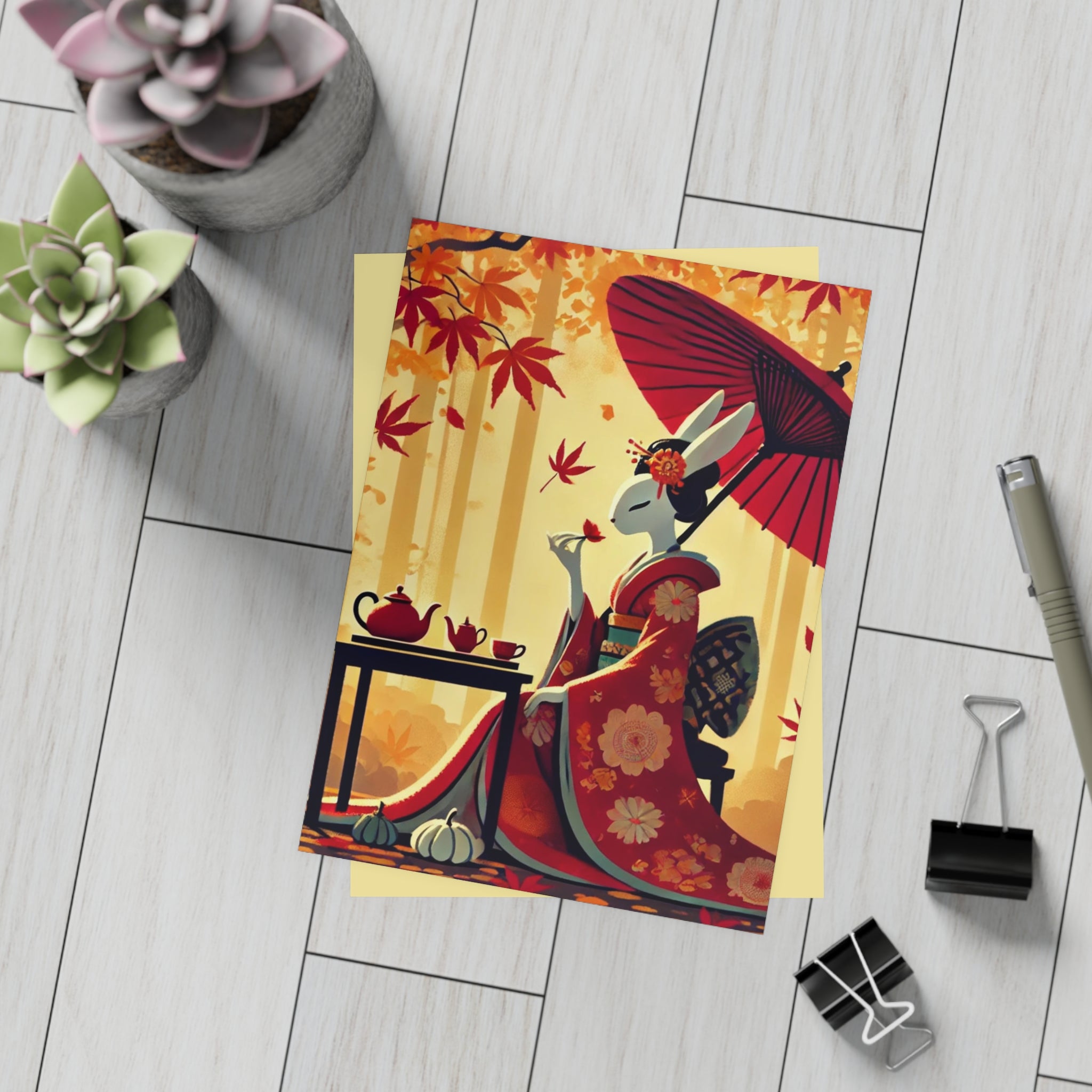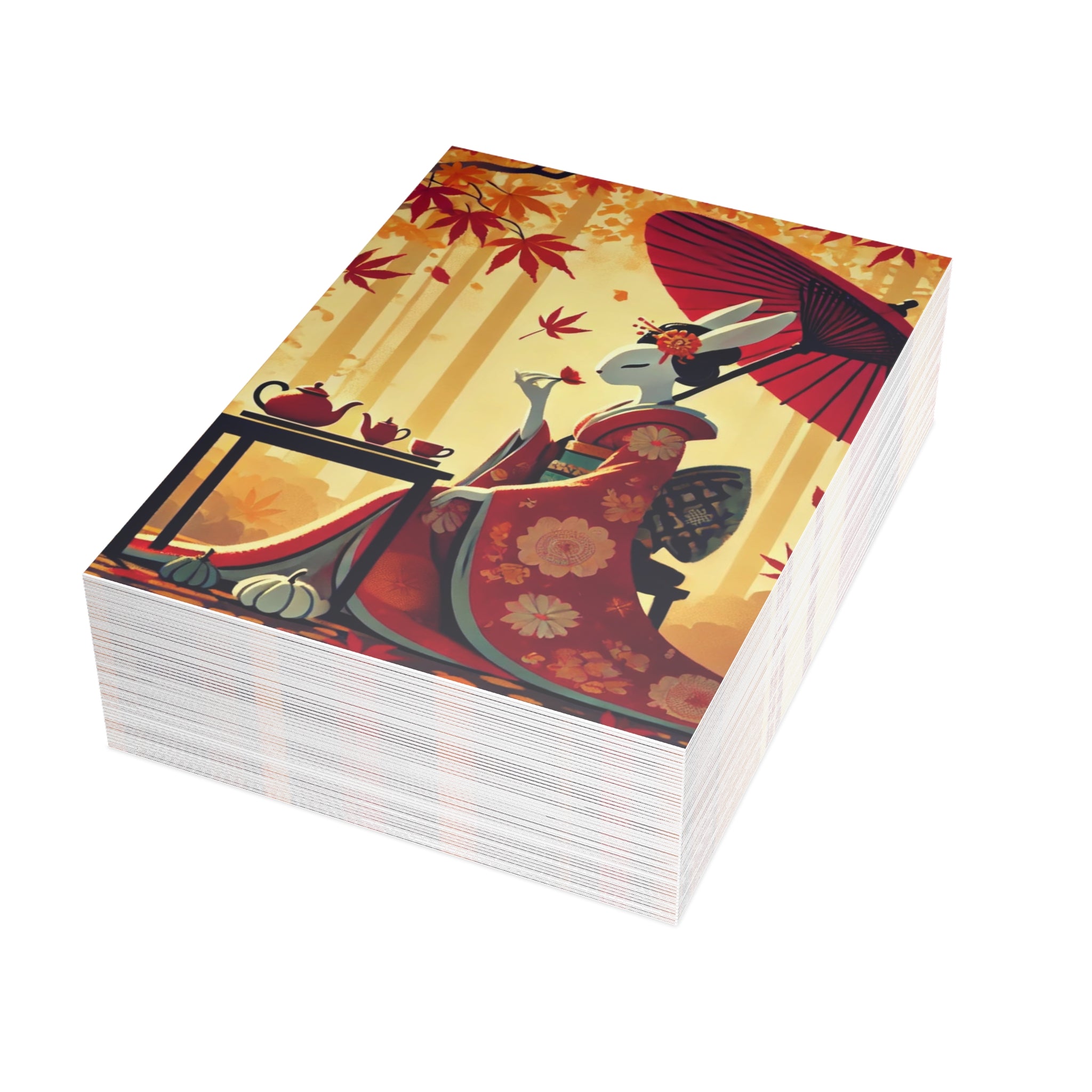 The cover features the Theatrical Harvest Rabbit, a kabuki-inspired scene in bold flat style. A graceful rabbit, dressed in flowing harvest robes, sits serenely beneath a crimson umbrella. The vivid color and theatrical detail transform each postcard into a cultural keepsake—capturing serenity, tradition, and whimsy in a format meant to be shared.