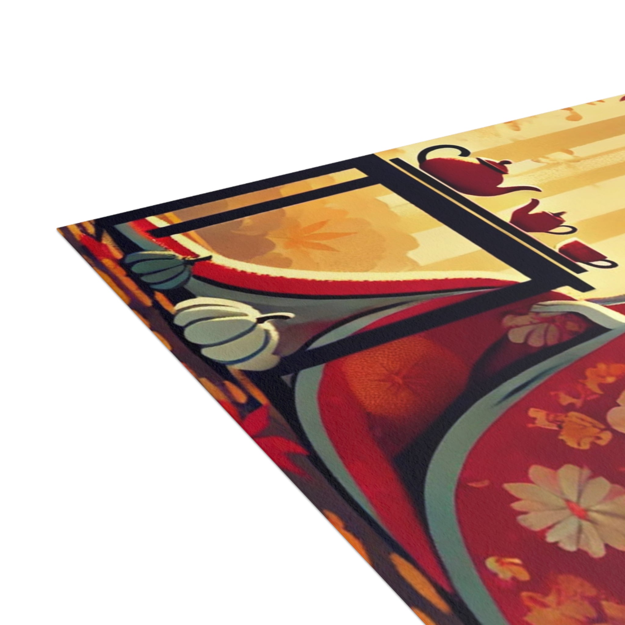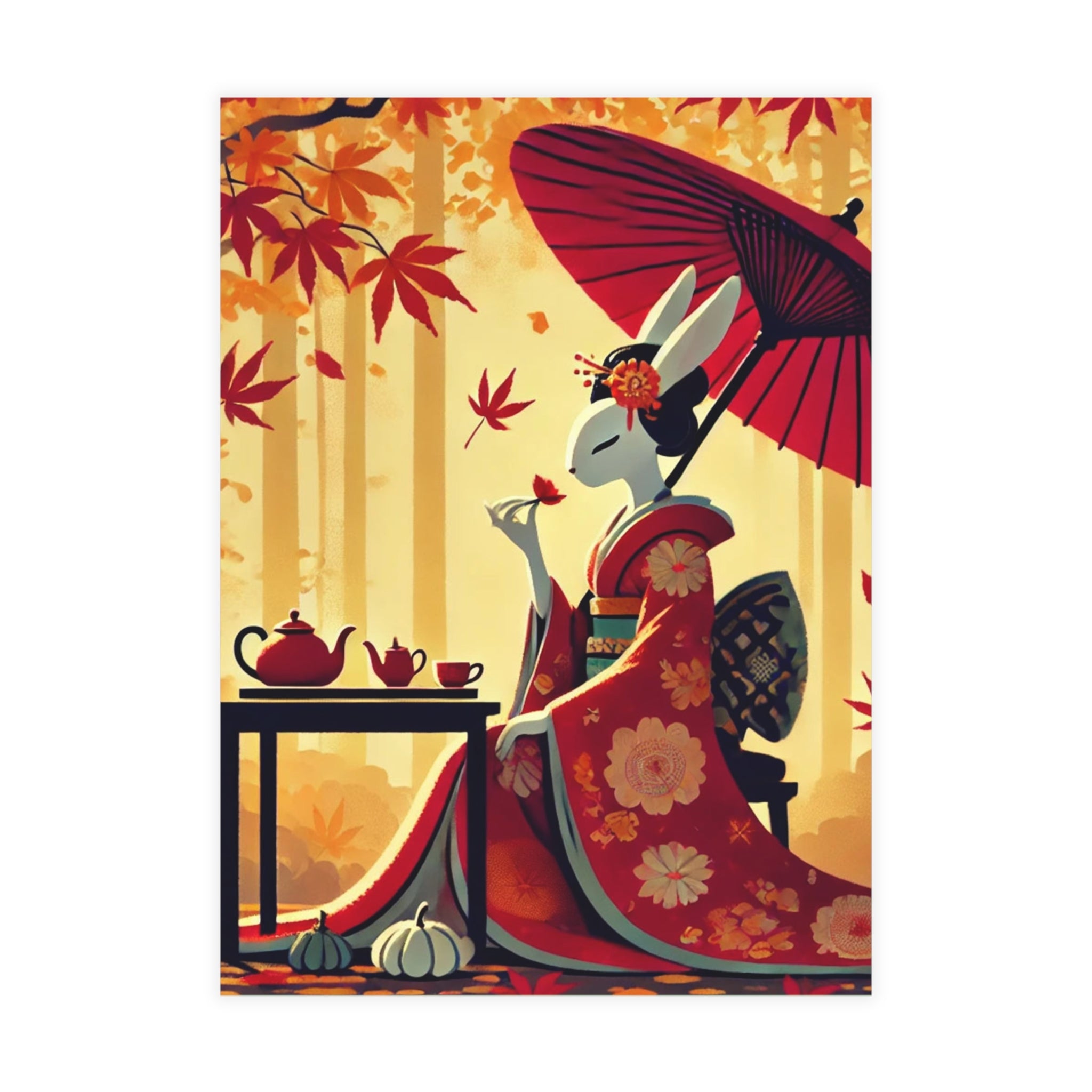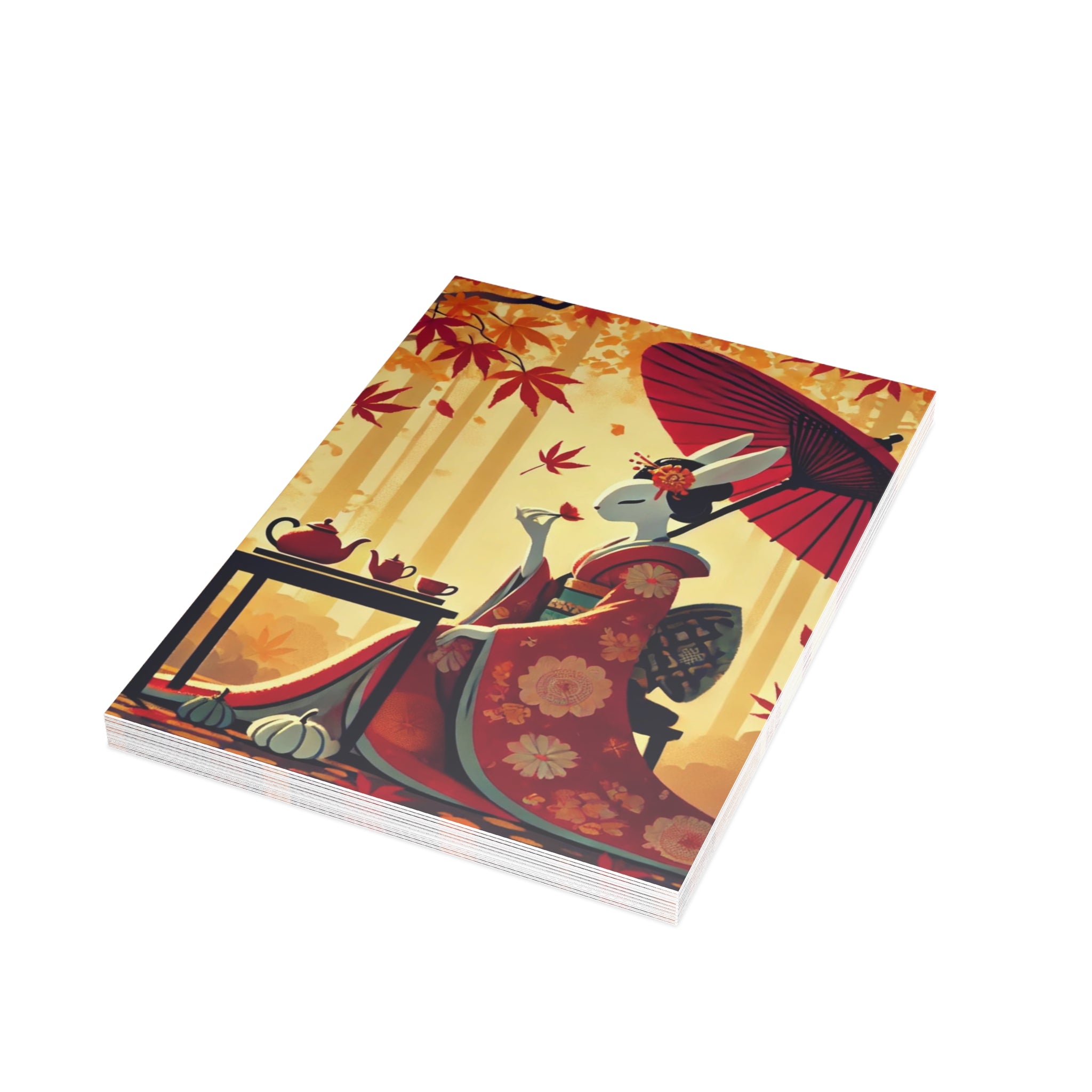 The cover features the Theatrical Harvest Rabbit, a kabuki-inspired scene in bold flat style. A graceful rabbit, dressed in flowing harvest robes, sits serenely beneath a crimson umbrella. The vivid color and theatrical detail transform each postcard into a cultural keepsake—capturing serenity, tradition, and whimsy in a format meant to be shared.