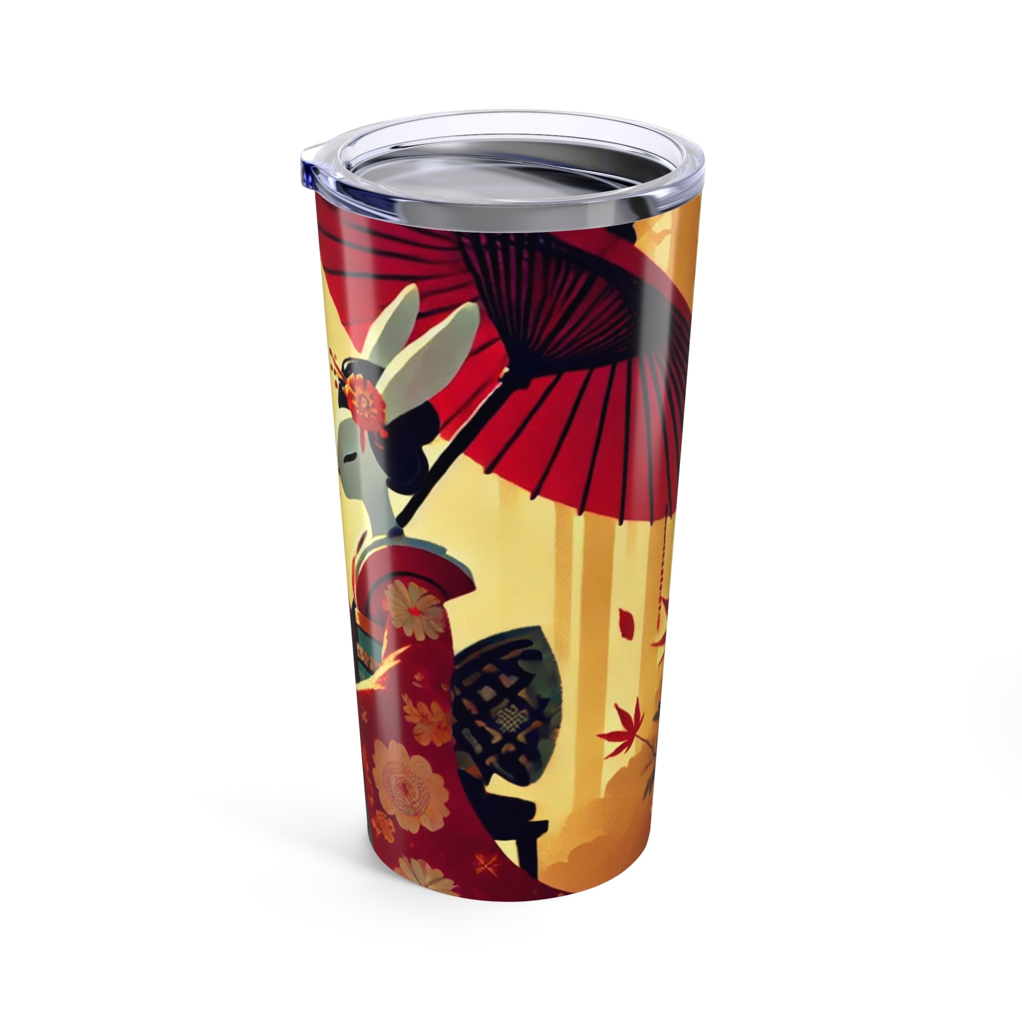 Keep your drinks hot or cold in style with this 20oz stainless steel tumbler featuring the Theatrical Harvest Rabbit artwork. Designed with double-wall insulation, it maintains your beverage’s temperature for hours, making it an excellent choice for daily use at home, work, or on the go. The durable stainless steel body is built to last and is dishwasher safe for added convenience. Wrapped around the sleek exterior, the bold flat-style artwork depicts a graceful rabbit in elegant harvest robes, seated serenely beneath a crimson umbrella. Alive with color and theatrical flair, this kabuki-inspired design blends whimsy, tradition, and fantasy, transforming a practical tumbler into a striking piece of functional art.