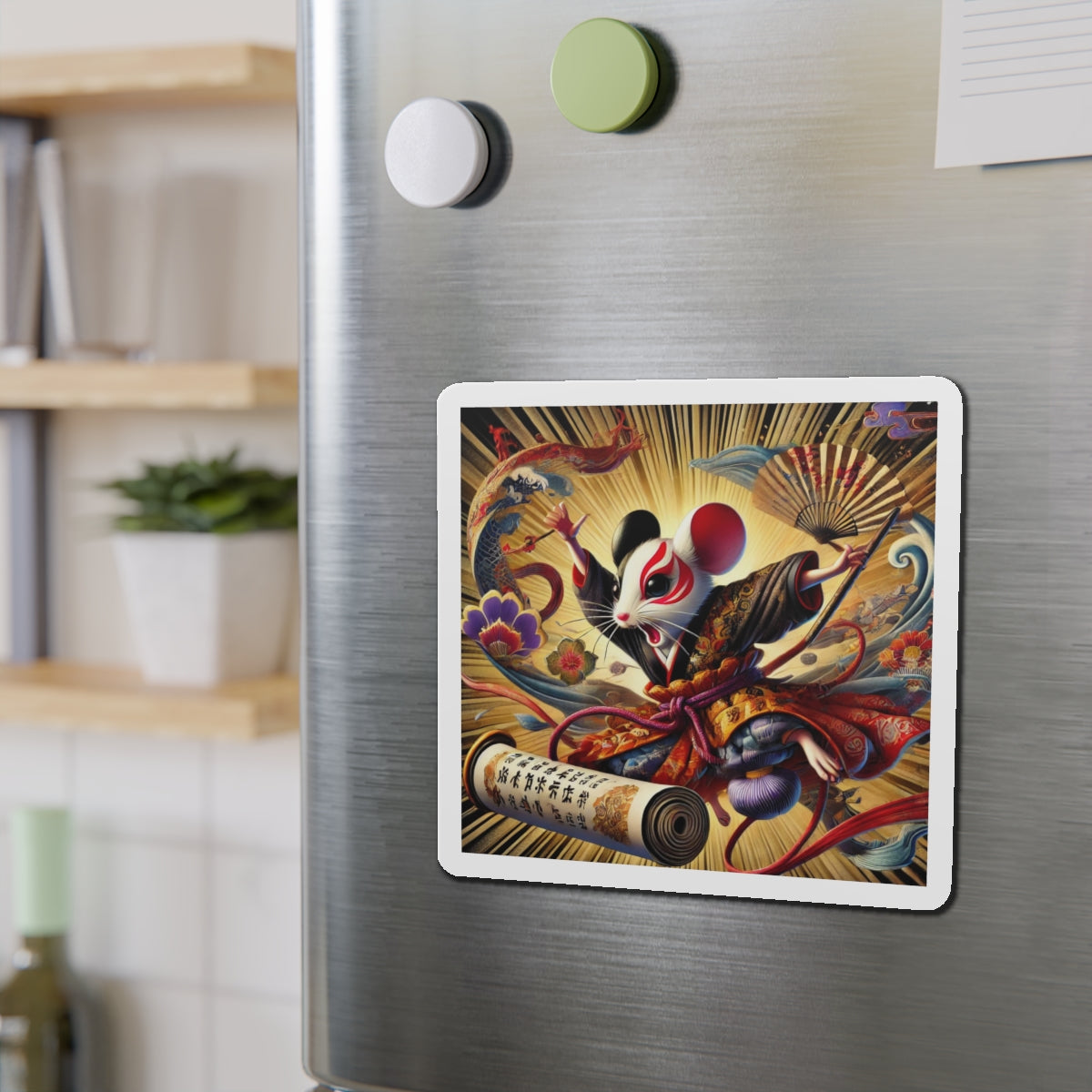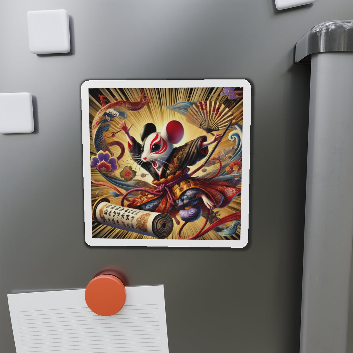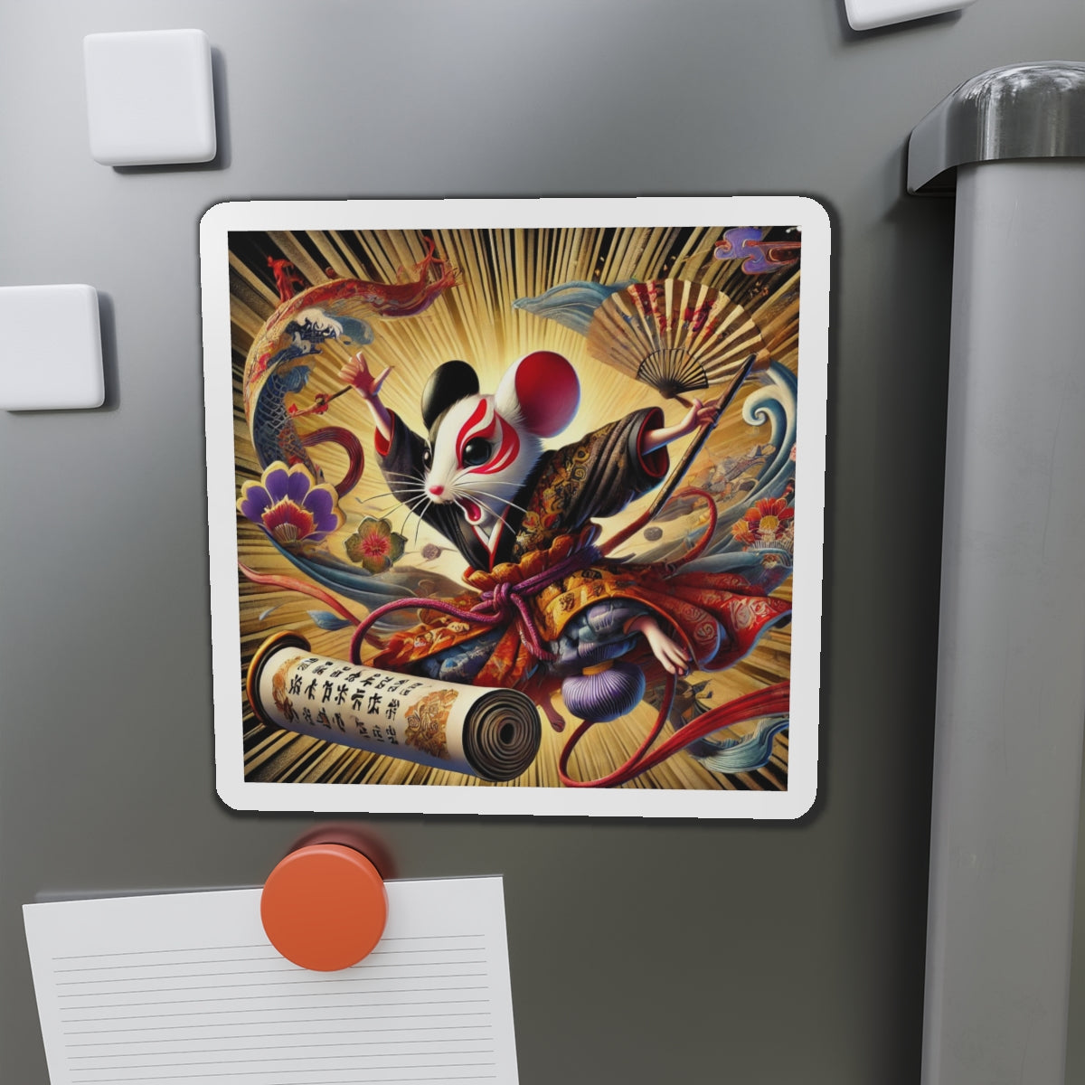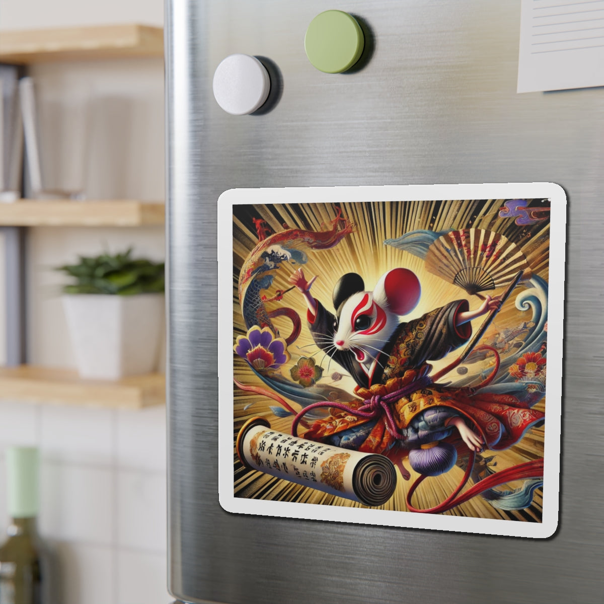 Theatrical Mouse on a Mission Die-Cut Magnets bring personality and artistry to any space. Made with a precision die-cut technique, these magnets are both flexible and highly durable, ensuring they stand out while lasting over time. Available in five different sizes, they offer the perfect fit for refrigerators, lockers, or any magnetic surface. The design bursts with flair, featuring a kabuki-style mouse leaping from an ancient scroll in a dramatic pose with bold red and black markings. Both playful and powerful, this artwork captures the spirit of Japanese theater and transforms an everyday magnet into a whimsical and imaginative statement piece.