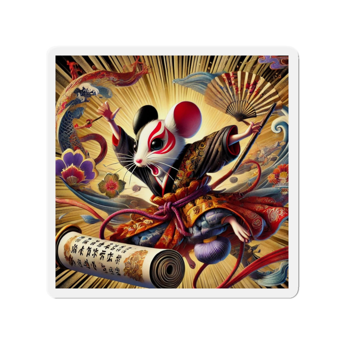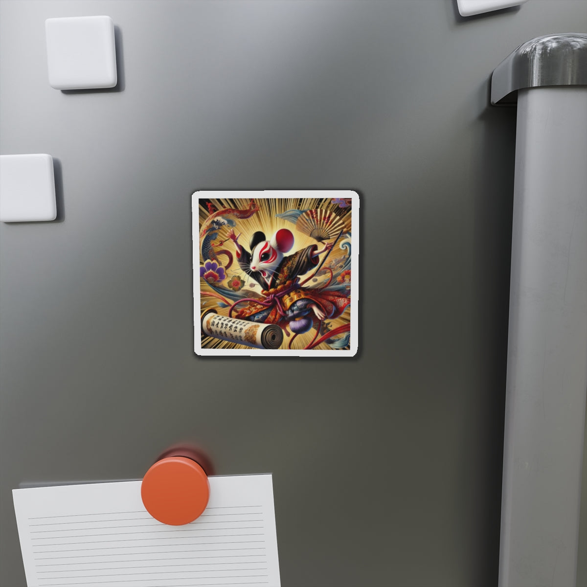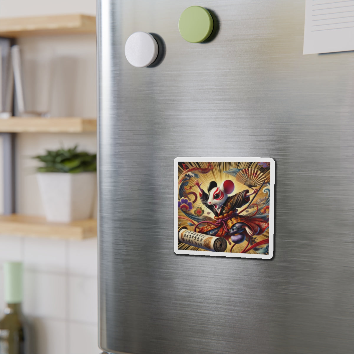 Theatrical Mouse on a Mission Die-Cut Magnets bring personality and artistry to any space. Made with a precision die-cut technique, these magnets are both flexible and highly durable, ensuring they stand out while lasting over time. Available in five different sizes, they offer the perfect fit for refrigerators, lockers, or any magnetic surface. The design bursts with flair, featuring a kabuki-style mouse leaping from an ancient scroll in a dramatic pose with bold red and black markings. Both playful and powerful, this artwork captures the spirit of Japanese theater and transforms an everyday magnet into a whimsical and imaginative statement piece.