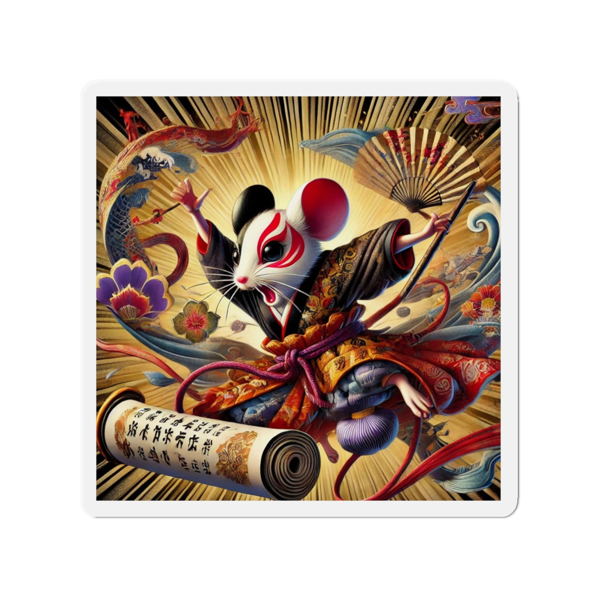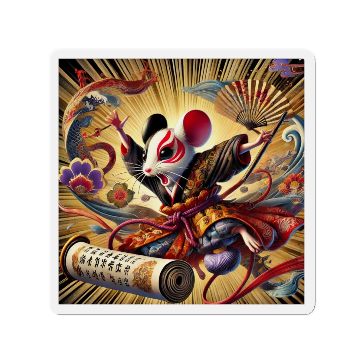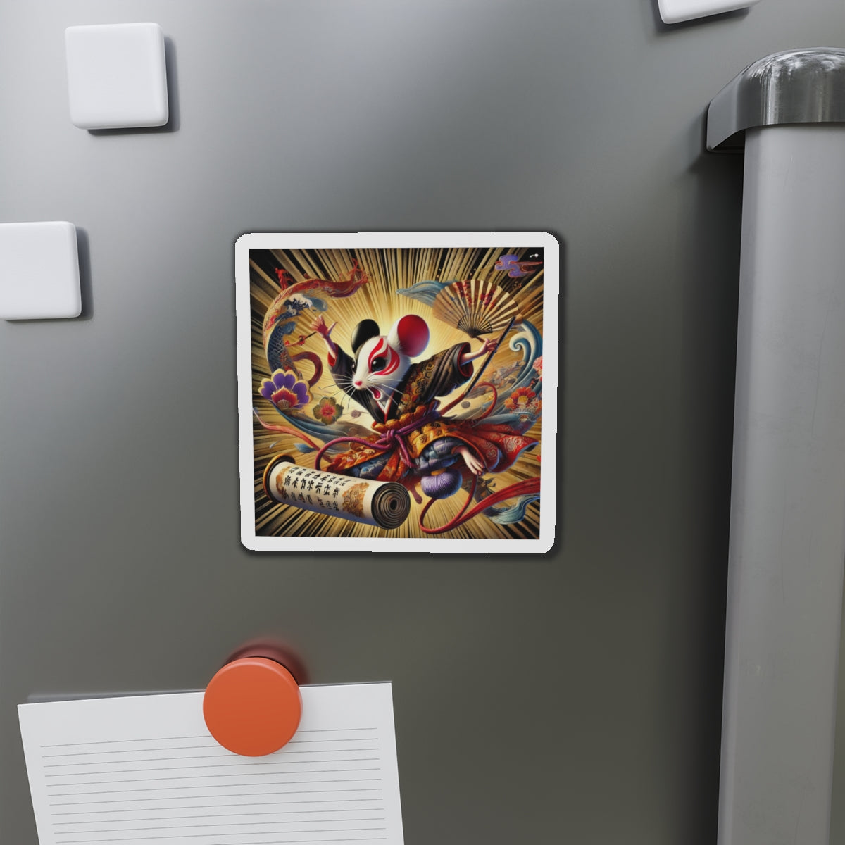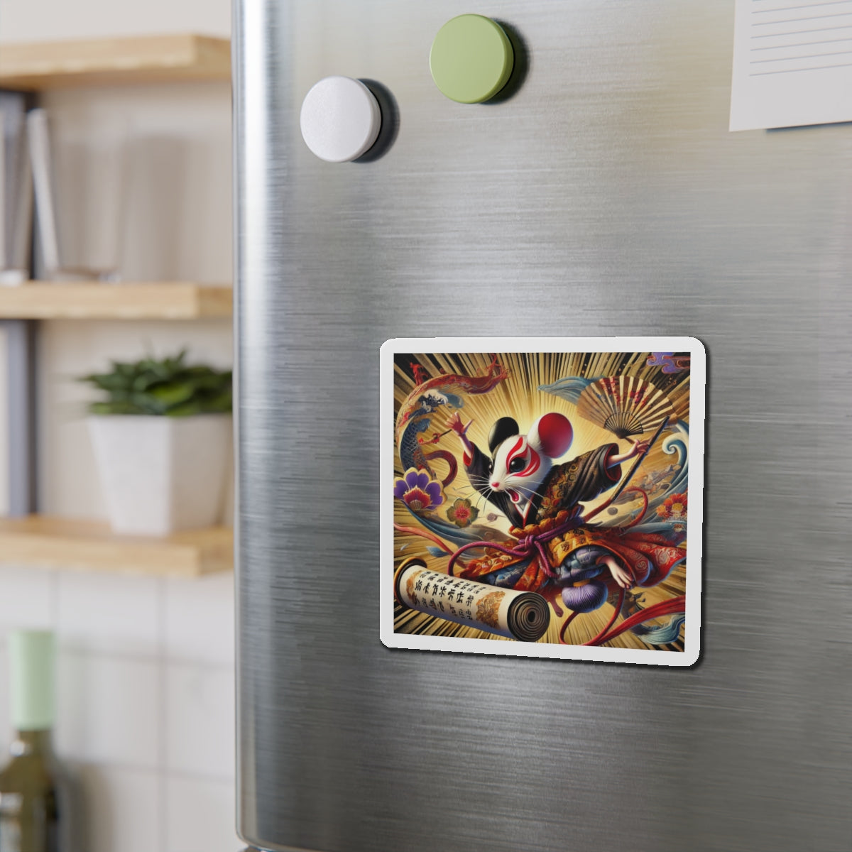 Theatrical Mouse on a Mission Die-Cut Magnets bring personality and artistry to any space. Made with a precision die-cut technique, these magnets are both flexible and highly durable, ensuring they stand out while lasting over time. Available in five different sizes, they offer the perfect fit for refrigerators, lockers, or any magnetic surface. The design bursts with flair, featuring a kabuki-style mouse leaping from an ancient scroll in a dramatic pose with bold red and black markings. Both playful and powerful, this artwork captures the spirit of Japanese theater and transforms an everyday magnet into a whimsical and imaginative statement piece.