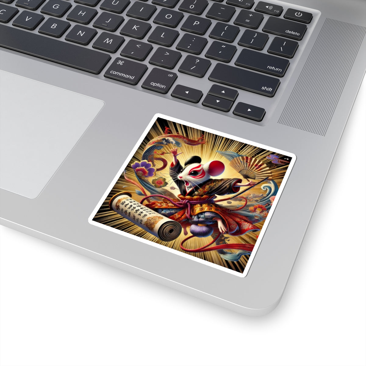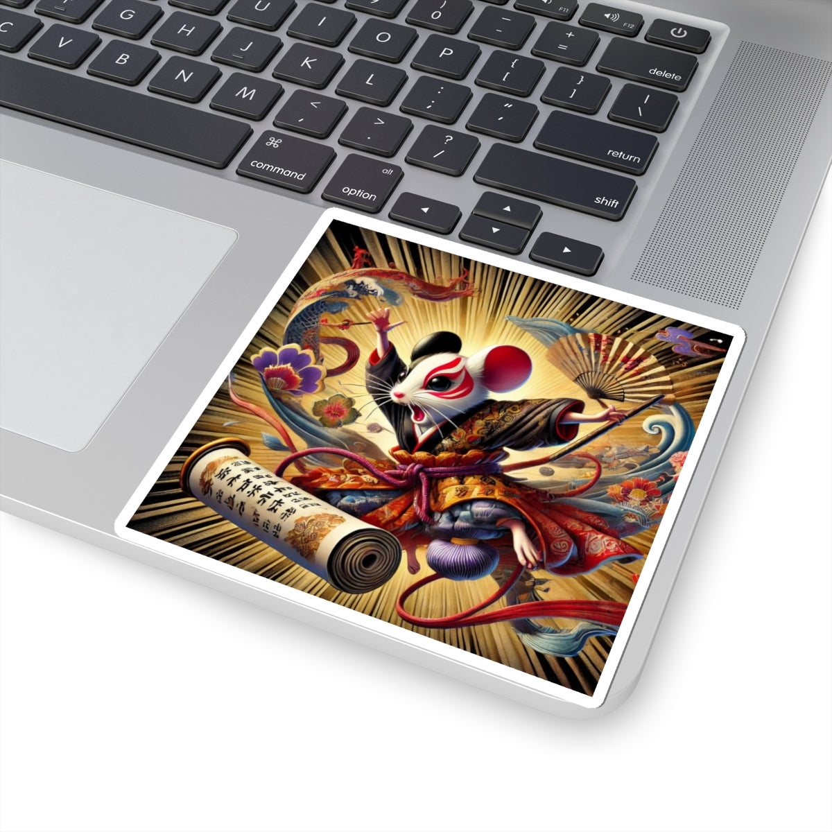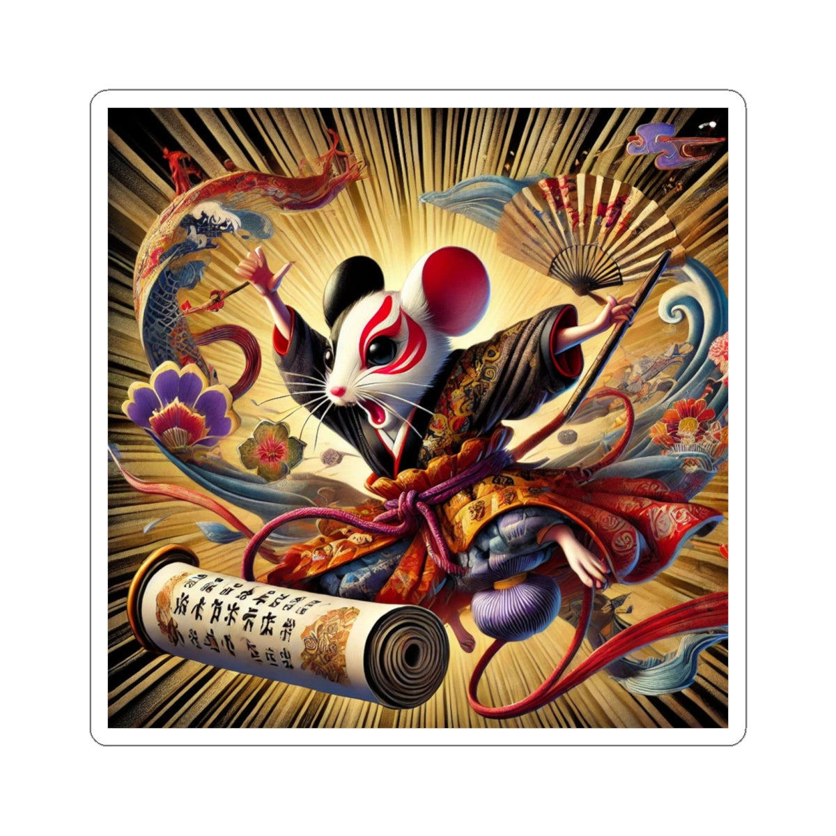 Theatrical Mouse on a Mission Kiss-Cut Stickers bring bold design and playful energy to your everyday items. Made with durable vinyl and available in four different sizes, these stickers are built to last while showcasing a glossy finish for a sleek look. With both white and transparent background options, they can easily be placed on laptops, notebooks, water bottles, or any surface you want to personalize. The artwork captures a kabuki-style mouse bursting from an ancient scroll, striking a dramatic pose with expressive red and black markings. Playful yet powerful, the design embodies the flair of Japanese theater, turning a simple sticker into a distinctive and imaginative piece of art.