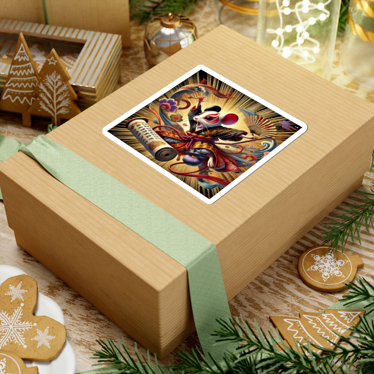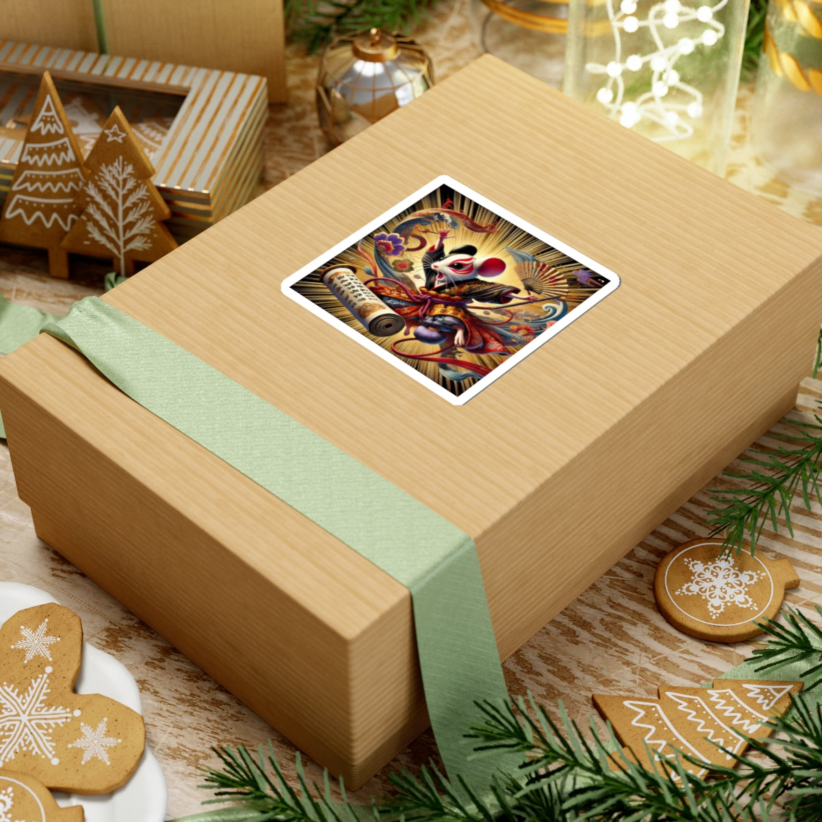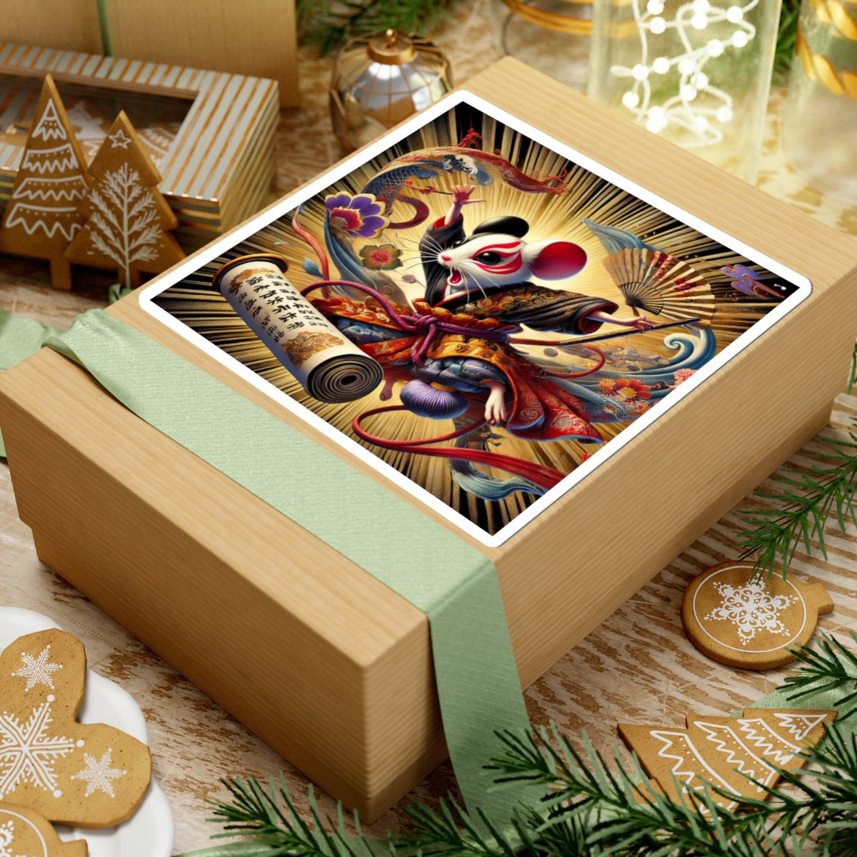 Theatrical Mouse on a Mission Kiss-Cut Stickers bring bold design and playful energy to your everyday items. Made with durable vinyl and available in four different sizes, these stickers are built to last while showcasing a glossy finish for a sleek look. With both white and transparent background options, they can easily be placed on laptops, notebooks, water bottles, or any surface you want to personalize. The artwork captures a kabuki-style mouse bursting from an ancient scroll, striking a dramatic pose with expressive red and black markings. Playful yet powerful, the design embodies the flair of Japanese theater, turning a simple sticker into a distinctive and imaginative piece of art.