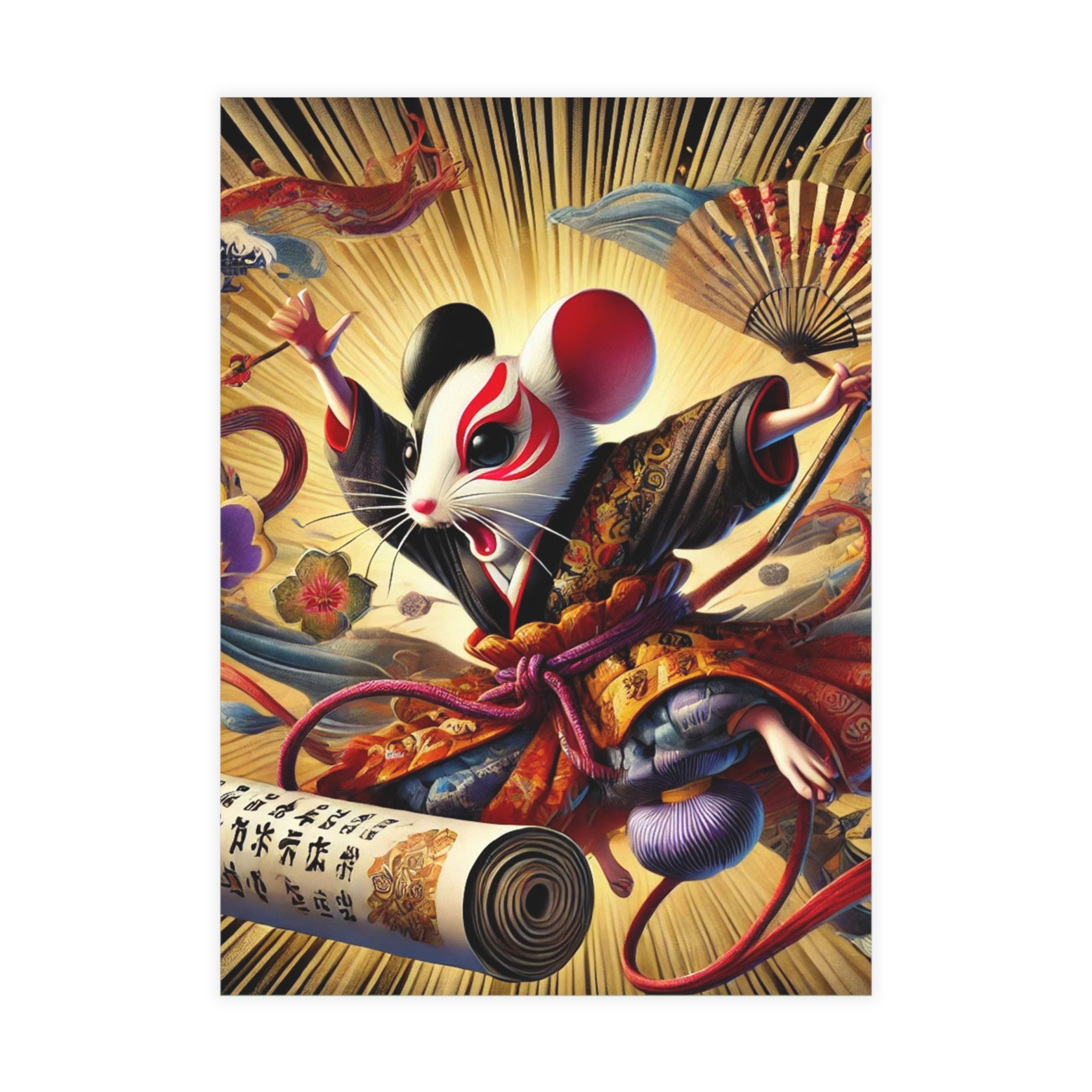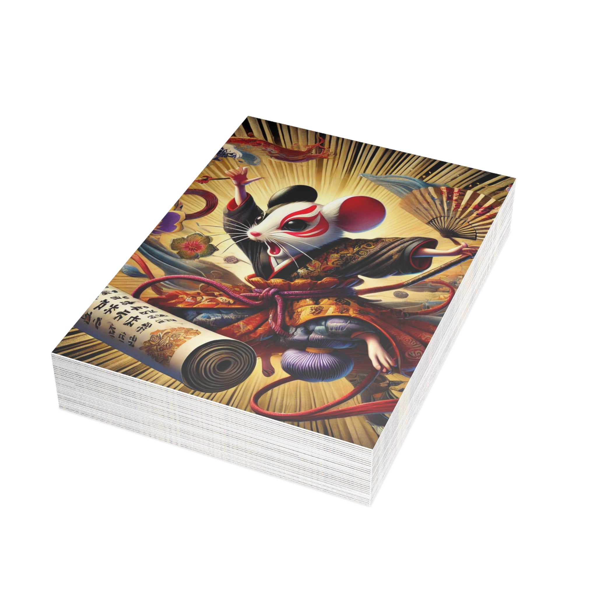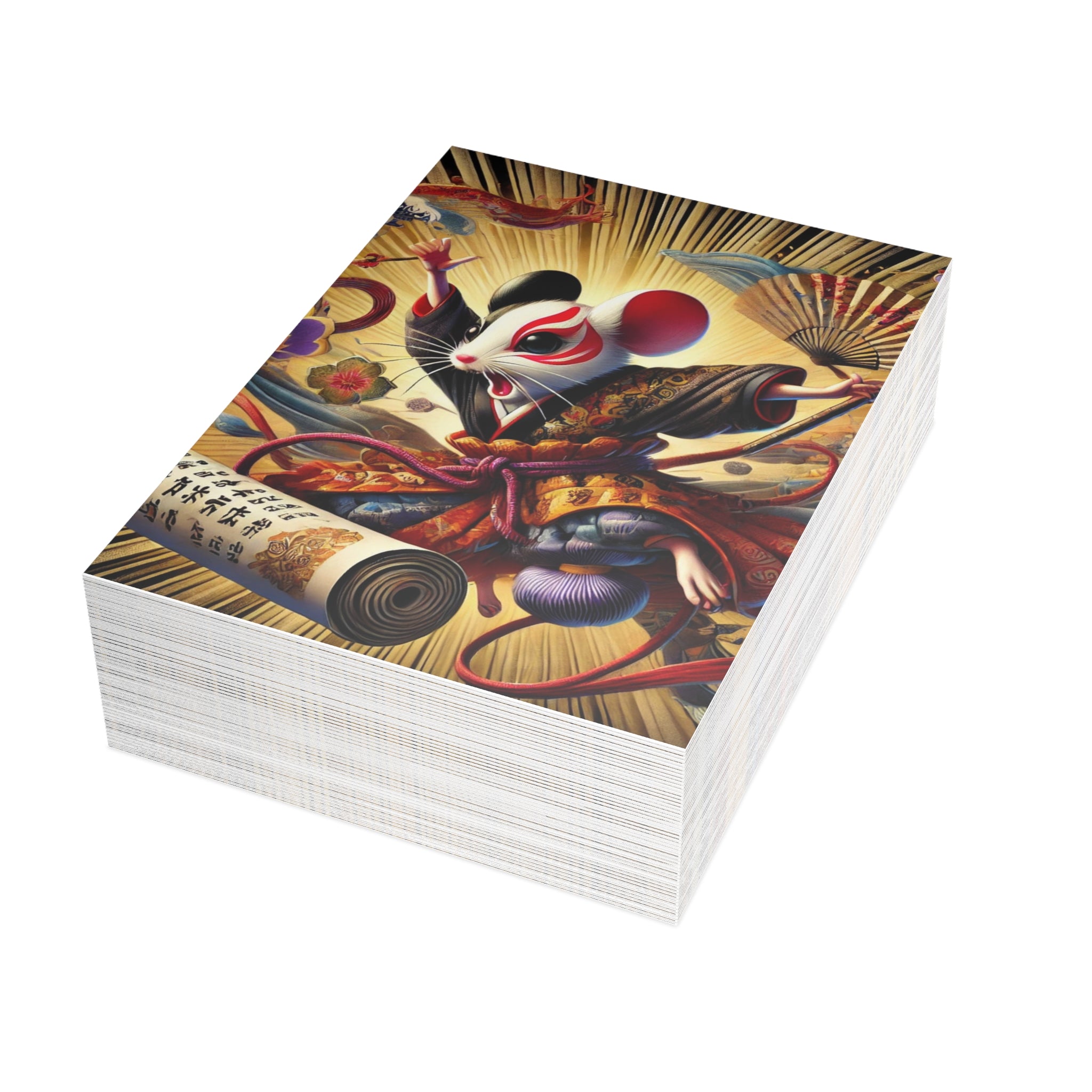 Send a touch of artistry with these high-quality postcards, available in bundles of 10, 30, or 50 and finished in your choice of matte, uncoated, one-side coat, or two-side coat. Each postcard features Theatrical Mouse on a Mission, a kabuki-inspired design where a bold little mouse bursts from an ancient scroll, its expressive red and black markings full of drama and whimsy. Blending Japanese theater flair with playful imagination, this design transforms ordinary correspondence into a cultural keepsake. Perfect for mailing, gifting, or collecting, these postcards merge function with captivating art.