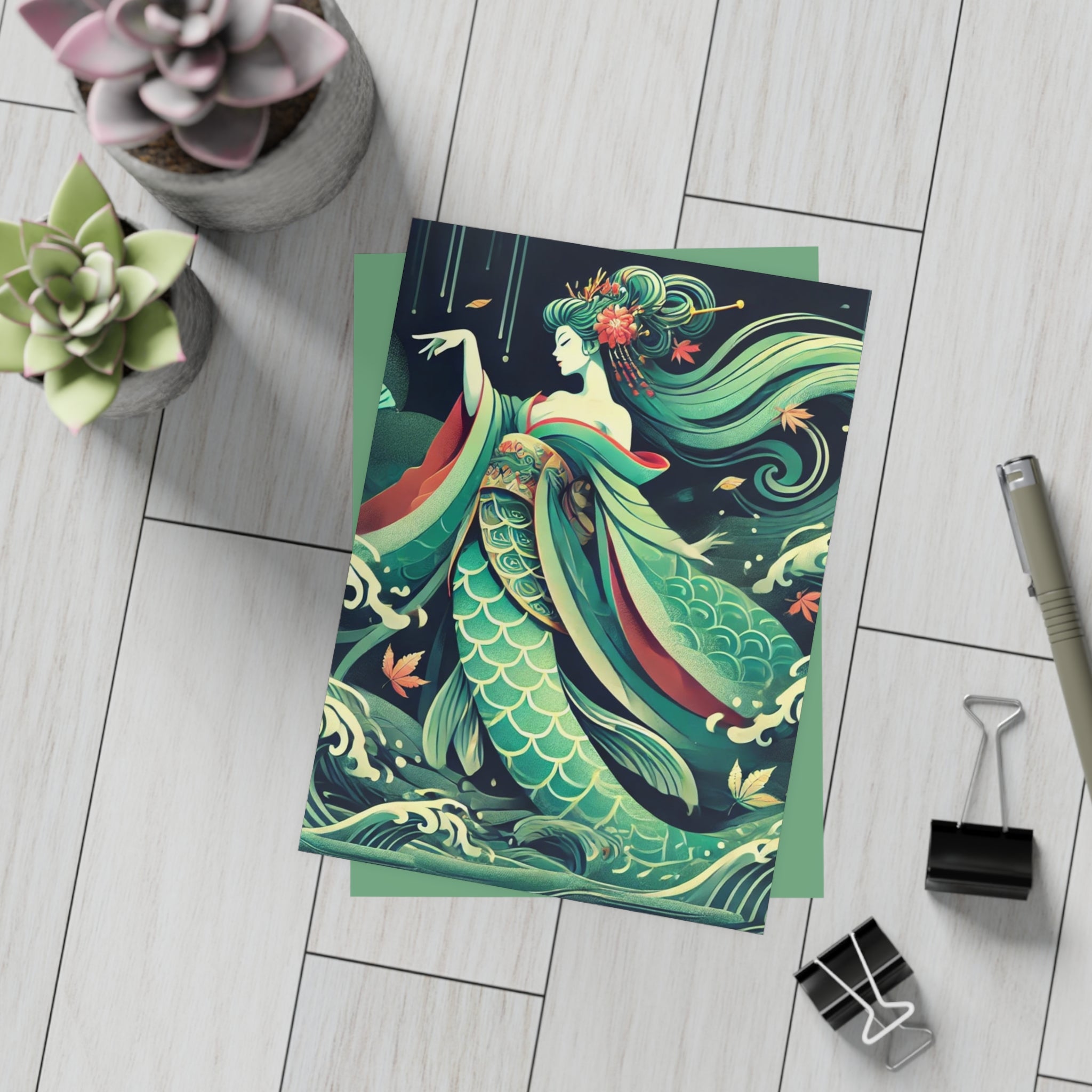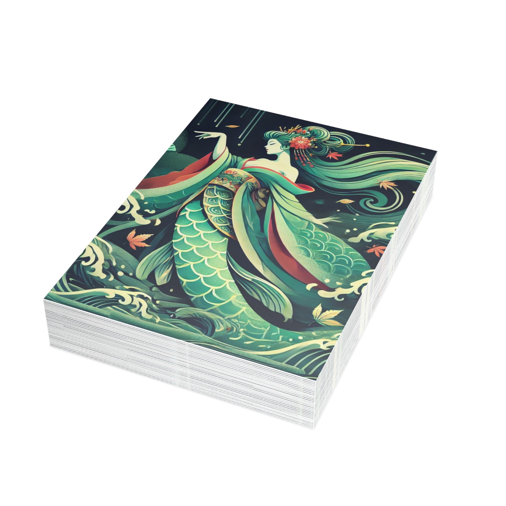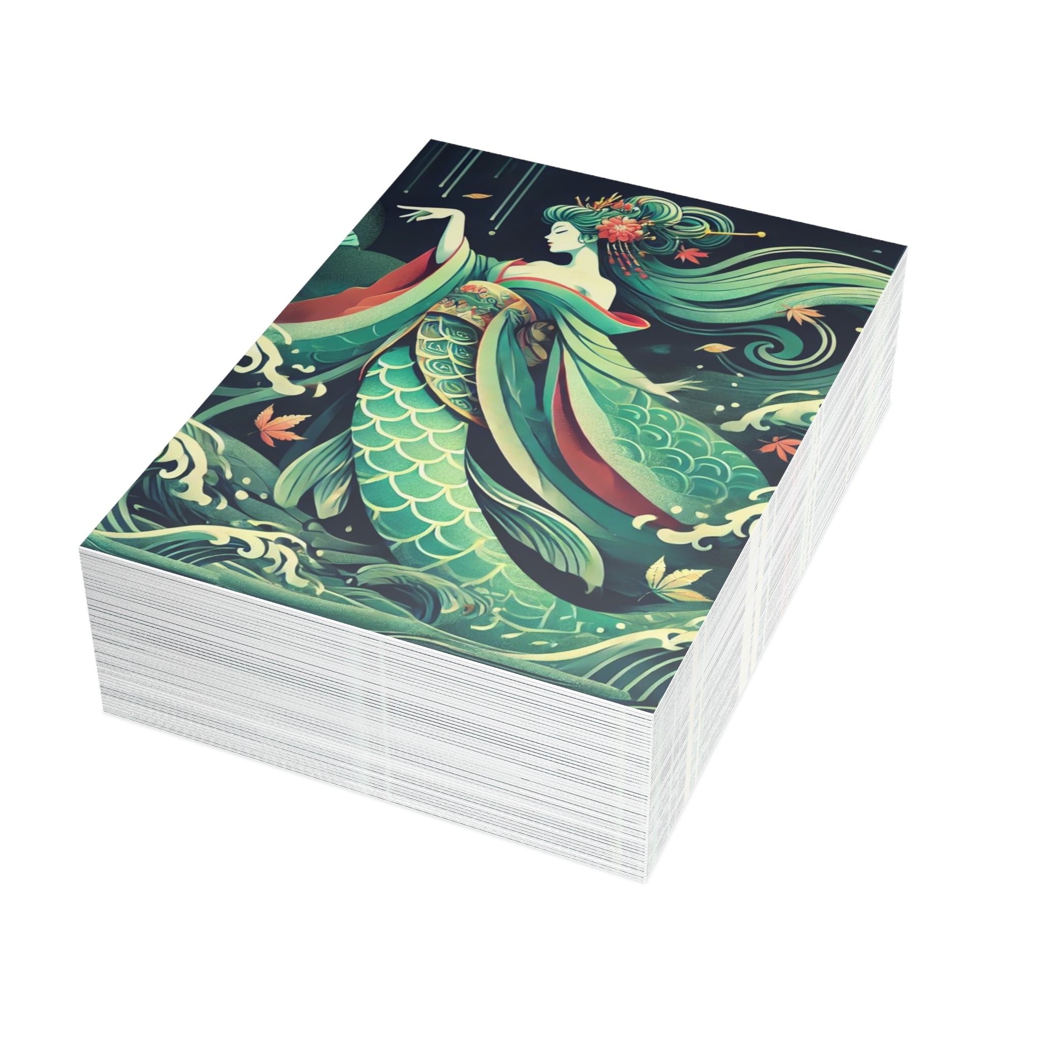 The design features a Kabuki-inspired mermaid queen rising gracefully from deep green waters, her shimmering tail patterned with vibrant, intricate details. Radiant and theatrical, the artwork blends fantasy with Japanese performance tradition, bringing both strength and grace to every postcard. These cards transform everyday communication into a moment of cultural artistry.