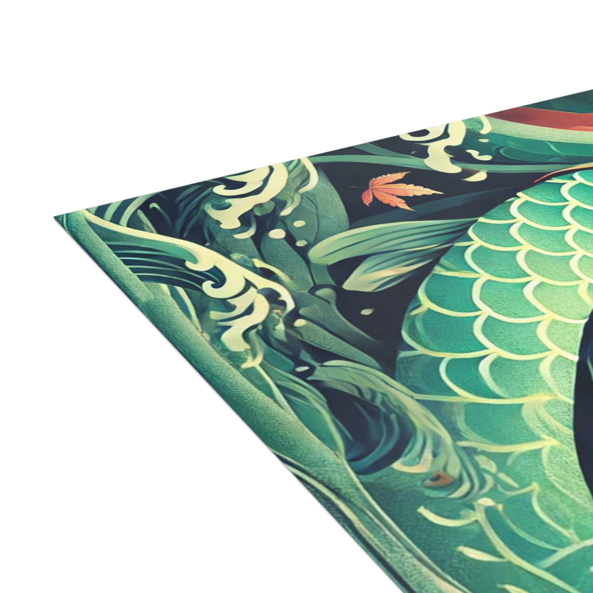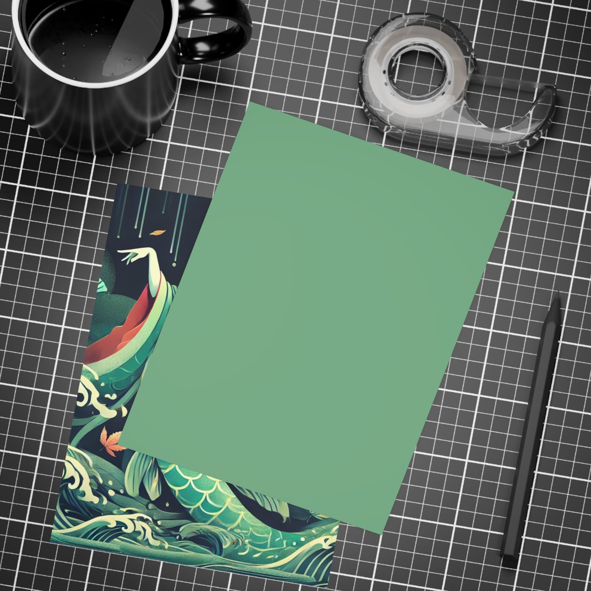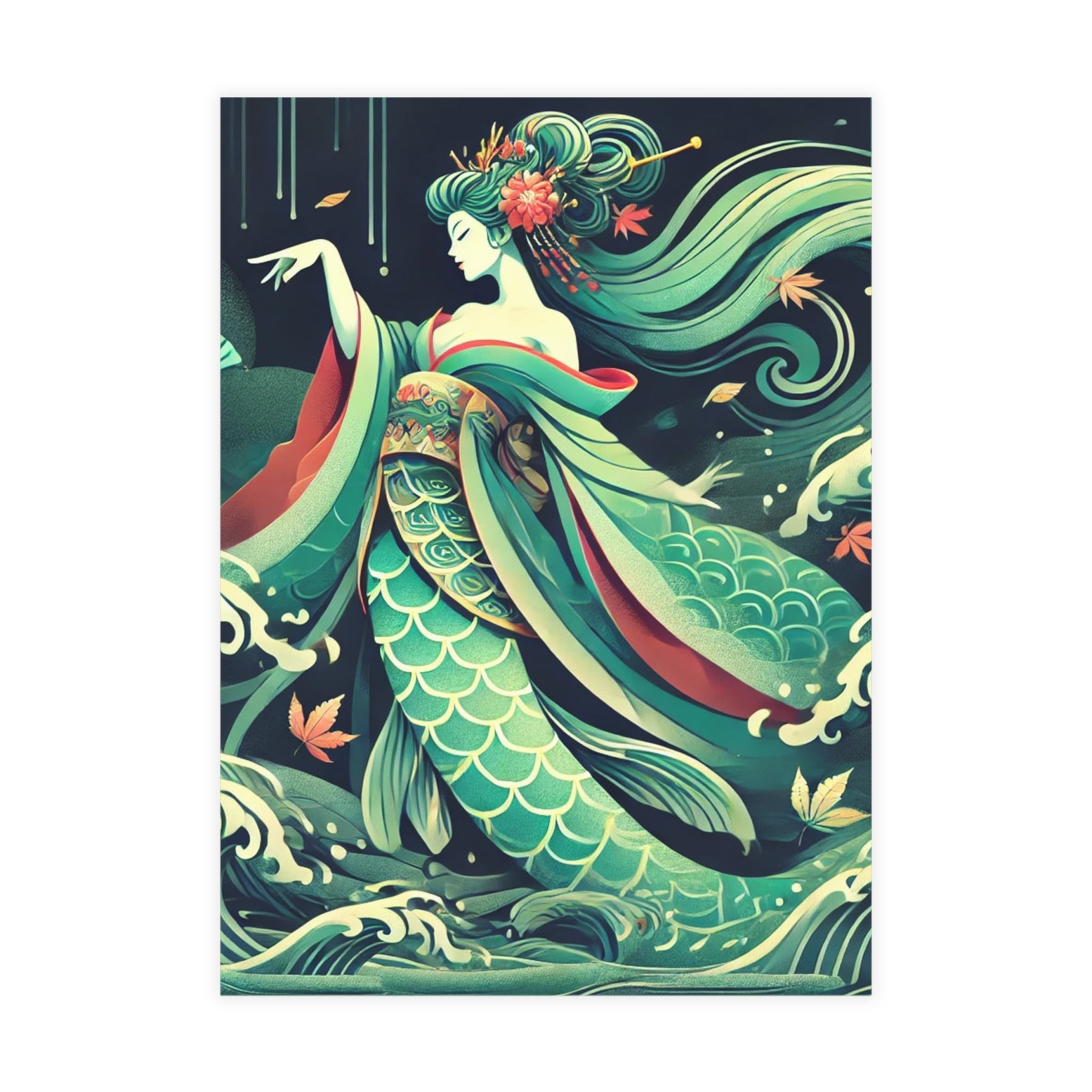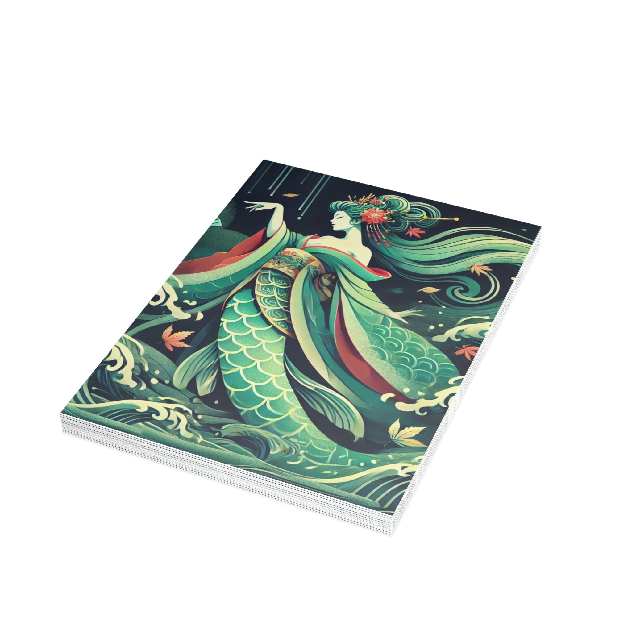 The design features a Kabuki-inspired mermaid queen rising gracefully from deep green waters, her shimmering tail patterned with vibrant, intricate details. Radiant and theatrical, the artwork blends fantasy with Japanese performance tradition, bringing both strength and grace to every postcard. These cards transform everyday communication into a moment of cultural artistry.