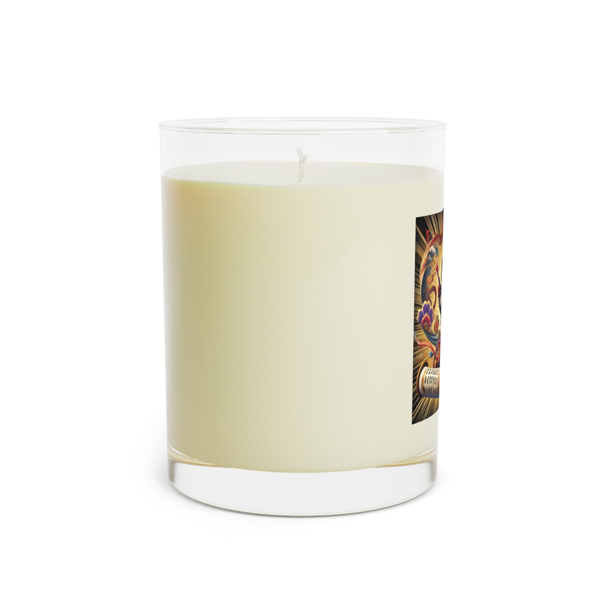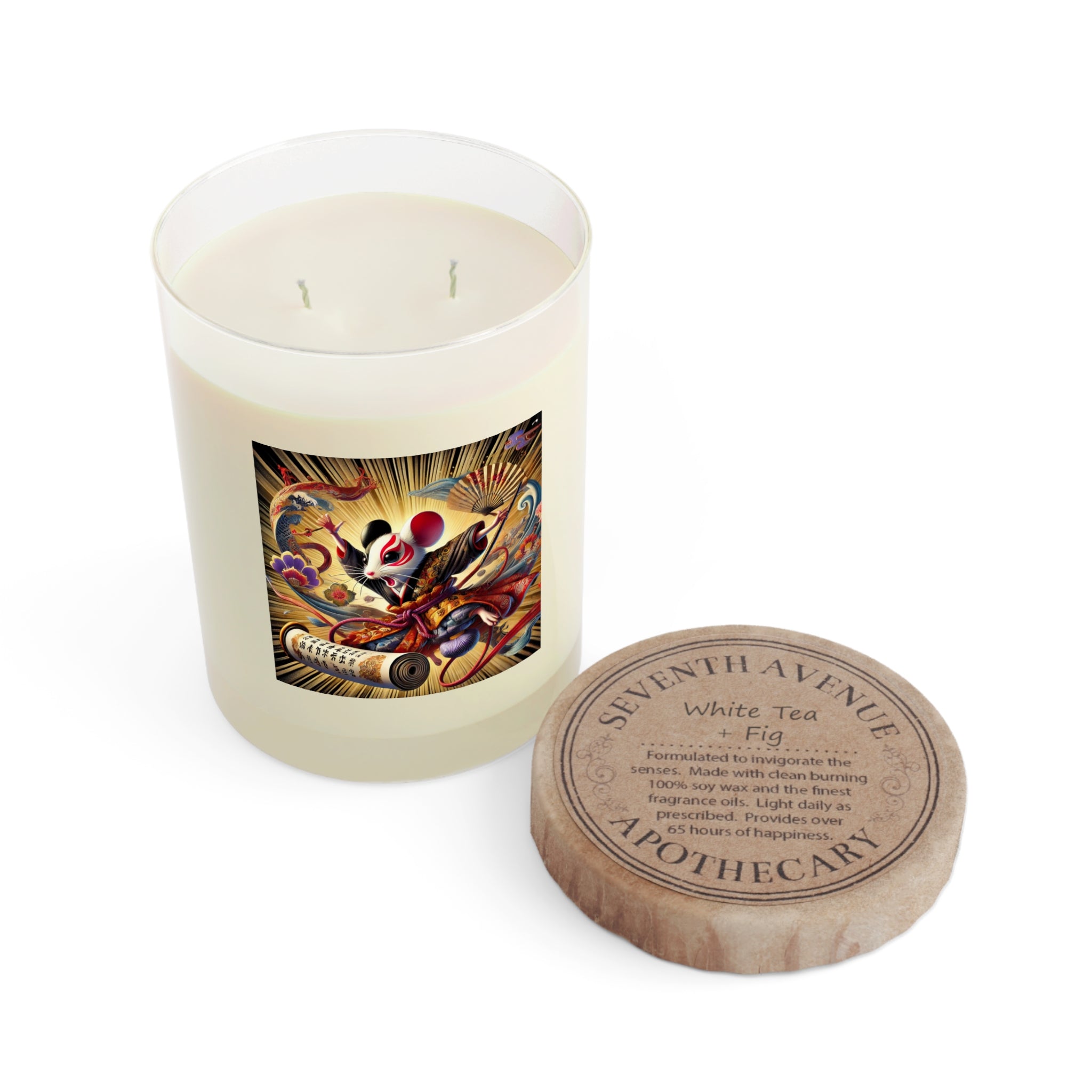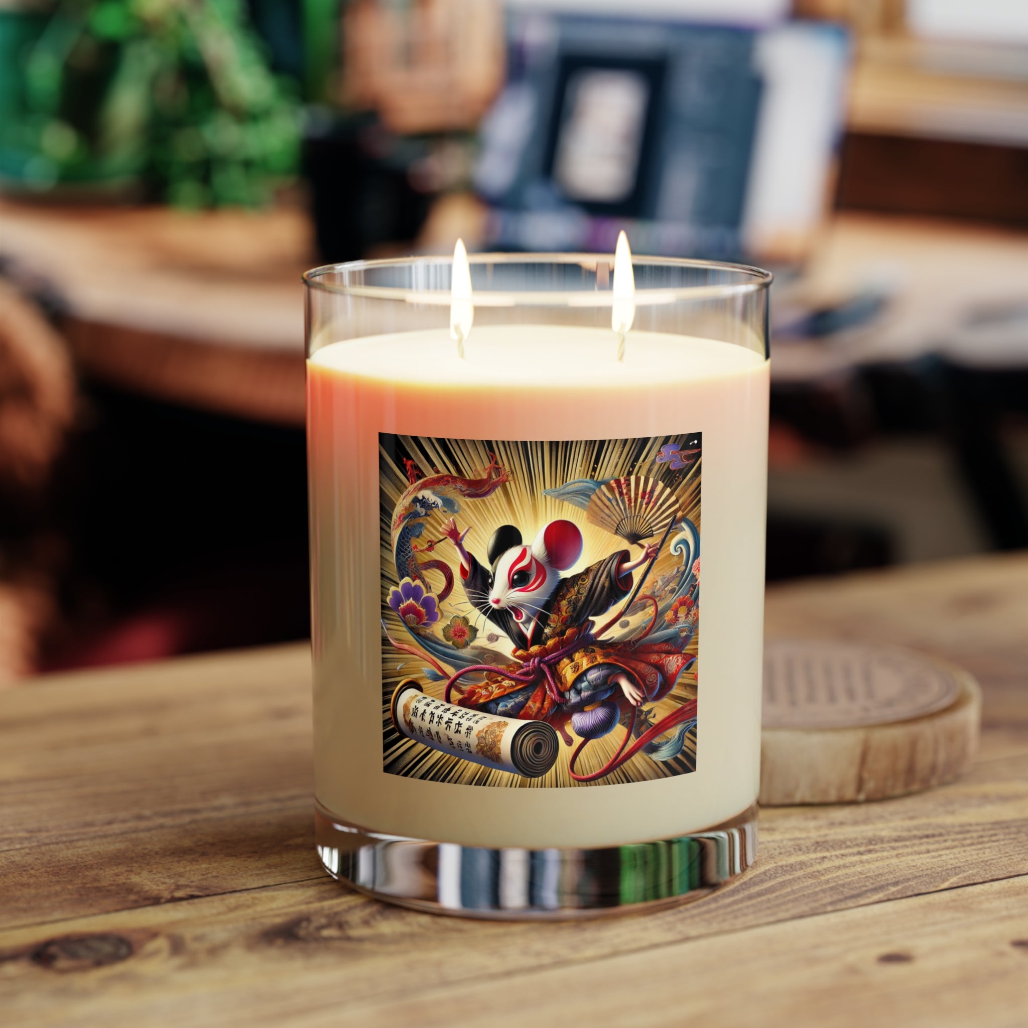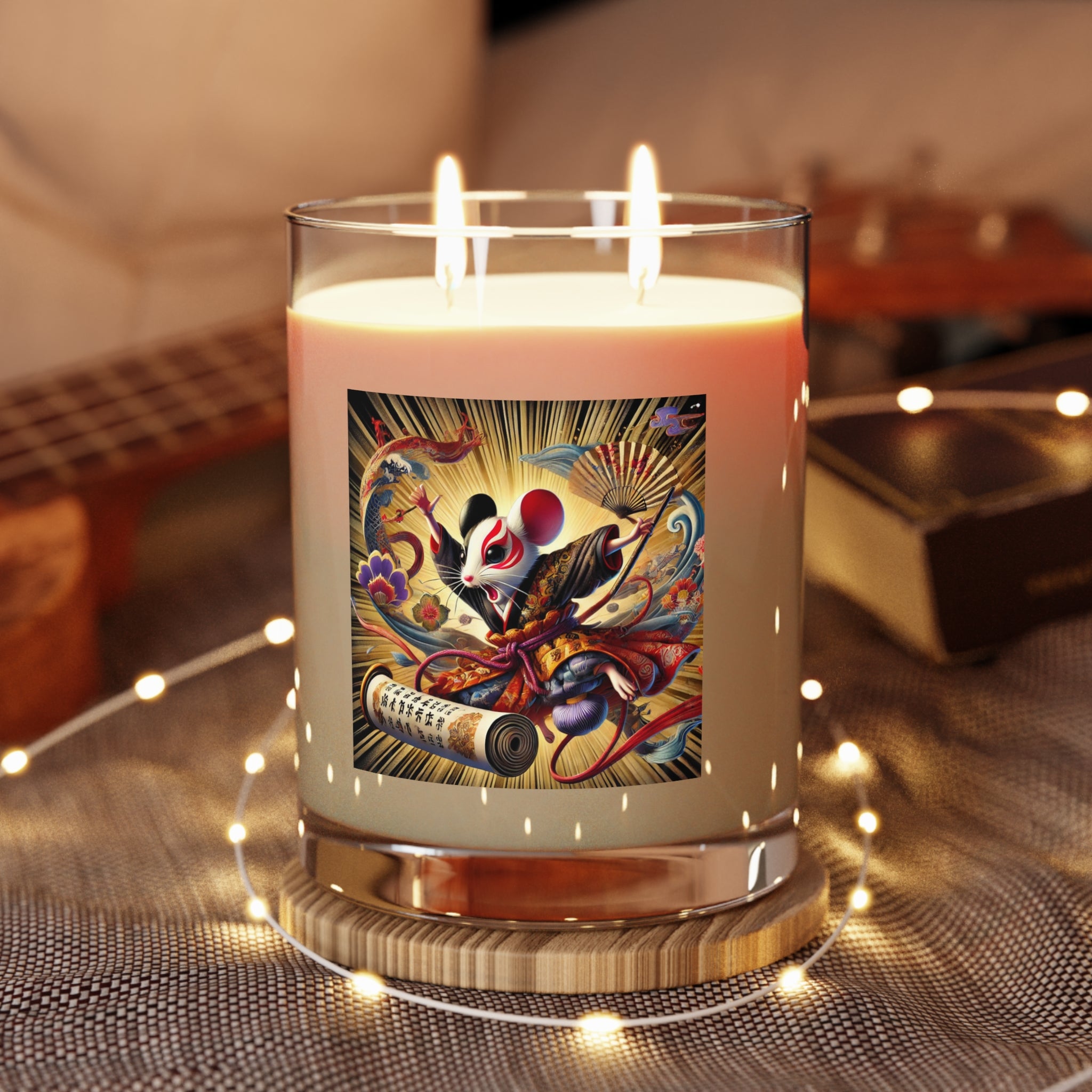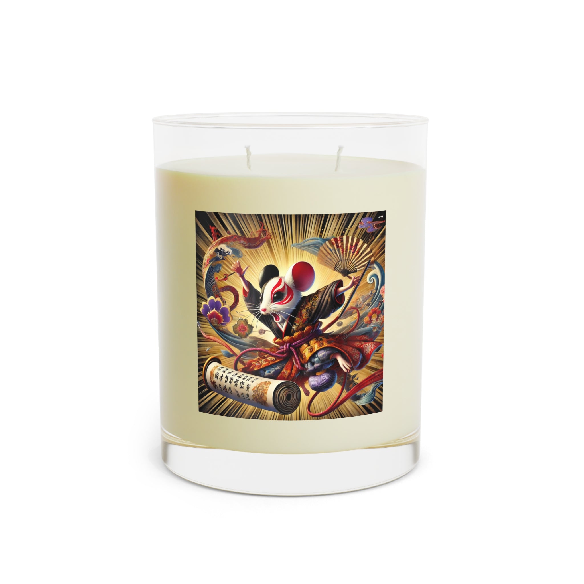 Transform your space with the glow and fragrance of this 11oz scented candle featuring the Theatrical Mouse on a Mission design. Made with 100% food-grade soy wax and the finest fragrance oils, this candle is Phthalate and Lead-free and offers a clean burn that lasts up to 65 hours. The full-glass jar showcases a dramatic print of a kabuki-inspired mouse bursting from an ancient scroll, striking a bold pose with expressive red and black markings. Playful yet powerful, the artwork infuses the candle with theatrical flair and whimsical energy, making it as visually captivating as it is aromatic. Choose from three enchanting scents—White Tea & Fig, Lavender & Sage, or Ocean Mist & Moss—to elevate your me-time, upgrade your home décor, or give as a unique gift full of character and charm.
