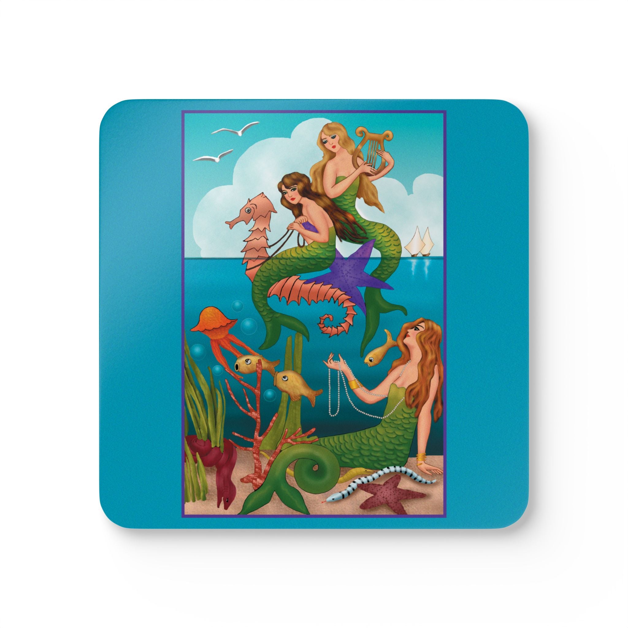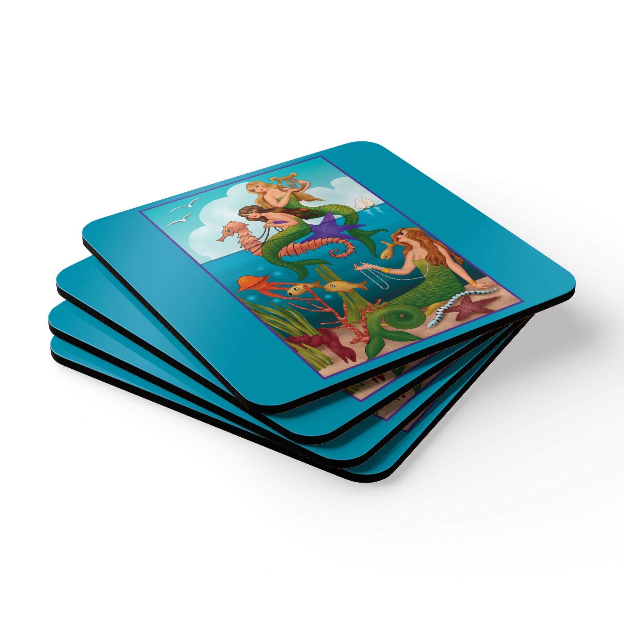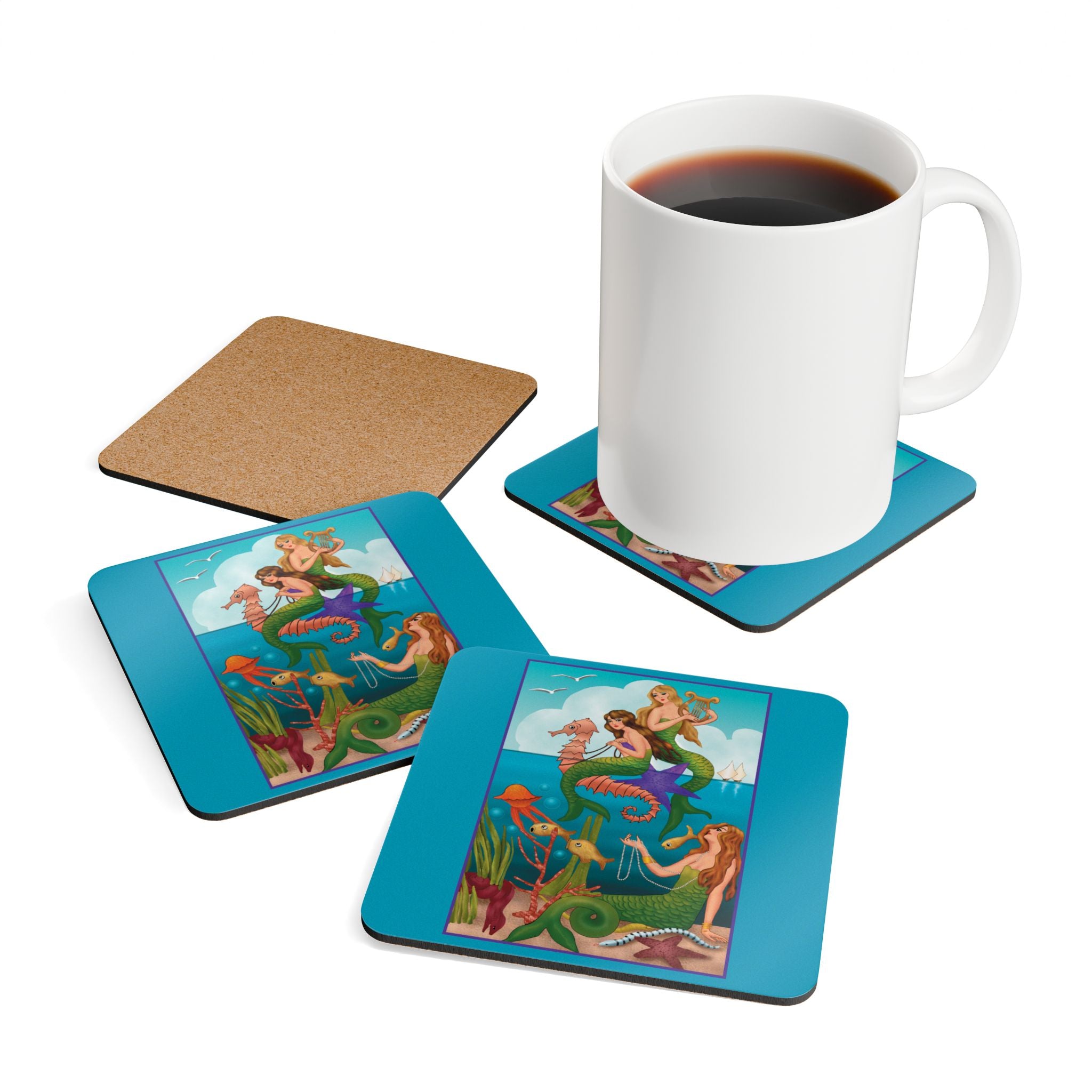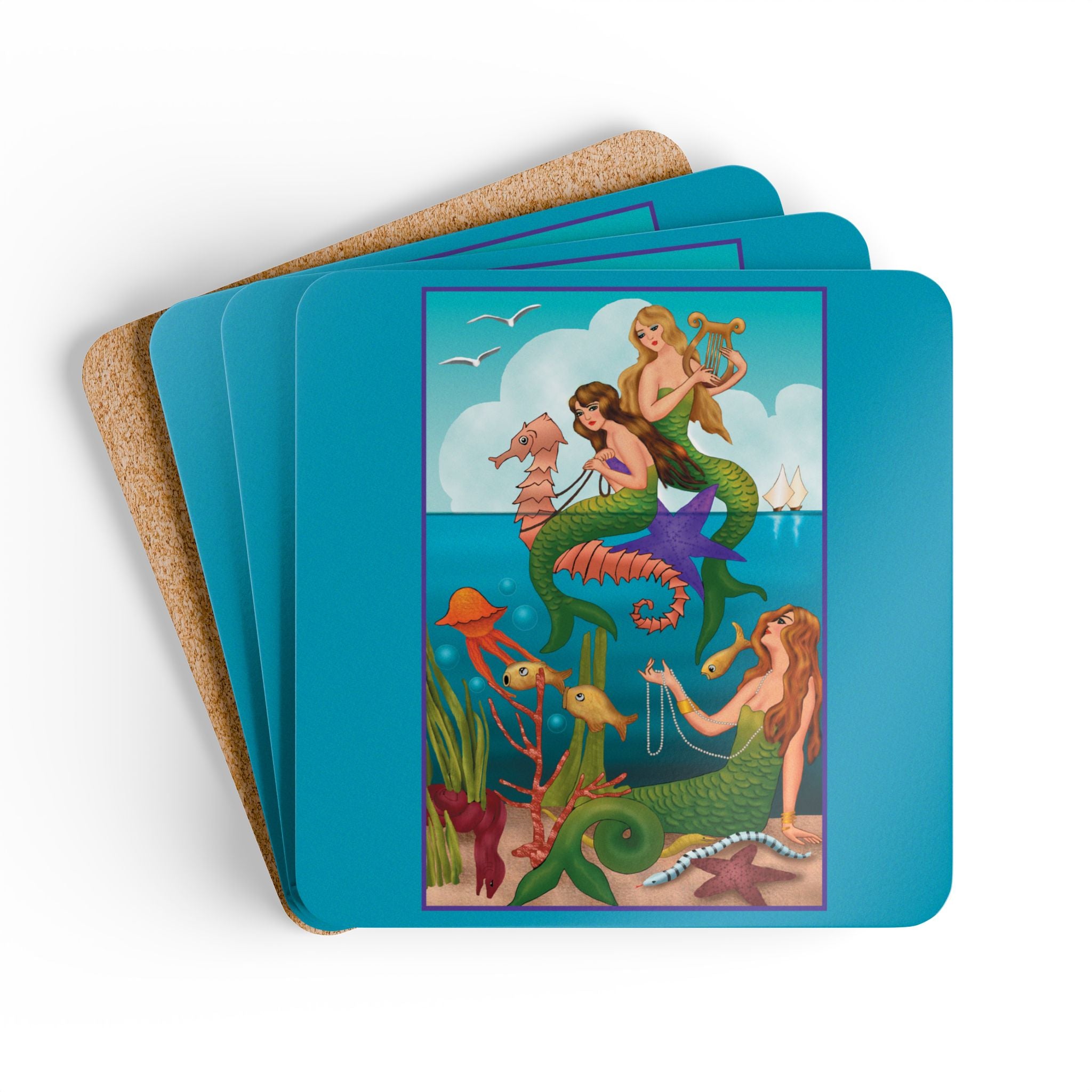 Three Mermaids with Strings of Pearls by Carlo Chiostri | Corkwood Coaster Set captures the playful allure of the sea through a whimsical Art Deco lens. This exquisite four-piece set transforms any tabletop into a celebration of vintage charm and oceanic elegance.
