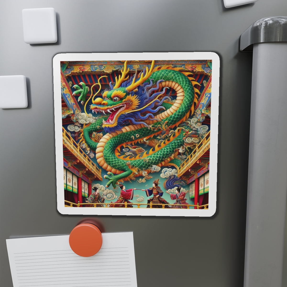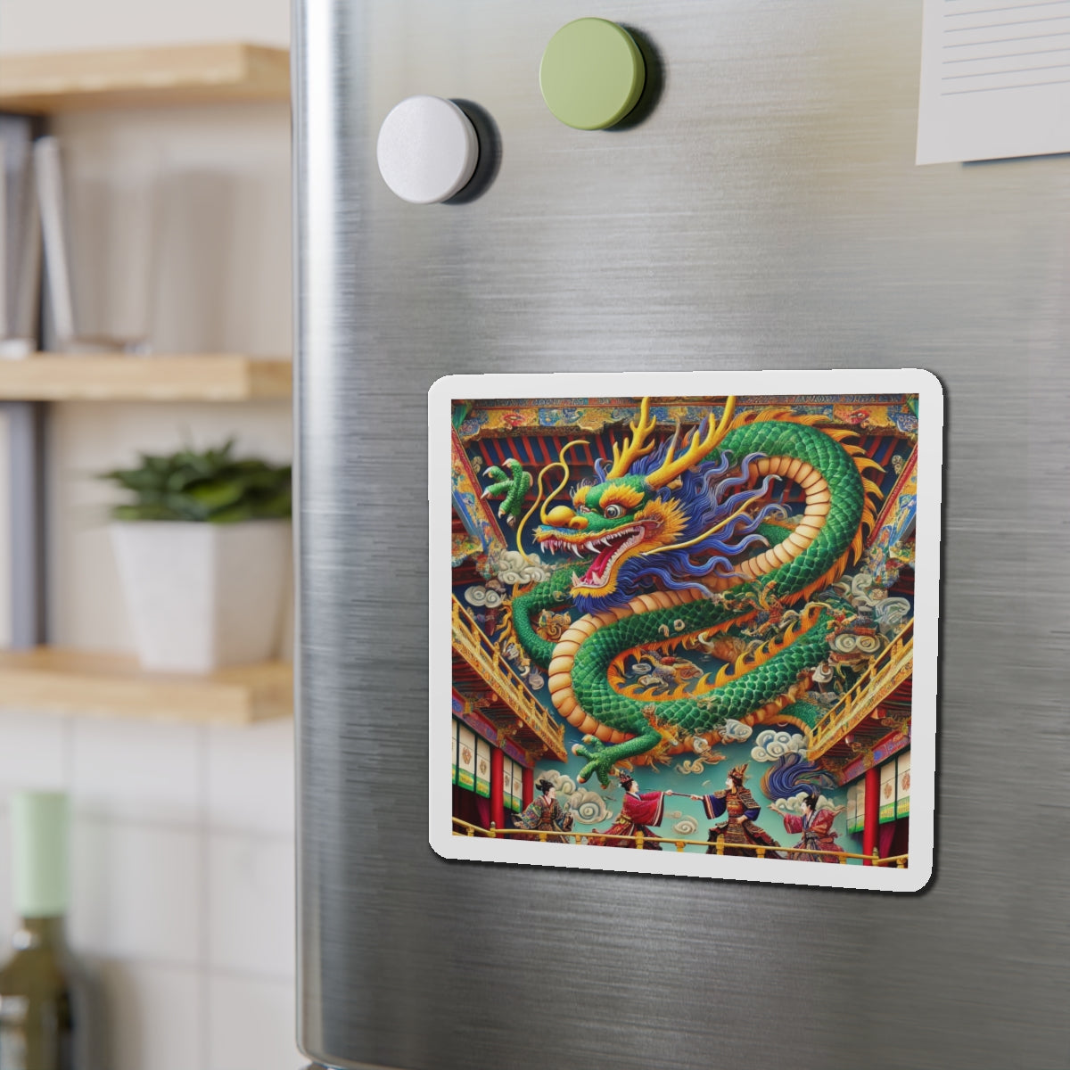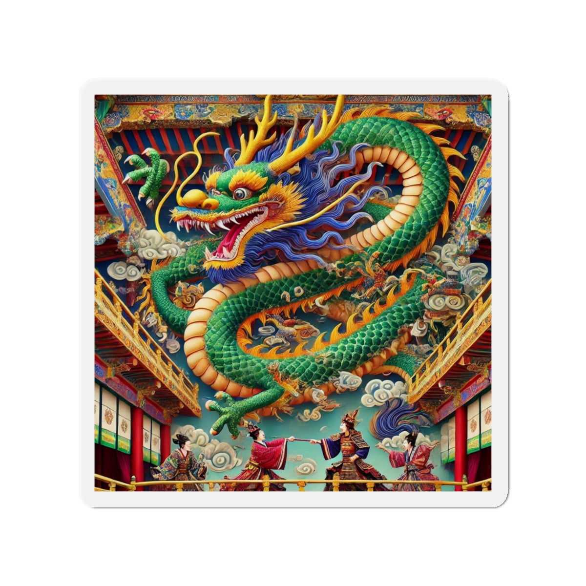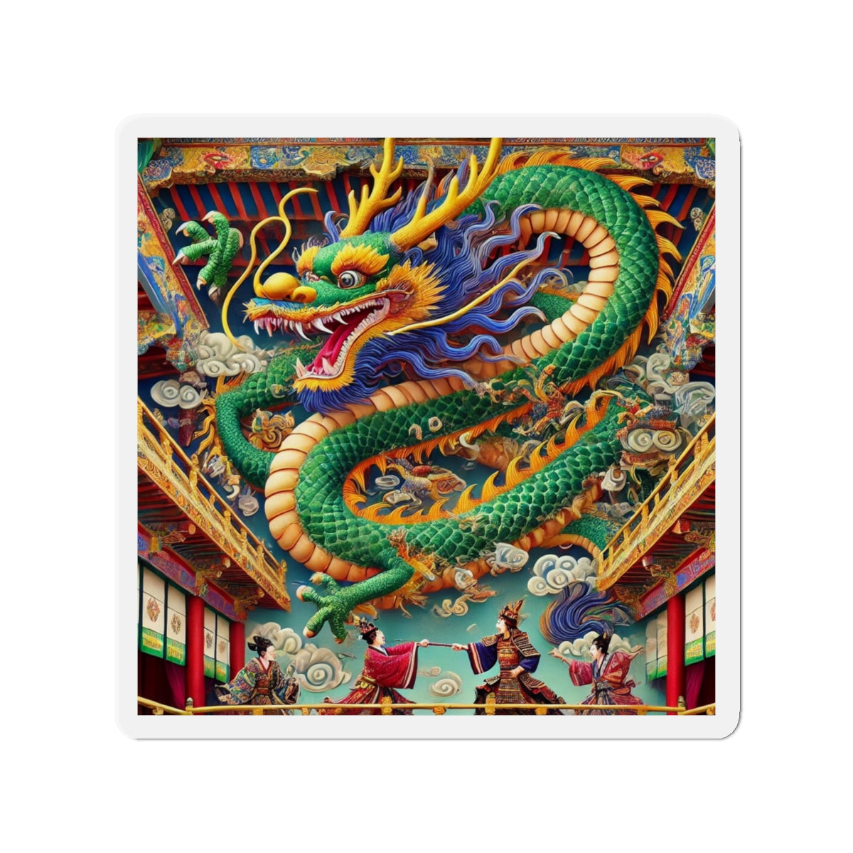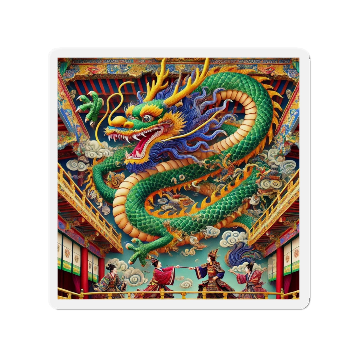 Bring a touch of myth and theater to any surface with these durable die-cut magnets. Available in four sizes, each flexible magnet showcases a majestic Tibetan dragon with shimmering blue, green, and gold scales, poised above a theater balcony. Beneath its powerful presence, two Kabuki performers in ornate costumes face off in a dramatic duel on a richly detailed stage. The clean edges of the die-cut technique highlight every curve of the artwork, while the sturdy design ensures long-lasting use. Blending Tibetan mysticism, Kabuki tradition, and Western theatrical flair, these magnets turn everyday spaces into vibrant showcases of art and storytelling.