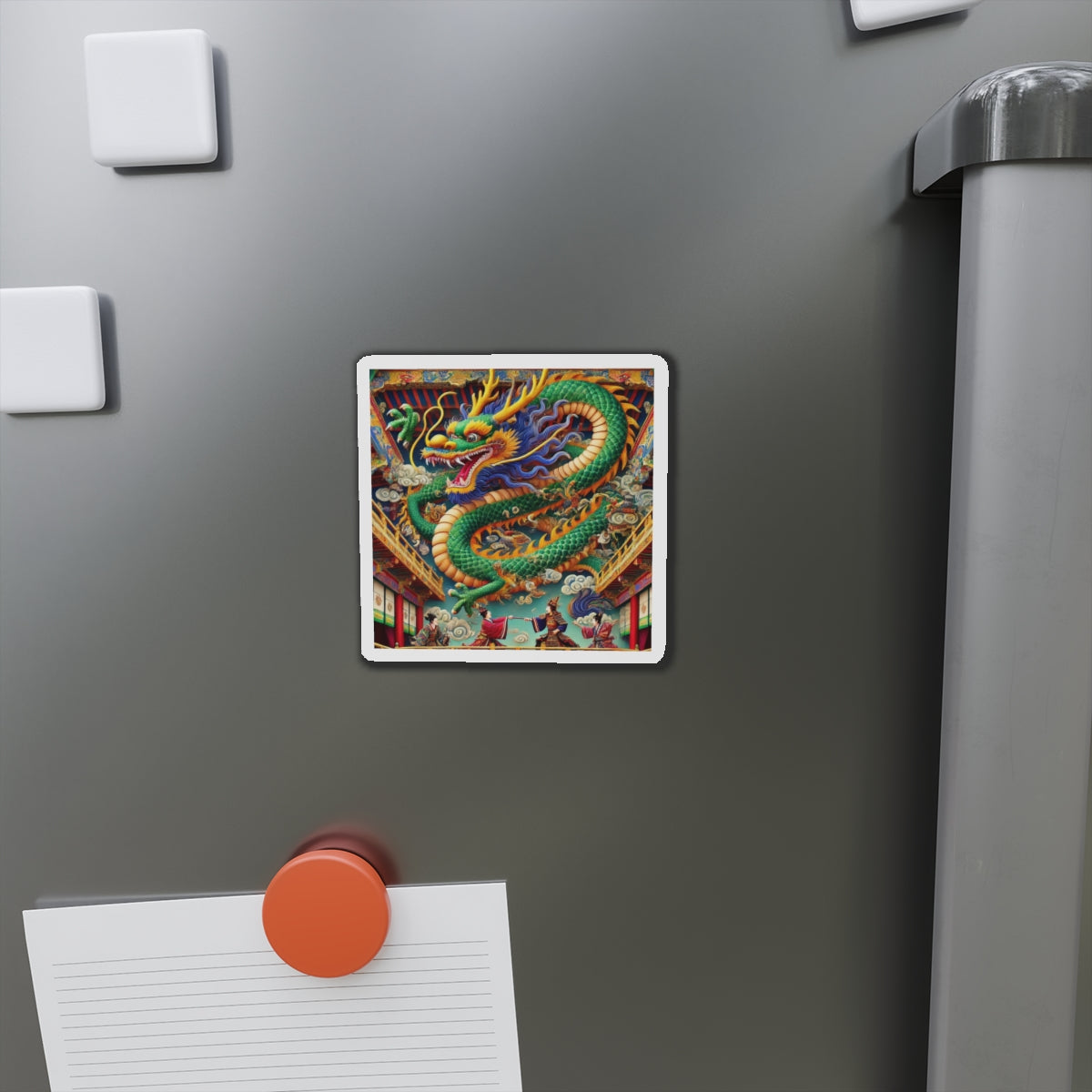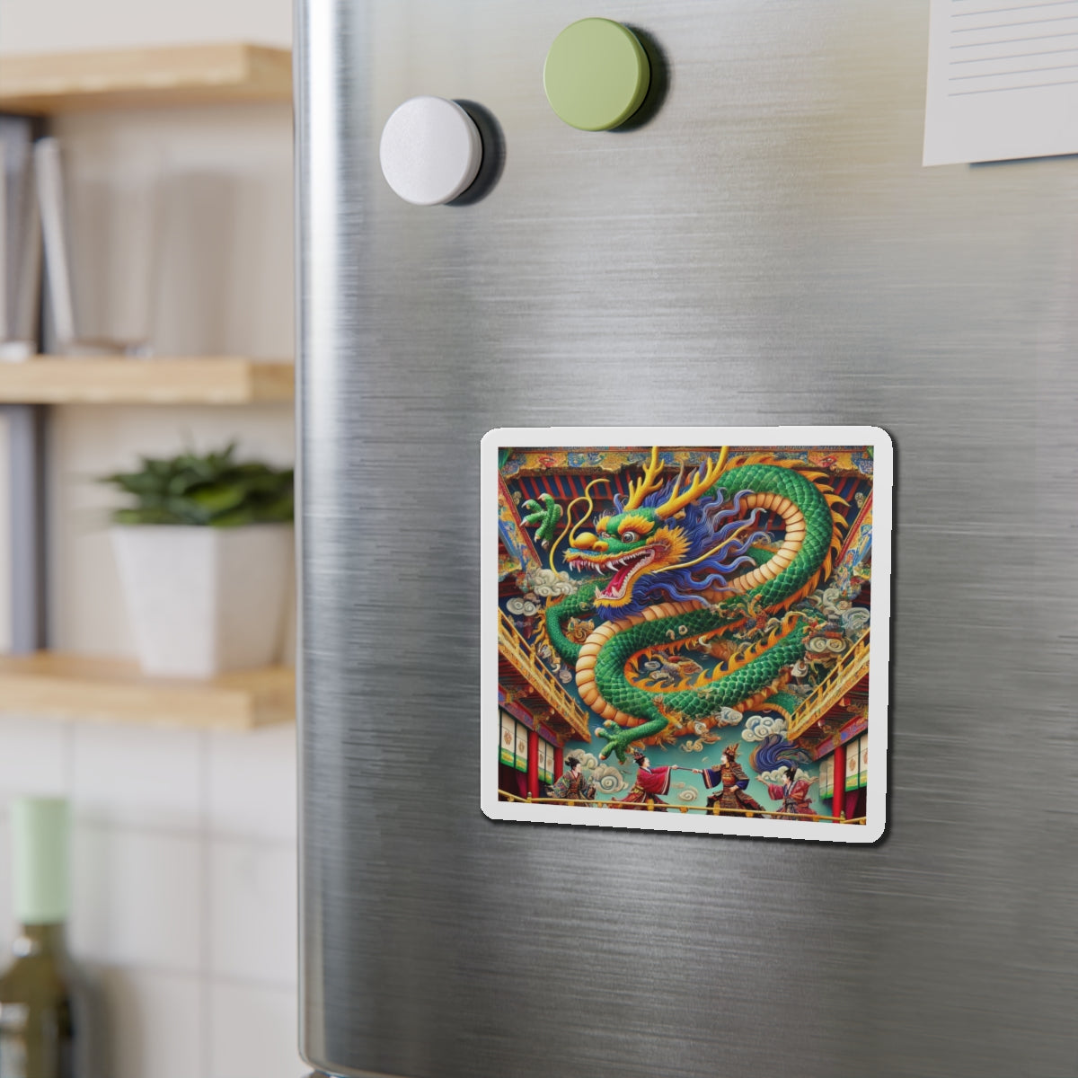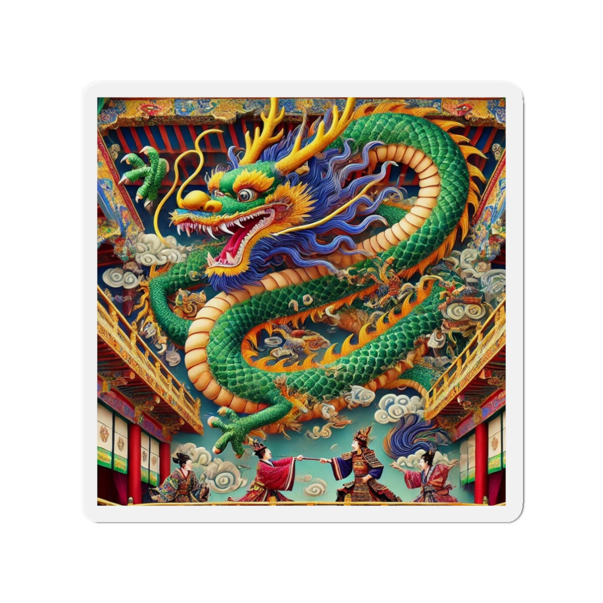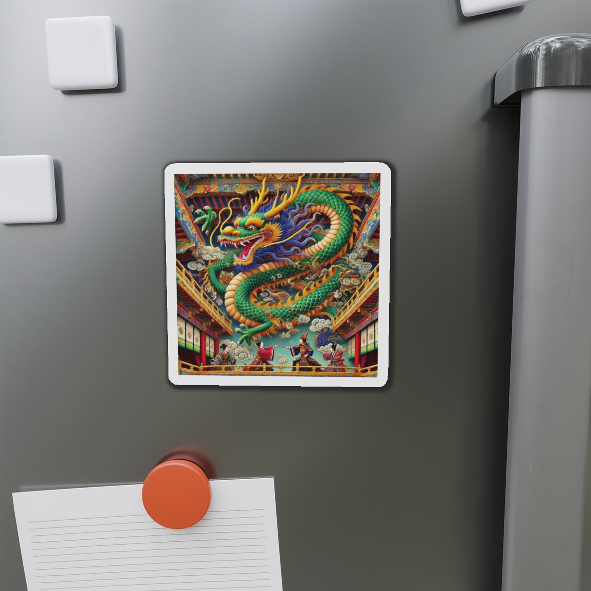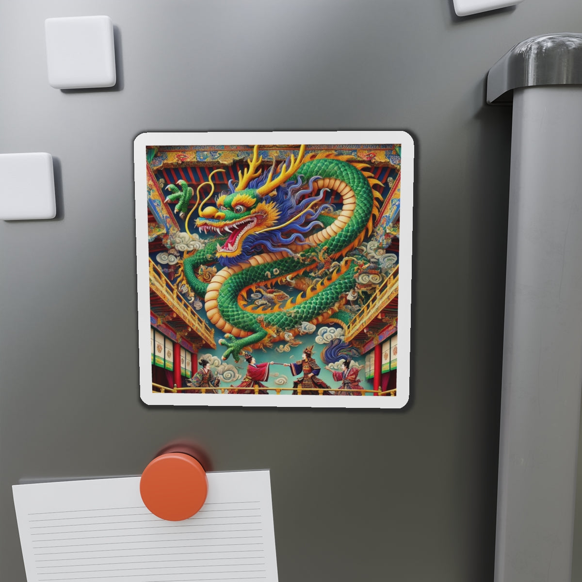 Bring a touch of myth and theater to any surface with these durable die-cut magnets. Available in four sizes, each flexible magnet showcases a majestic Tibetan dragon with shimmering blue, green, and gold scales, poised above a theater balcony. Beneath its powerful presence, two Kabuki performers in ornate costumes face off in a dramatic duel on a richly detailed stage. The clean edges of the die-cut technique highlight every curve of the artwork, while the sturdy design ensures long-lasting use. Blending Tibetan mysticism, Kabuki tradition, and Western theatrical flair, these magnets turn everyday spaces into vibrant showcases of art and storytelling.