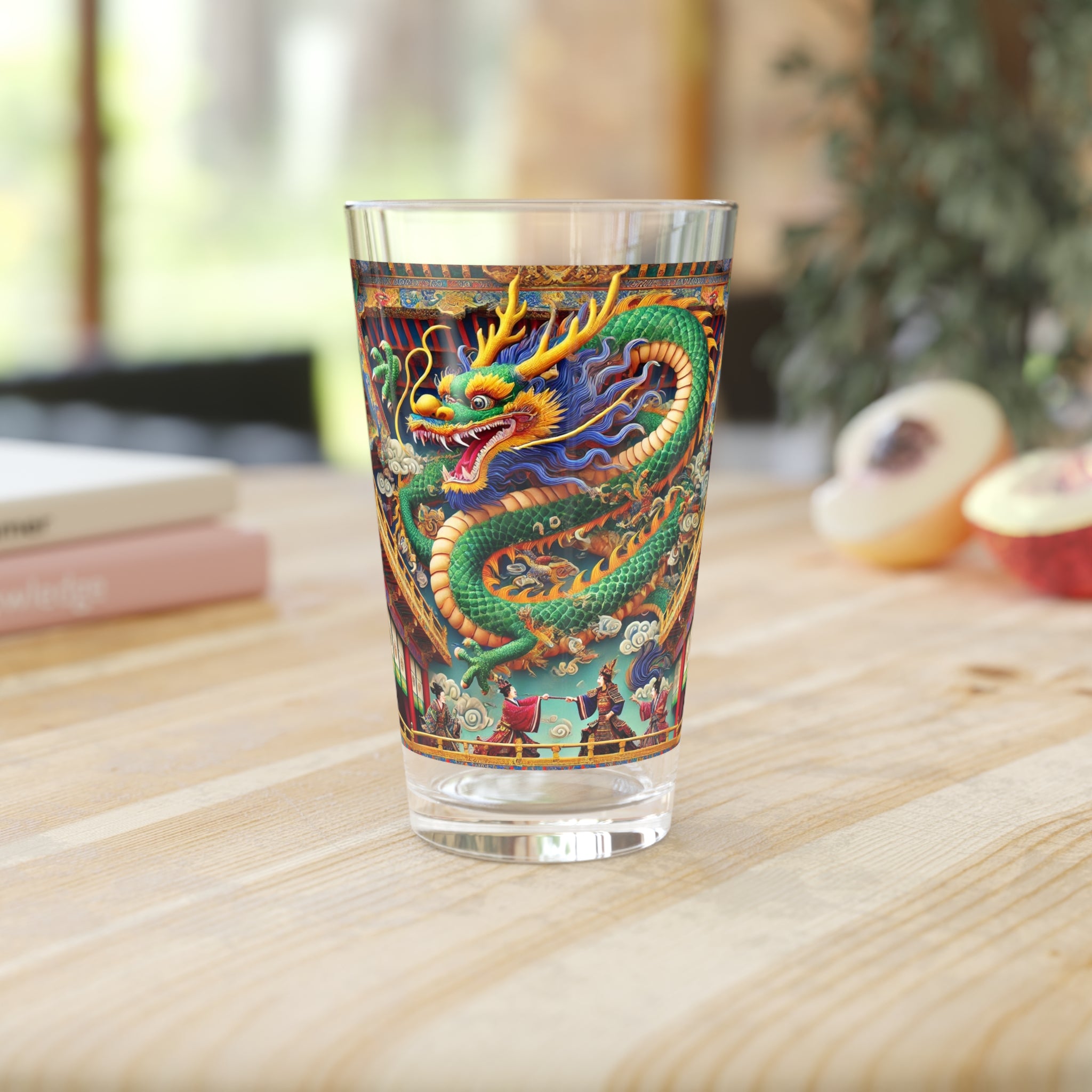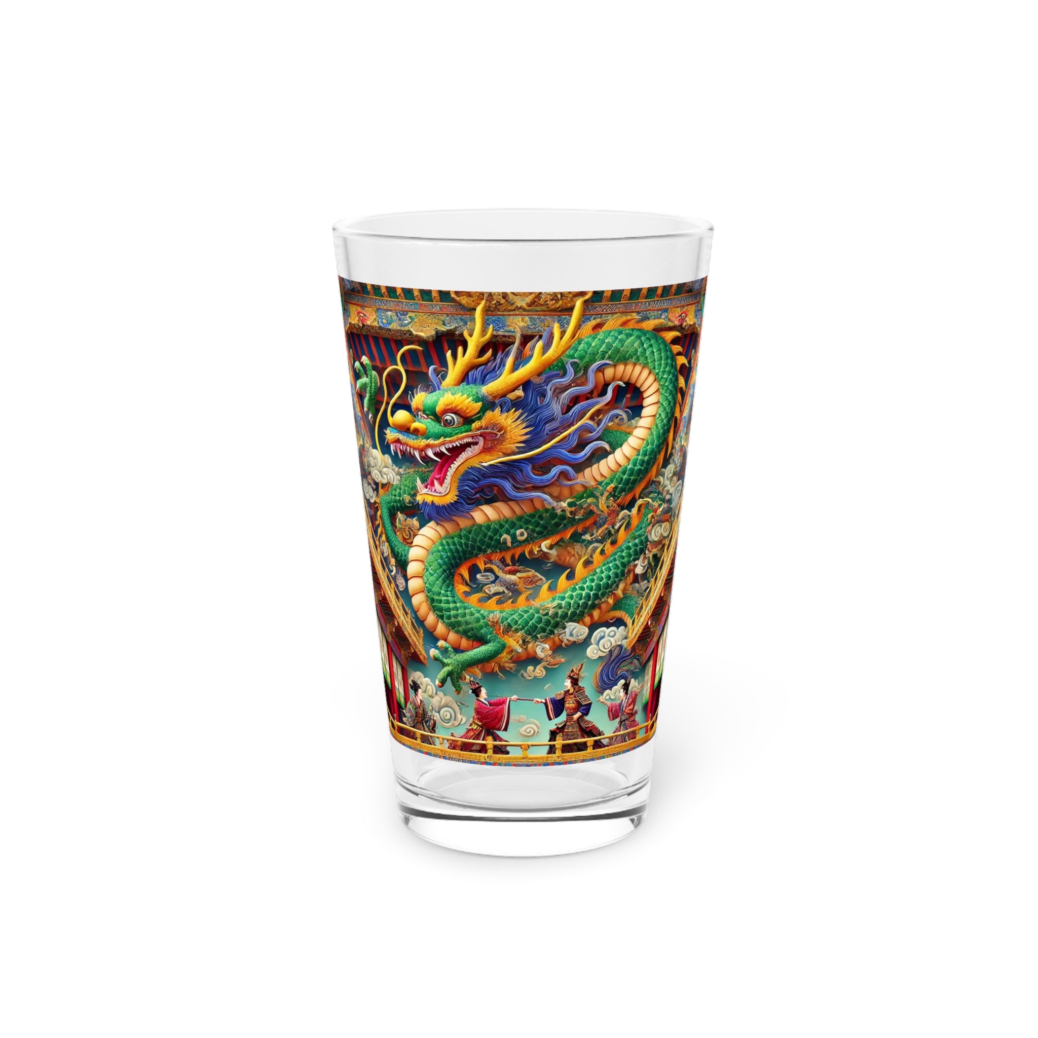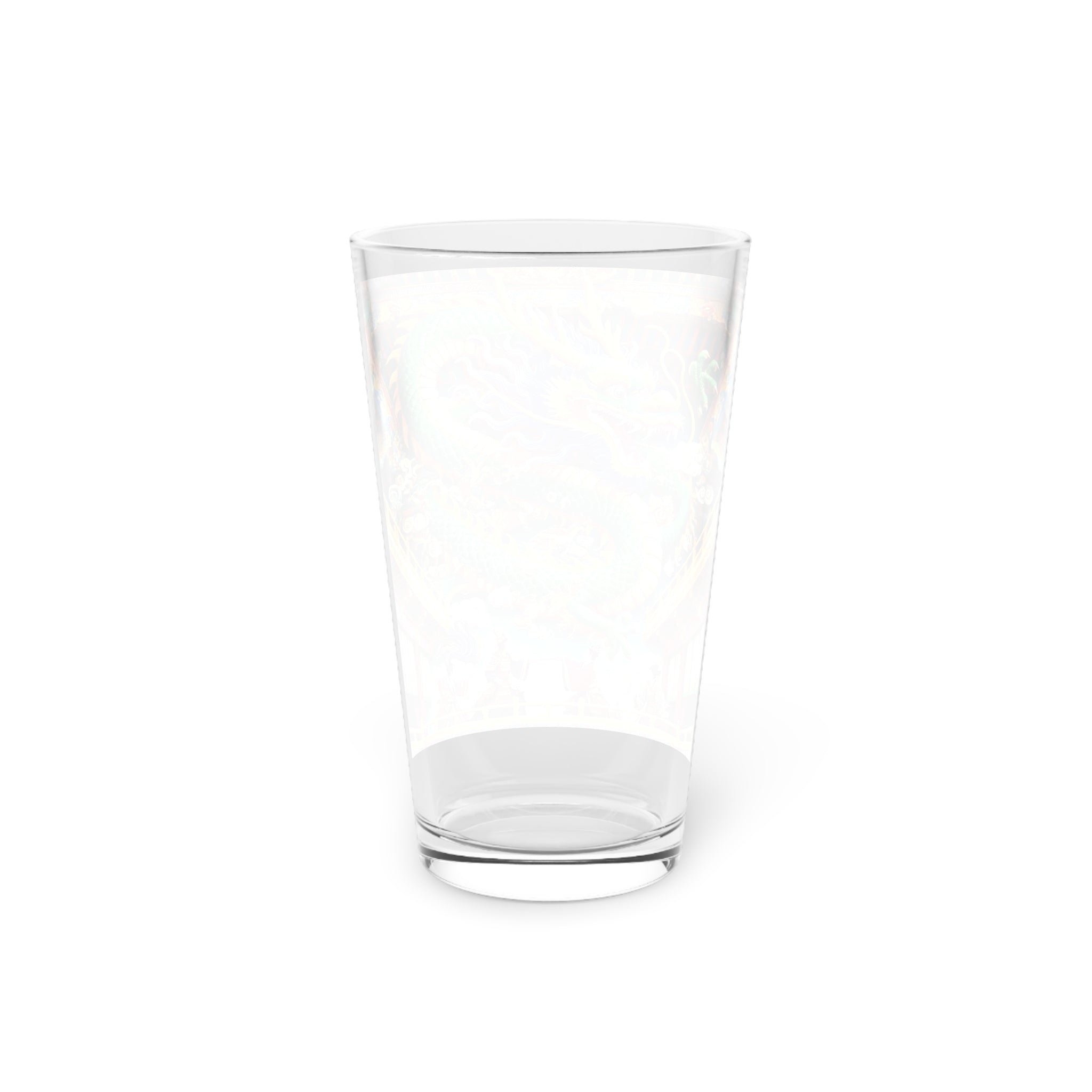 Raise a toast with a glass that feels like a stage of myth and theater. This 16oz printed pint glass is long, clear, and versatile—perfect for everything from casual drinks to housewarming gifts. Its glossy surface brings to life a majestic Tibetan dragon with shimmering blue, green, and gold scales, poised above a theater balcony. Beneath its powerful presence, two Kabuki performers in elaborate costumes face off in a duel on a richly detailed stage. The bold colors and layered depth of the artwork merge Tibetan mysticism, Kabuki tradition, and Western theatrical flair into a design as functional as it is captivating.