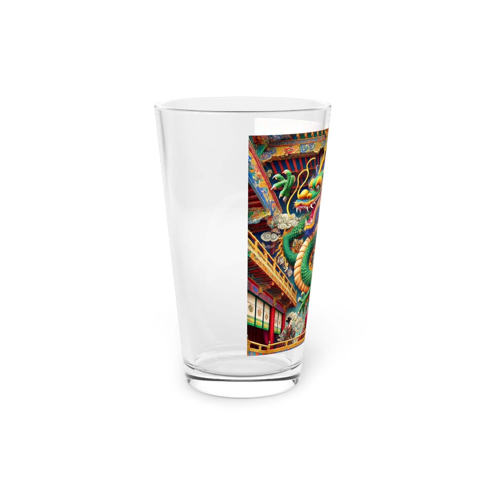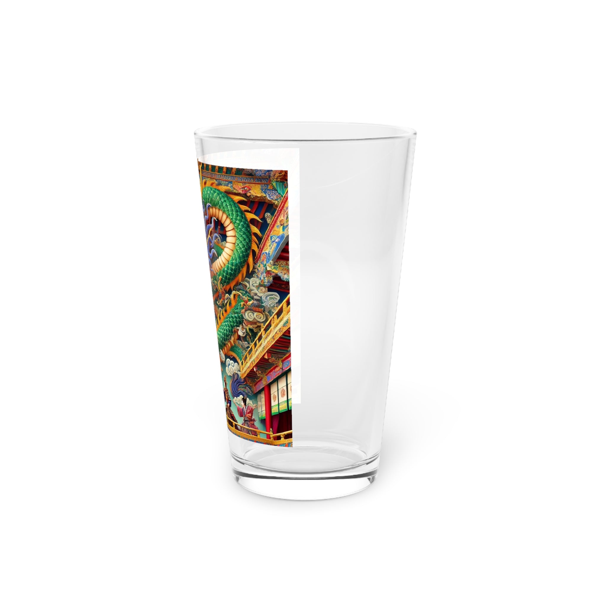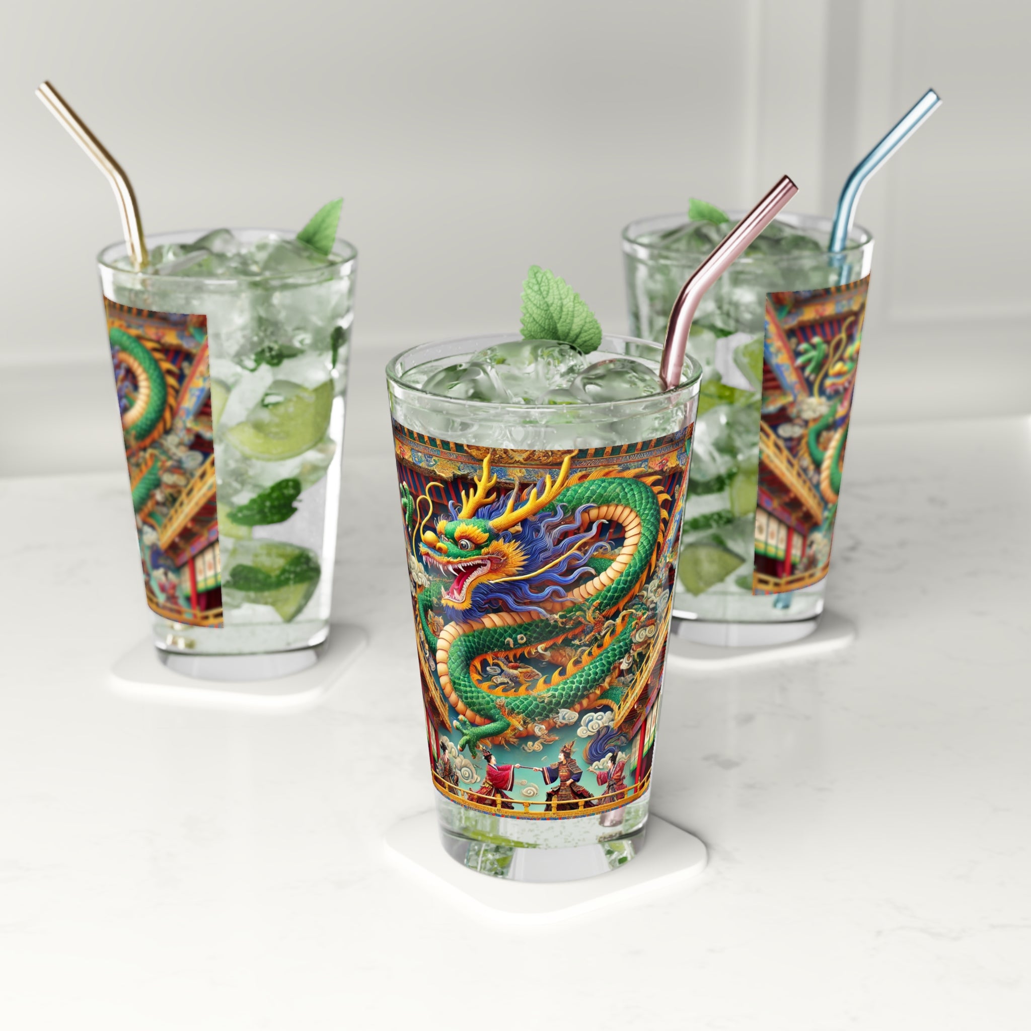 Raise a toast with a glass that feels like a stage of myth and theater. This 16oz printed pint glass is long, clear, and versatile—perfect for everything from casual drinks to housewarming gifts. Its glossy surface brings to life a majestic Tibetan dragon with shimmering blue, green, and gold scales, poised above a theater balcony. Beneath its powerful presence, two Kabuki performers in elaborate costumes face off in a duel on a richly detailed stage. The bold colors and layered depth of the artwork merge Tibetan mysticism, Kabuki tradition, and Western theatrical flair into a design as functional as it is captivating.