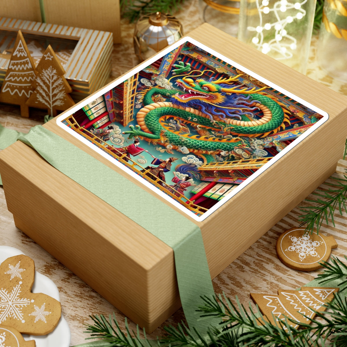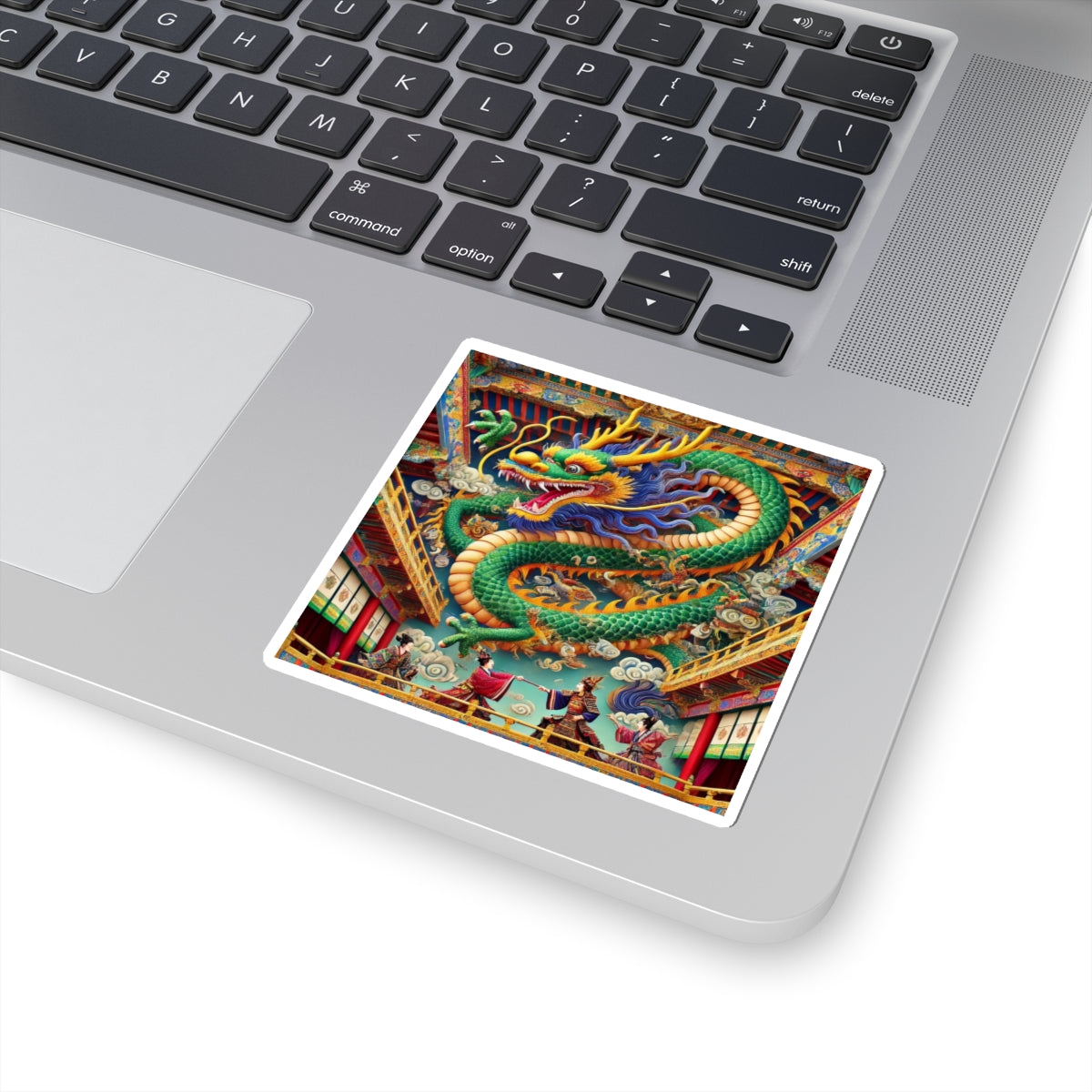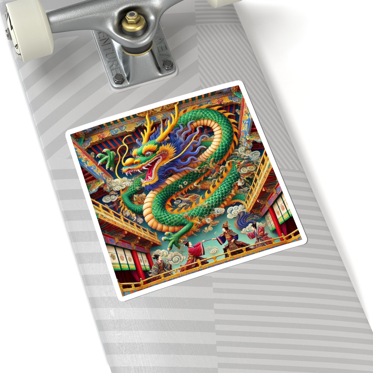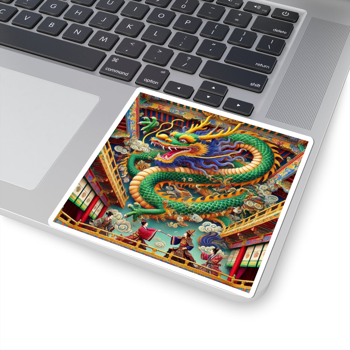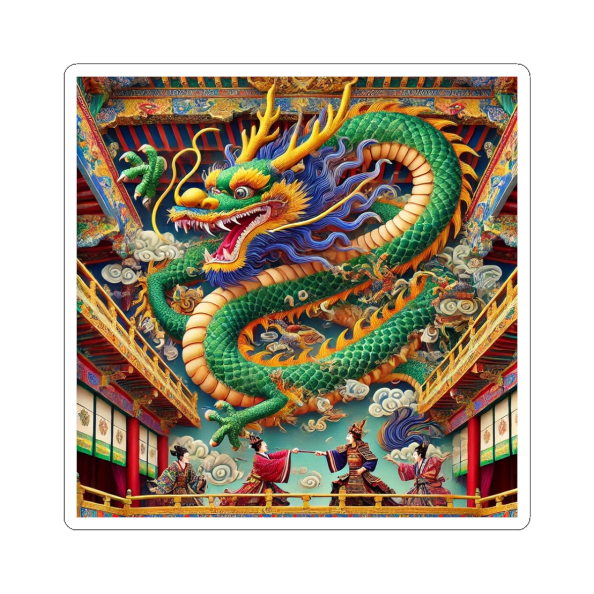 Transform your surfaces into a stage of myth and drama with these kiss-cut stickers. Available in four sizes with a glossy finish, each sticker is precisely cut to follow the contours of the design while keeping the back intact for easy peeling. The artwork features a majestic Tibetan dragon with shimmering blue, green, and gold scales, poised above a theater balcony. Beneath its commanding presence, two Kabuki performers in elaborate costumes face off in a dramatic duel on a richly detailed stage. The vivid colors and layered depth blend Tibetan mysticism, Kabuki theater, and Western flair into a design that’s bold, durable, and endlessly eye-catching.