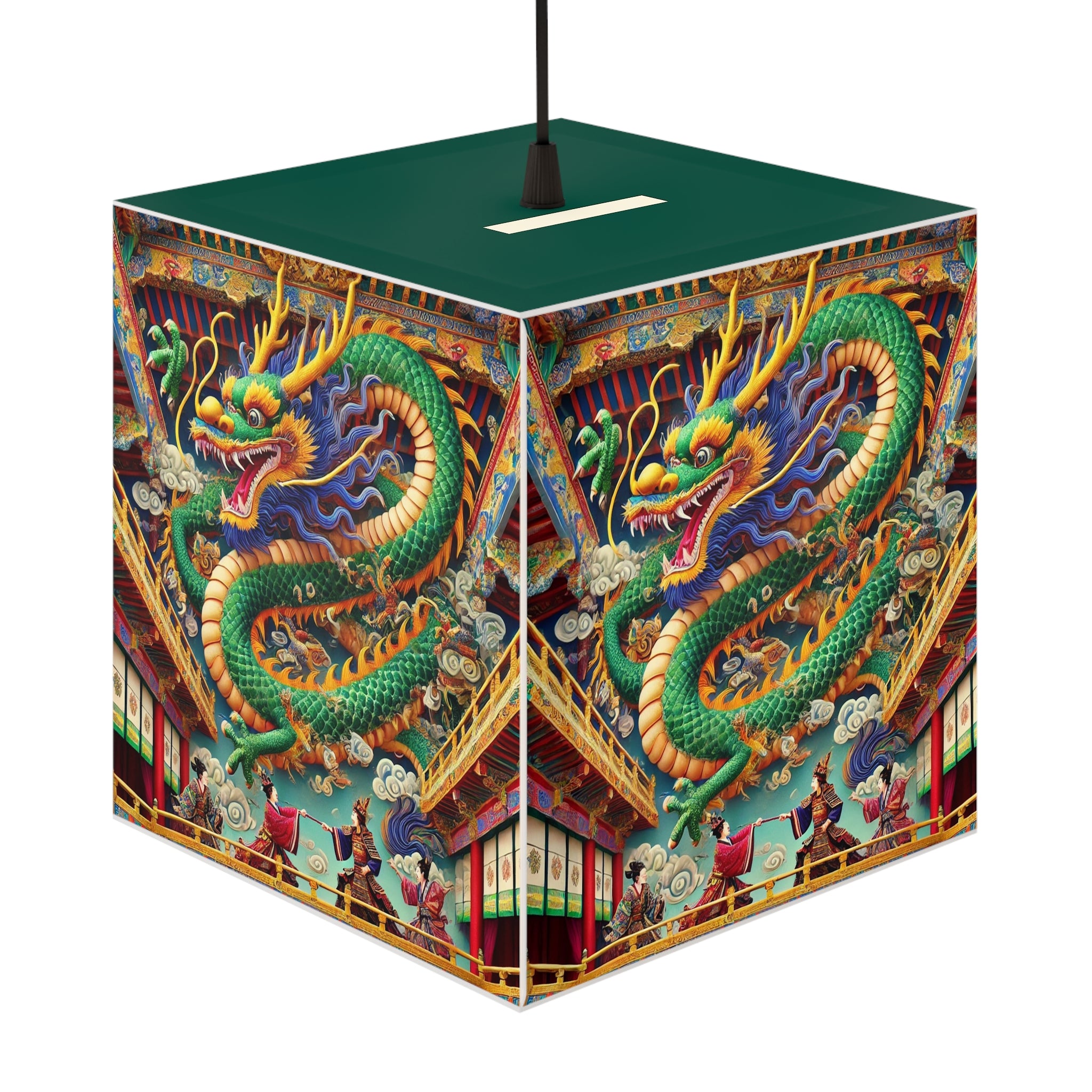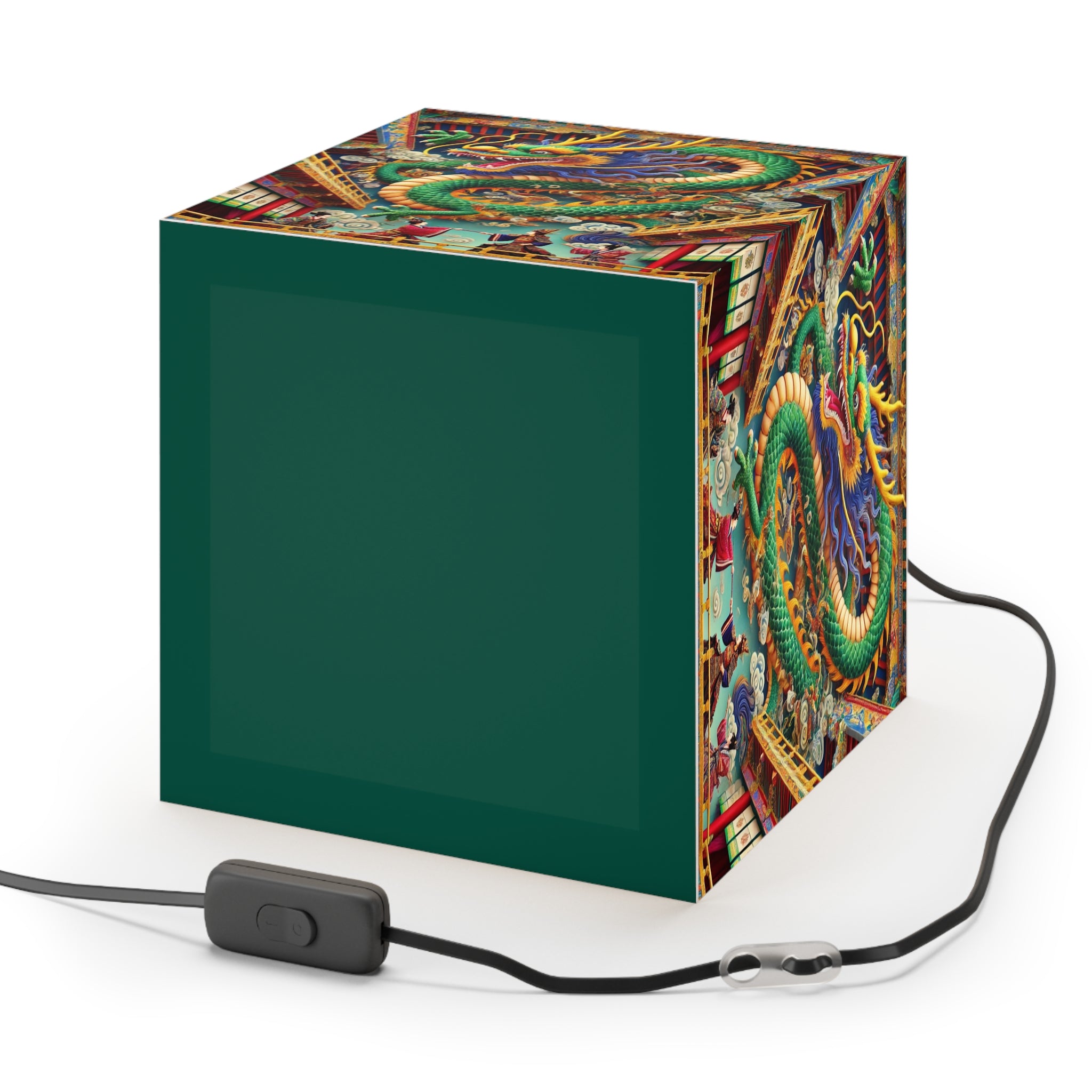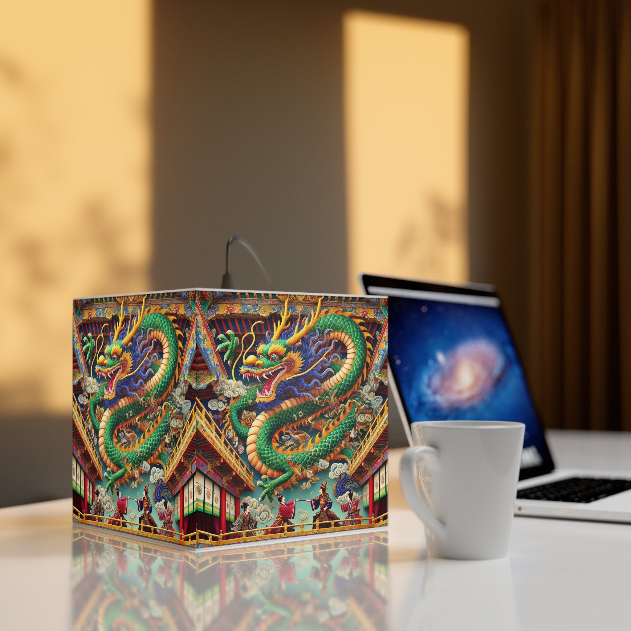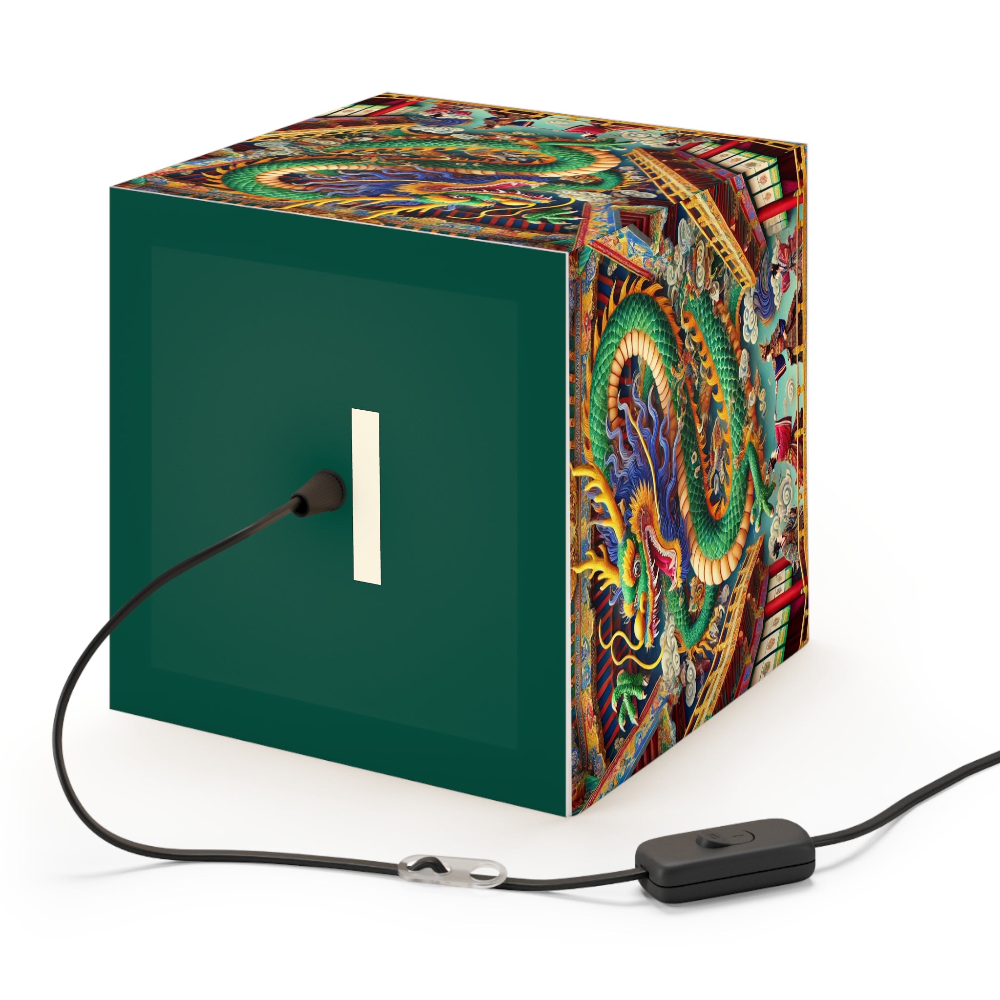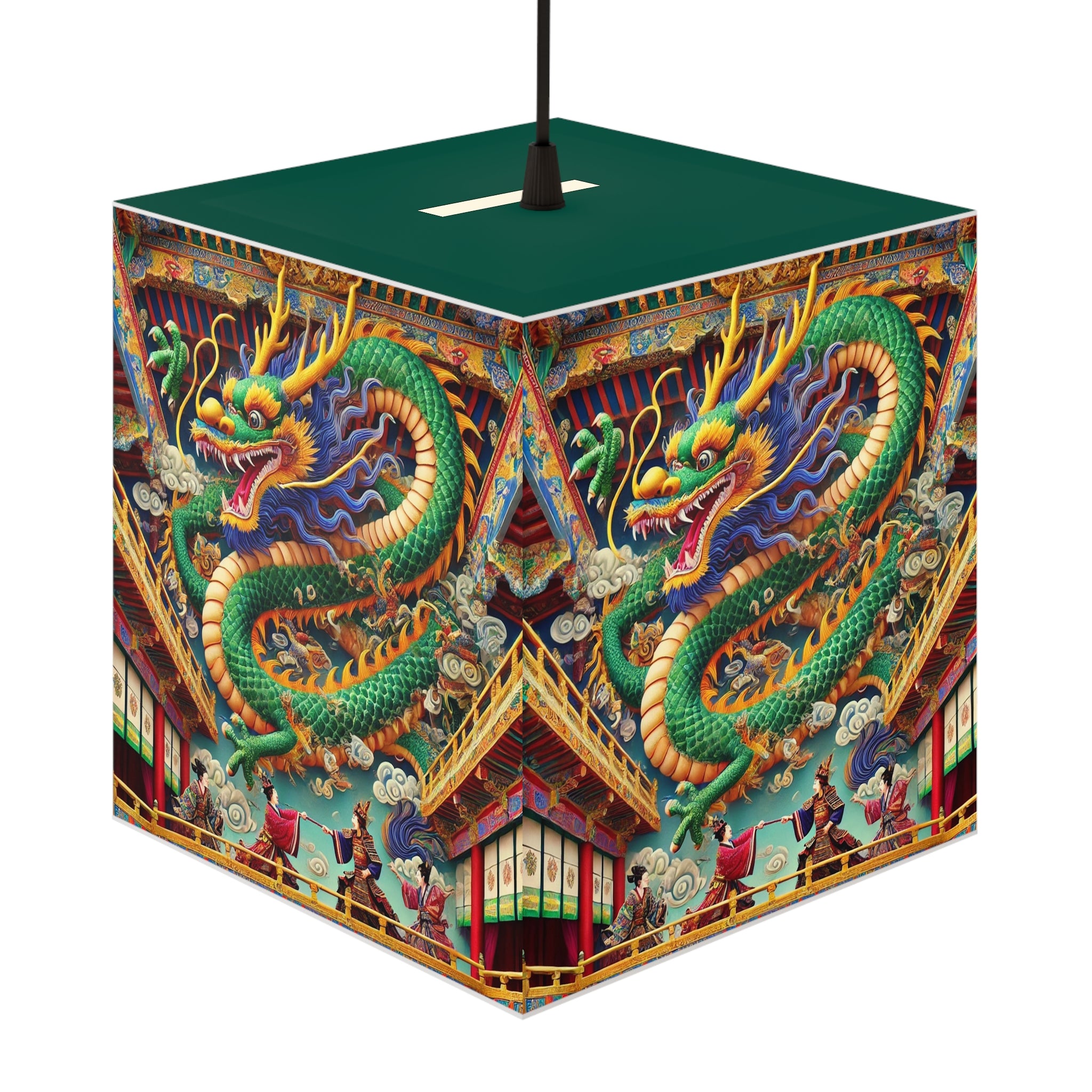 Turn any room into a glowing stage of myth and drama with this lightweight light cube lamp. Designed for both function and style, it can be ordered with a Standard cord—compatible with US (Type A) and European (Type C) outlets—or a chic Pendant cord for a plug-free aesthetic. The illuminated panels showcase a majestic Tibetan dragon with shimmering blue, green, and gold scales, poised above a grand theater balcony. Beneath its presence, two Kabuki performers in ornate costumes face off in a dramatic duel on a richly detailed stage. With bold colors, layered depth, and striking clarity, this lamp blends Tibetan mysticism, Kabuki theater, and Western flair, turning soft light into a captivating art experience.