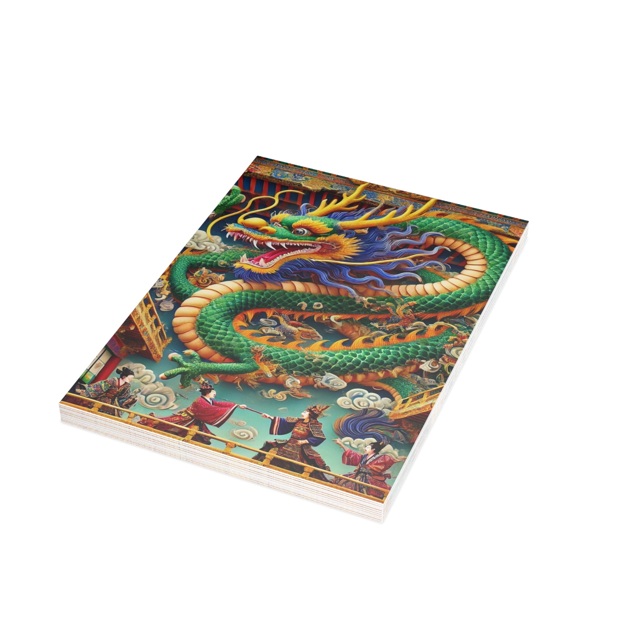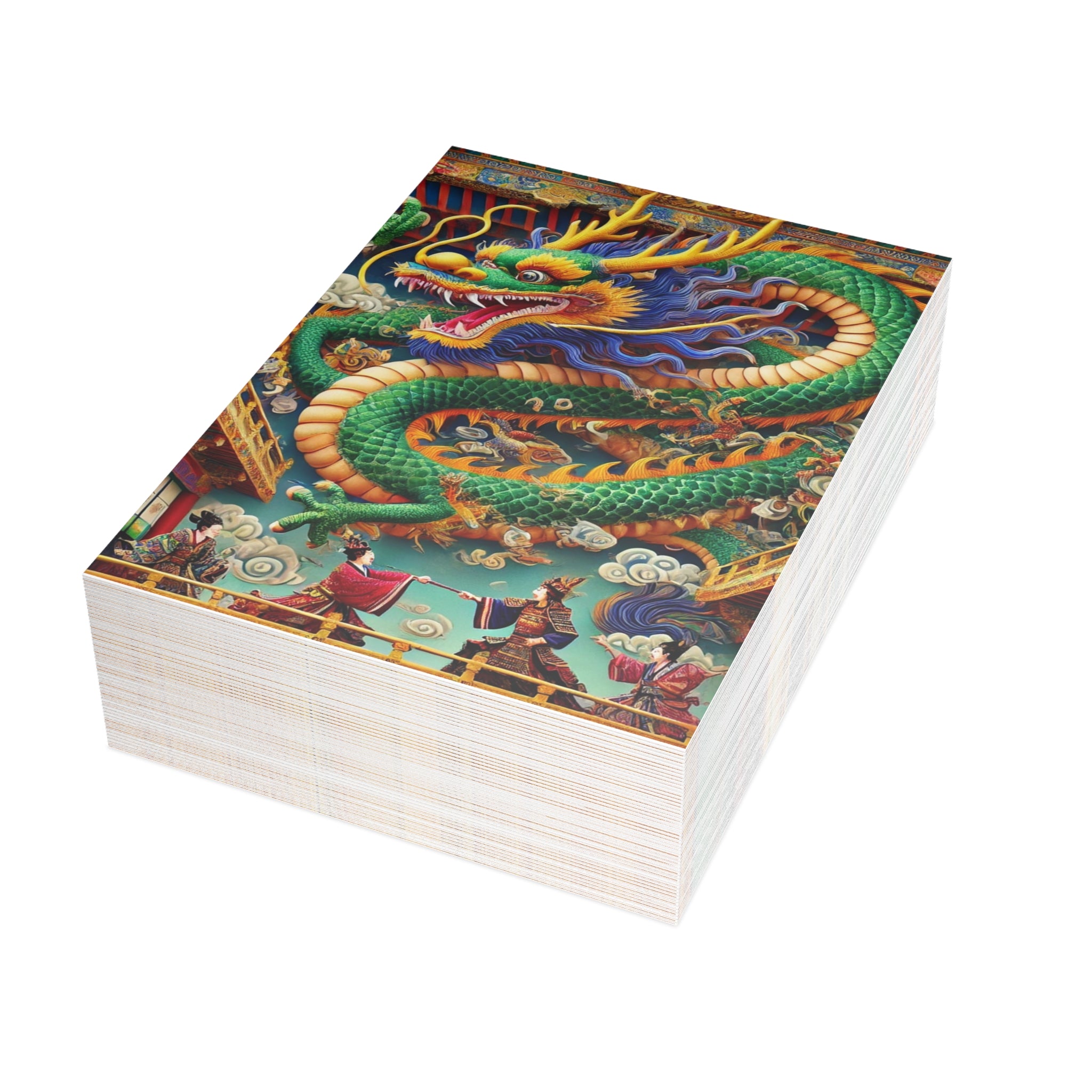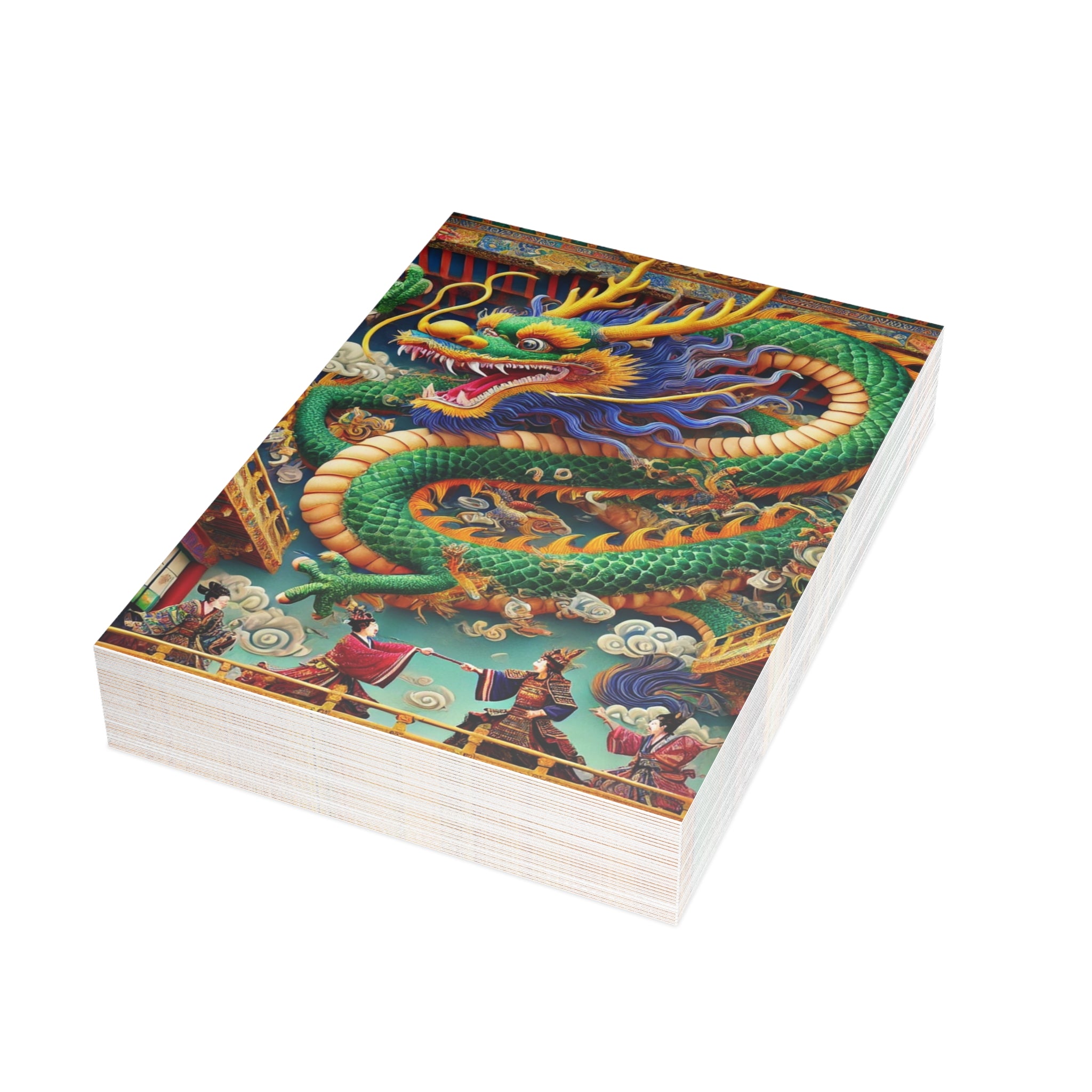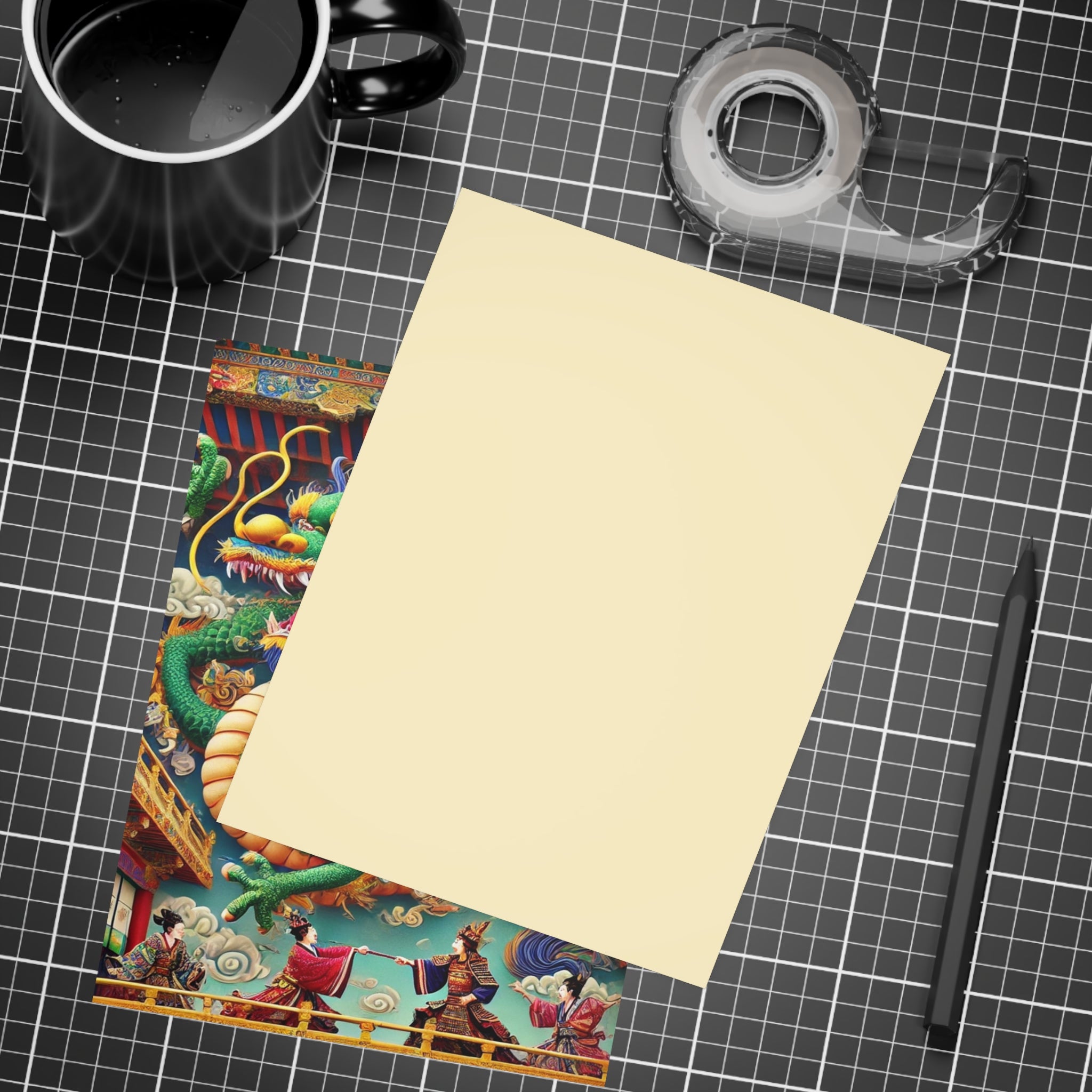 Send messages with a touch of drama and myth through these artistic postcards. Printed on your choice of four premium paper finishes—matte, uncoated, one-side coat, or two-side coat—each postcard features a majestic Tibetan dragon with shimmering blue, green, and gold scales, poised above a grand theater balcony. Below, two Kabuki performers in elaborate costumes face off in a striking duel on a richly detailed stage. Available in bundles of 10, 30, or 50 with envelopes included, these postcards are perfect for personal notes, thoughtful gifts, or decorative keepsakes. Blending Tibetan mysticism, Kabuki tradition, and Western theatrical flair, each card transforms correspondence into a vivid work of art.