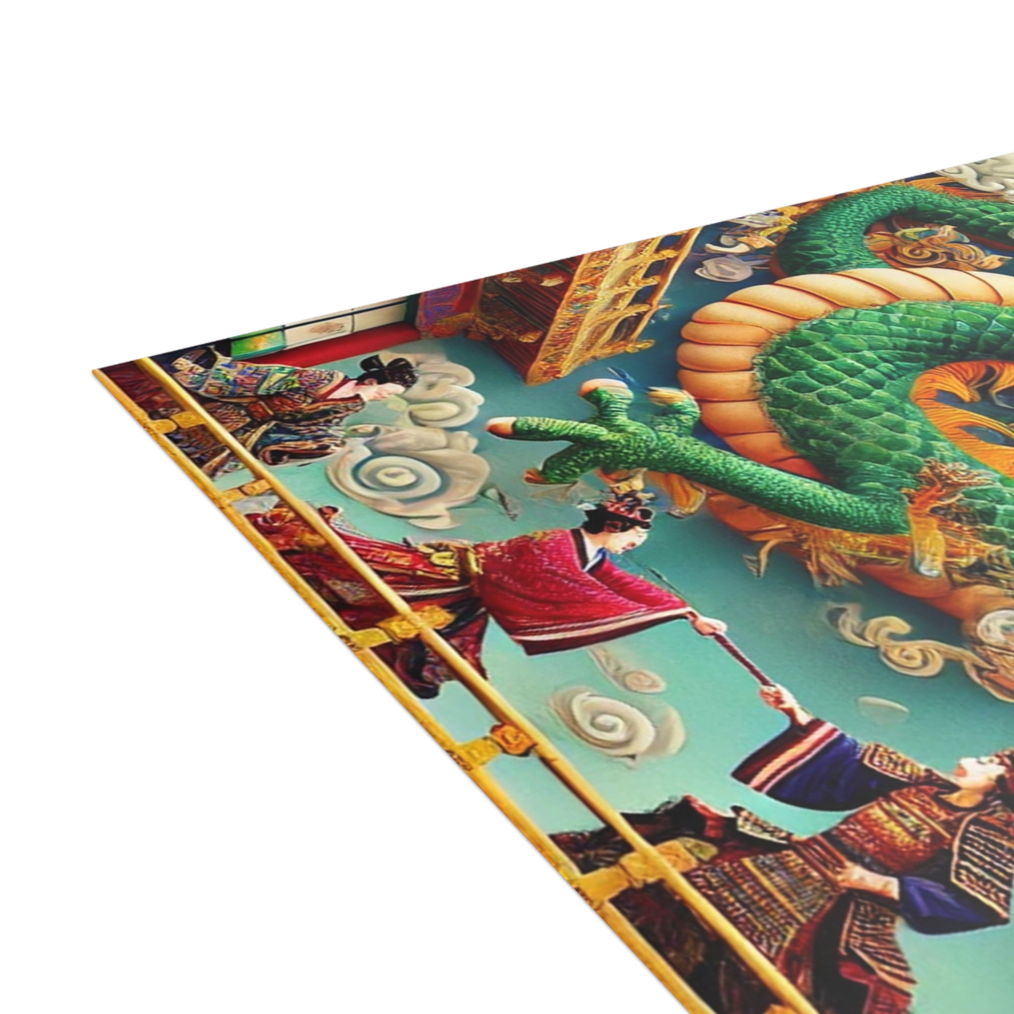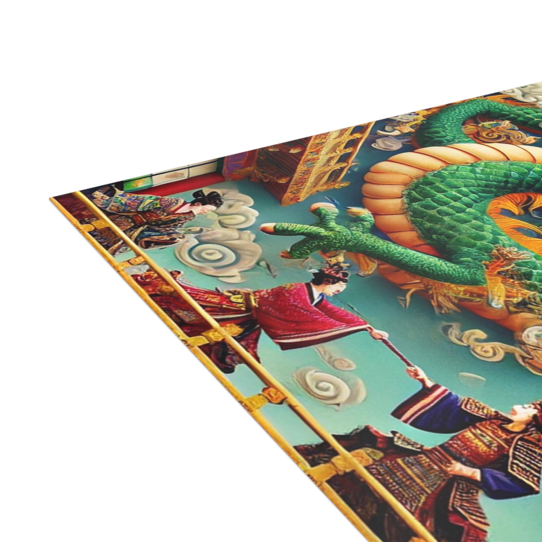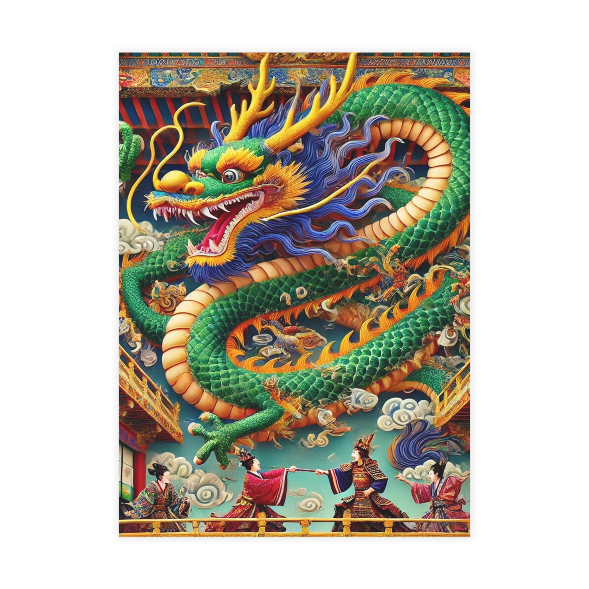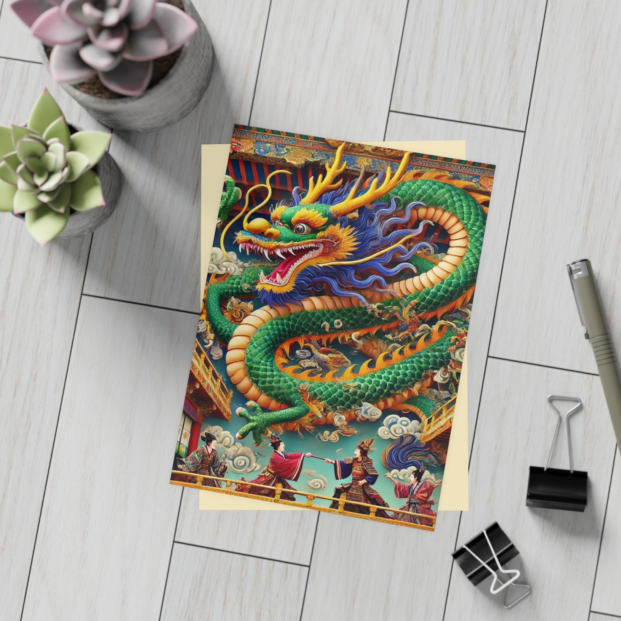 Send messages with a touch of drama and myth through these artistic postcards. Printed on your choice of four premium paper finishes—matte, uncoated, one-side coat, or two-side coat—each postcard features a majestic Tibetan dragon with shimmering blue, green, and gold scales, poised above a grand theater balcony. Below, two Kabuki performers in elaborate costumes face off in a striking duel on a richly detailed stage. Available in bundles of 10, 30, or 50 with envelopes included, these postcards are perfect for personal notes, thoughtful gifts, or decorative keepsakes. Blending Tibetan mysticism, Kabuki tradition, and Western theatrical flair, each card transforms correspondence into a vivid work of art.