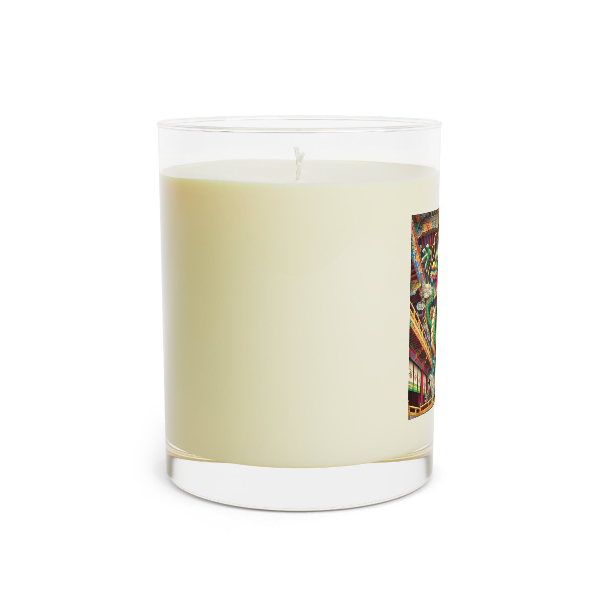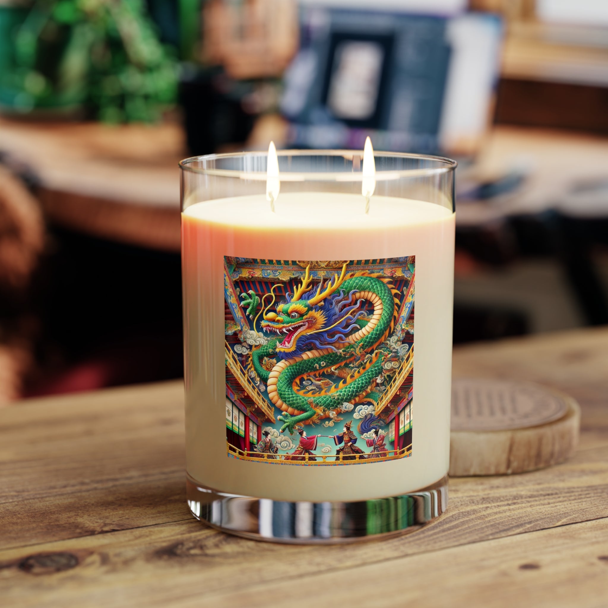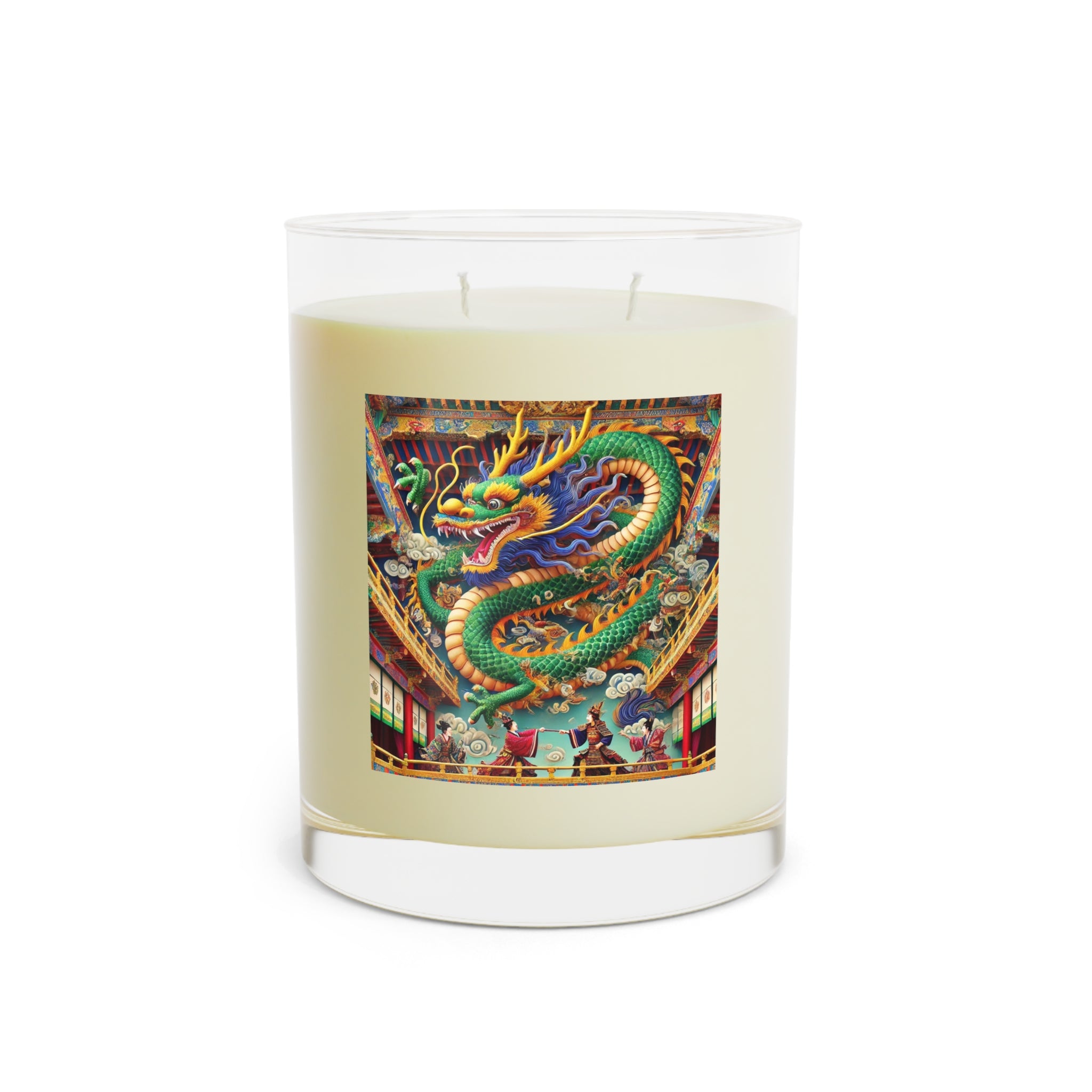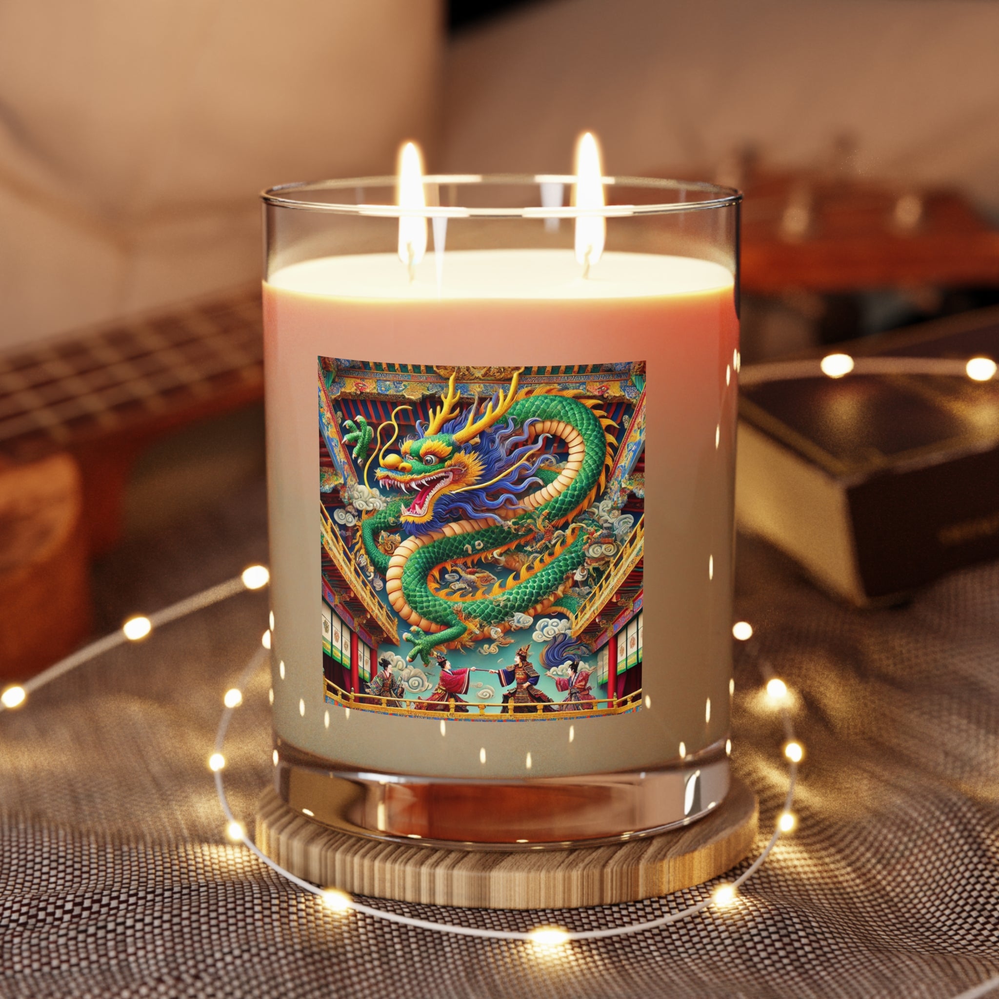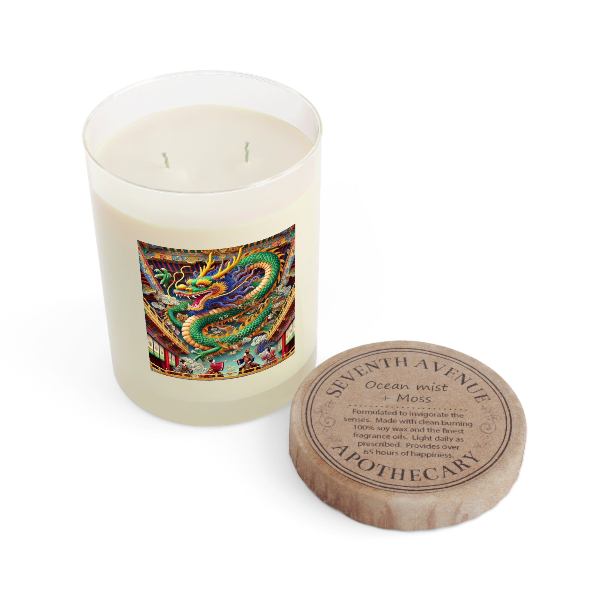 Breathe in, breathe out—relaxation begins with a candle that fuses serenity and dramatic artistry. This 11oz full-glass scented candle is crafted from 100% food-grade soy wax and the finest fragrance oils, ensuring a clean, long-lasting burn of up to 65 hours. Phthalate- and lead-free, it brings both safety and luxury to your space, with a premium full-glass print that highlights an extraordinary artwork. A majestic Tibetan dragon with shimmering blue, green, and gold scales hovers above a grand theater balcony, while below, two Kabuki performers duel in ornate costumes on a richly detailed stage. The bold colors, layered depth, and flawless clarity of the design merge Tibetan mysticism with Kabuki drama and Western theatrical flair, turning this candle into more than aromatherapy—it becomes a centerpiece of storytelling. Choose from three captivating scents: White Tea & Fig, Lavender & Sage, or Ocean Mist & Moss, and let myth and fragrance fill your space.