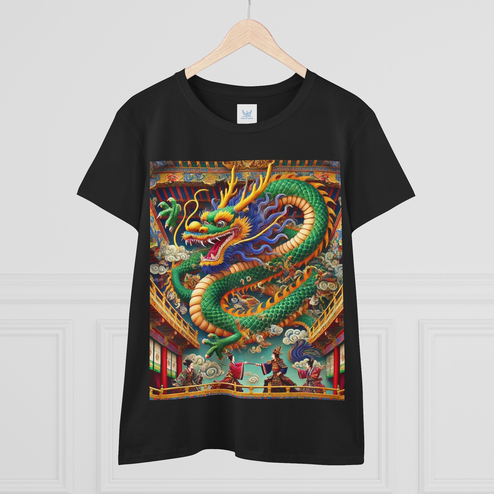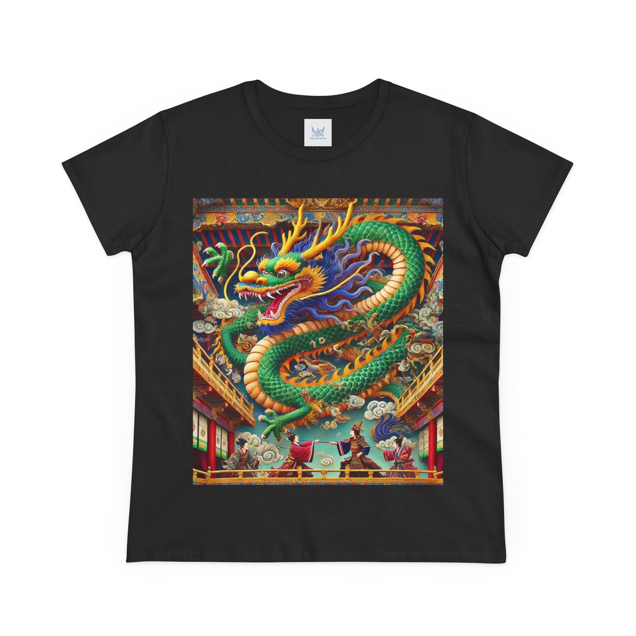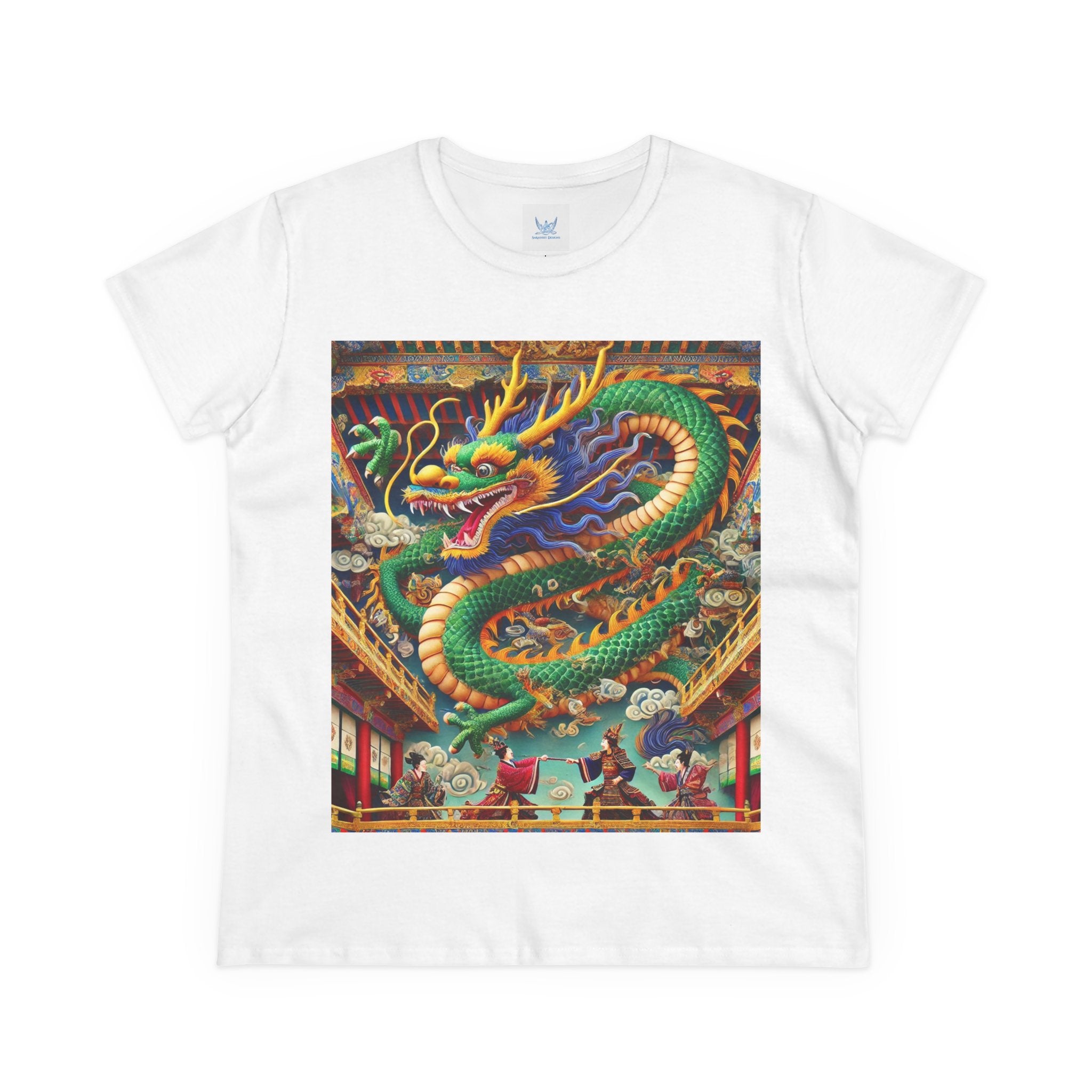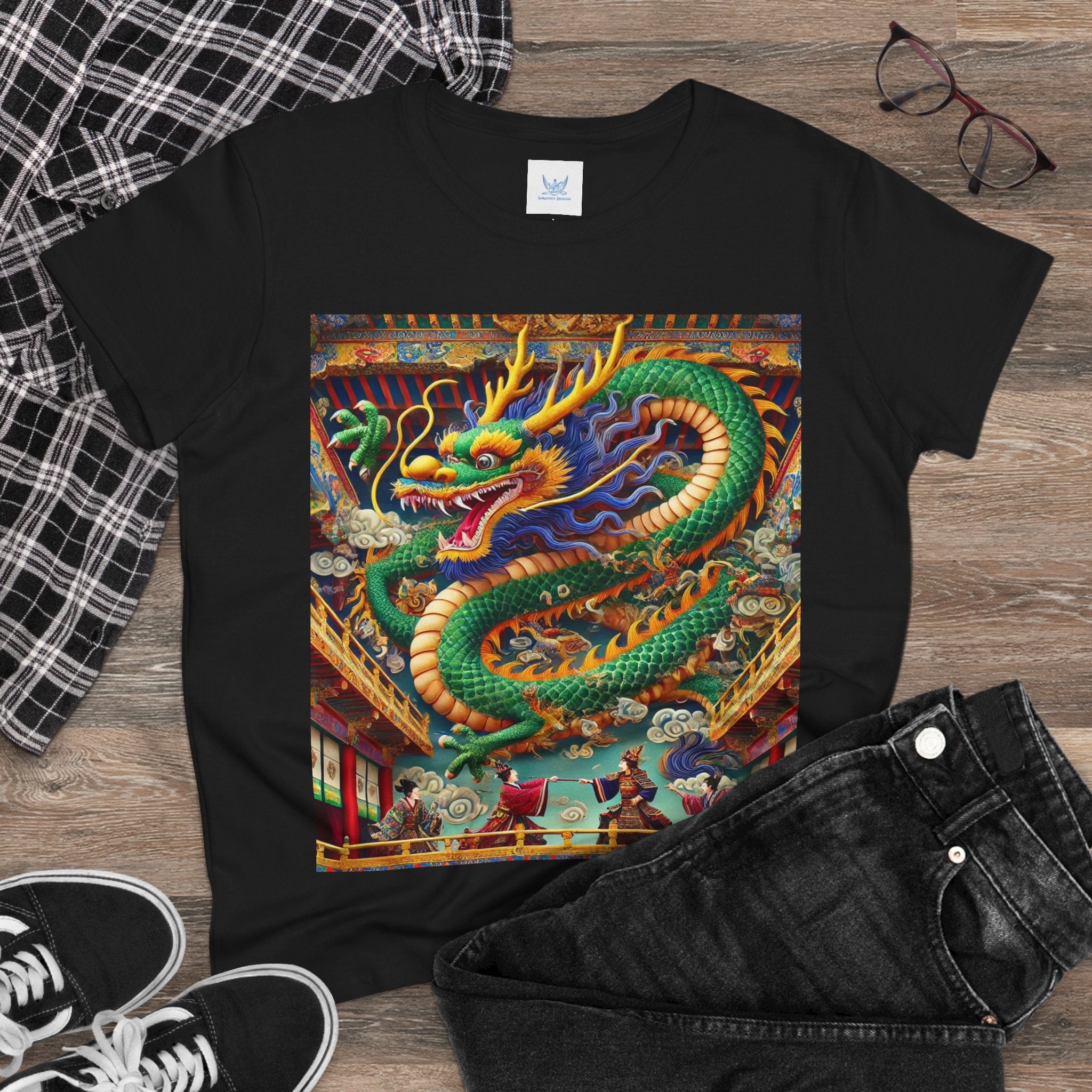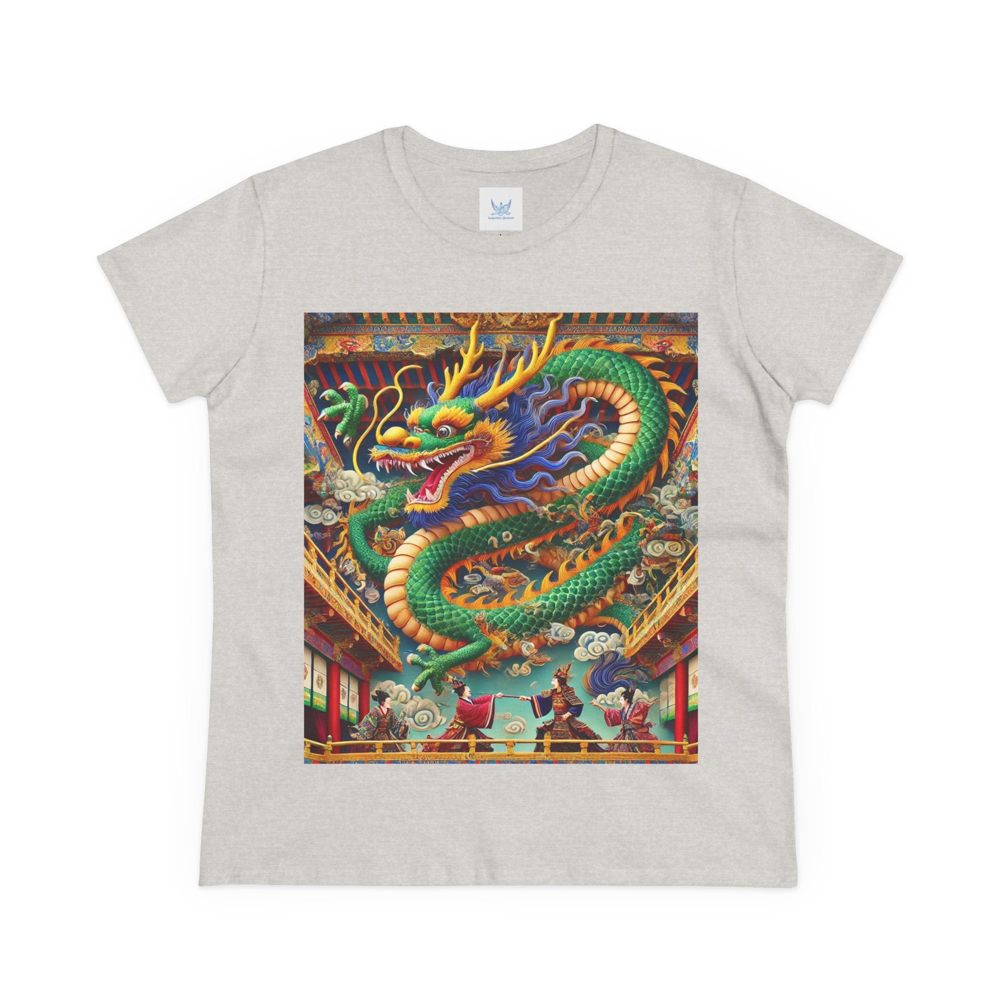 Add bold artistry to your wardrobe with a tee that feels as good as it looks. Crafted from 100% cotton, this semi-fitted silhouette is lightweight yet durable, pre-shrunk to hold its shape, and finished with cap sleeves plus a taped neck and shoulders for lasting comfort. Across the soft fabric, a striking design comes to life: a majestic Tibetan dragon with shimmering blue, green, and gold scales, poised above a grand theater balcony. Below, two Kabuki performers in ornate costumes duel on a richly detailed stage. With its clean lines, vibrant colors, and layered depth, the artwork blends Tibetan mysticism, Kabuki drama, and Western theatrical flair—making this tee more than clothing, but a wearable work of art.
