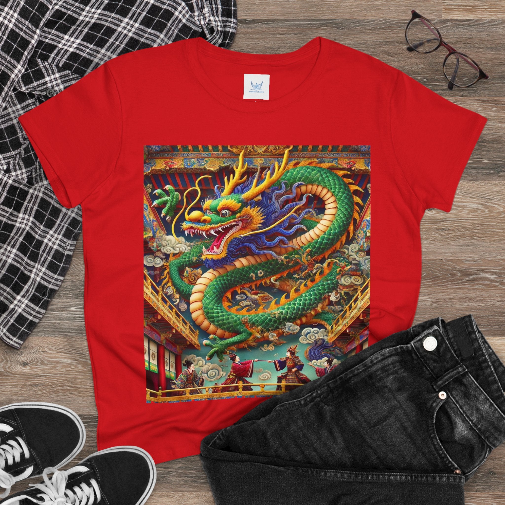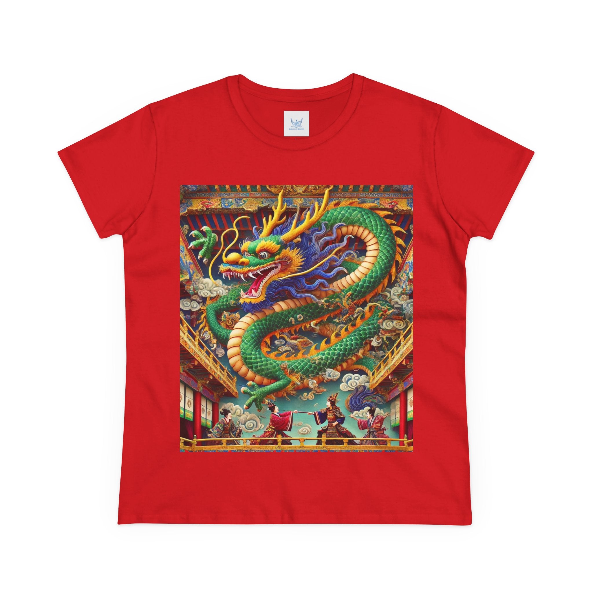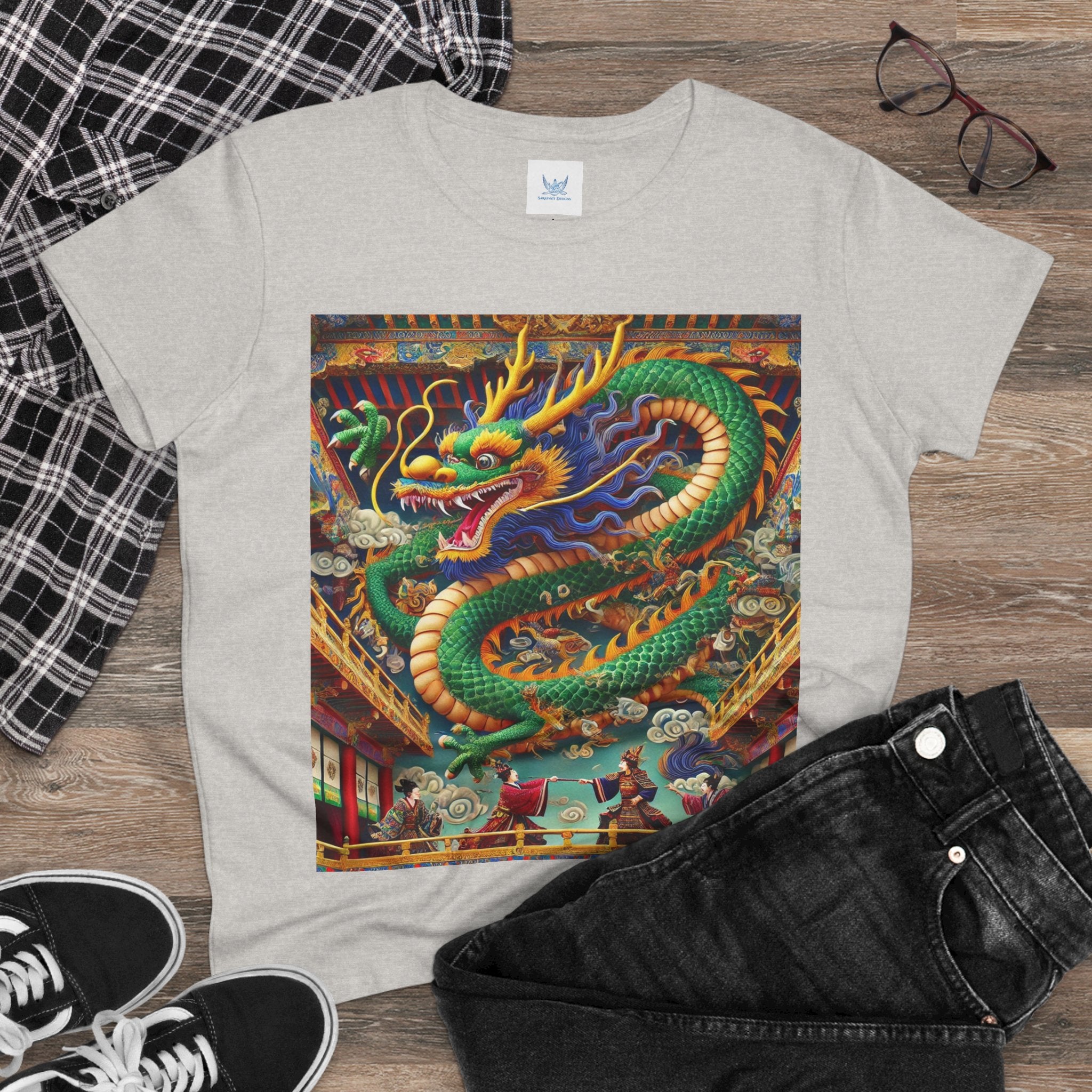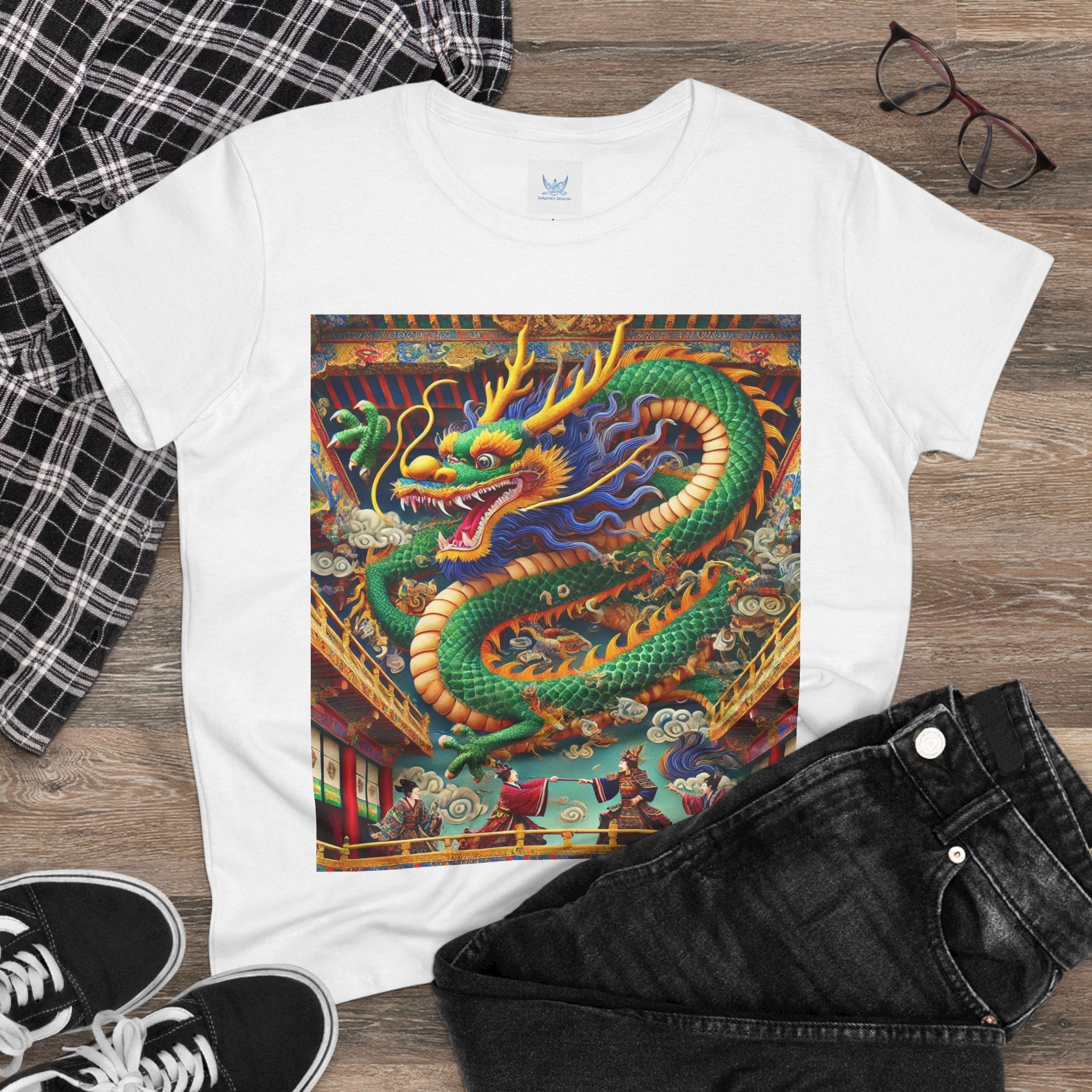 Add bold artistry to your wardrobe with a tee that feels as good as it looks. Crafted from 100% cotton, this semi-fitted silhouette is lightweight yet durable, pre-shrunk to hold its shape, and finished with cap sleeves plus a taped neck and shoulders for lasting comfort. Across the soft fabric, a striking design comes to life: a majestic Tibetan dragon with shimmering blue, green, and gold scales, poised above a grand theater balcony. Below, two Kabuki performers in ornate costumes duel on a richly detailed stage. With its clean lines, vibrant colors, and layered depth, the artwork blends Tibetan mysticism, Kabuki drama, and Western theatrical flair—making this tee more than clothing, but a wearable work of art.