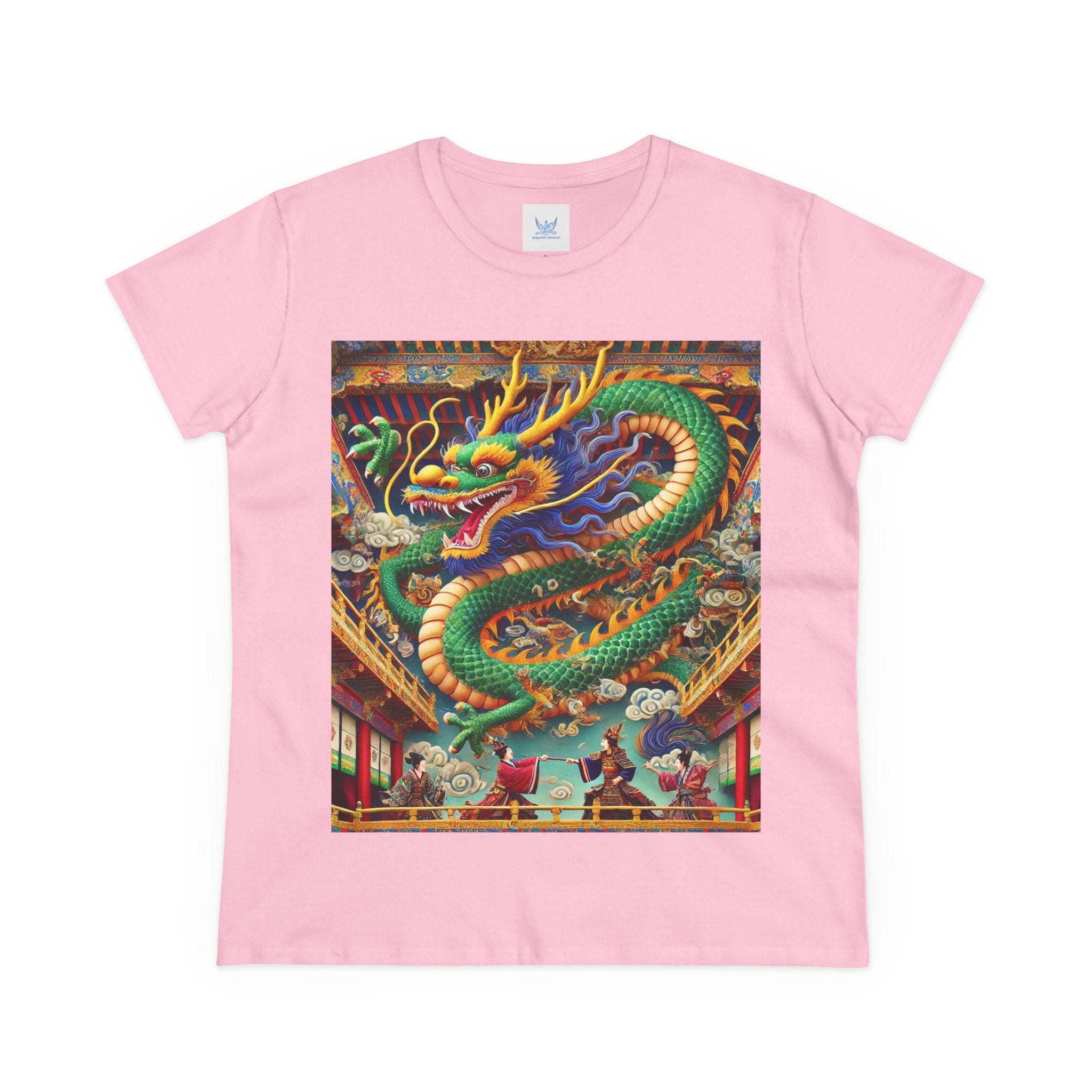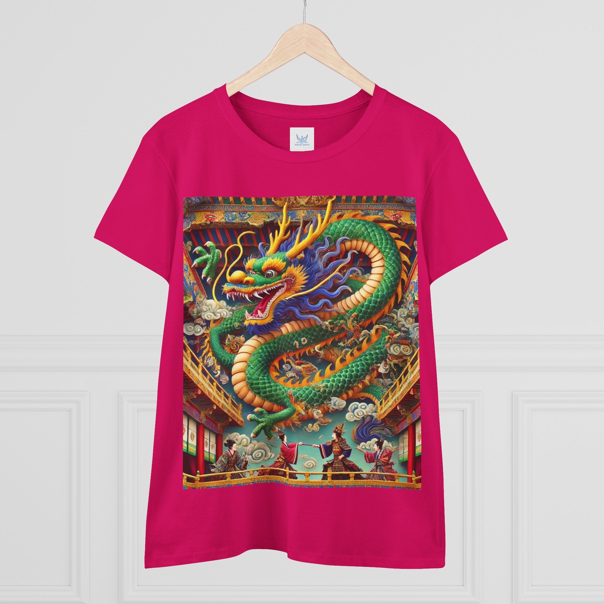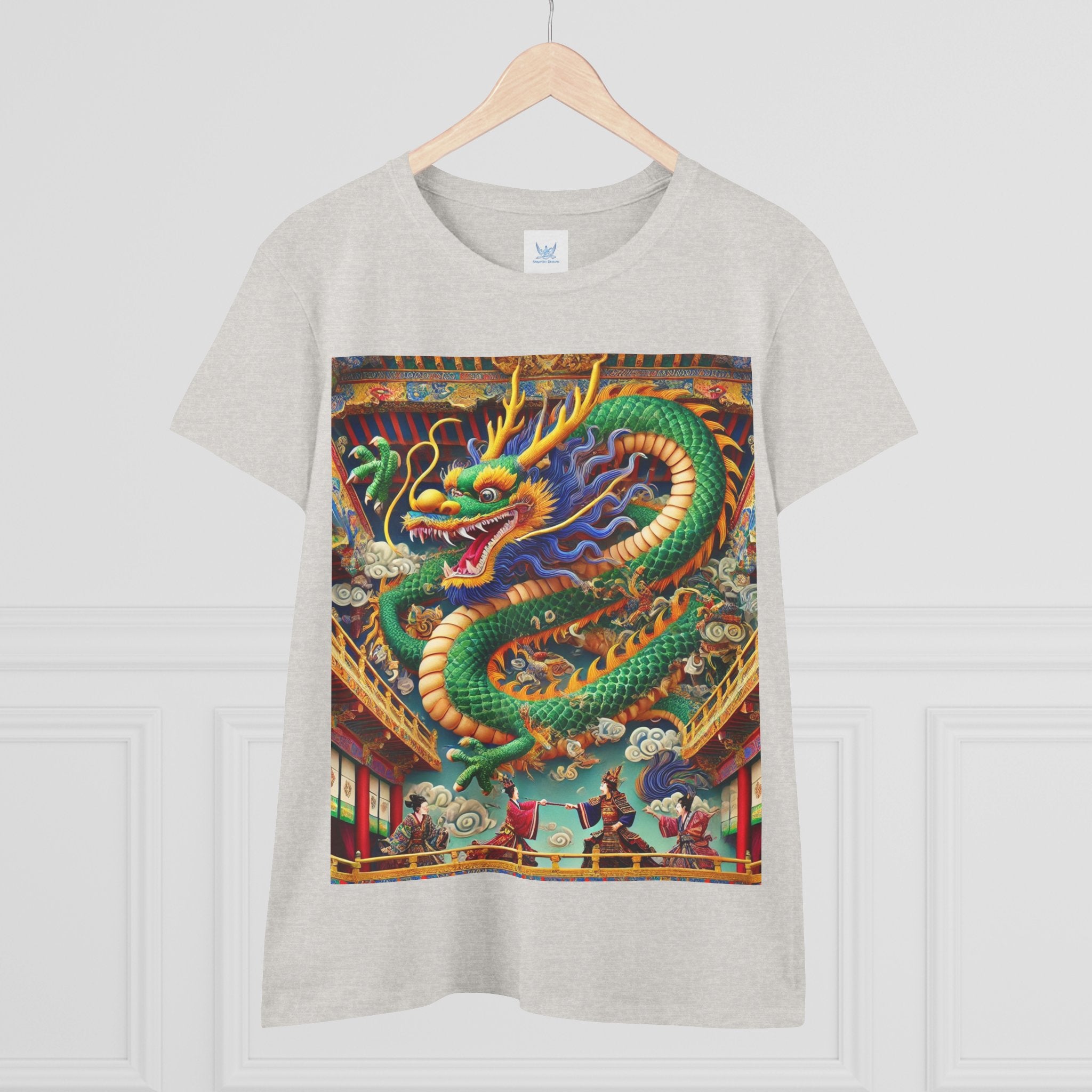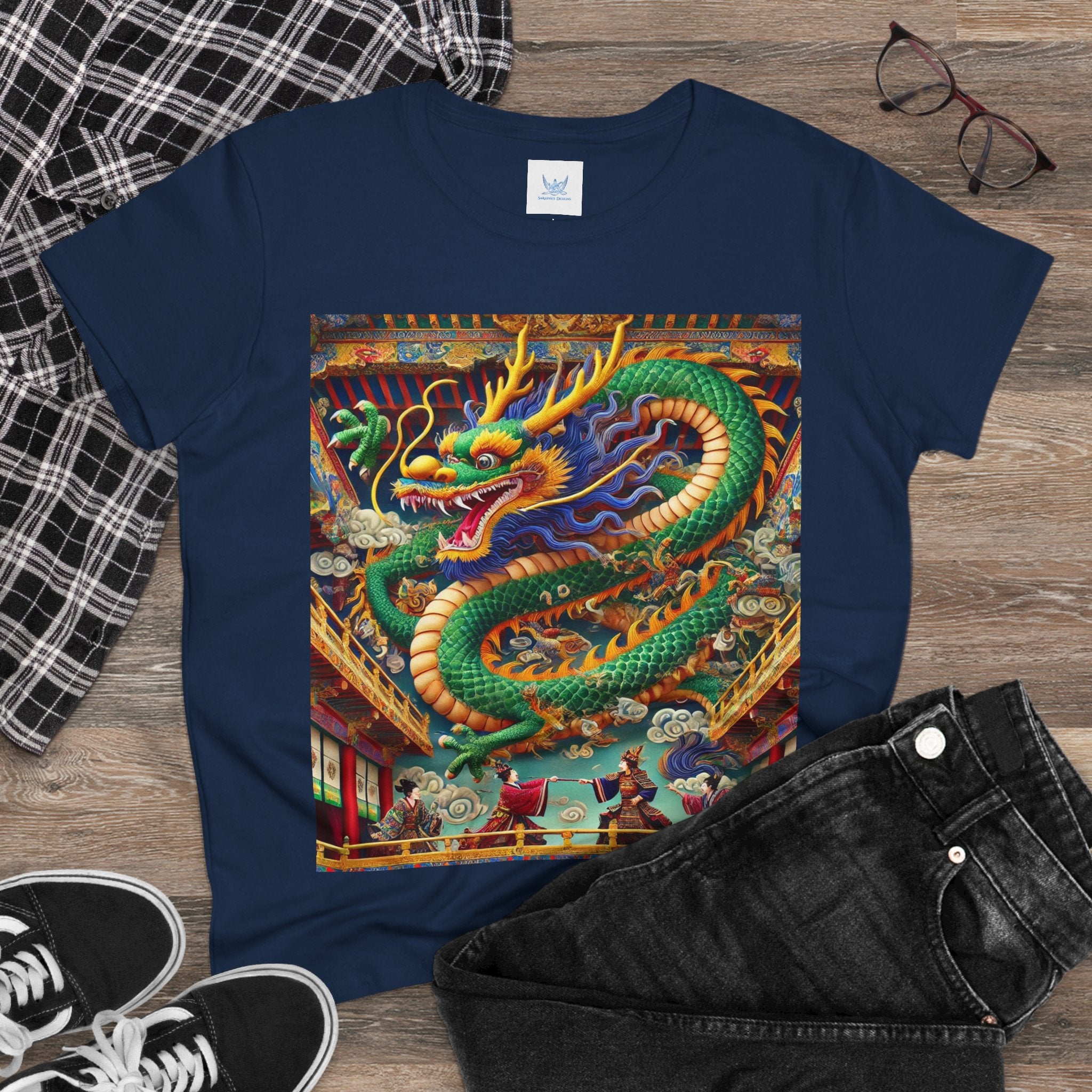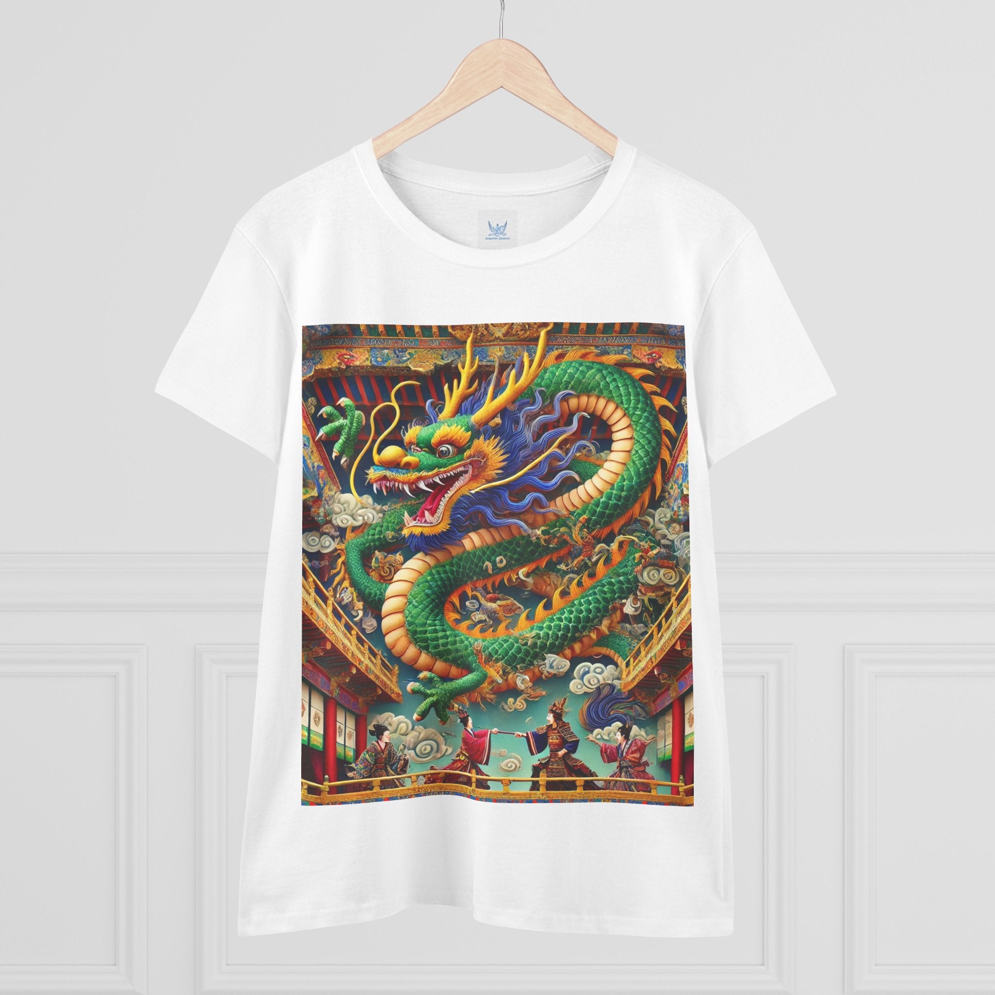 Add bold artistry to your wardrobe with a tee that feels as good as it looks. Crafted from 100% cotton, this semi-fitted silhouette is lightweight yet durable, pre-shrunk to hold its shape, and finished with cap sleeves plus a taped neck and shoulders for lasting comfort. Across the soft fabric, a striking design comes to life: a majestic Tibetan dragon with shimmering blue, green, and gold scales, poised above a grand theater balcony. Below, two Kabuki performers in ornate costumes duel on a richly detailed stage. With its clean lines, vibrant colors, and layered depth, the artwork blends Tibetan mysticism, Kabuki drama, and Western theatrical flair—making this tee more than clothing, but a wearable work of art.