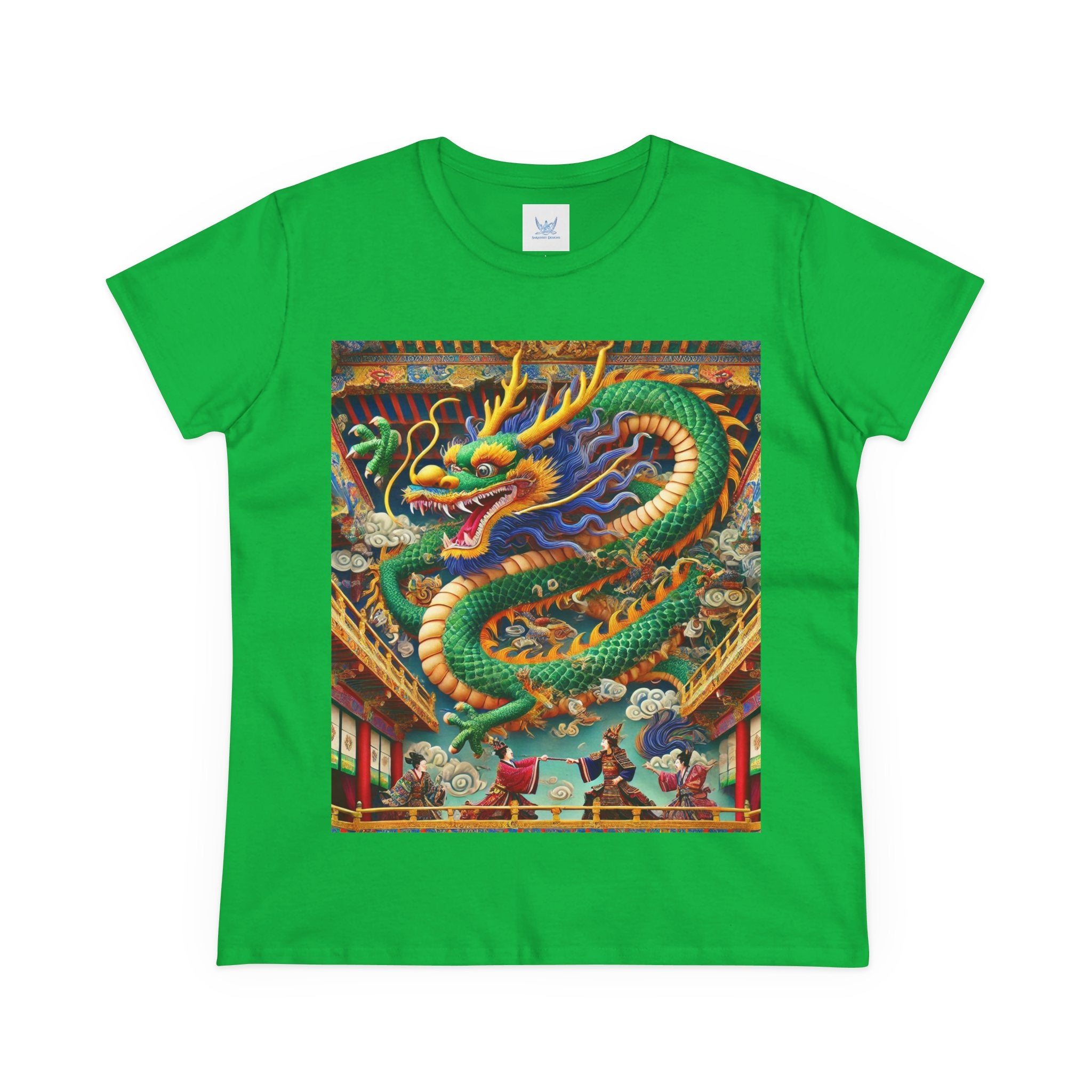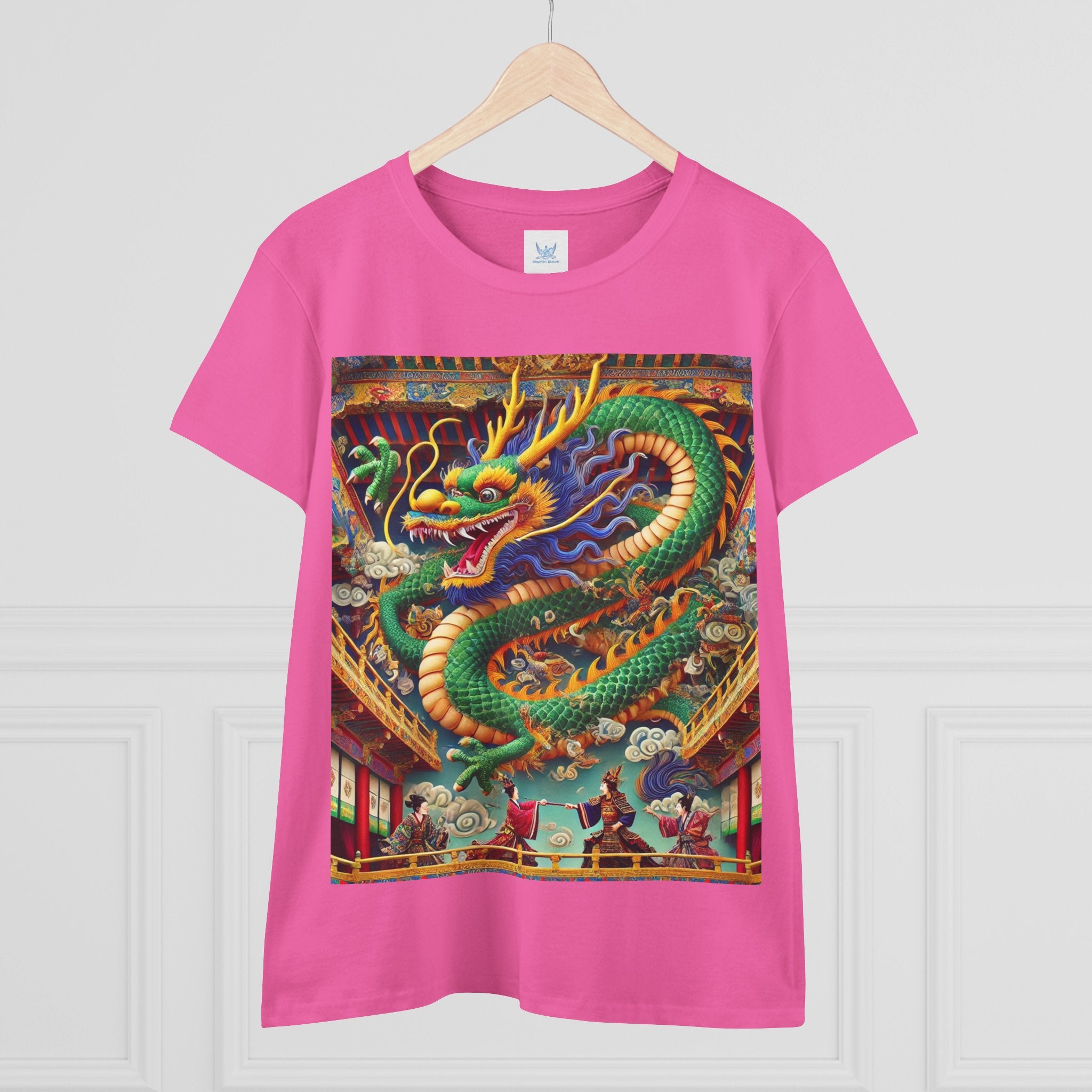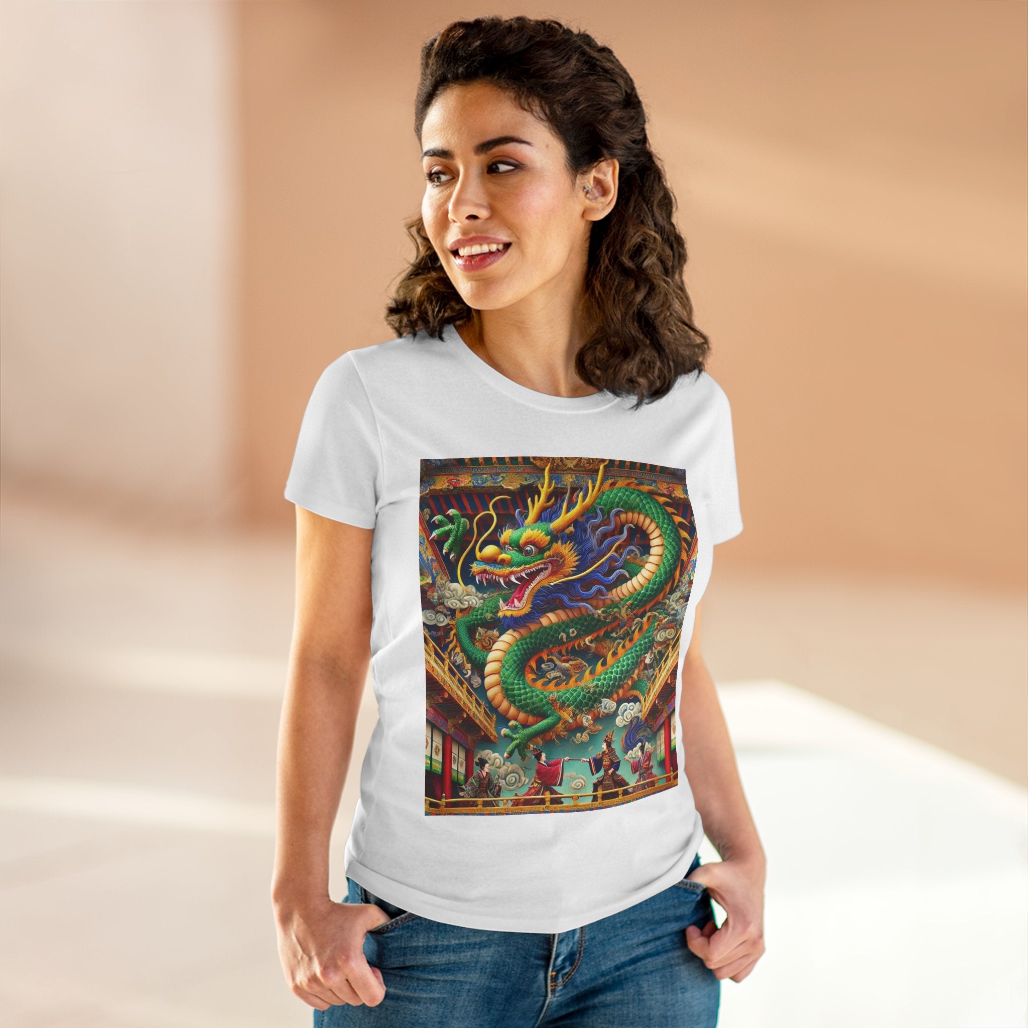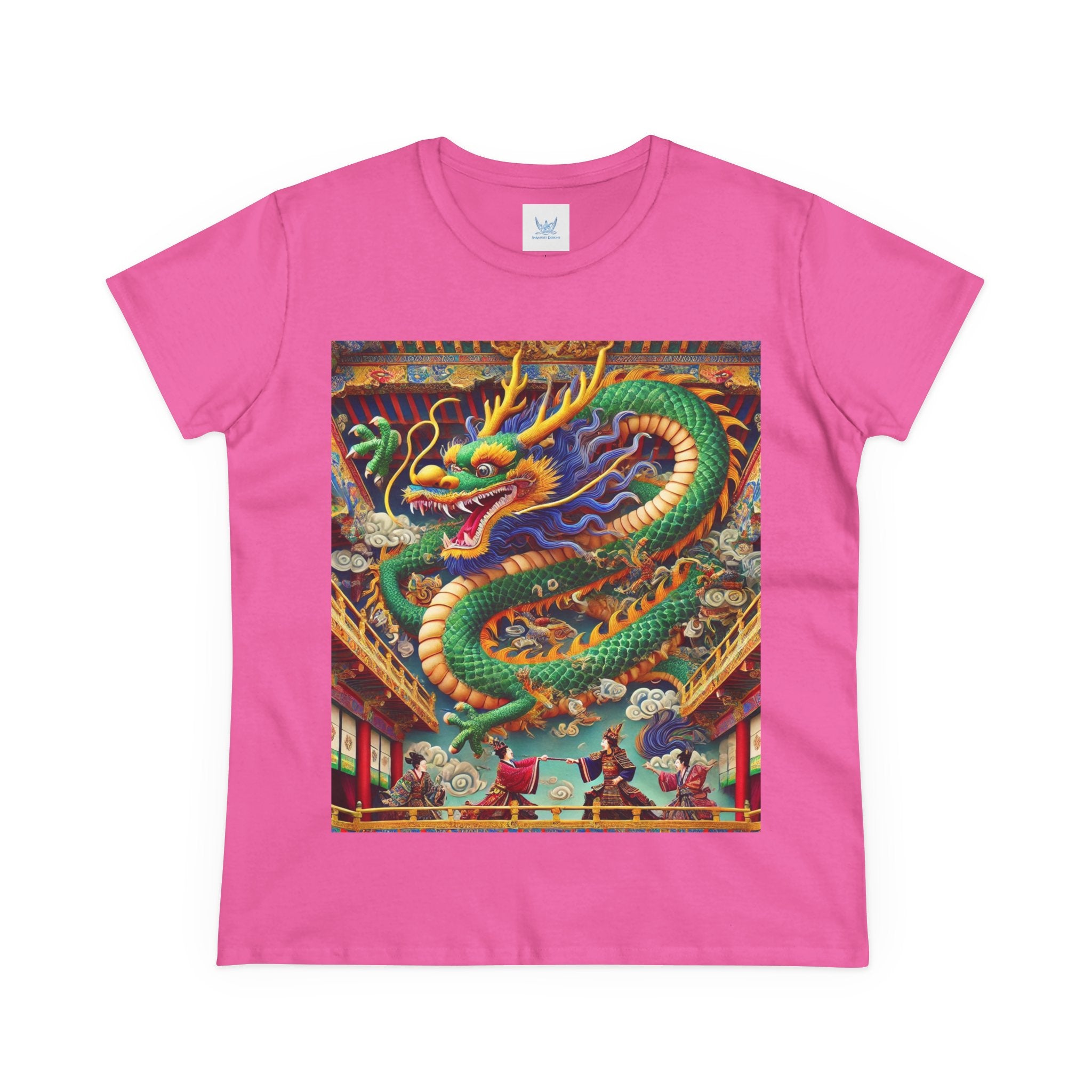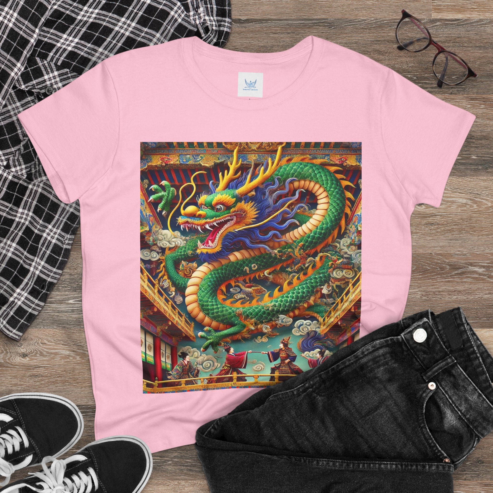 Add bold artistry to your wardrobe with a tee that feels as good as it looks. Crafted from 100% cotton, this semi-fitted silhouette is lightweight yet durable, pre-shrunk to hold its shape, and finished with cap sleeves plus a taped neck and shoulders for lasting comfort. Across the soft fabric, a striking design comes to life: a majestic Tibetan dragon with shimmering blue, green, and gold scales, poised above a grand theater balcony. Below, two Kabuki performers in ornate costumes duel on a richly detailed stage. With its clean lines, vibrant colors, and layered depth, the artwork blends Tibetan mysticism, Kabuki drama, and Western theatrical flair—making this tee more than clothing, but a wearable work of art.