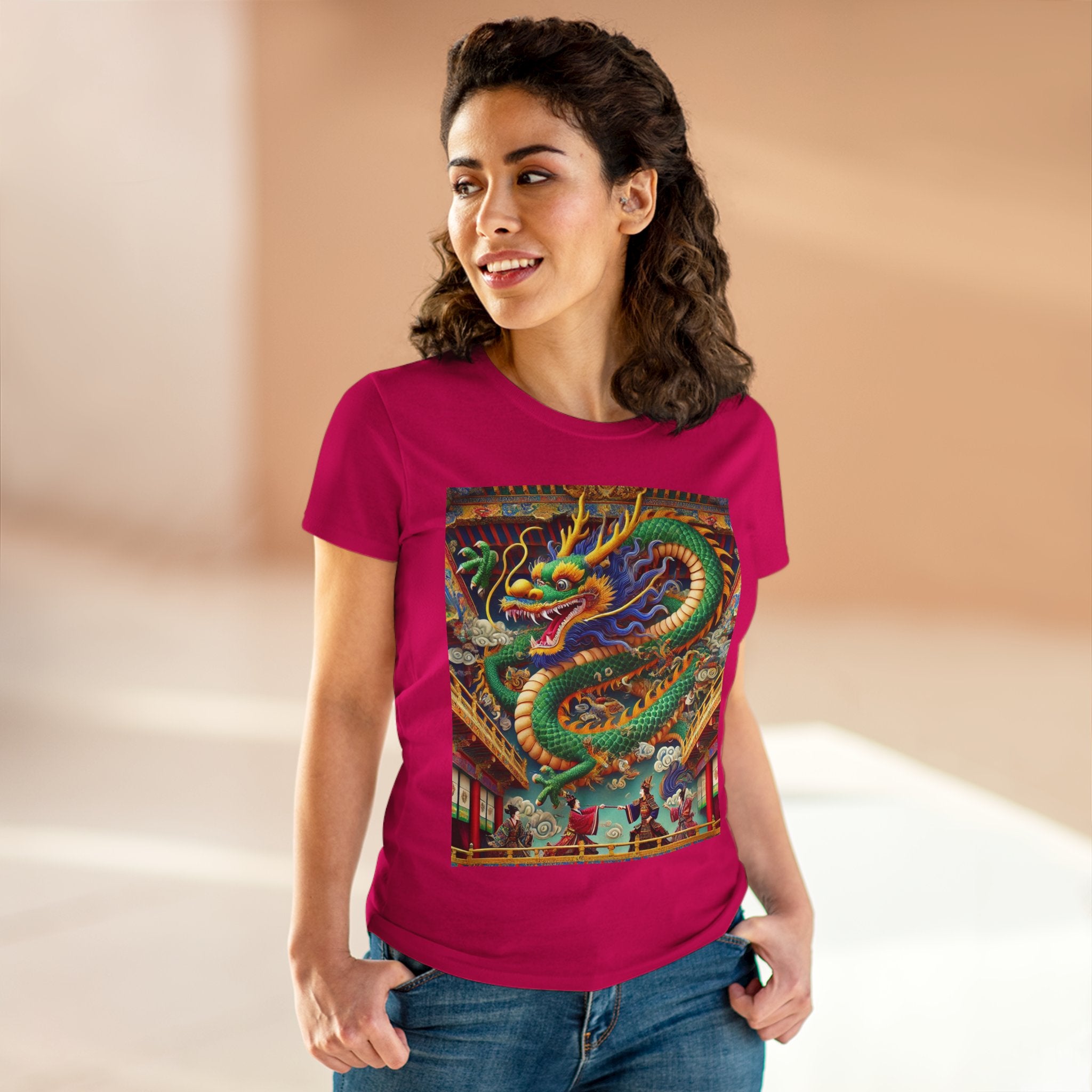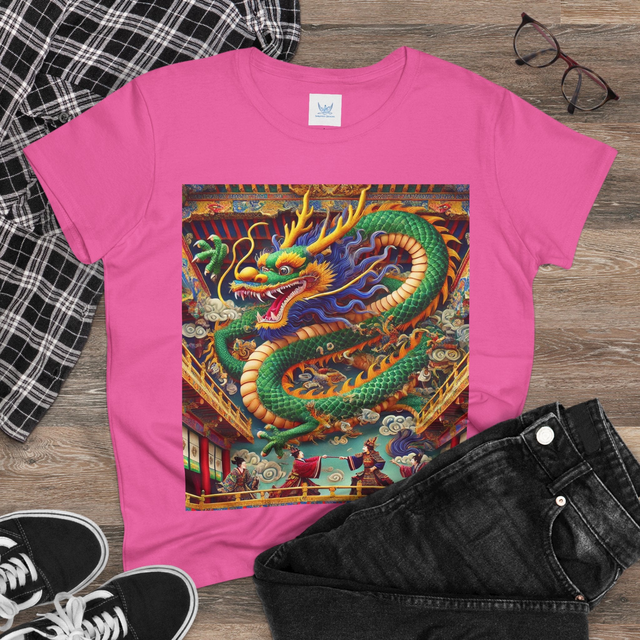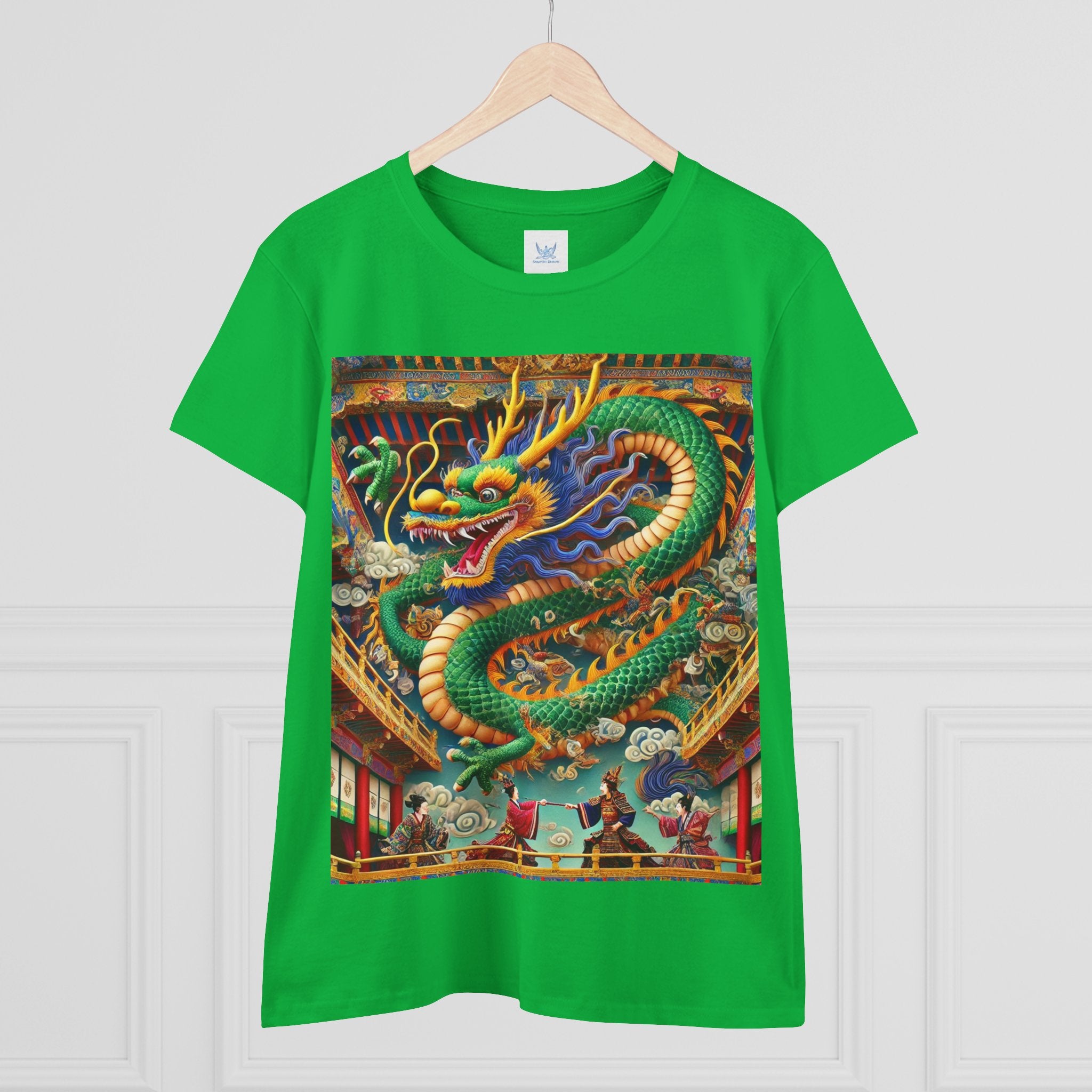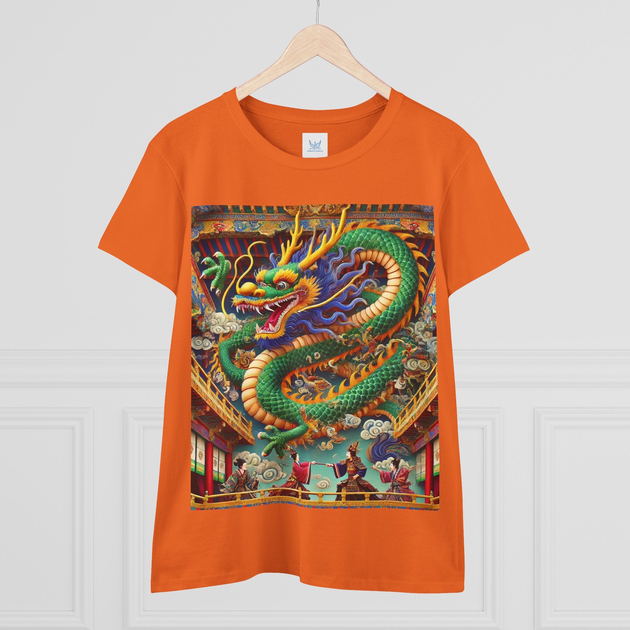 Add bold artistry to your wardrobe with a tee that feels as good as it looks. Crafted from 100% cotton, this semi-fitted silhouette is lightweight yet durable, pre-shrunk to hold its shape, and finished with cap sleeves plus a taped neck and shoulders for lasting comfort. Across the soft fabric, a striking design comes to life: a majestic Tibetan dragon with shimmering blue, green, and gold scales, poised above a grand theater balcony. Below, two Kabuki performers in ornate costumes duel on a richly detailed stage. With its clean lines, vibrant colors, and layered depth, the artwork blends Tibetan mysticism, Kabuki drama, and Western theatrical flair—making this tee more than clothing, but a wearable work of art.