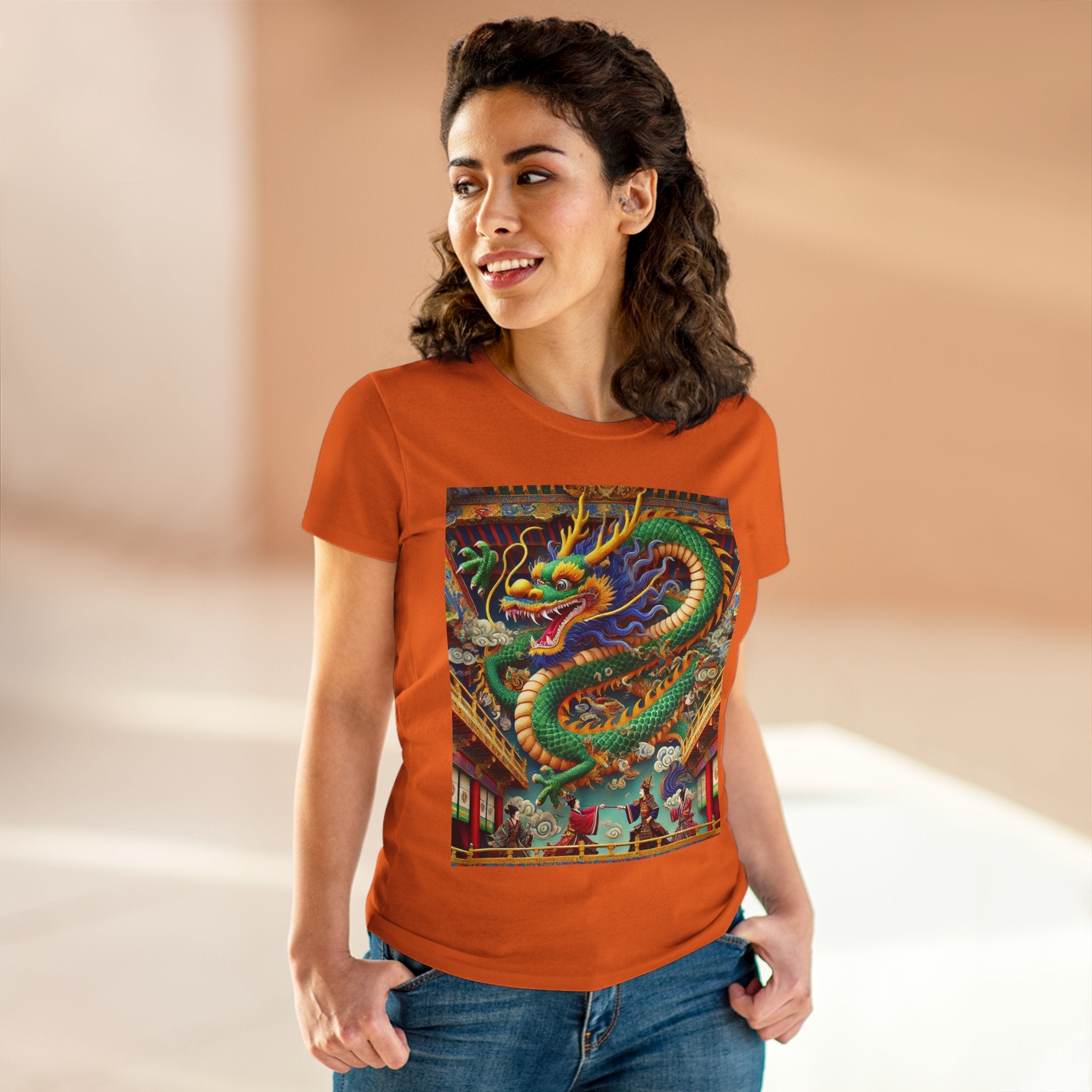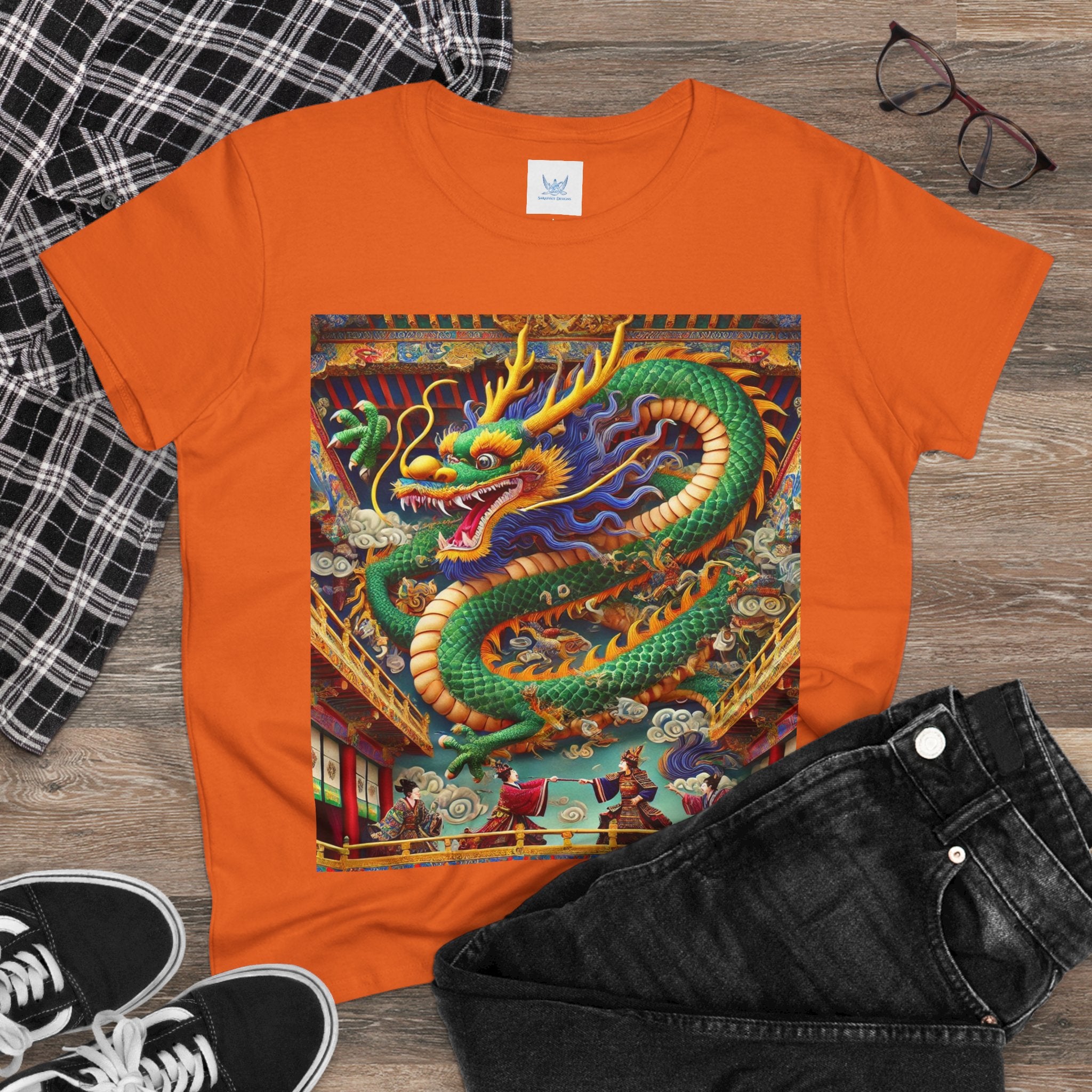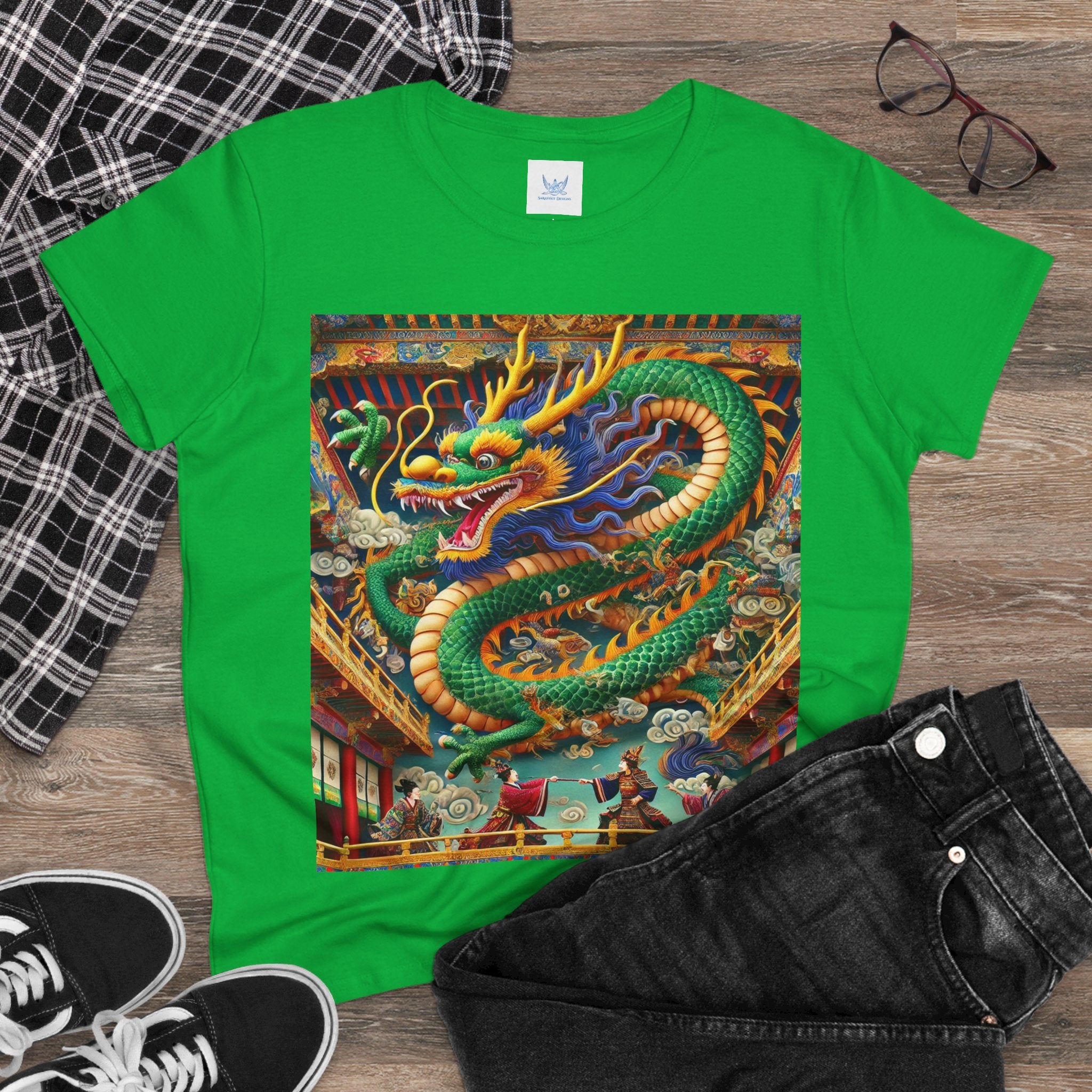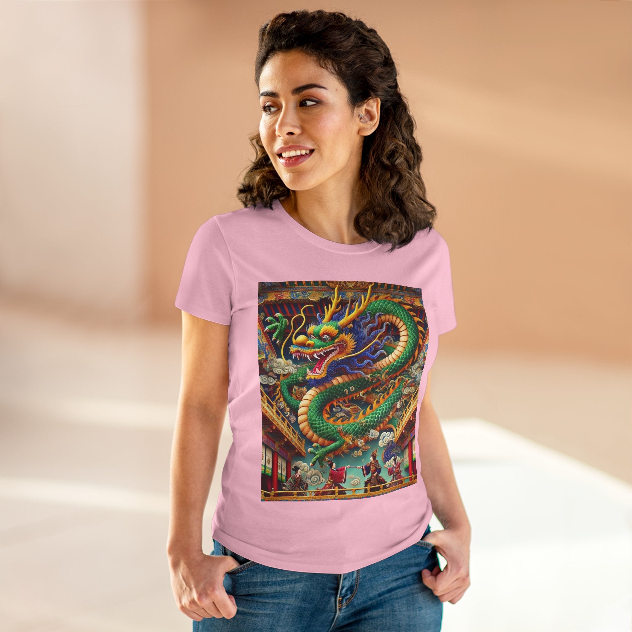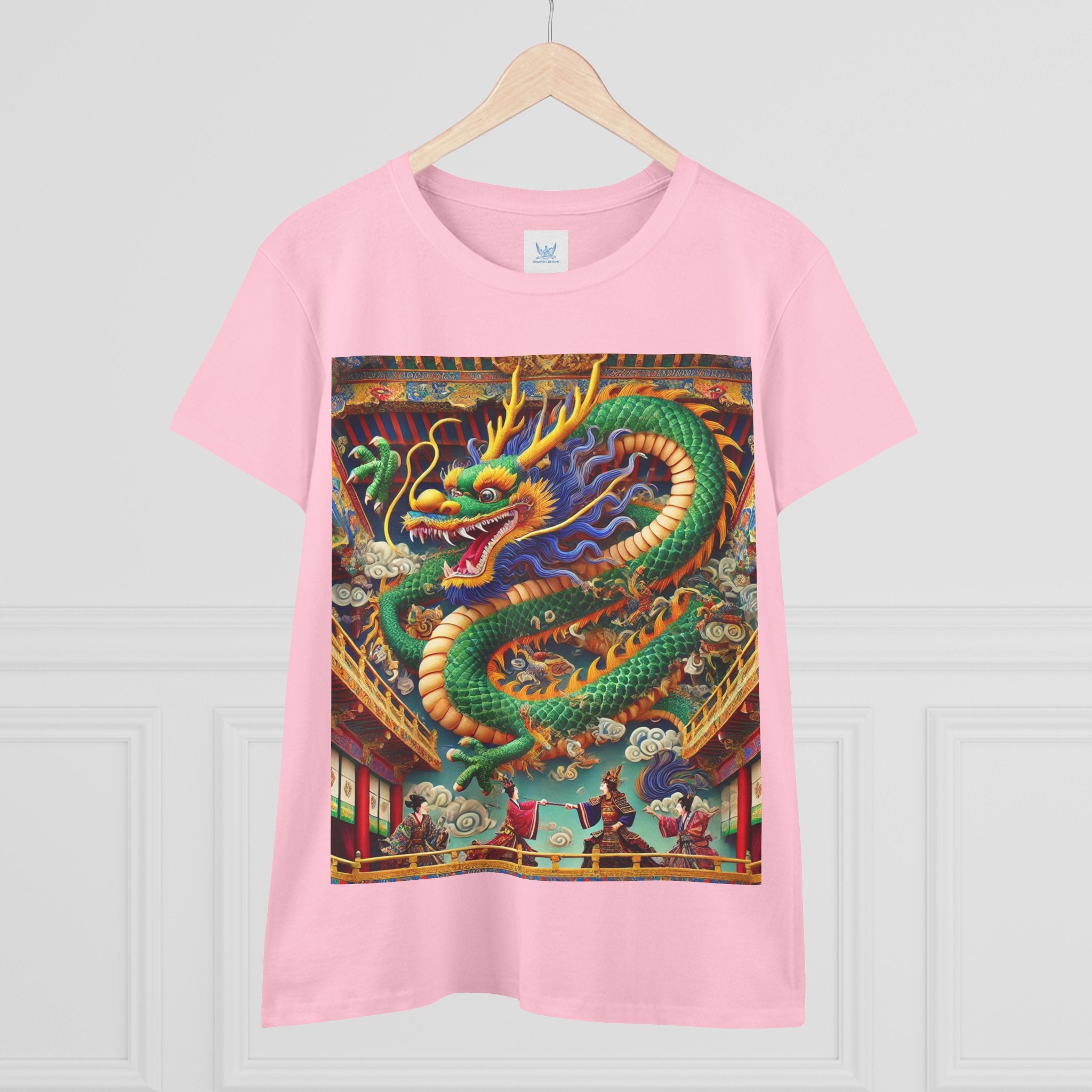 Add bold artistry to your wardrobe with a tee that feels as good as it looks. Crafted from 100% cotton, this semi-fitted silhouette is lightweight yet durable, pre-shrunk to hold its shape, and finished with cap sleeves plus a taped neck and shoulders for lasting comfort. Across the soft fabric, a striking design comes to life: a majestic Tibetan dragon with shimmering blue, green, and gold scales, poised above a grand theater balcony. Below, two Kabuki performers in ornate costumes duel on a richly detailed stage. With its clean lines, vibrant colors, and layered depth, the artwork blends Tibetan mysticism, Kabuki drama, and Western theatrical flair—making this tee more than clothing, but a wearable work of art.