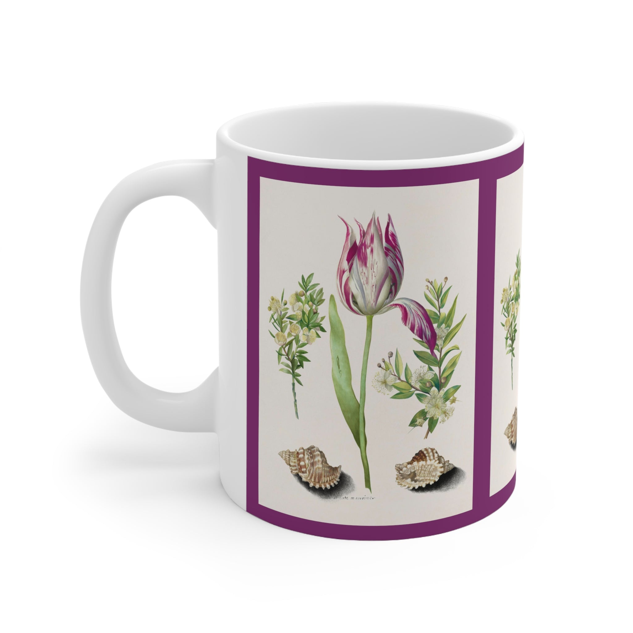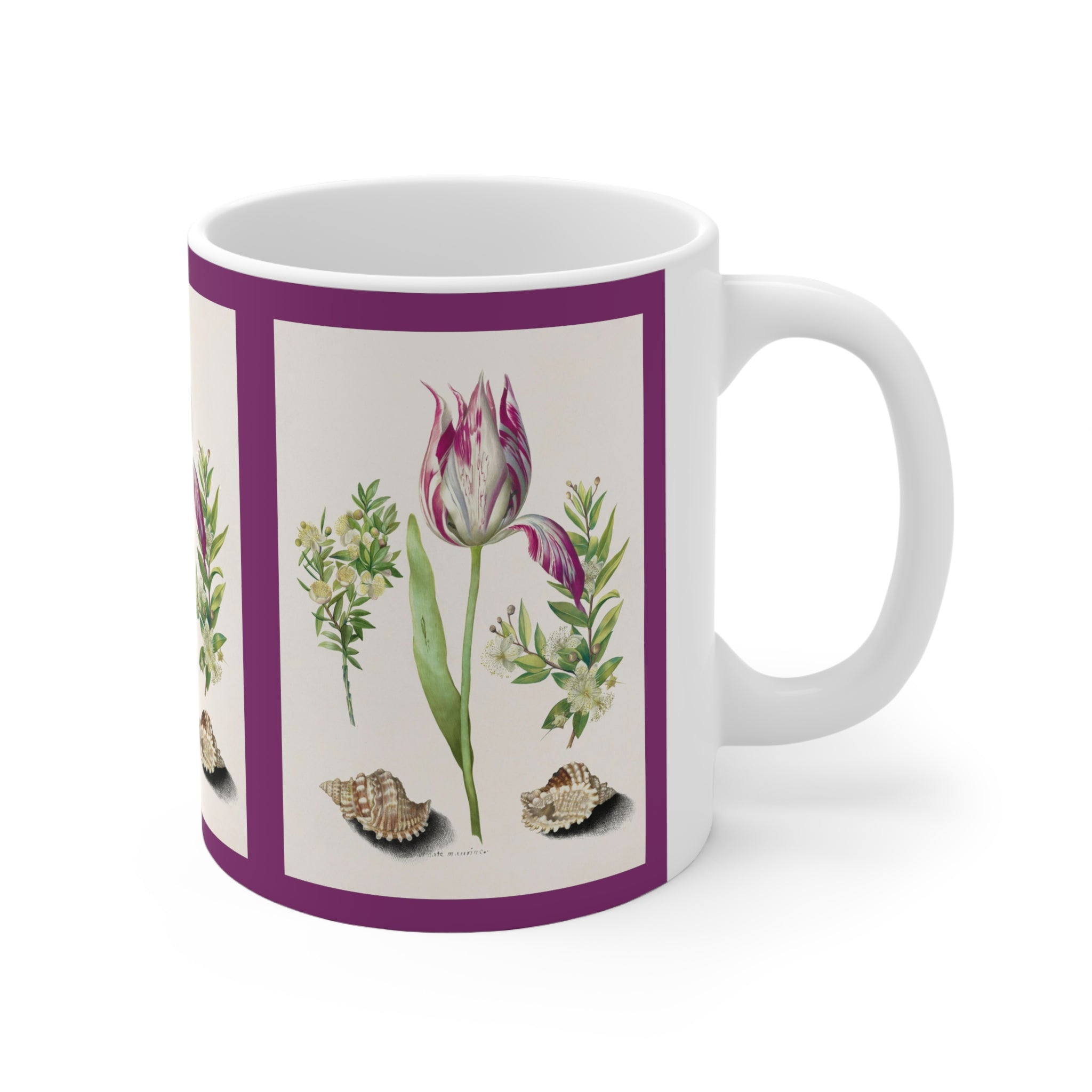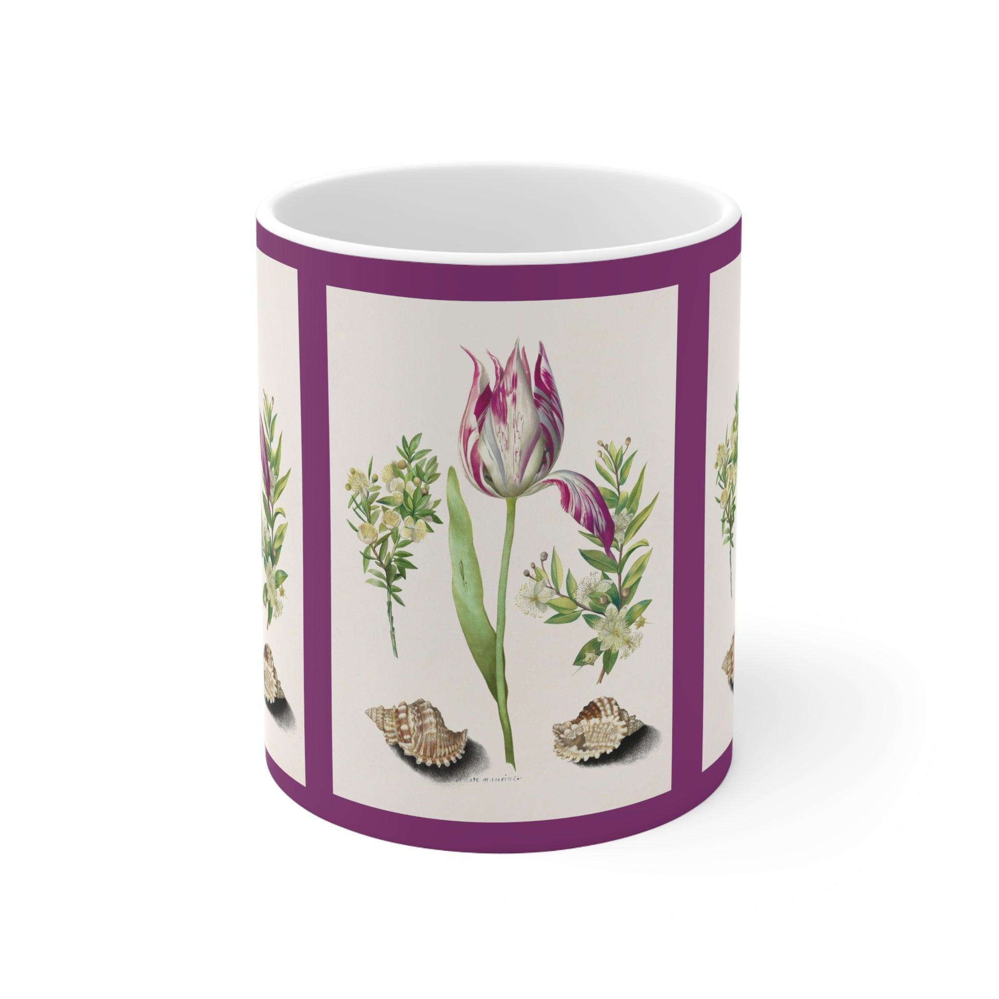 Artwork designed and digitally remastered by Sarasvati Designs. Tulip, two Branches of Myrtle and two Shells is a watercolor painting by German naturalist and artist Maria Sibylla Merian. It was painted in 1700 and is part of a series of botanical illustrations known as Metamorphosis Insectorum Surinamensium. The painting depicts a tulip, two branches of myrtle, and two shells arranged in a symmetrical composition. Merian was a pioneer in the field of botanical illustration known for her vibrant and realistic colors.