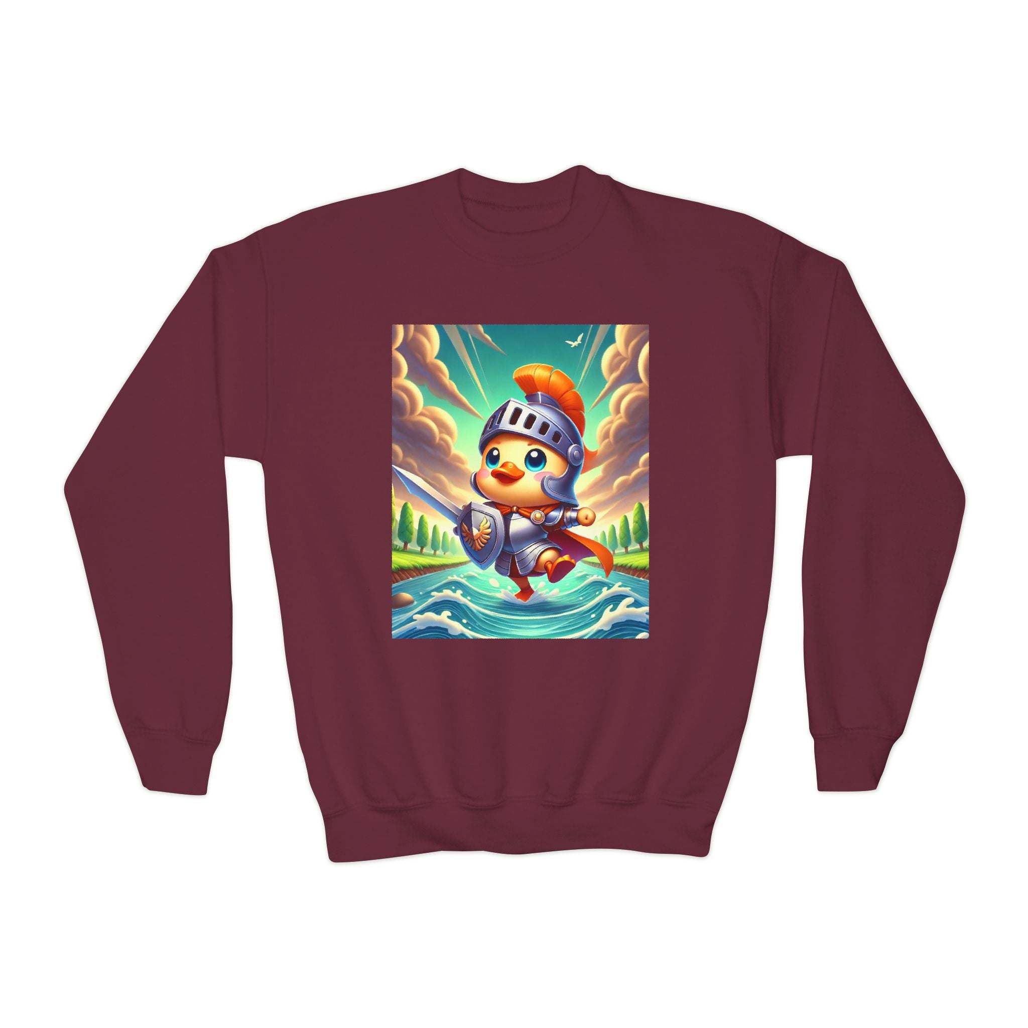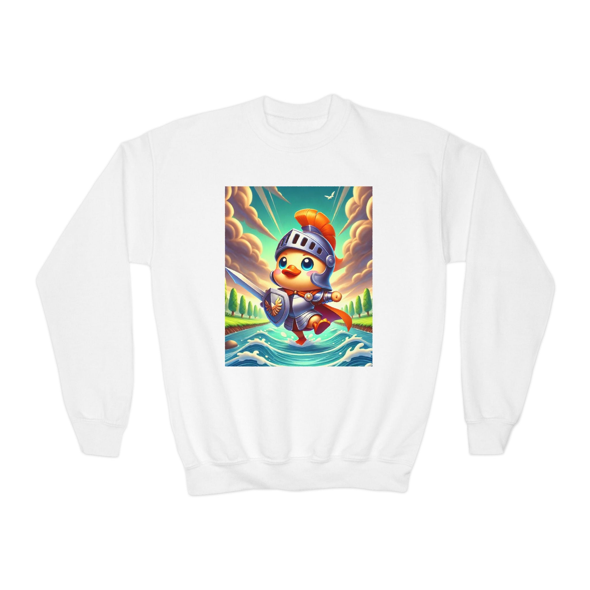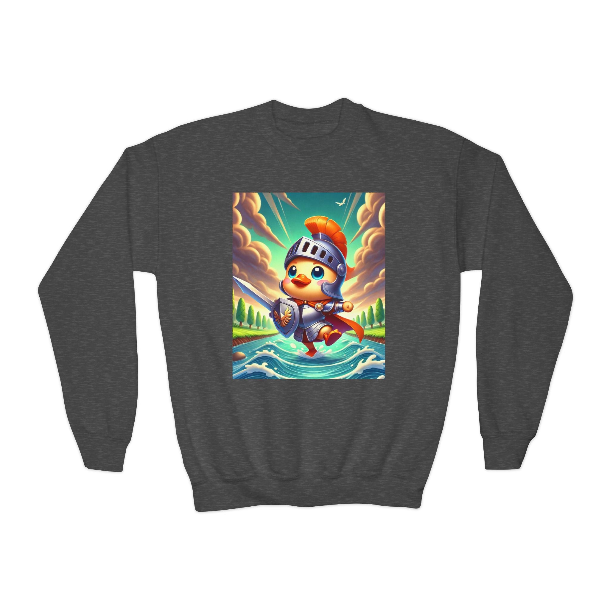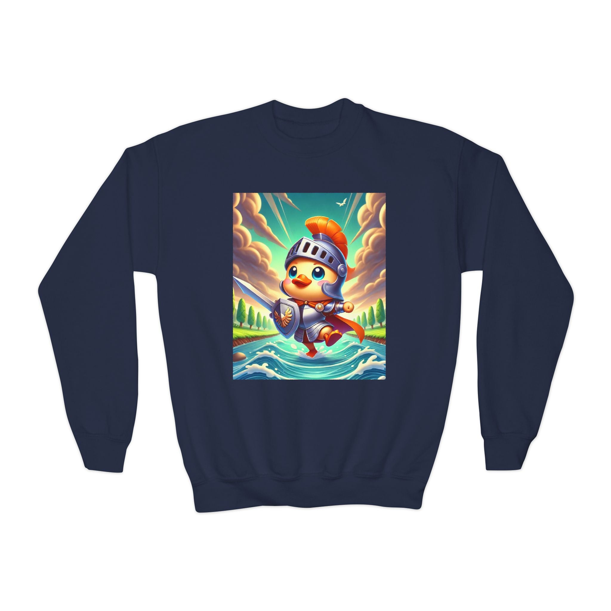 Featuring a whimsical illustration of a valiant duck clad in gleaming armor, this design captures the spirit of courage and adventure. The brave duck leads a charge across a rushing river toward unseen foes, feathers glinting under a radiant sky. With splashes of color and a sense of heroic fun, this sweatshirt celebrates imagination, bravery, and the joy of storytelling—perfect for young adventurers and dreamers alike.