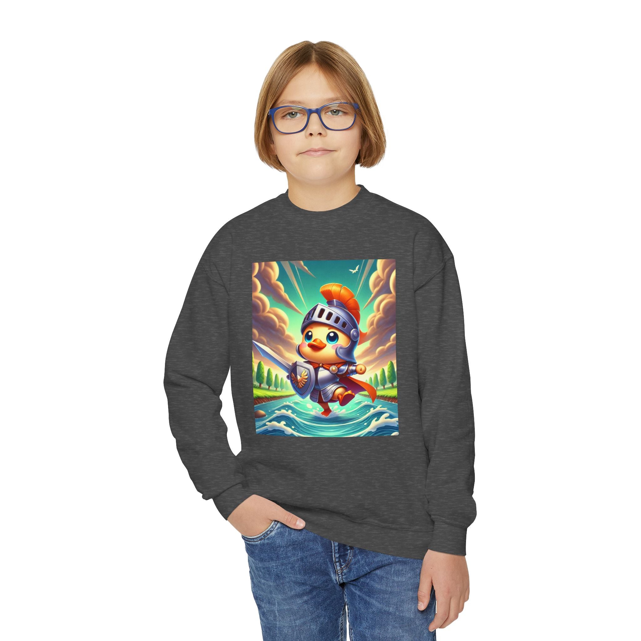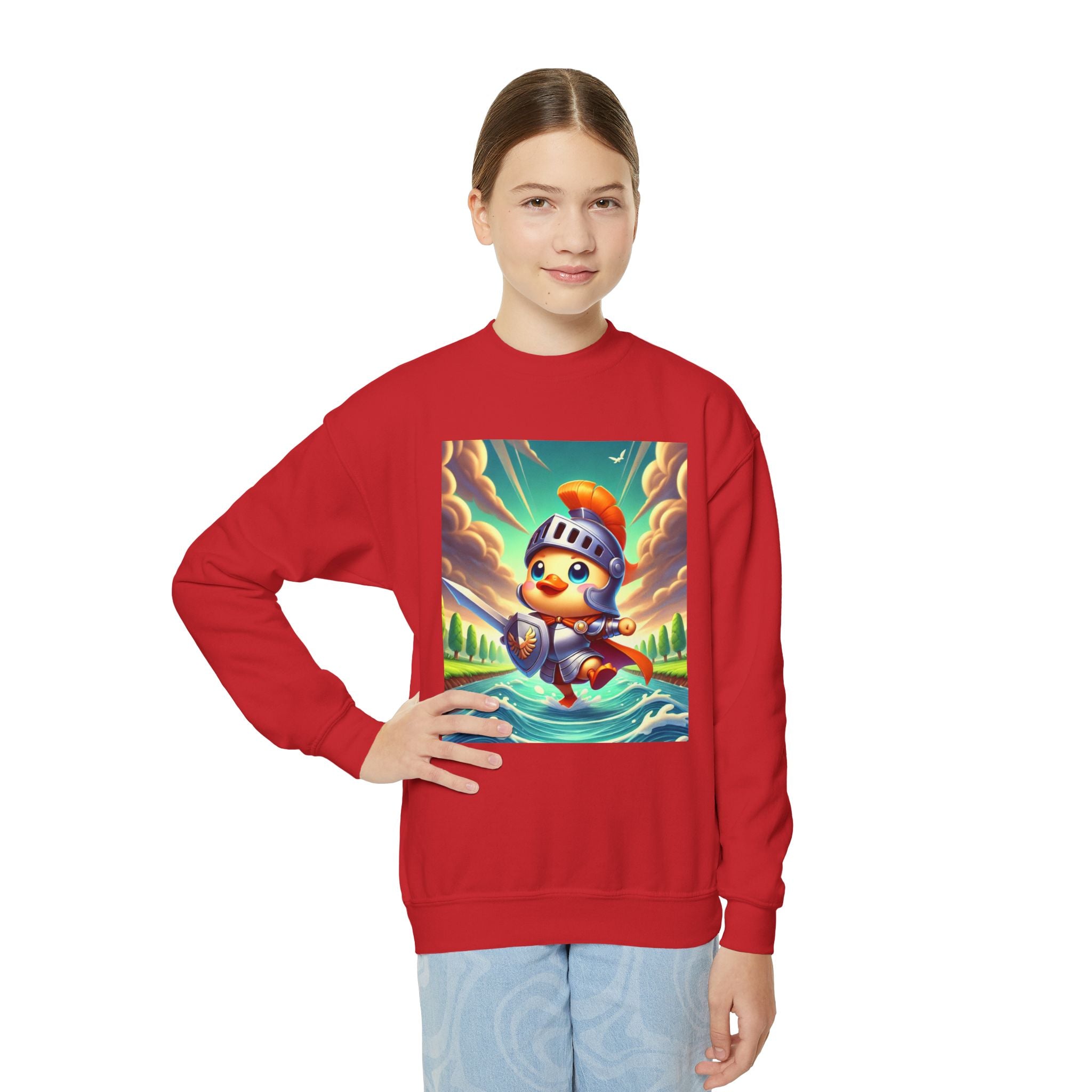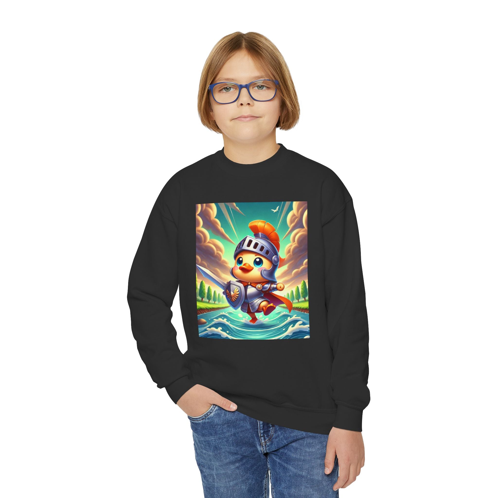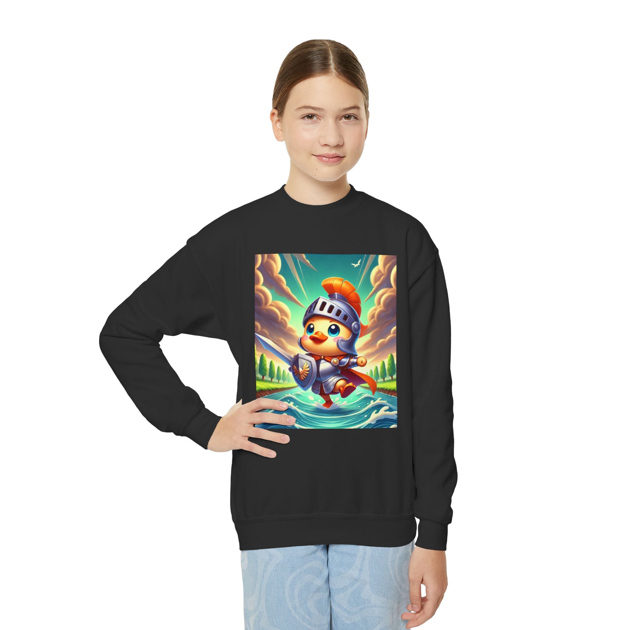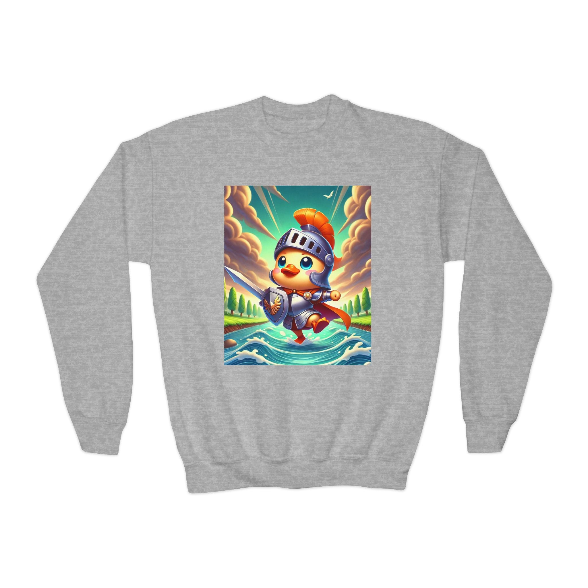 Featuring a whimsical illustration of a valiant duck clad in gleaming armor, this design captures the spirit of courage and adventure. The brave duck leads a charge across a rushing river toward unseen foes, feathers glinting under a radiant sky. With splashes of color and a sense of heroic fun, this sweatshirt celebrates imagination, bravery, and the joy of storytelling—perfect for young adventurers and dreamers alike.