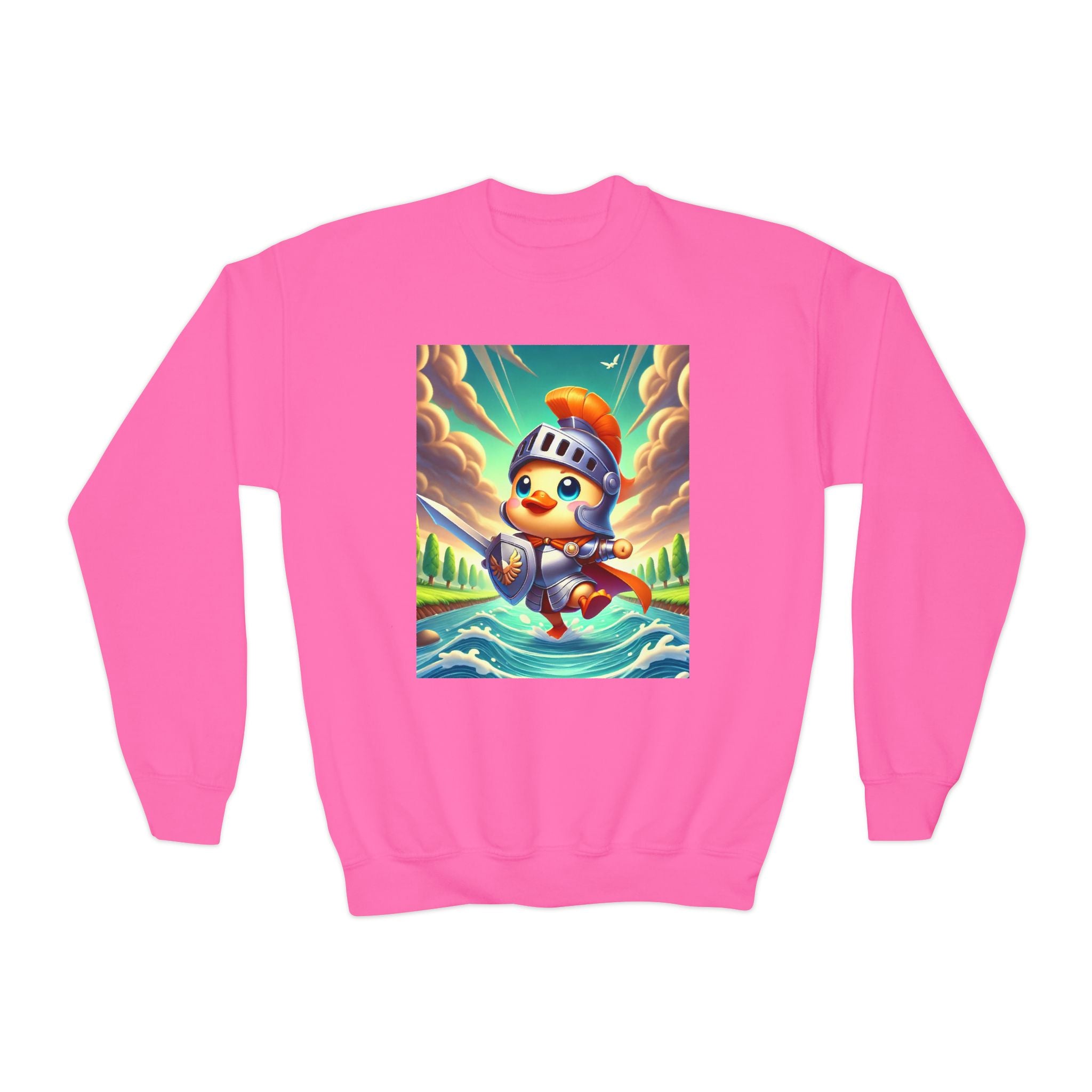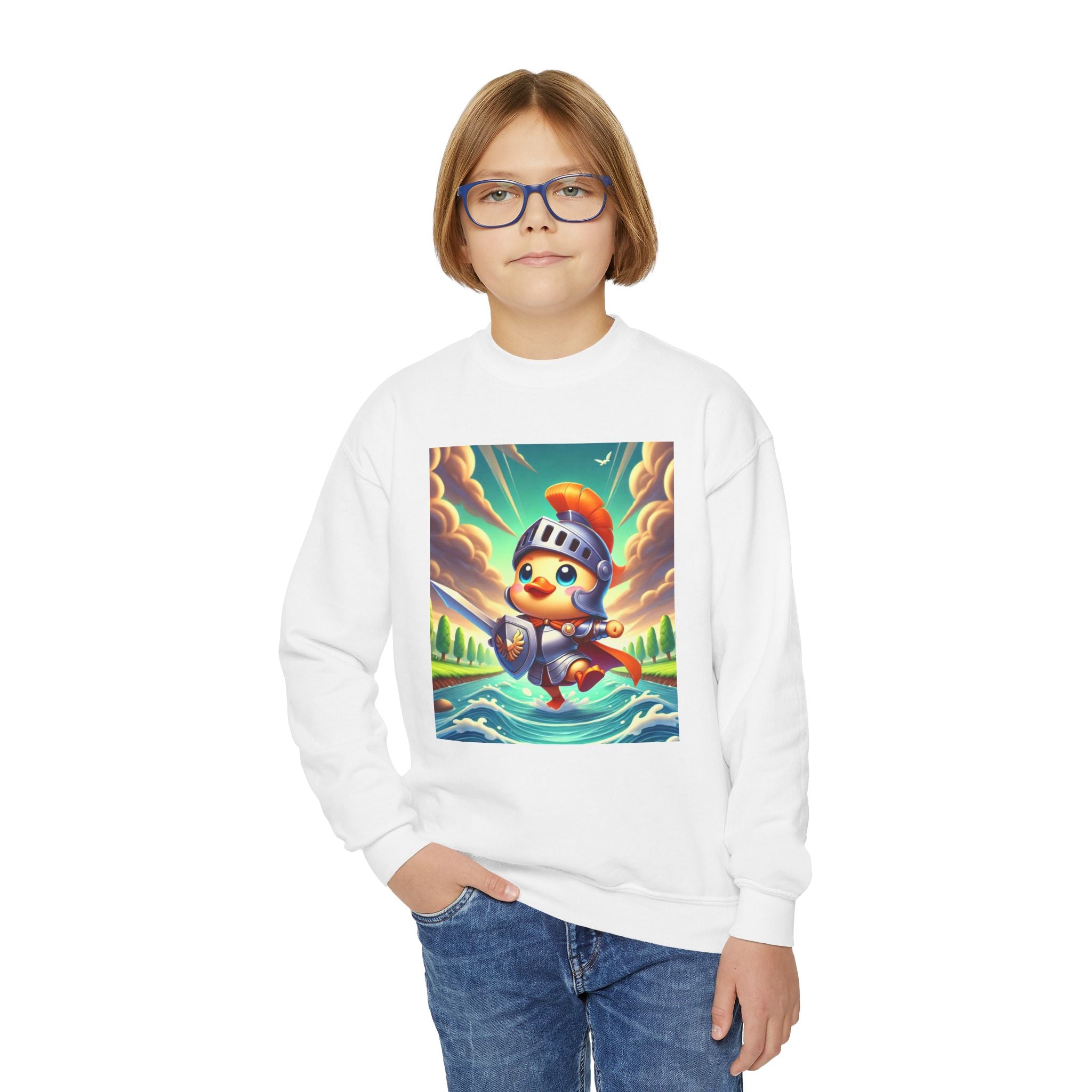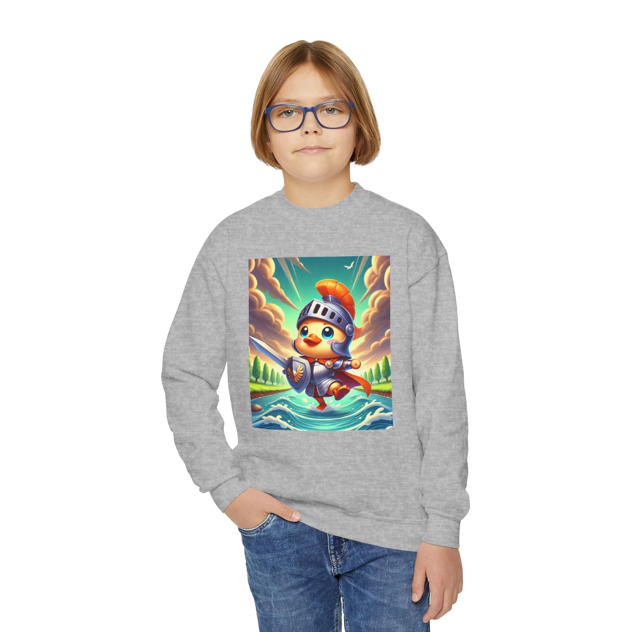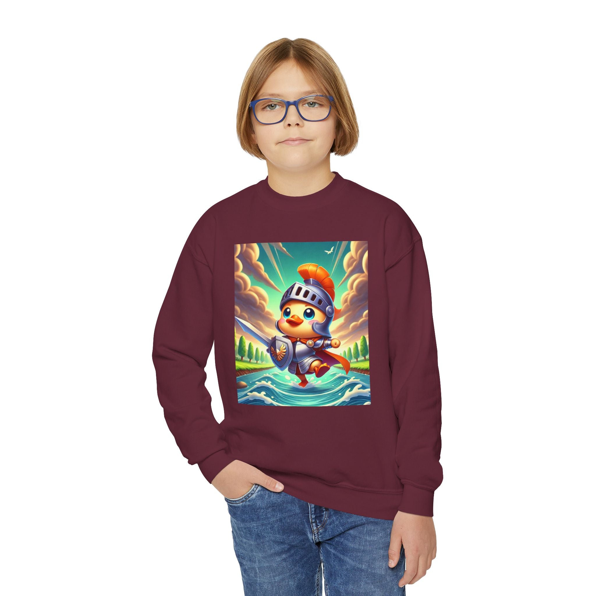 Featuring a whimsical illustration of a valiant duck clad in gleaming armor, this design captures the spirit of courage and adventure. The brave duck leads a charge across a rushing river toward unseen foes, feathers glinting under a radiant sky. With splashes of color and a sense of heroic fun, this sweatshirt celebrates imagination, bravery, and the joy of storytelling—perfect for young adventurers and dreamers alike.