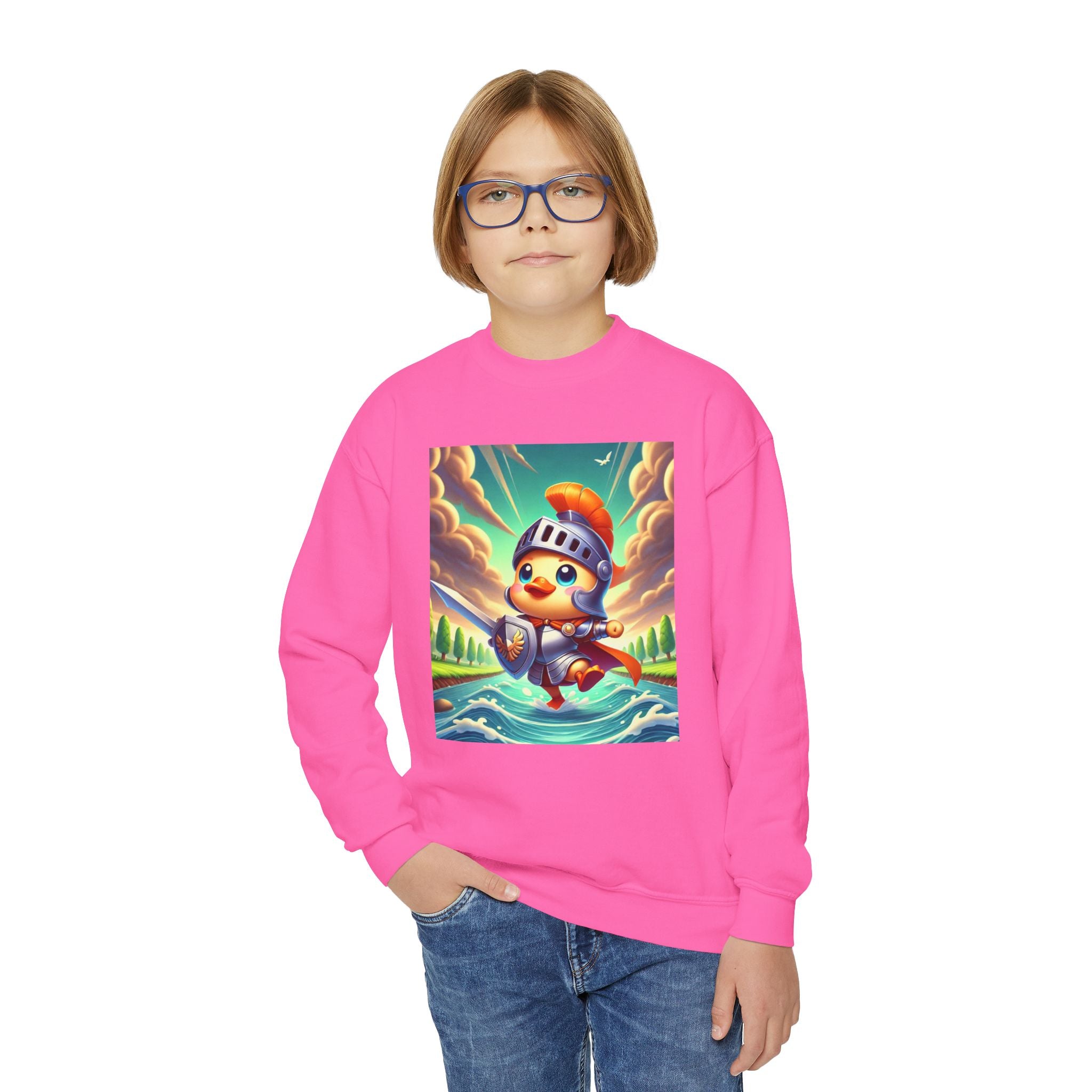 Valiant Duck Youth Crewneck Sweatshirt brings playful courage and cozy comfort together in one imaginative design. Made from a perfectly balanced blend of 50% cotton and 50% polyester, this Gildan 18000B sweatshirt is ideal for school, sports, or relaxing at home. The medium-heavy fabric provides lasting warmth and softness, while the loose fit ensures easy movement and everyday comfort. Please note: due to the fabric properties, the White color variant may appear slightly off-white.