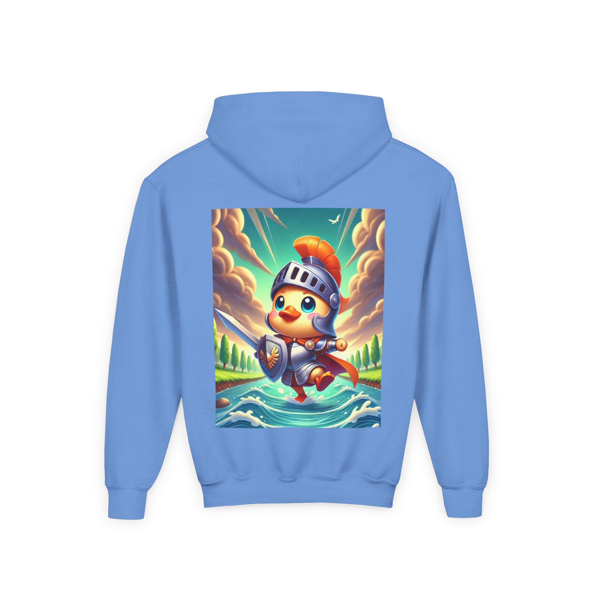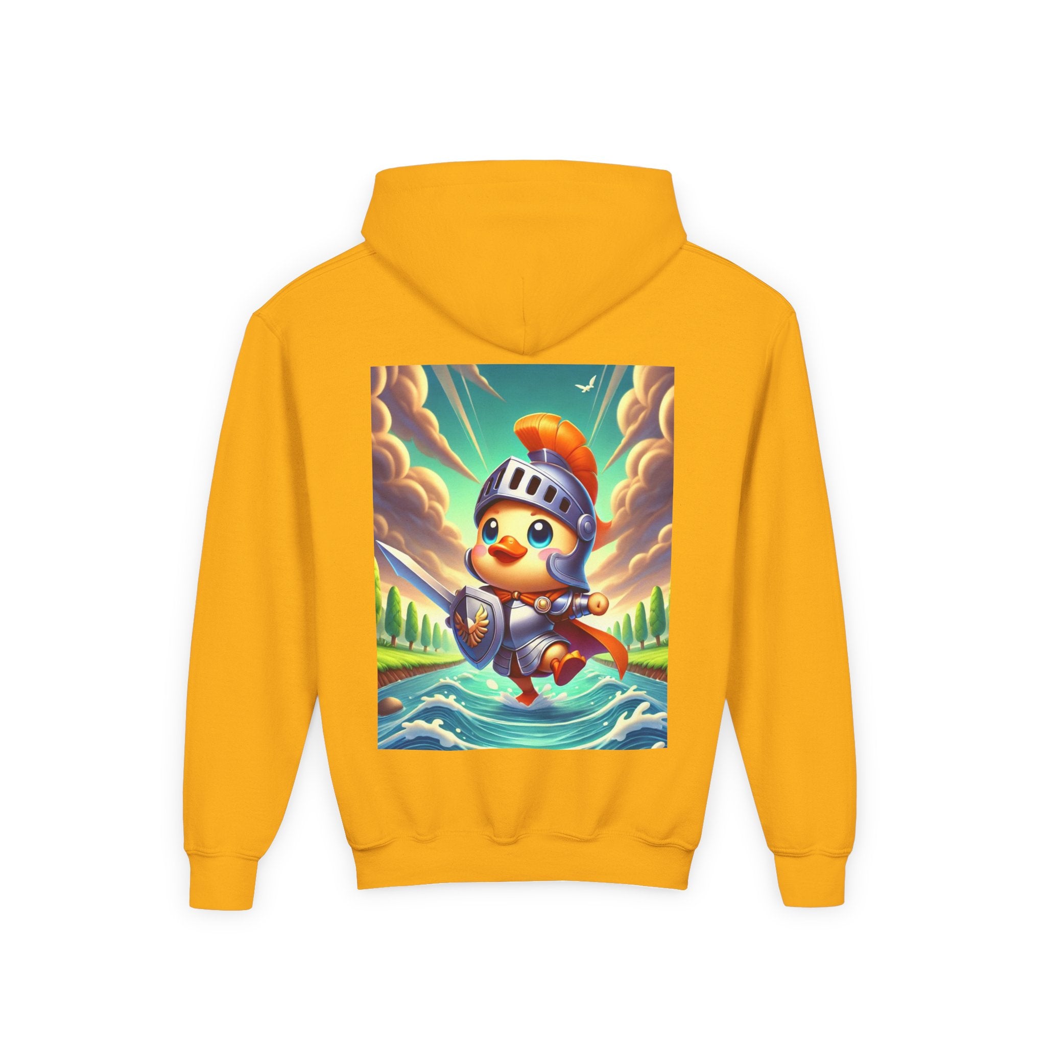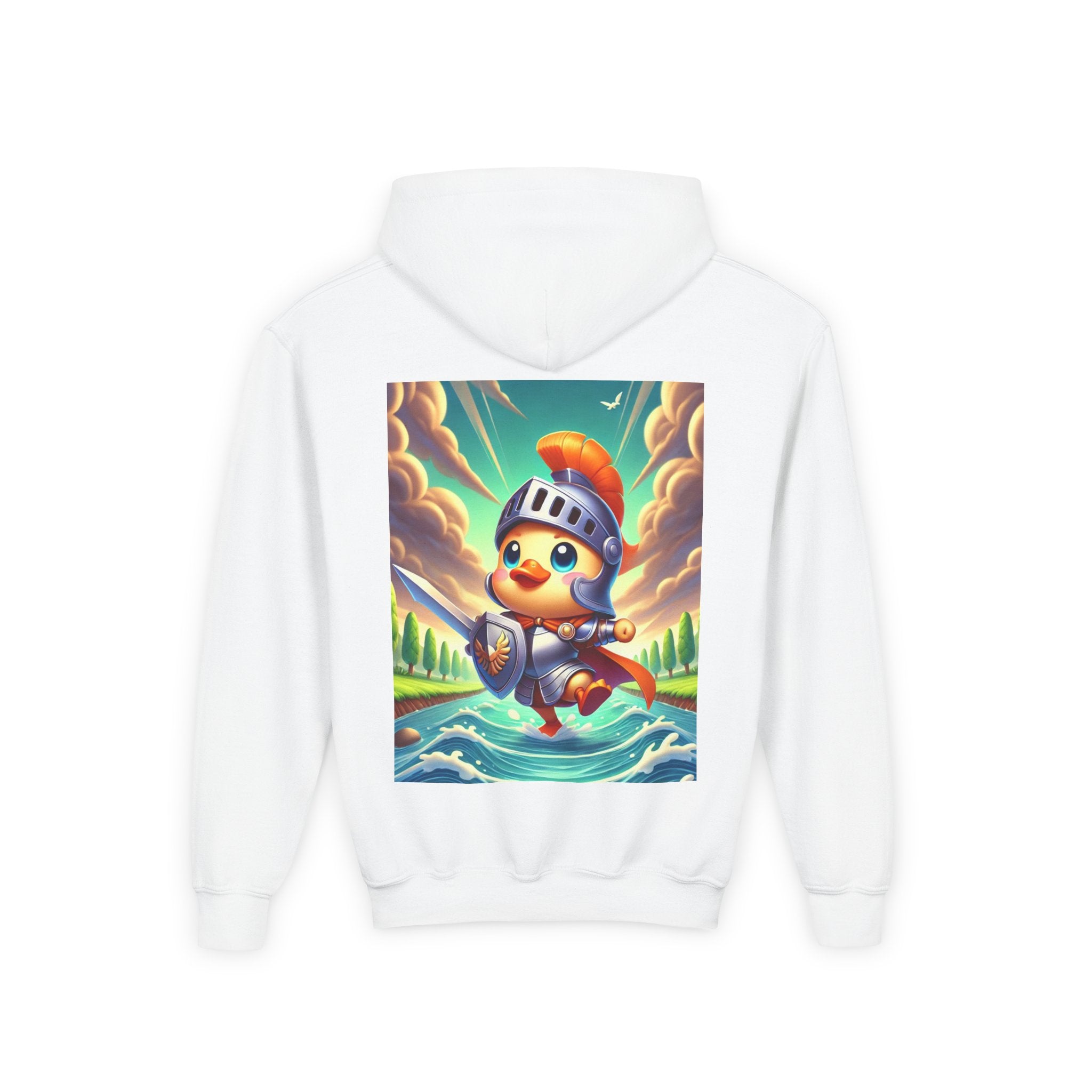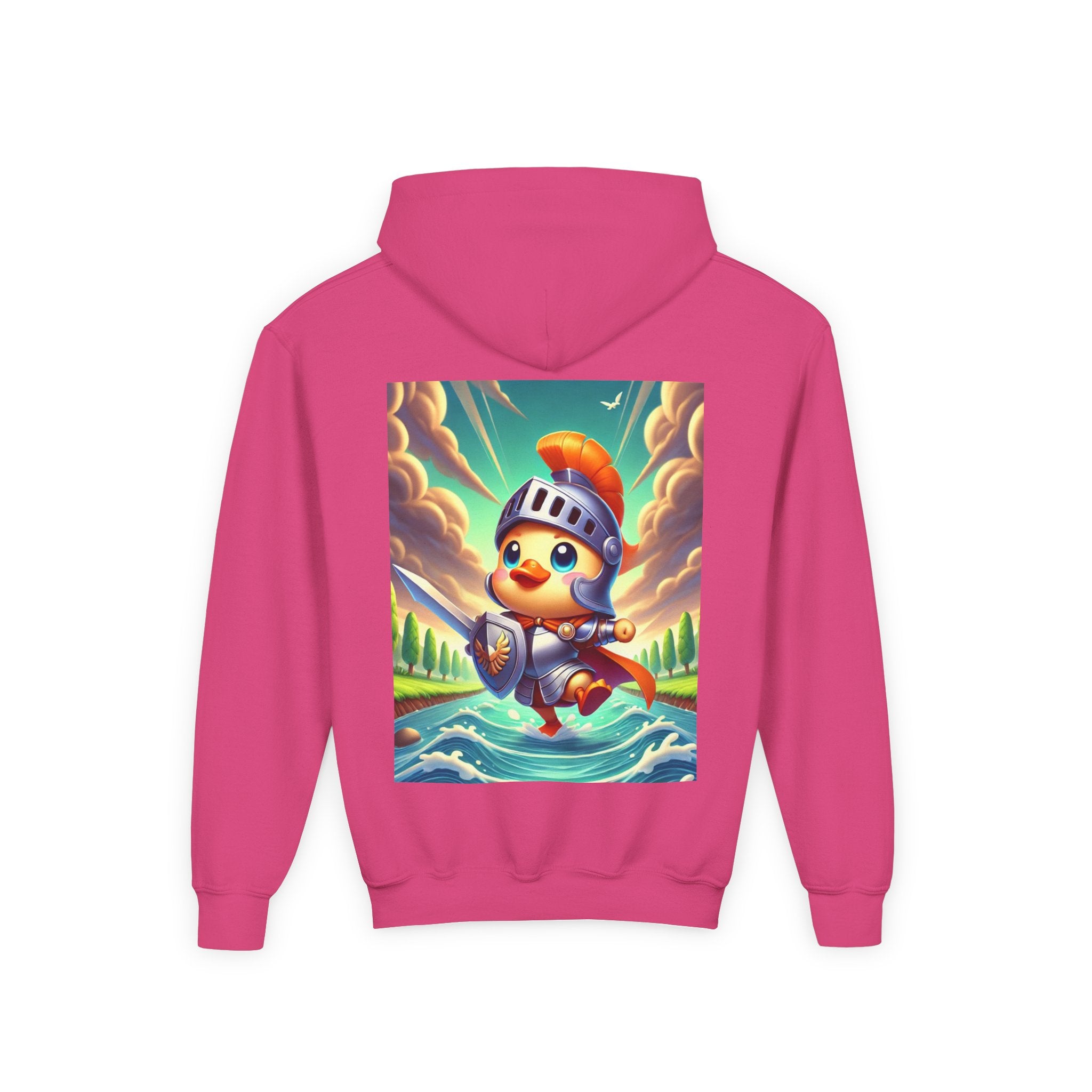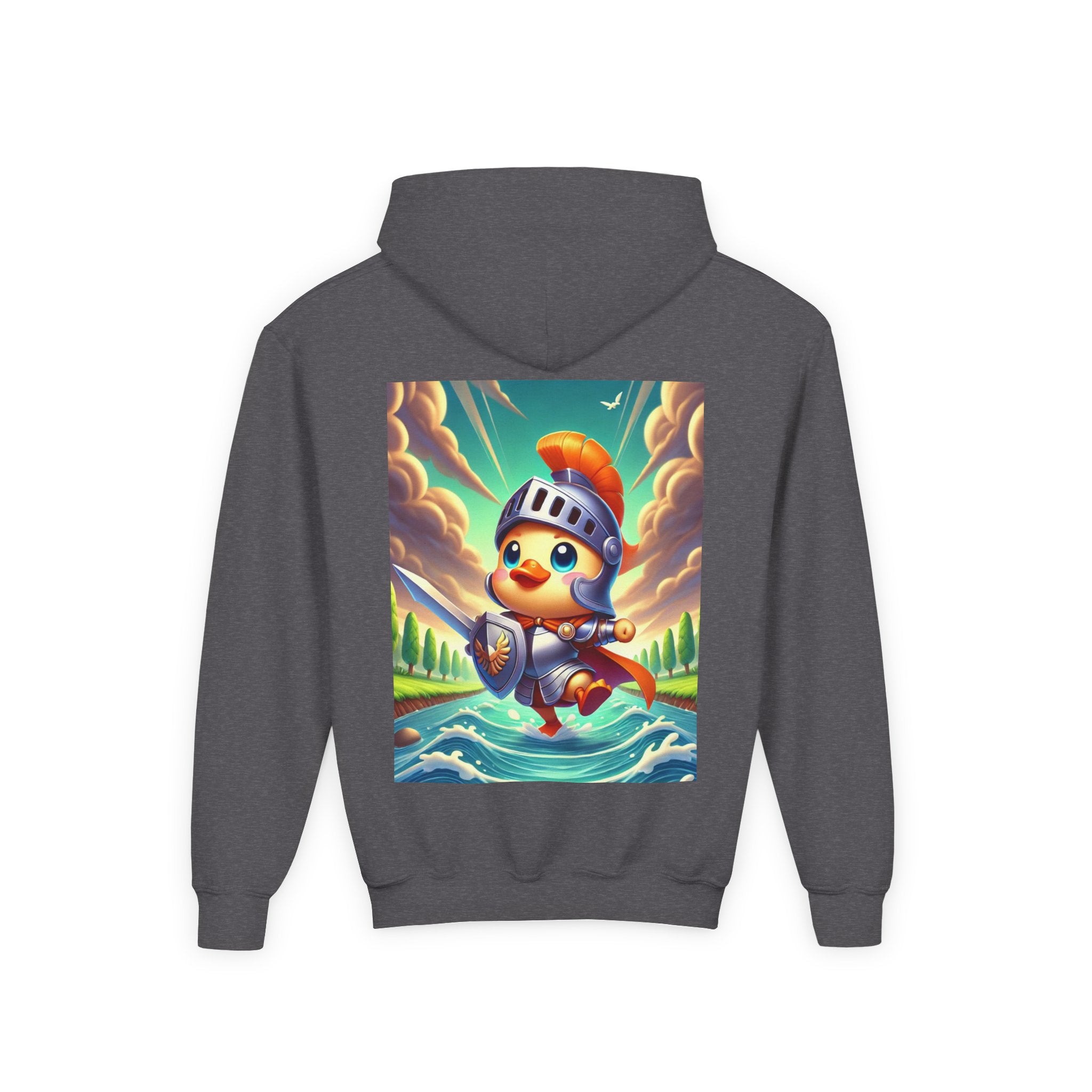 Valiant Duck Youth Heavy Blend Hooded Sweatshirt brings cozy comfort and epic imagination together. Crafted from ultra-soft, preshrunk fleece, this hoodie feels smooth against the skin and resists lint buildup for lasting quality. The balanced 50/50 cotton-polyester blend ensures warmth and durability, while the medium-weight fabric keeps it just right for any season. A roomy kangaroo pocket and twill-reinforced neck add both style and comfort. Please note: due to the fabric properties, the White color variant may appear slightly off-white.
