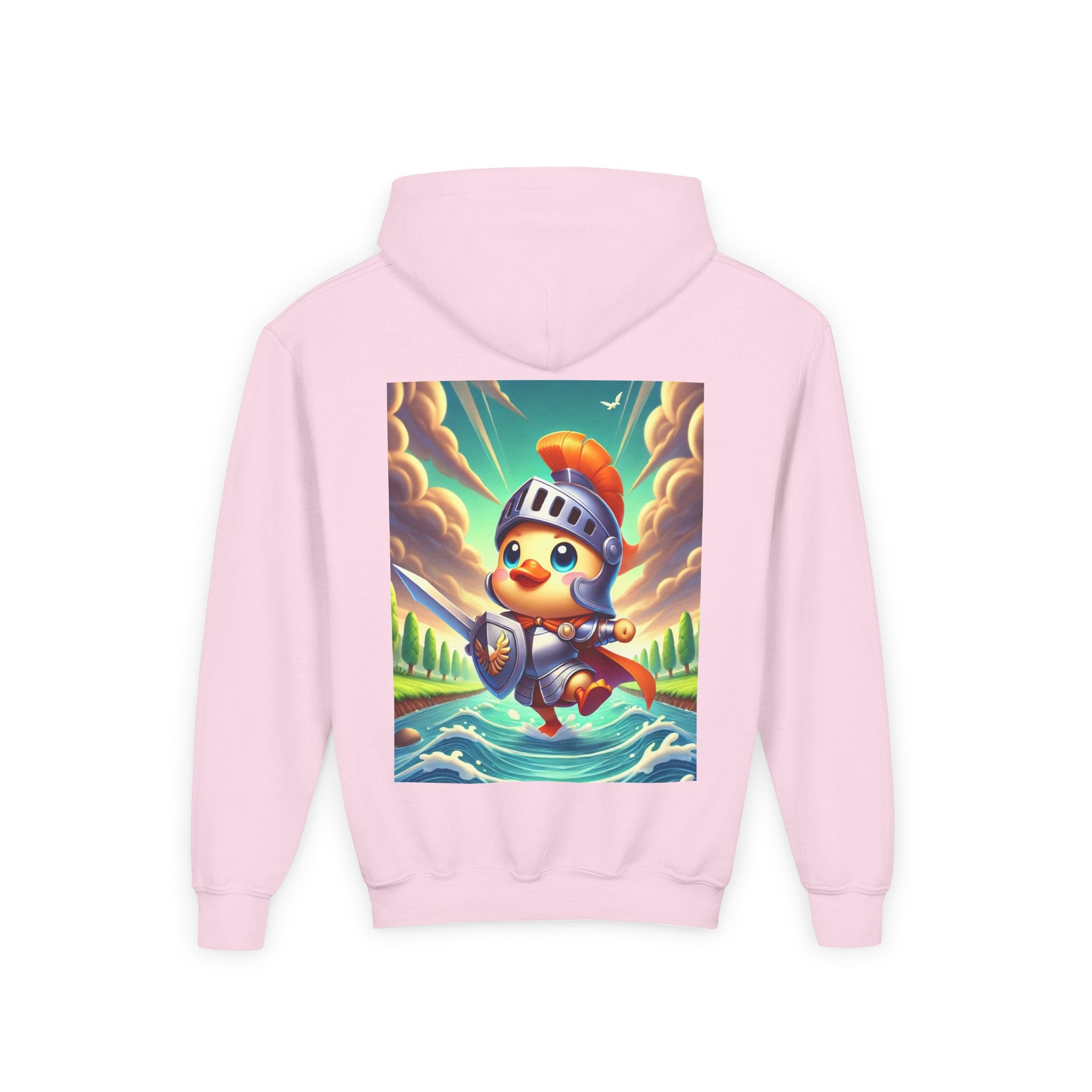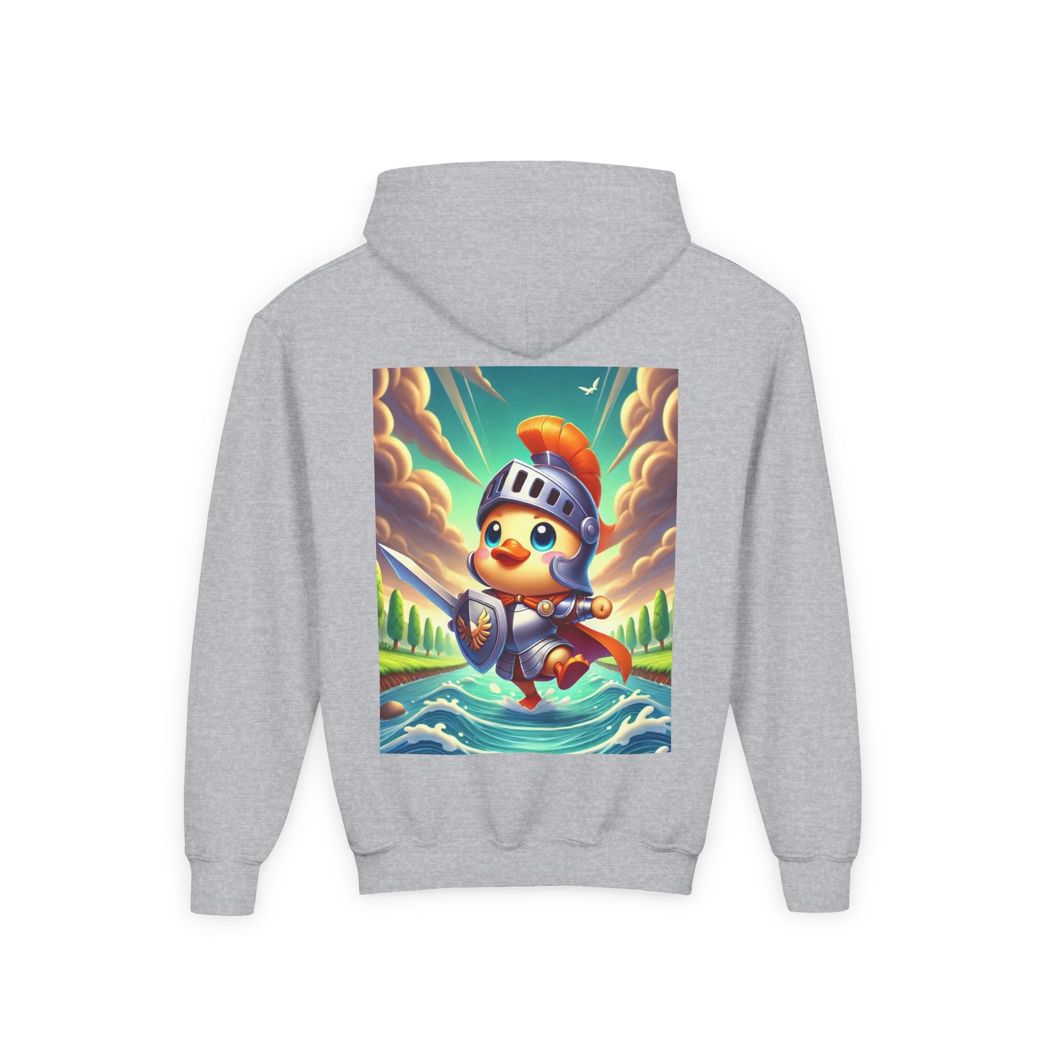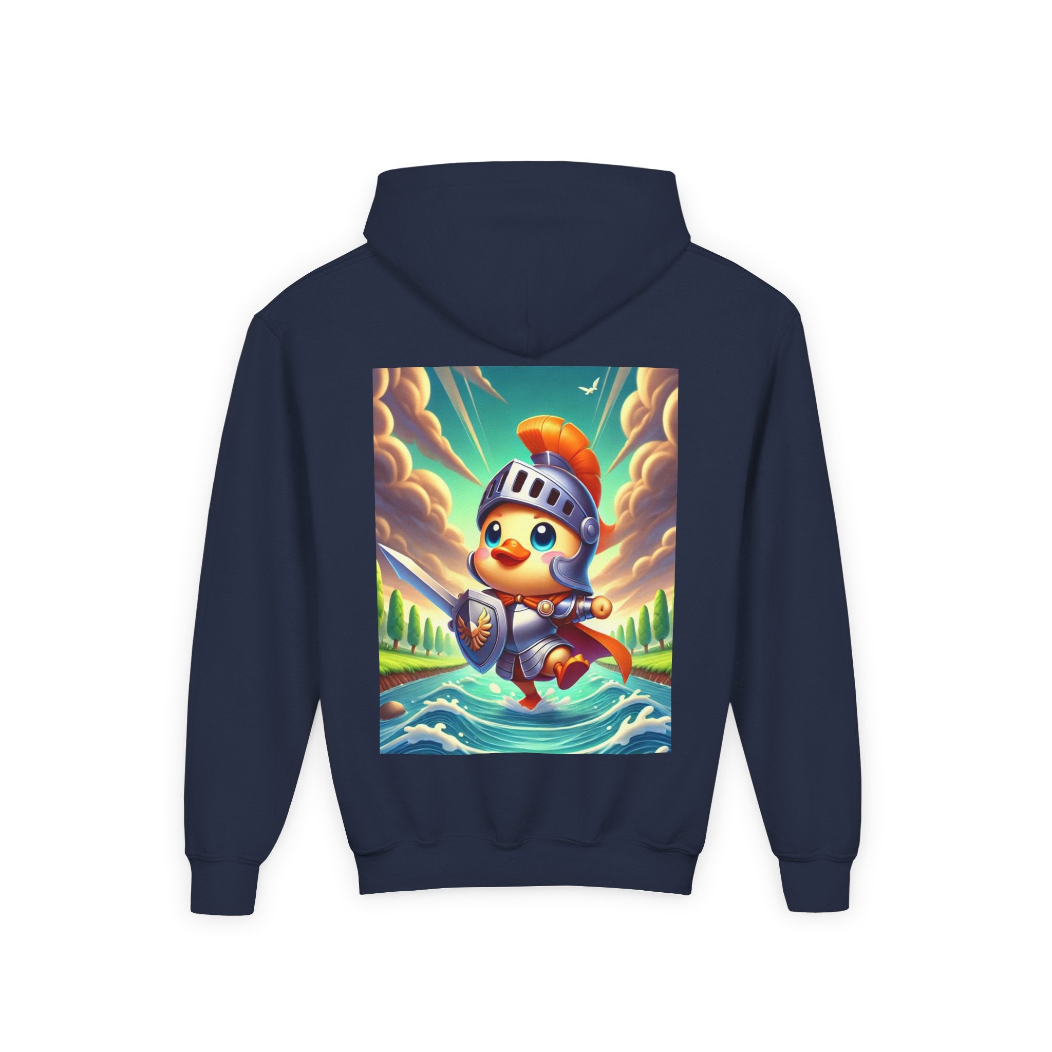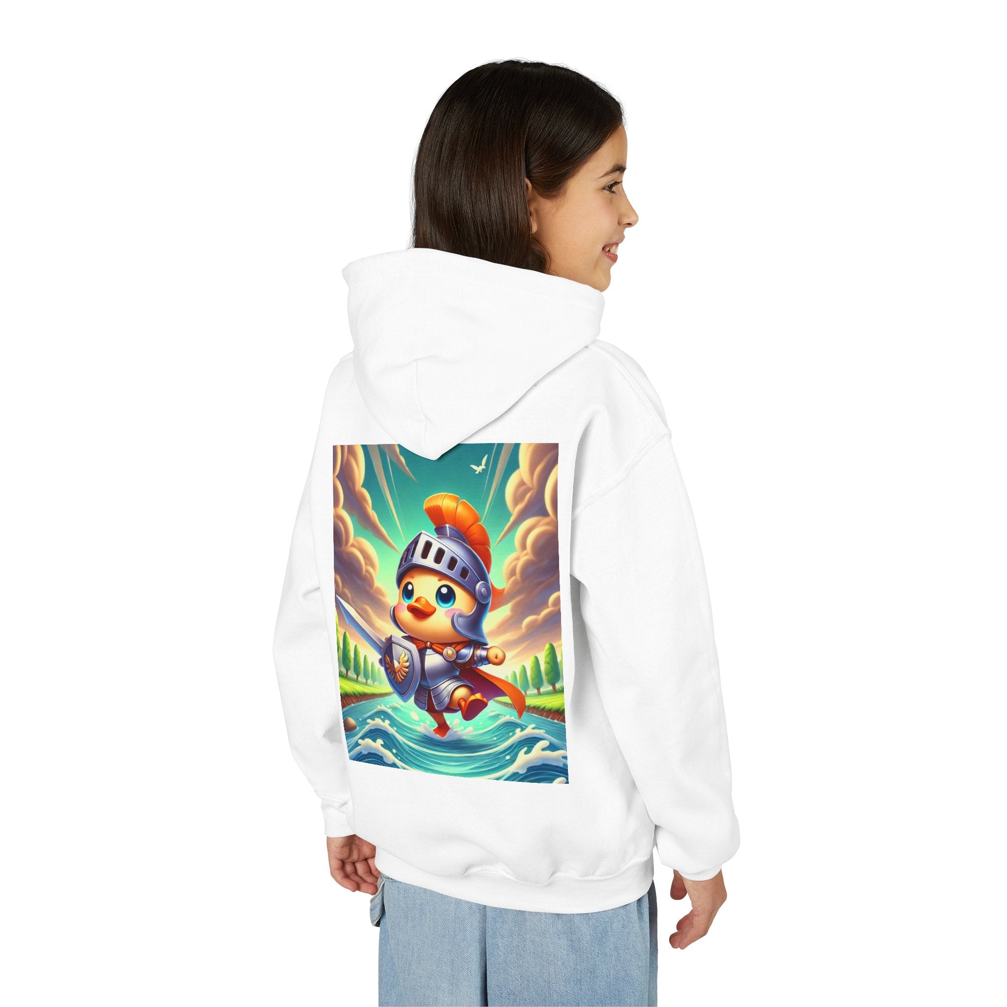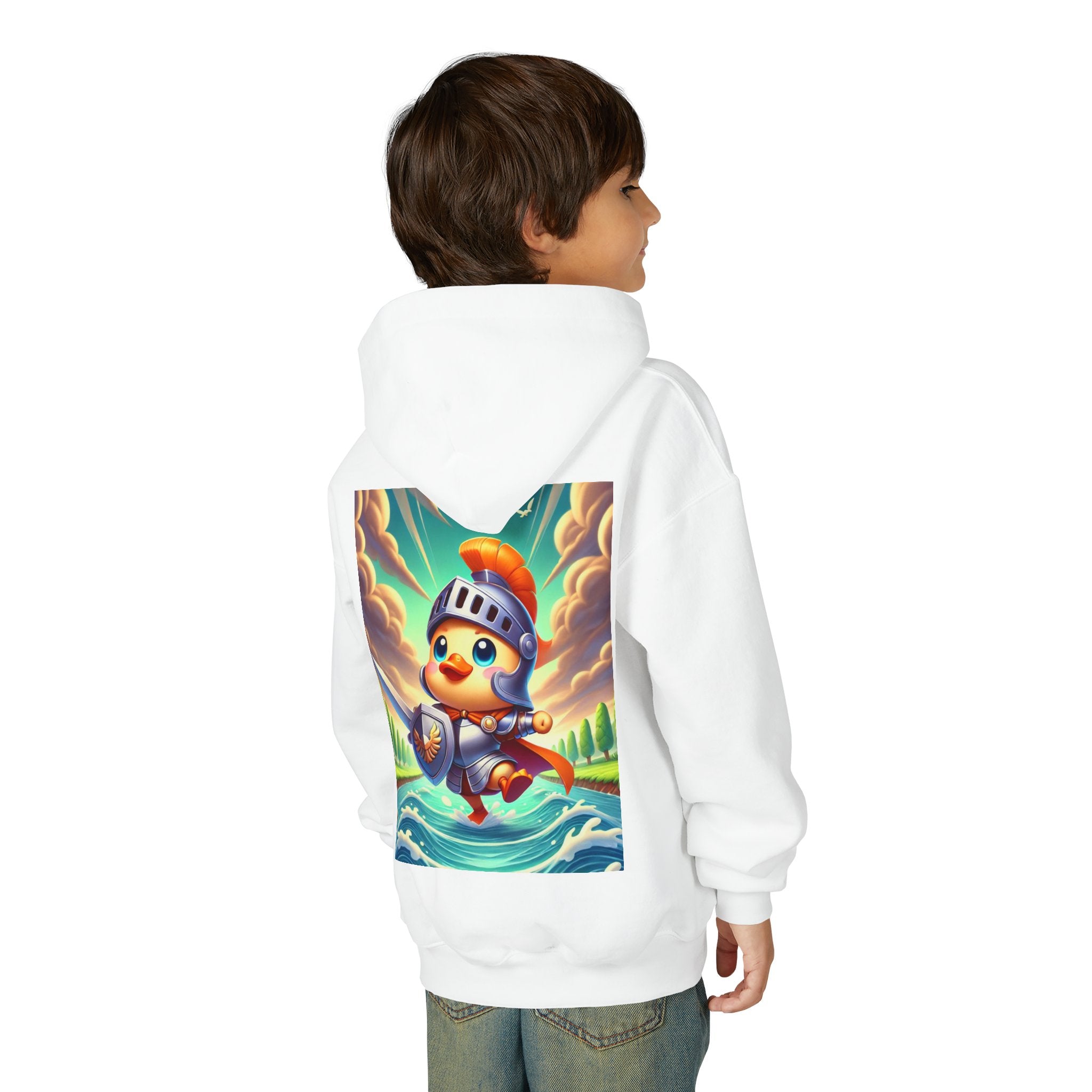 Valiant Duck Youth Heavy Blend Hooded Sweatshirt brings cozy comfort and epic imagination together. Crafted from ultra-soft, preshrunk fleece, this hoodie feels smooth against the skin and resists lint buildup for lasting quality. The balanced 50/50 cotton-polyester blend ensures warmth and durability, while the medium-weight fabric keeps it just right for any season. A roomy kangaroo pocket and twill-reinforced neck add both style and comfort. Please note: due to the fabric properties, the White color variant may appear slightly off-white.