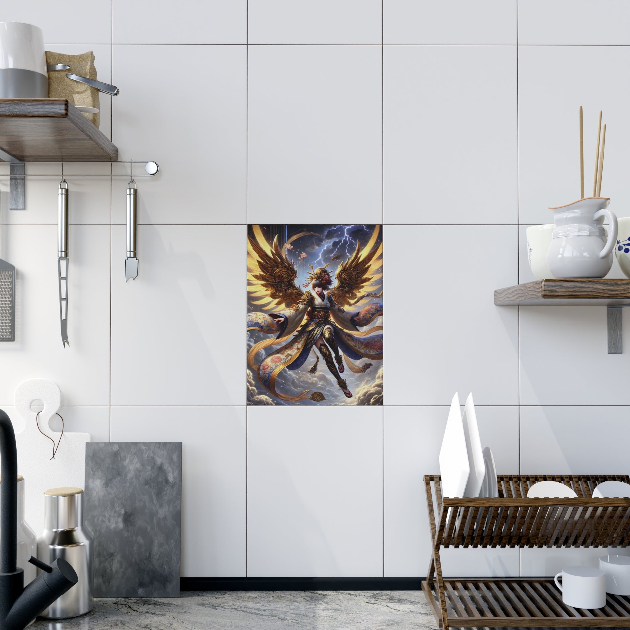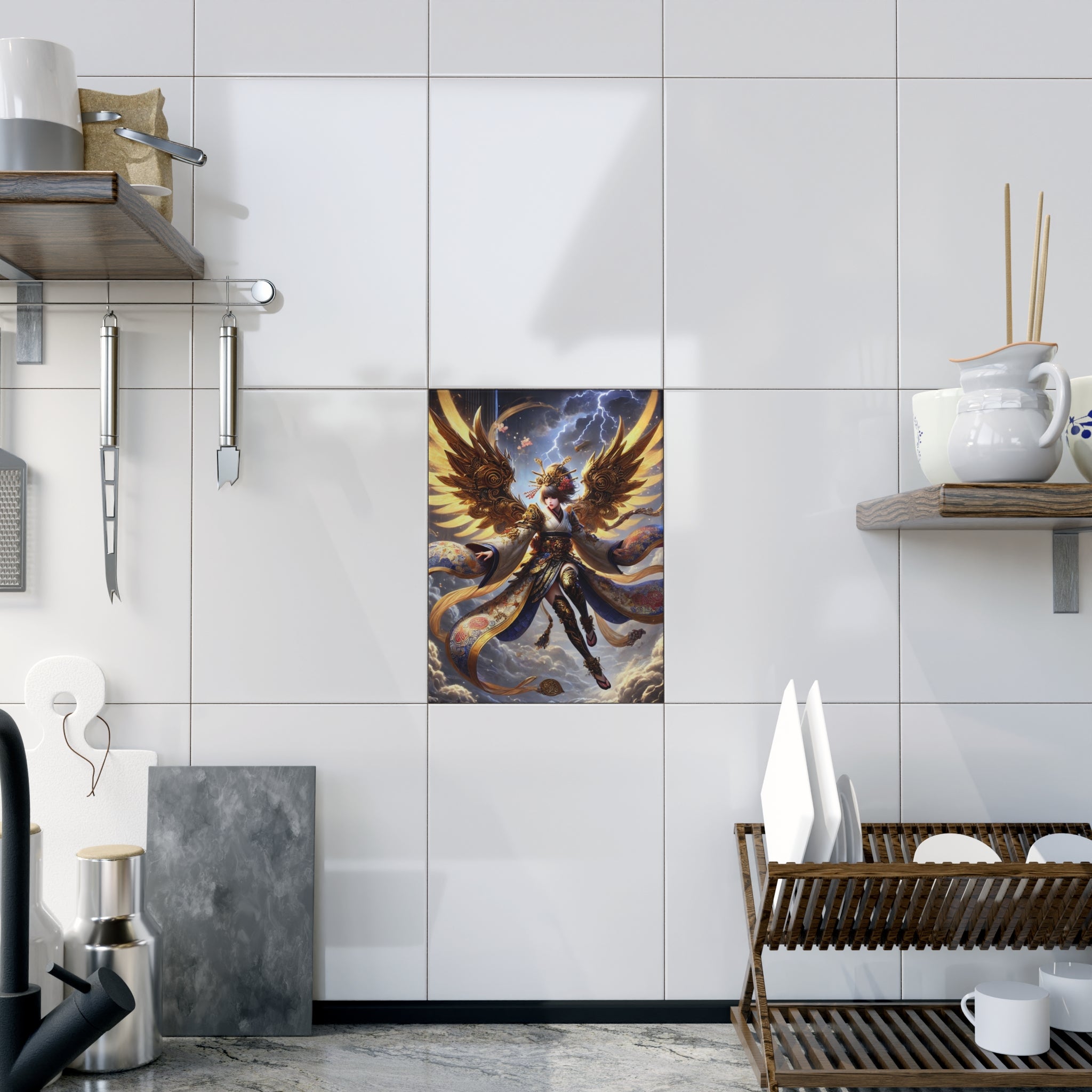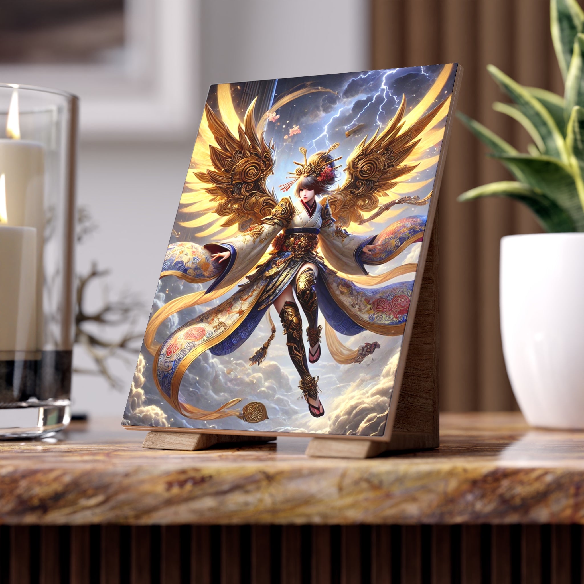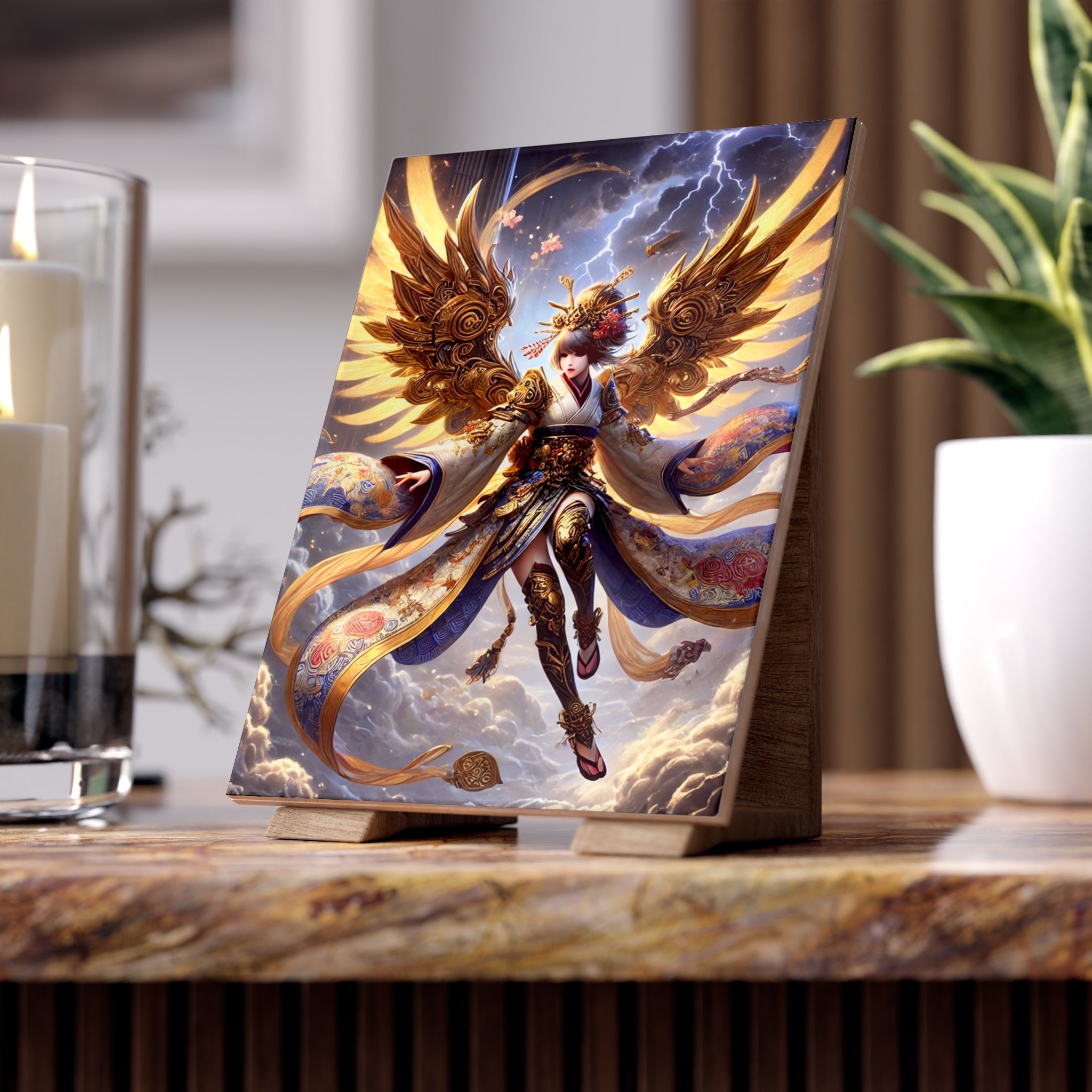 Bring art and myth into your home with a ceramic tile that’s as durable as it is dramatic. Available in glossy or matte finishes, this tile becomes a striking showcase for a breathtaking design that unites Norse mythology with Japanese Kabuki aesthetics. The artwork captures a Valkyrie descending through storm clouds, her kimono-inspired armored wings layered in gold waves and glowing runes. She wears ornate armor with a flowing sash and intricately patterned leggings, every detail rendered with flawless precision. Behind her, stormy skies lit with subtle lightning create a bold yet balanced backdrop, enhancing the vivid color and symbolic flair of the scene. Clean, distortion-free, and rich in storytelling, this ceramic tile transforms any surface into a centerpiece of fantasy and artistry, perfect for display or as a unique decorative accent.