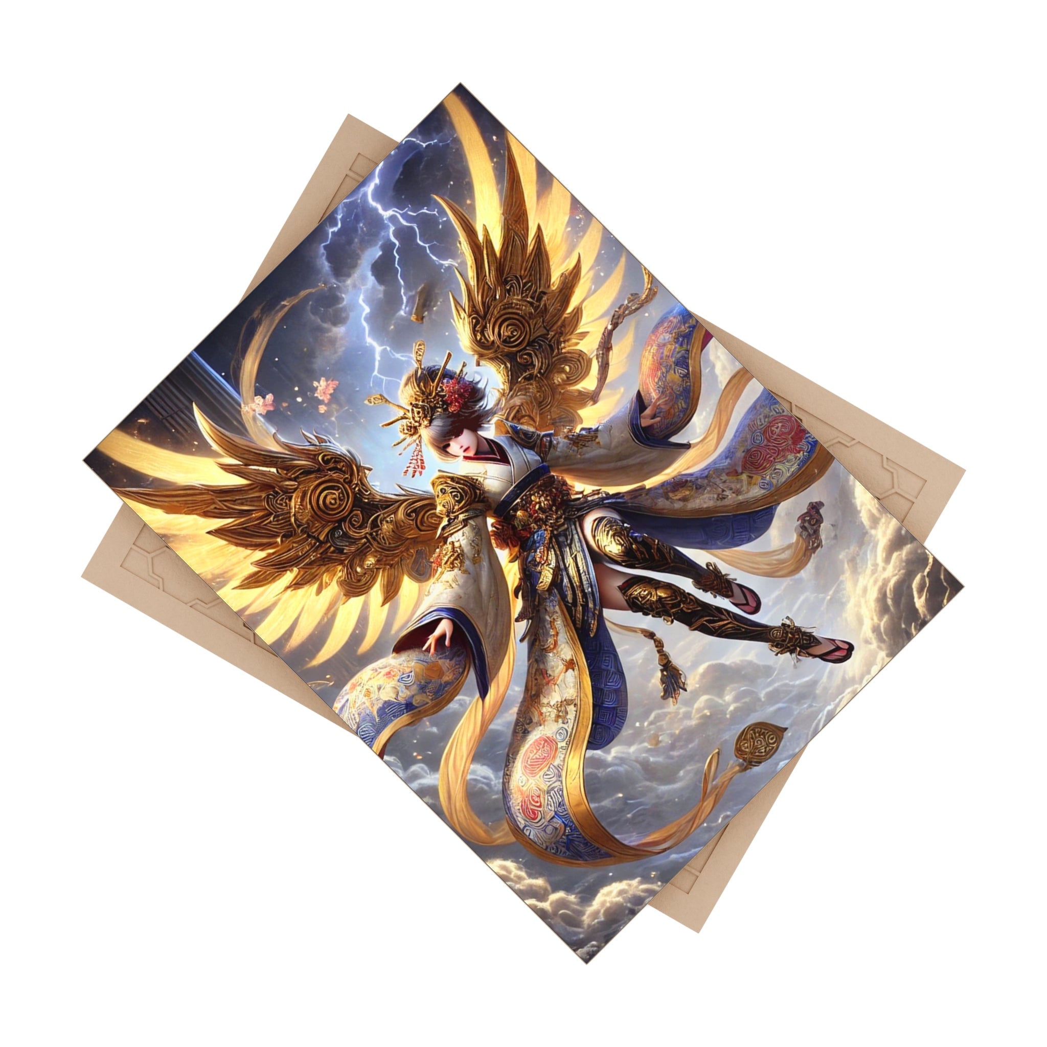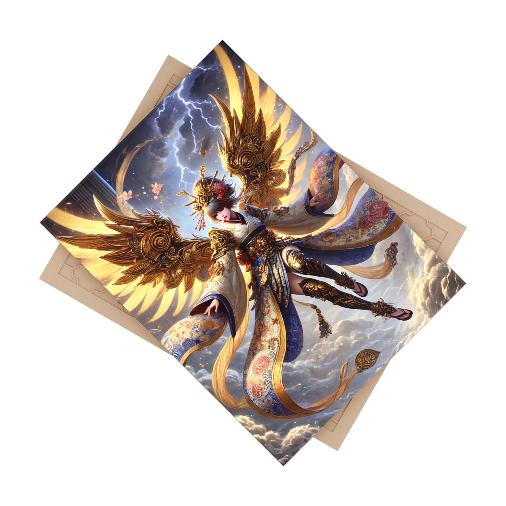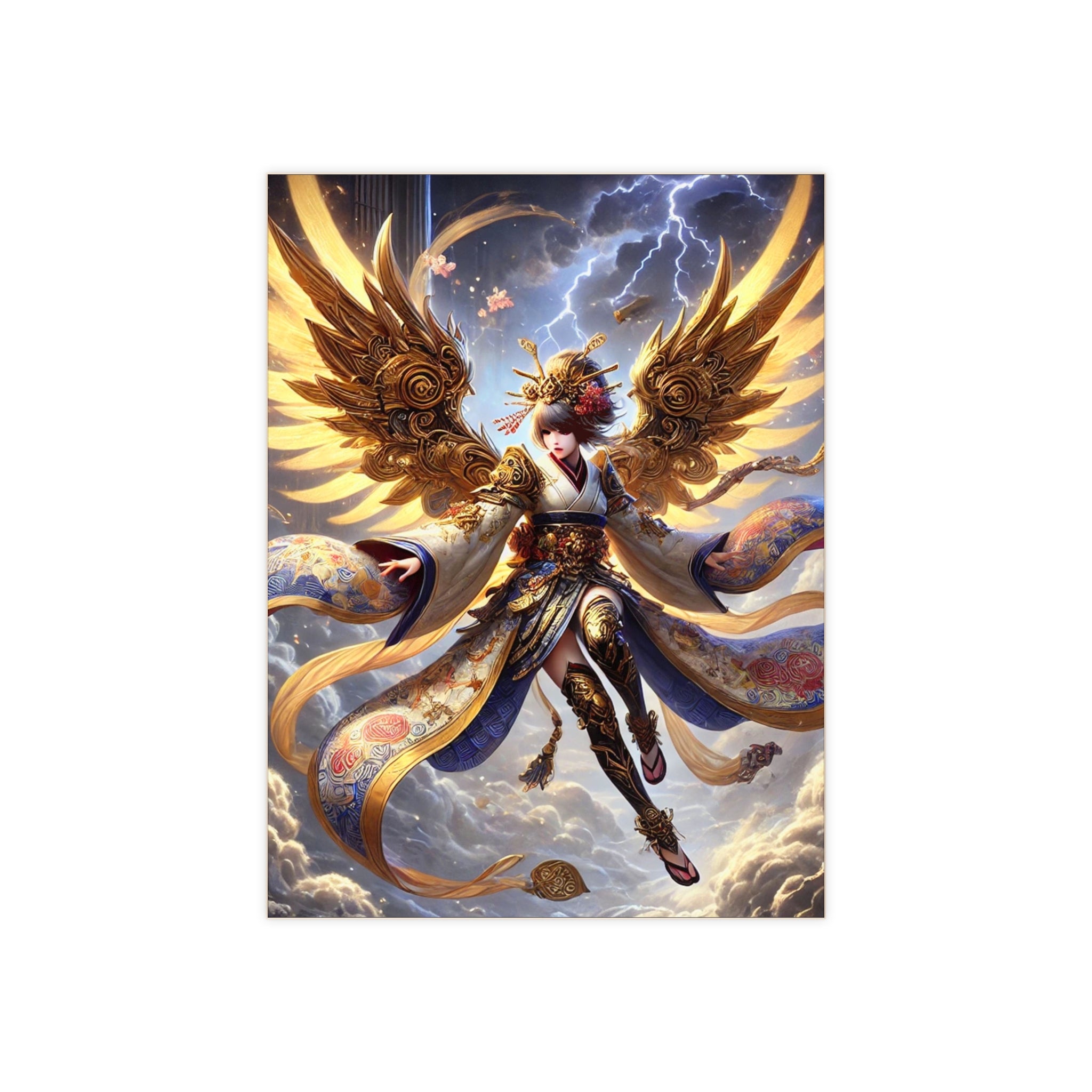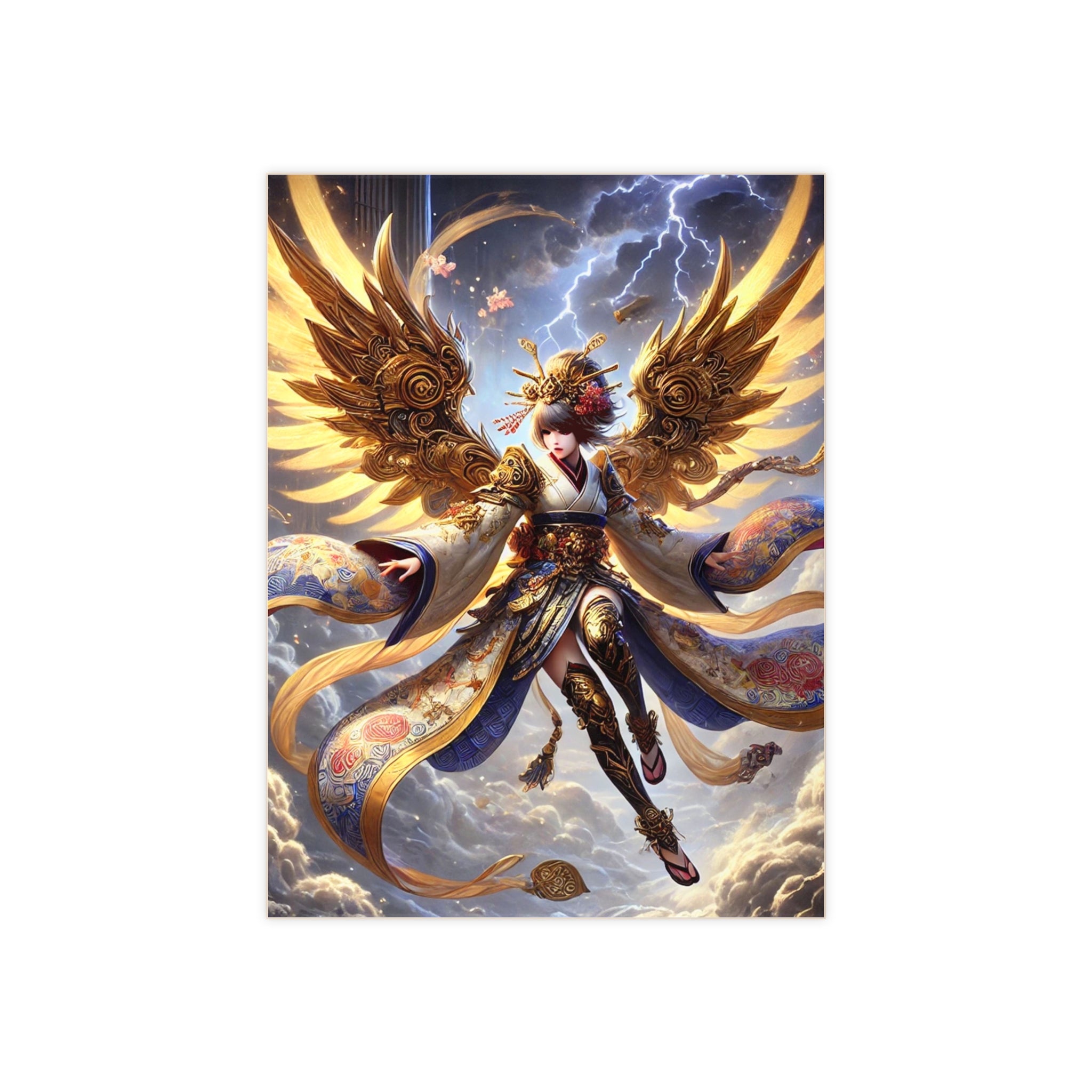 Bring art and myth into your home with a ceramic tile that’s as durable as it is dramatic. Available in glossy or matte finishes, this tile becomes a striking showcase for a breathtaking design that unites Norse mythology with Japanese Kabuki aesthetics. The artwork captures a Valkyrie descending through storm clouds, her kimono-inspired armored wings layered in gold waves and glowing runes. She wears ornate armor with a flowing sash and intricately patterned leggings, every detail rendered with flawless precision. Behind her, stormy skies lit with subtle lightning create a bold yet balanced backdrop, enhancing the vivid color and symbolic flair of the scene. Clean, distortion-free, and rich in storytelling, this ceramic tile transforms any surface into a centerpiece of fantasy and artistry, perfect for display or as a unique decorative accent.