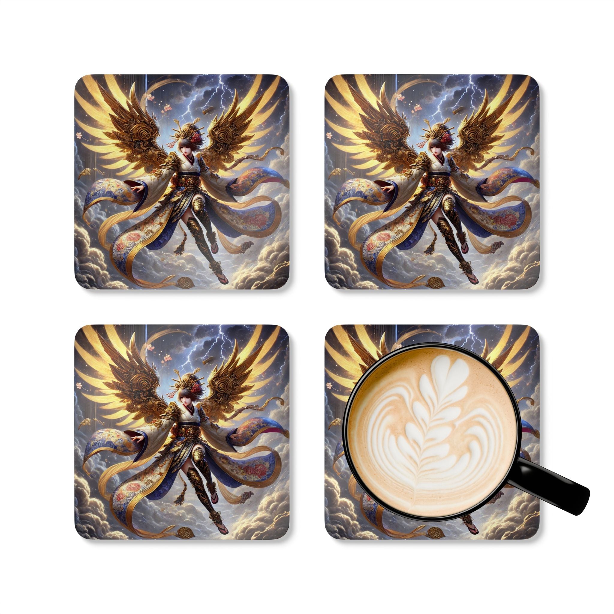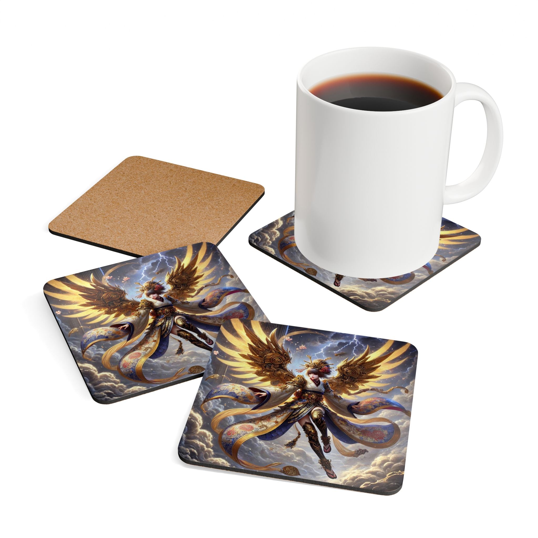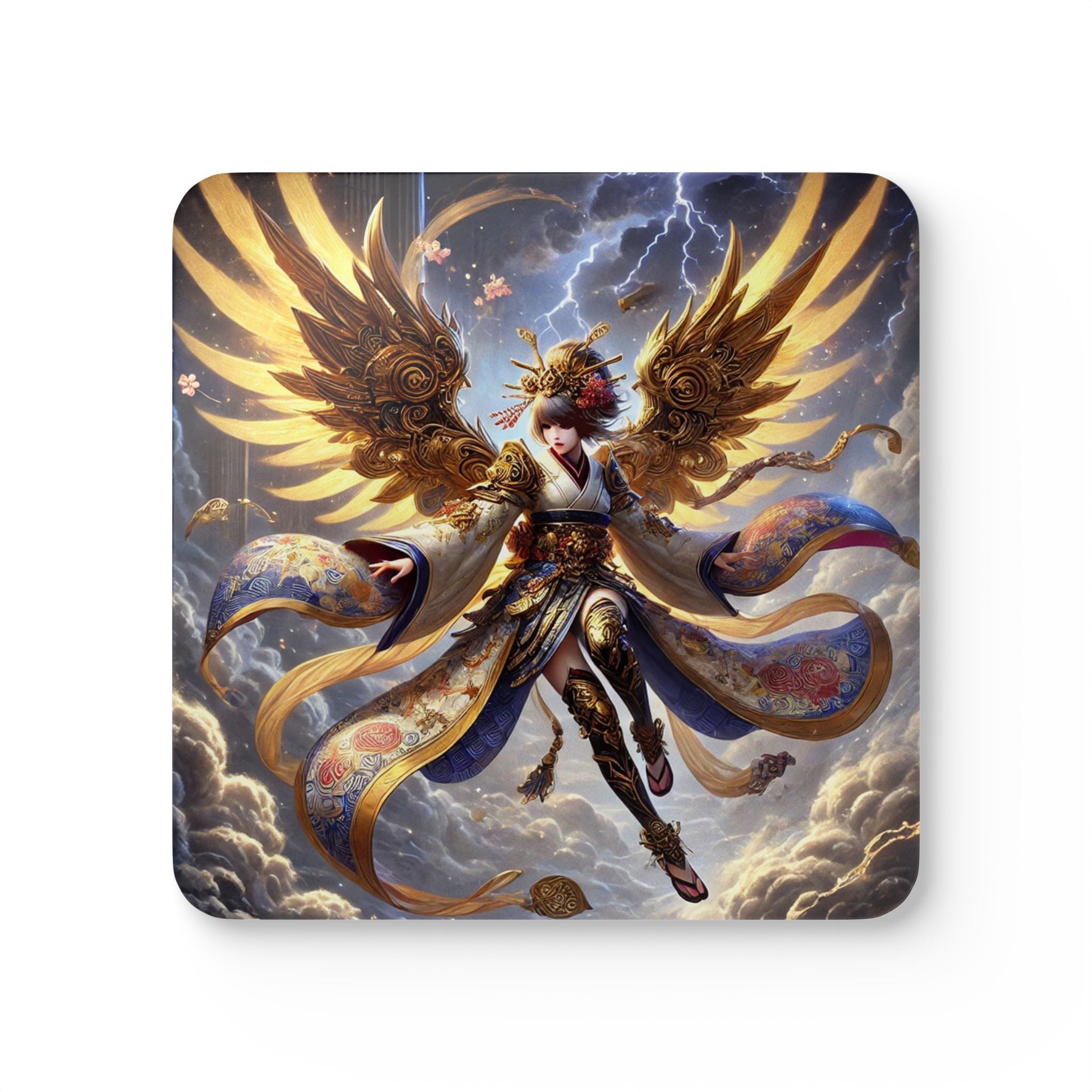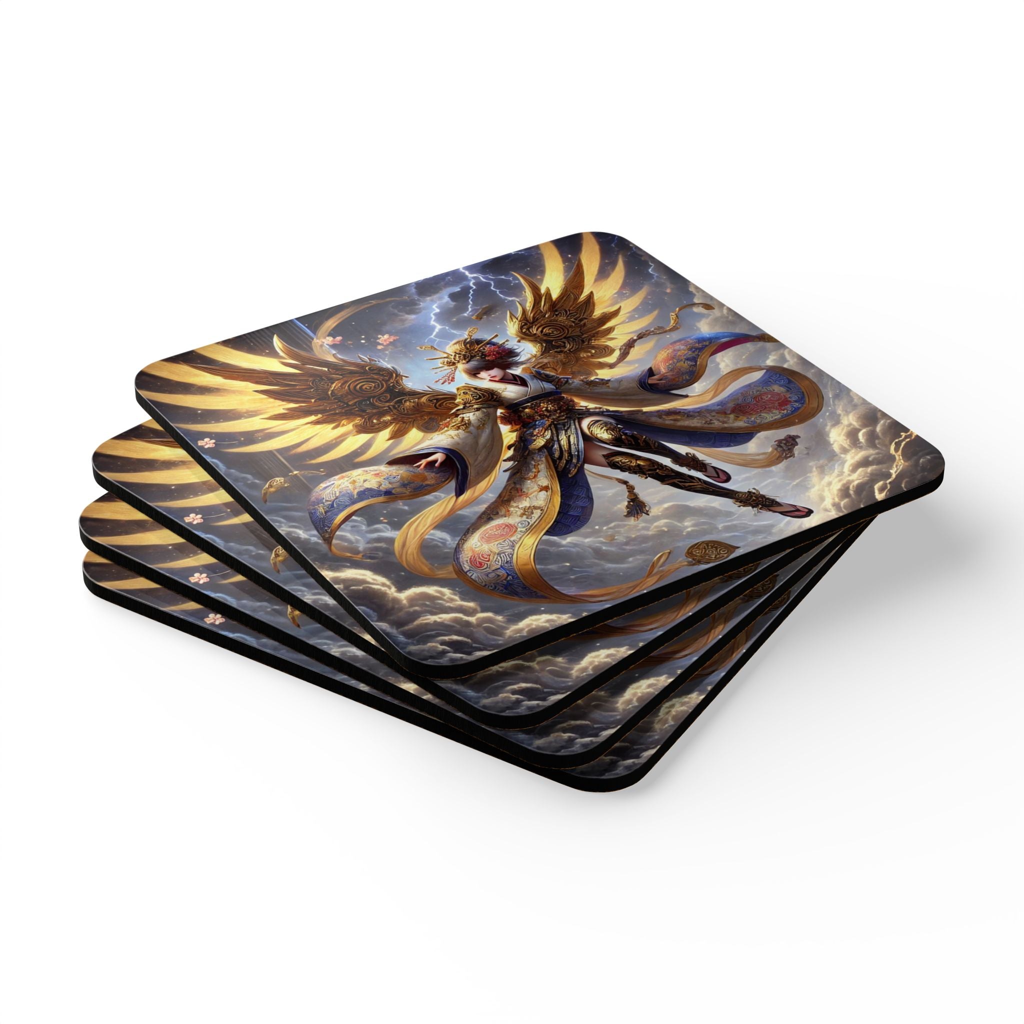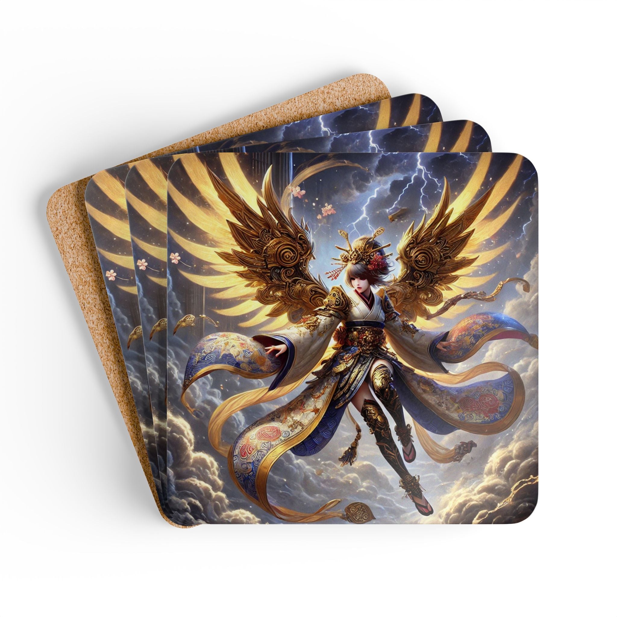 Elevate your home décor with a coaster set that blends function with fantasy. Each set includes four coasters crafted with a high-gloss top that showcases a breathtaking Valkyrie descending through storm clouds, her kimono-inspired armored wings layered in gold waves and glowing runes. She wears ornate armor with a flowing sash and fully patterned leggings, rendered in flawless detail and bold color. Beneath the artwork, the cork backing prevents sliding while adding a natural finish, making these coasters as practical as they are artistic. With a stormy sky of subtle lightning forming the backdrop, this design unites Norse mythology and Japanese Kabuki aesthetics in a dramatic, balanced composition—turning everyday tableware into a striking centerpiece of mythic storytelling.