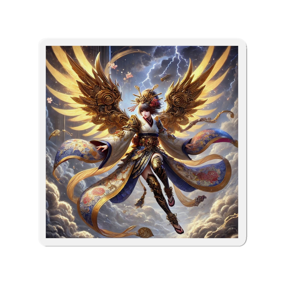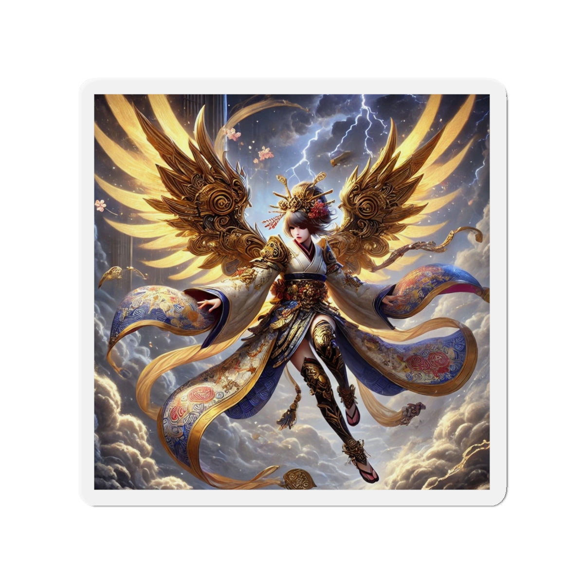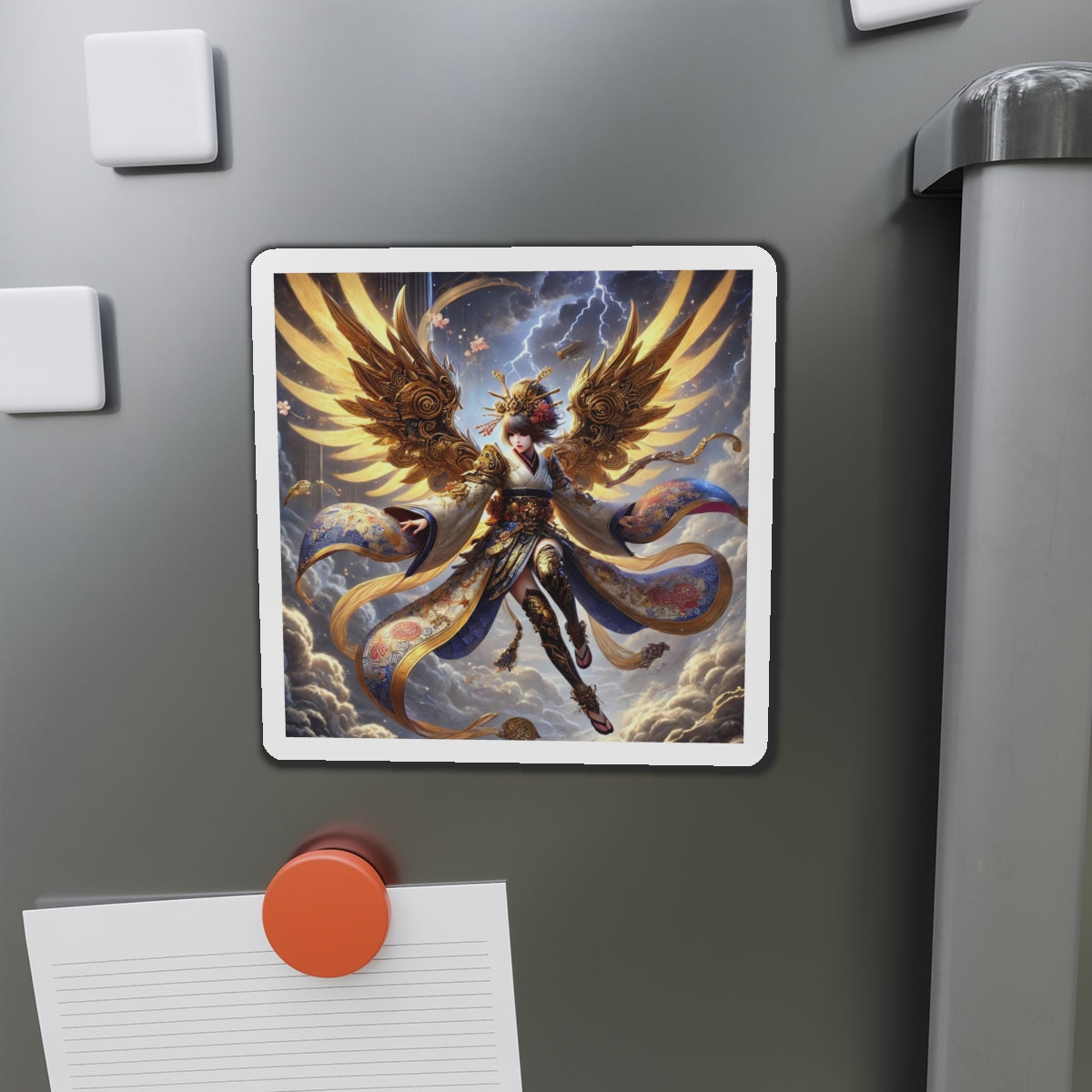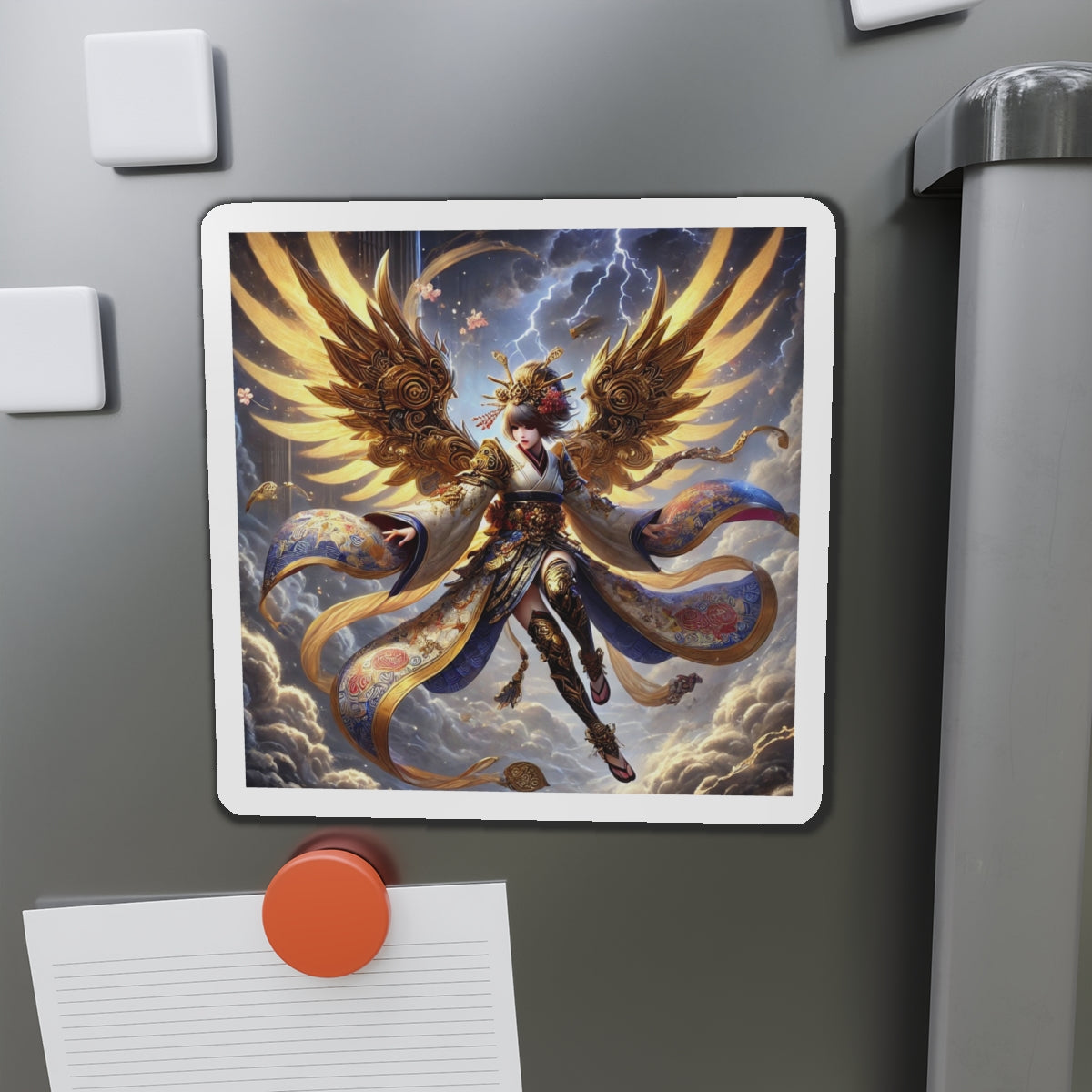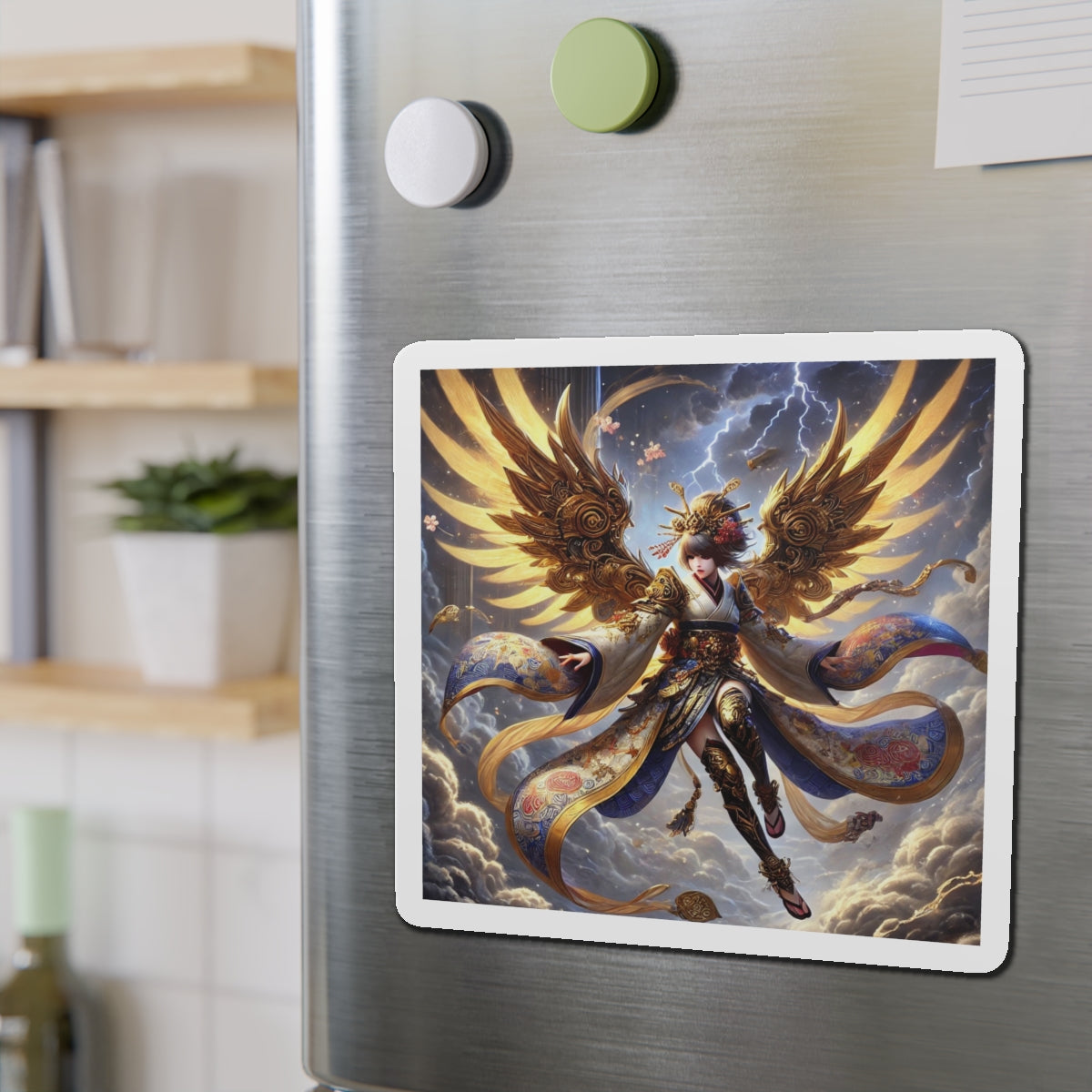 Add a touch of myth and artistry to any surface with these flexible, durable die-cut magnets. Available in four sizes, each magnet is precisely cut to highlight the dramatic design it carries: a Valkyrie descending through storm clouds, her kimono-inspired armored wings layered in gold waves and glowing runes. She wears ornate armor with a flowing sash and fully patterned leggings, every detail captured with sharp clarity and bold color. The stormy backdrop, alive with subtle lightning yet perfectly balanced, enhances the theatrical power of the scene. Blending Norse mythology with Japanese Kabuki aesthetics, these magnets transform everyday spaces into showcases of fantasy storytelling and timeless design.